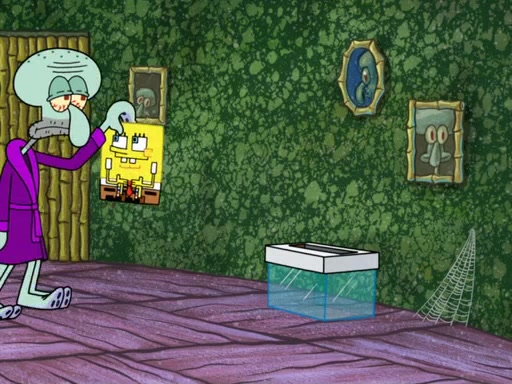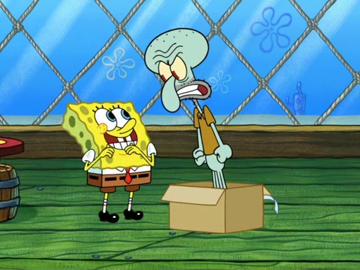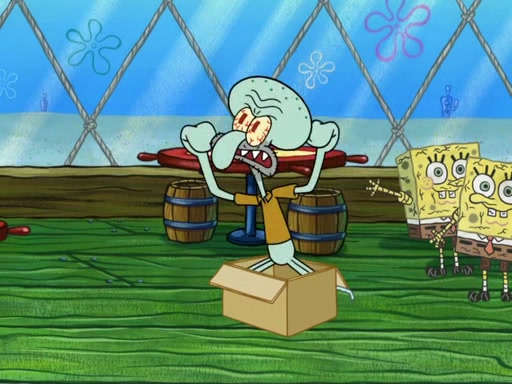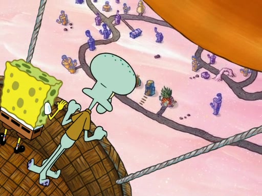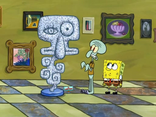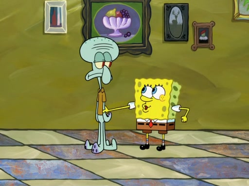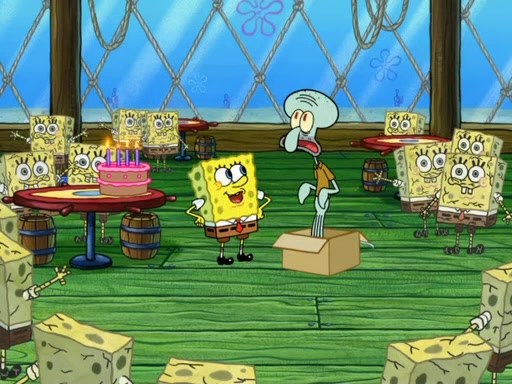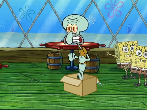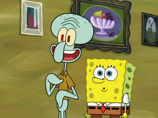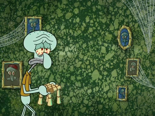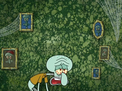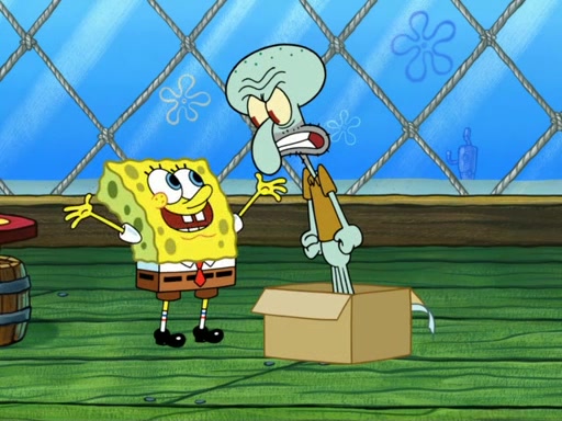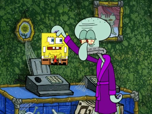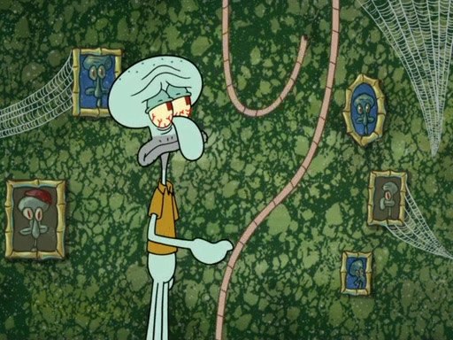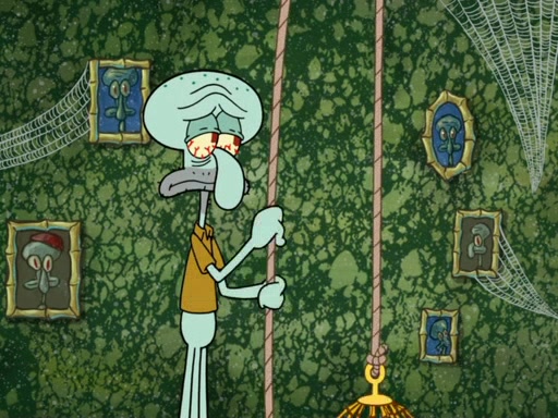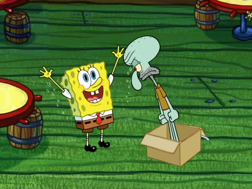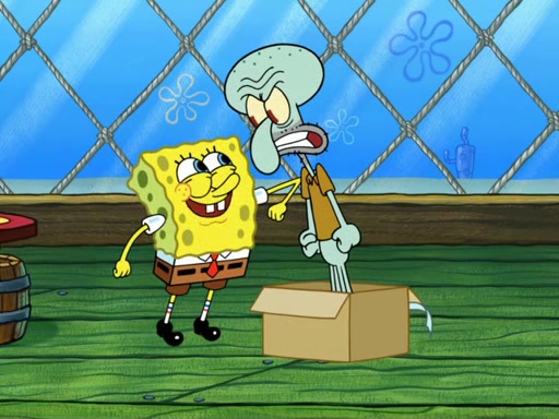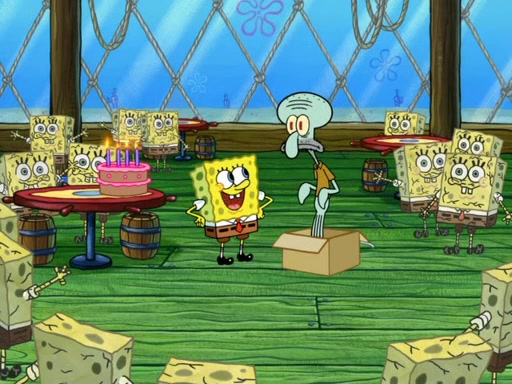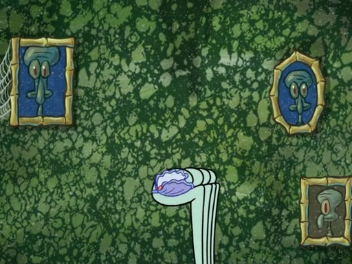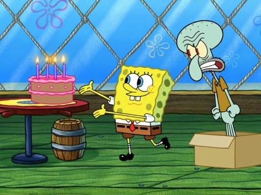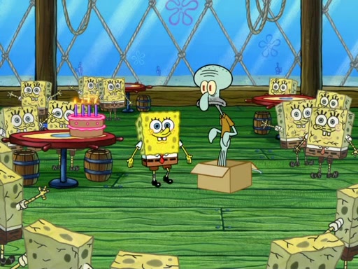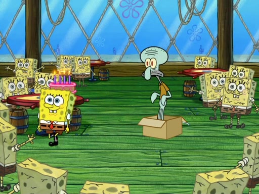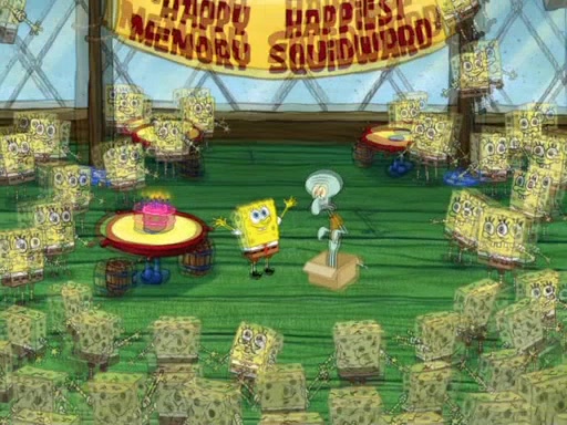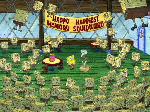 On a fine day at the Krusty Krab, Patrick is behind the restaurant climbing out of a dumpster eating a Krabby Patty. The camera then pans over to SpongeBob, showing him reading the "Krusty Krab Schedule" book, much to Squidward being annoyed. SpongeBob then claims that the book has a list of "his happiest memories." Squidward takes the book and "accidentally" drops it on the grill. However, SpongeBob has multiple copies of the book in a cabinet, which he proceeds to get one. SpongeBob then asks Squidward if he has a happiest memory, in which he replies, "No." Feeling concerned, SpongeBob tries to ask Squidward if he can help make a happiest memory for him, which he accepts. First, SpongeBob takes Squidward to a concert. That did not go well, however, since the violin player accidentally shot Squidward in the eye with the violin bow. Then, both of them head to the Bikini Bottom Museum. One of Squidward's masterpieces is in the museum, which is praised by critics. Squidward is happy until a famous art critic named Fiasco burns his artwork with a flamethrower. In addition, after that, SpongeBob takes Squidward on a hot air balloon ride. That doesn't go well, since Squidward is afraid of heights, so SpongeBob tries to get Squidward down by popping the balloon (because the balloon has no heater to make it deflate) and both of them land on a mountain which is actually Mount Bikini, ruining Harold's chance to be the first one on the mountain. Then, SpongeBob, Squidward, and Harold slide off the mountain due to an avalanche. When SpongeBob and Squidward slide back to their homes, Squidward insists that he will never have a happiest memory. Two weeks later, Squidward is left in his house doing nothing but being unhappy. SpongeBob then becomes even more concerned for Squidward and tries to get ahold of him, but fails. He then traps Squidward in a box, and takes him to the Krusty Krab, where he reveals that he created a party to cheer Squidward up. Unfortunately, SpongeBob failed to get anyone else to come, because some of them were busy or sick, so instead he made 100 paper-mâché life-sized models of himself. Squidward hates seeing more than one sculpture of SpongeBob in one place so he goes berserk, destroys all the paper-mâché sculptures, and claims this to be his "happiest memory."