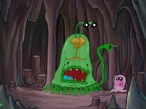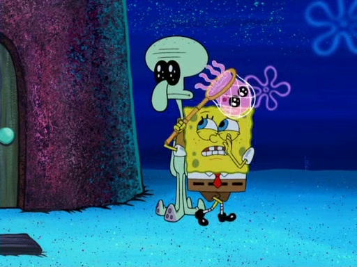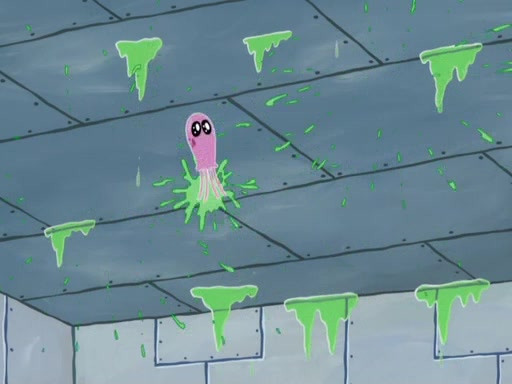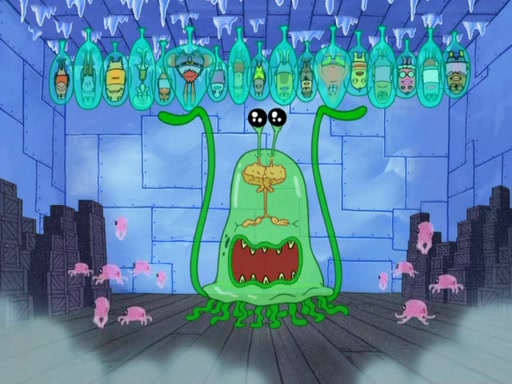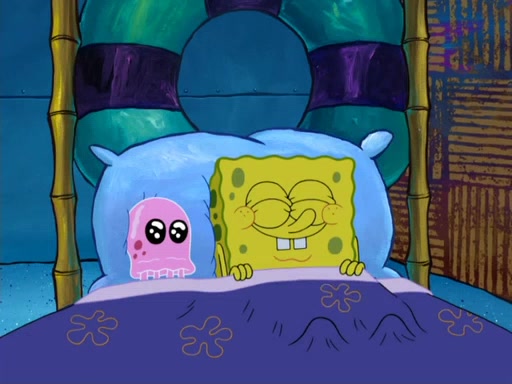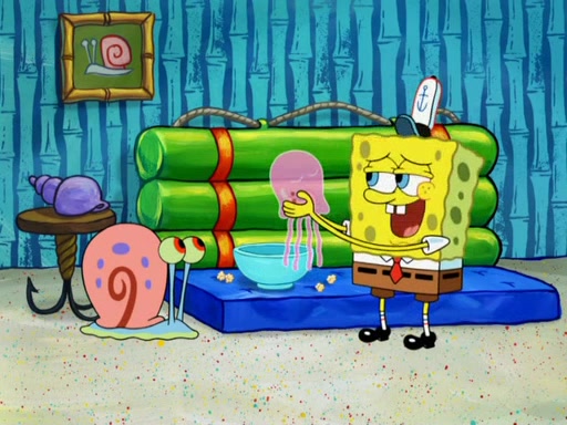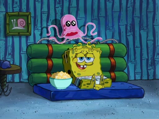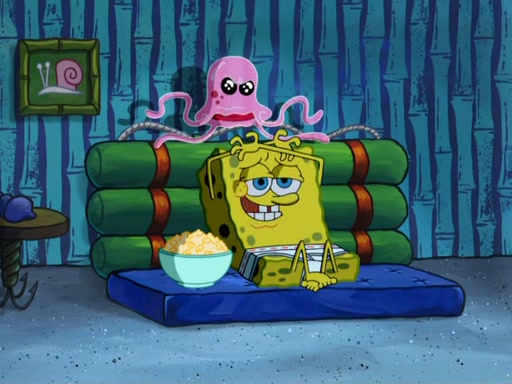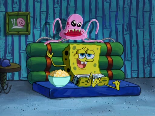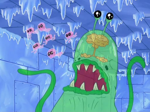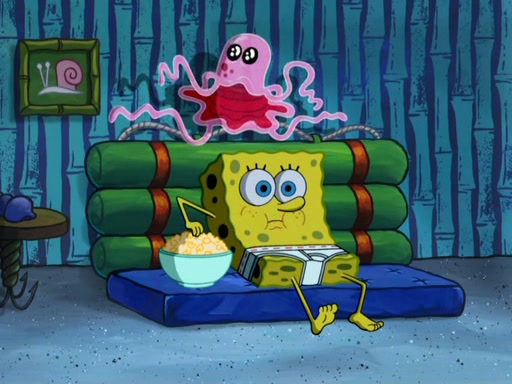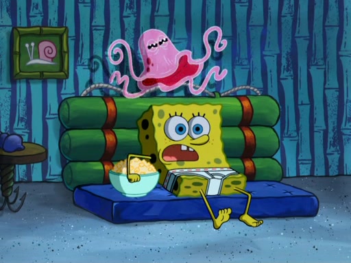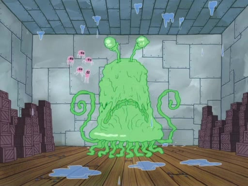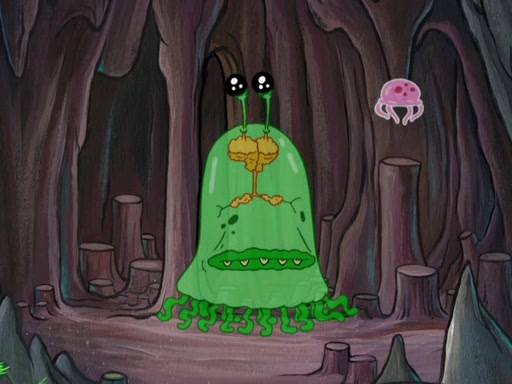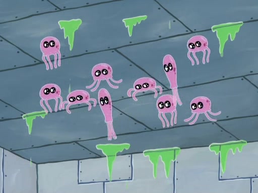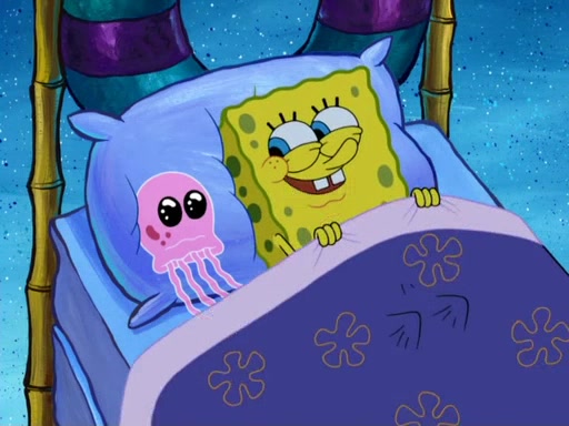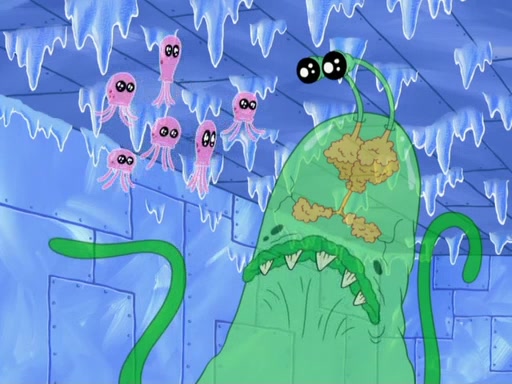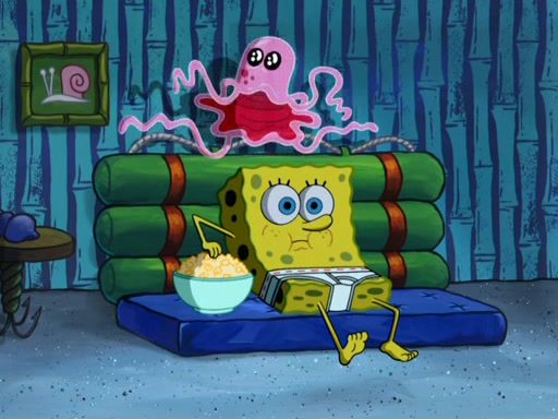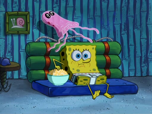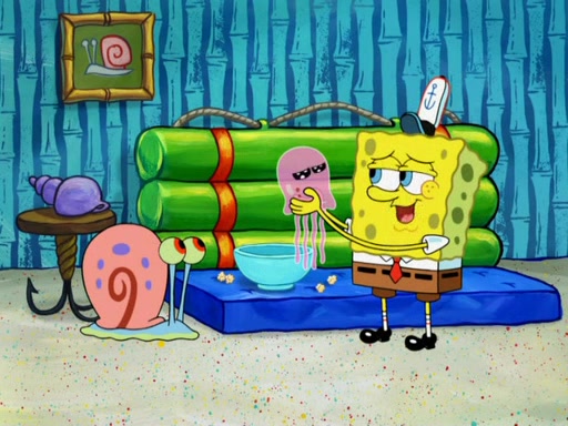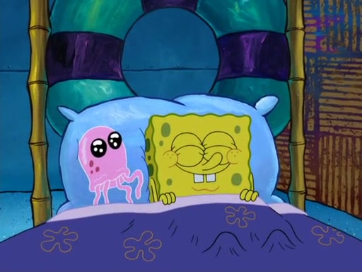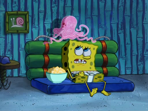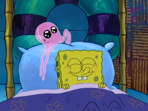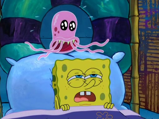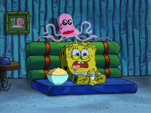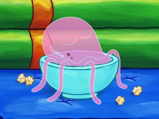 Later, SpongeBob and Jellion Patrick arrive at Squidward's house. Jellion Patrick stuffs his last jellion into Squidward's mail slot, then 1 second later, the jellion's tentacle spits out a tall light blue pile of goo from the window, which morphs into Jellion Squidward. Jellion Squidward and Jellion Patrick wish SpongeBob a good night. SpongeBob sleeps cozily in his bed, as Jellion #1 attempts to consume him, but SpongeBob awakes, with insomnia. As he watches a late movie, Jellion #1 tries again to consume him, but SpongeBob throws popcorn into Jellion #1's mouth. Jellion #1 starts choking on the popcorn, falling behind the couch.