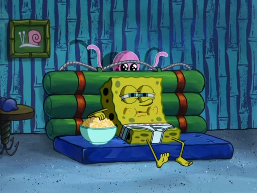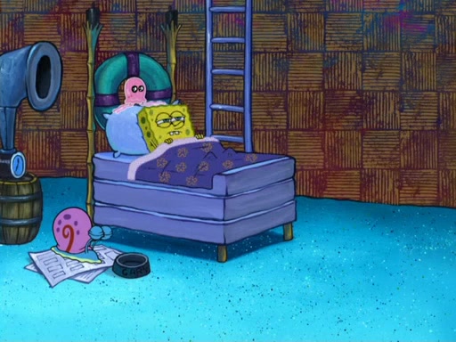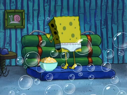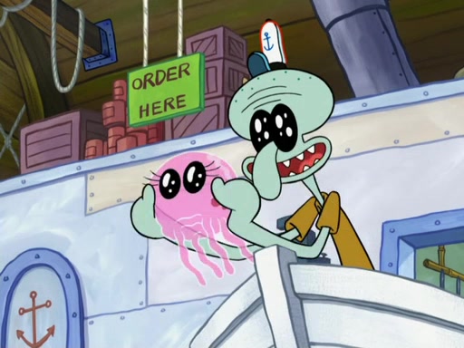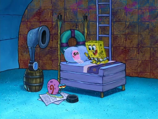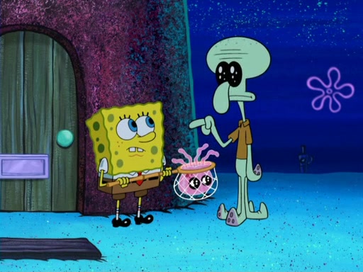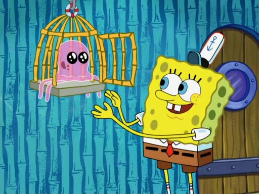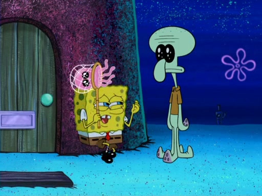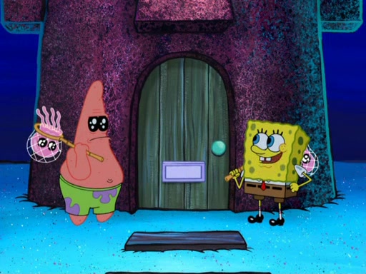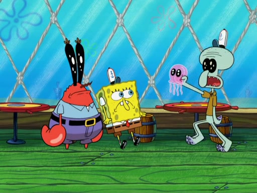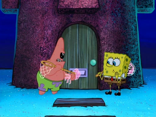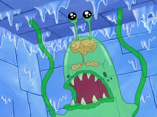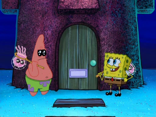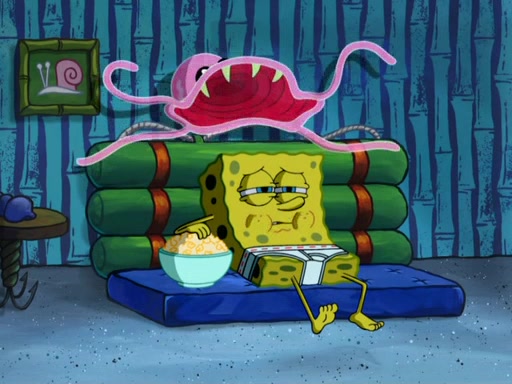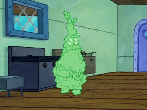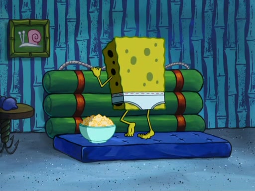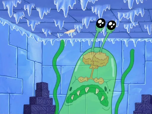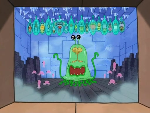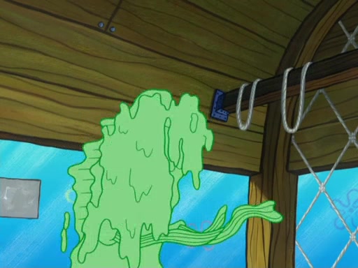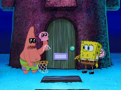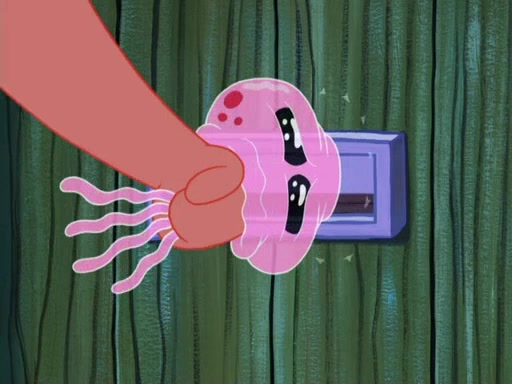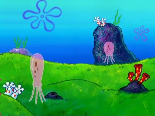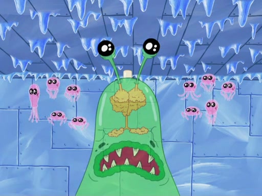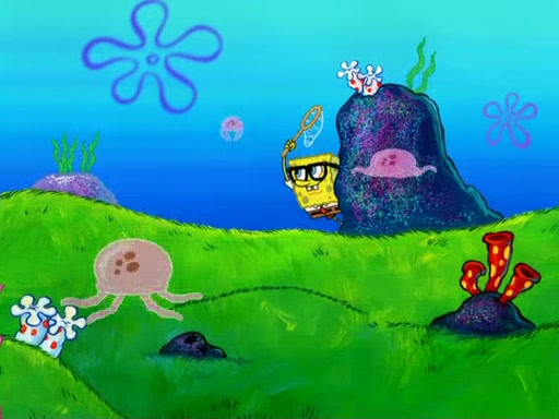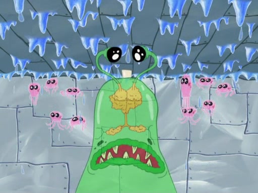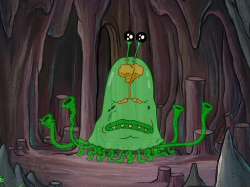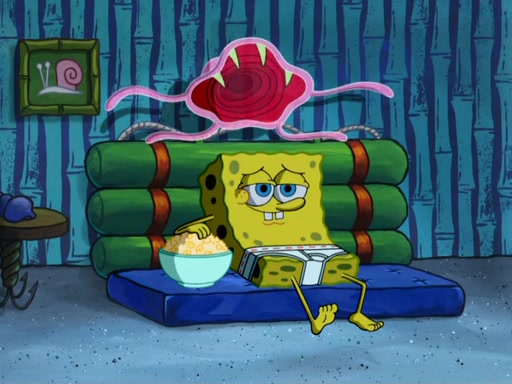 Later, SpongeBob and Jellion Patrick arrive at Squidward's house. Jellion Patrick stuffs his last jellion into Squidward's mail slot, then 1 second later, the jellion's tentacle spits out a tall light blue pile of goo from the window, which morphs into Jellion Squidward. Jellion Squidward and Jellion Patrick wish SpongeBob a good night. SpongeBob sleeps cozily in his bed, as Jellion #1 attempts to consume him, but SpongeBob awakes, with insomnia. As he watches a late movie, Jellion #1 tries again to consume him, but SpongeBob throws popcorn into Jellion #1's mouth. Jellion #1 starts choking on the popcorn, falling behind the couch.