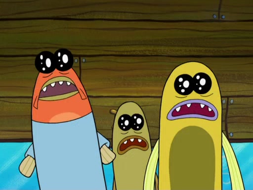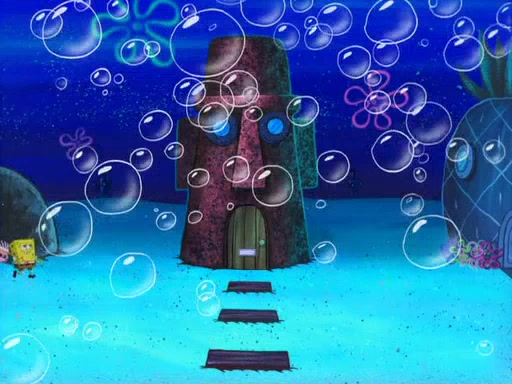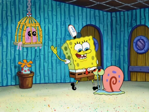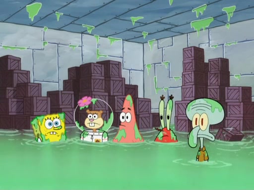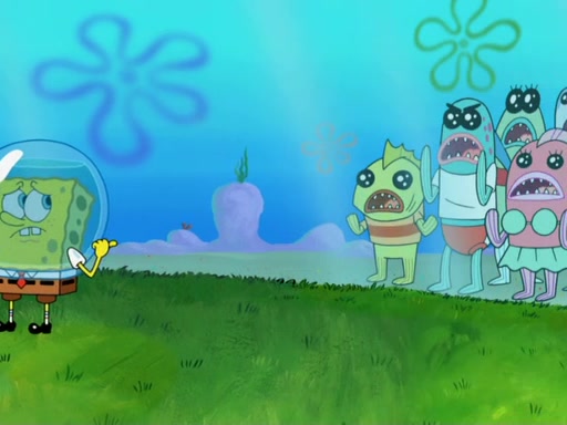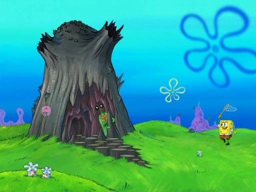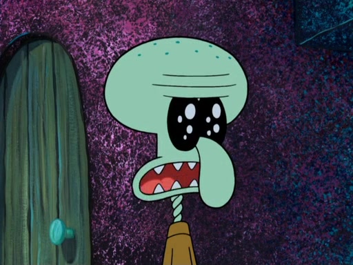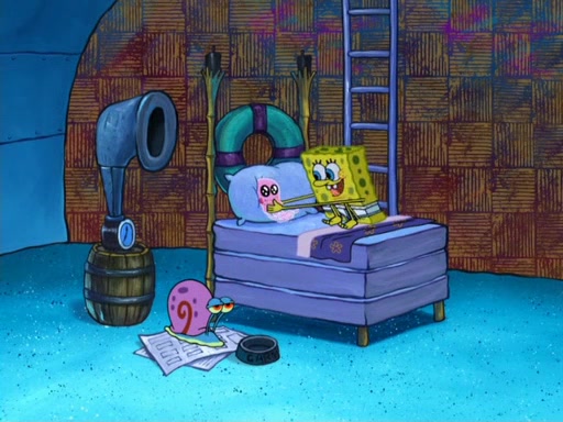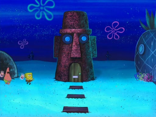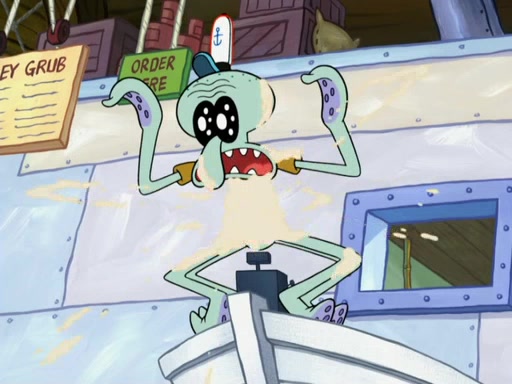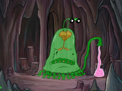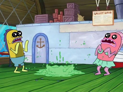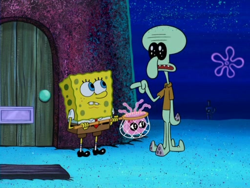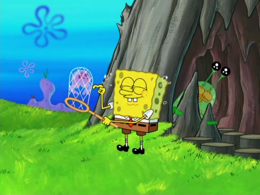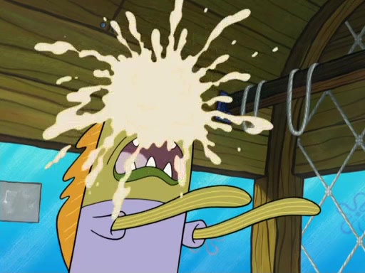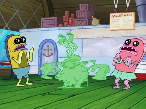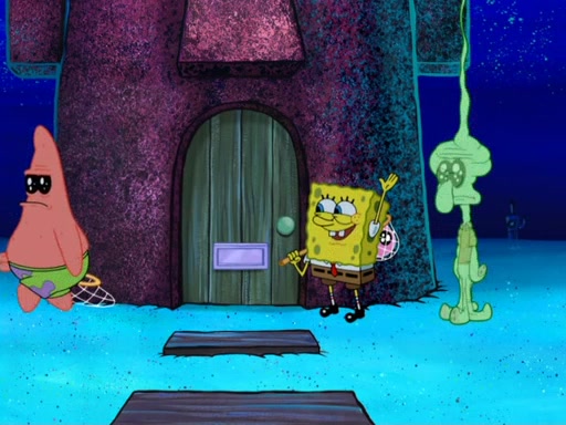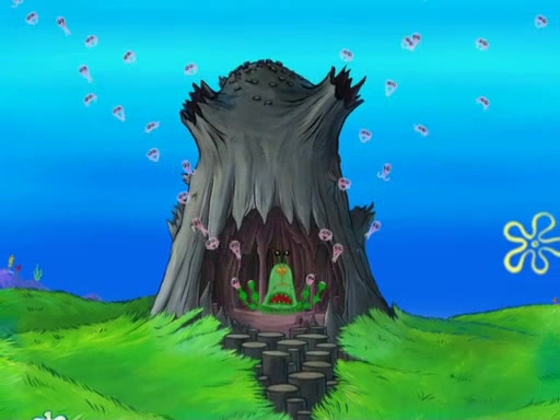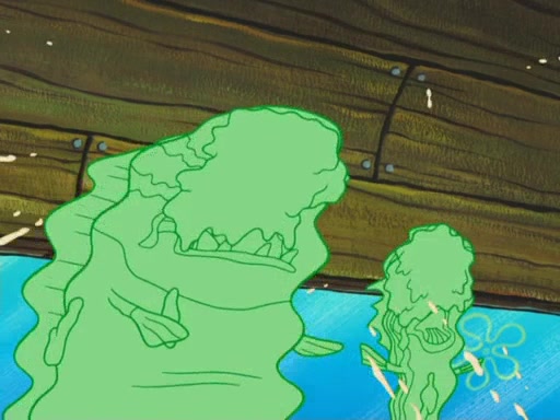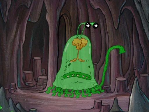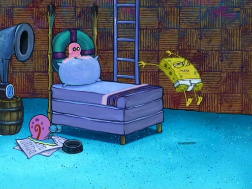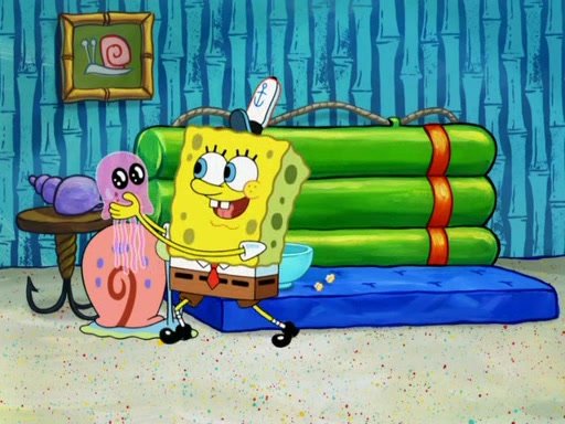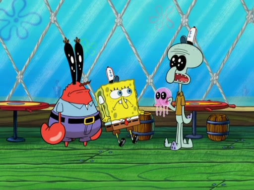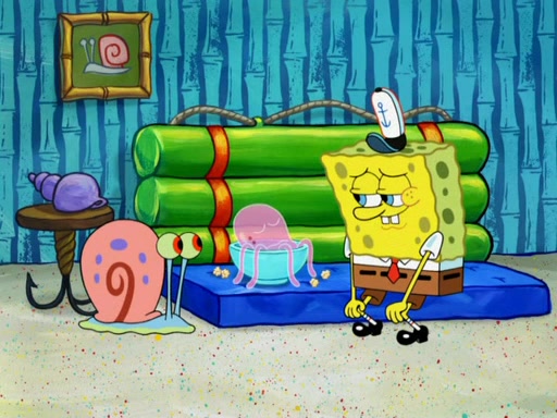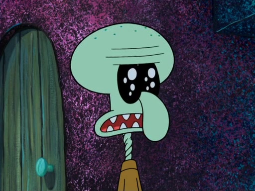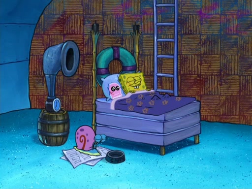 Later, SpongeBob and Jellion Patrick arrive at Squidward's house. Jellion Patrick stuffs his last jellion into Squidward's mail slot, then 1 second later, the jellion's tentacle spits out a tall light blue pile of goo from the window, which morphs into Jellion Squidward. Jellion Squidward and Jellion Patrick wish SpongeBob a good night. SpongeBob sleeps cozily in his bed, as Jellion #1 attempts to consume him, but SpongeBob awakes, with insomnia. As he watches a late movie, Jellion #1 tries again to consume him, but SpongeBob throws popcorn into Jellion #1's mouth. Jellion #1 starts choking on the popcorn, falling behind the couch.