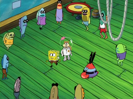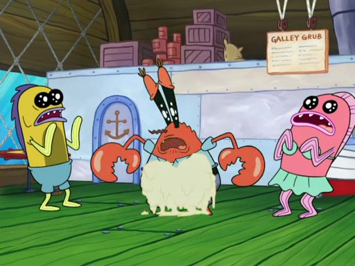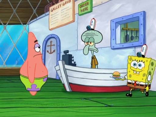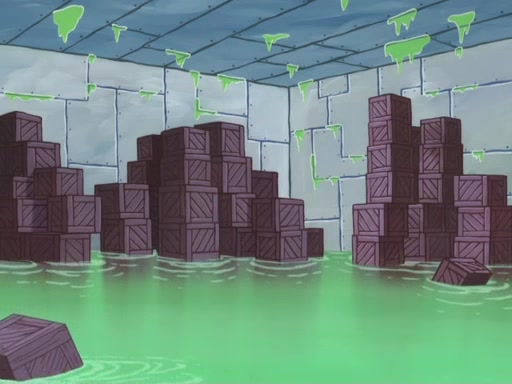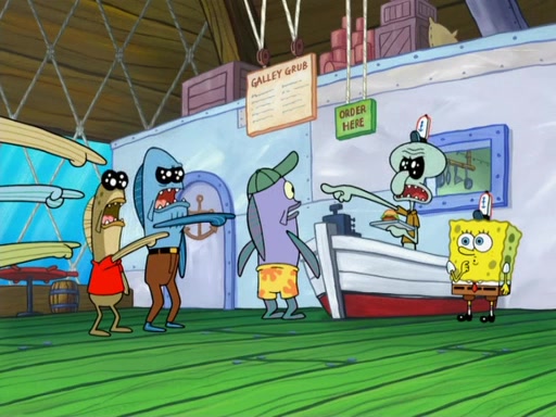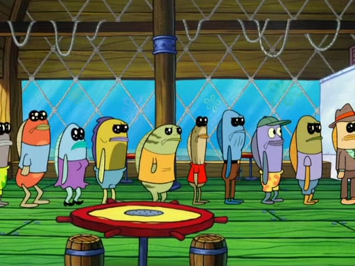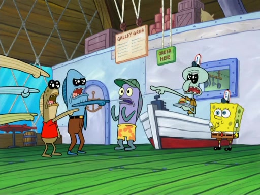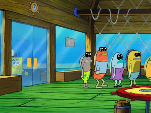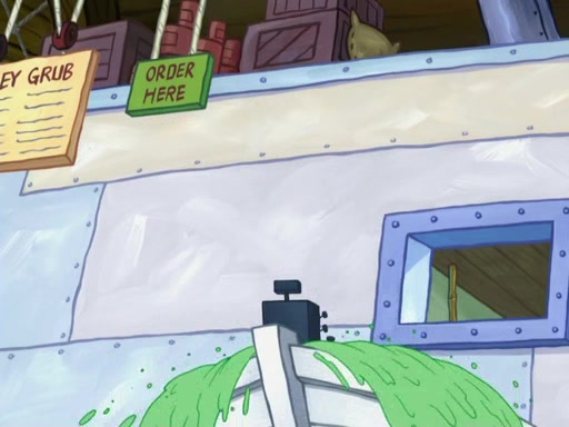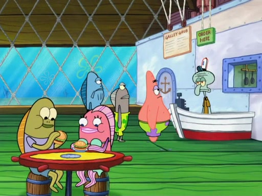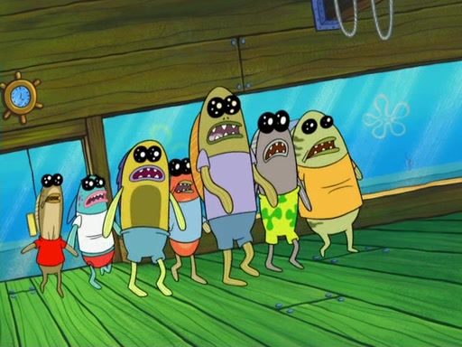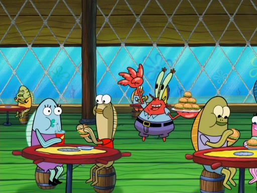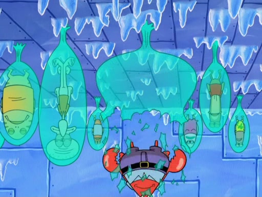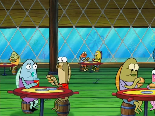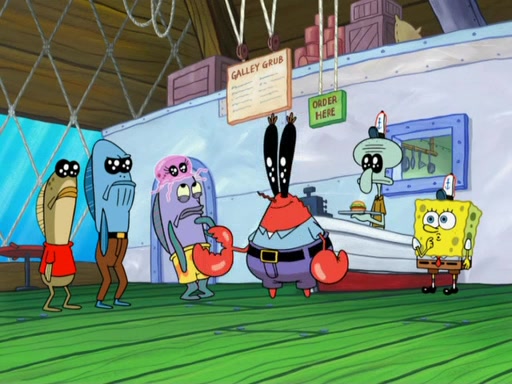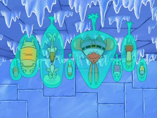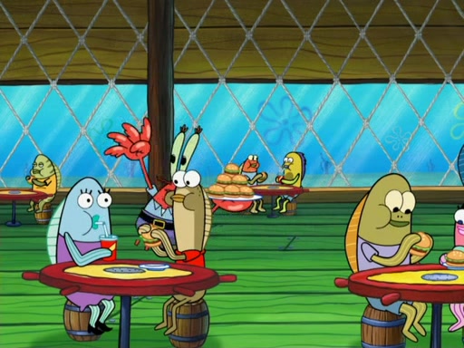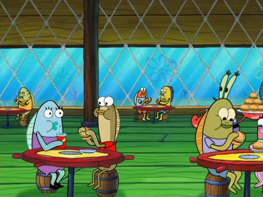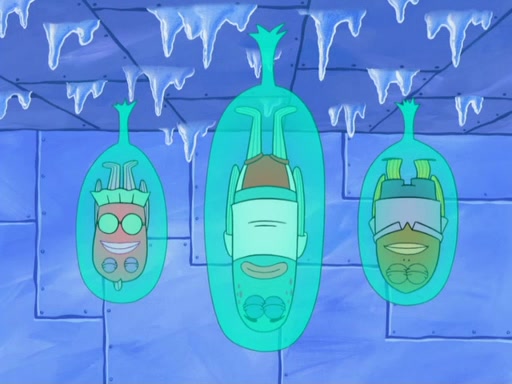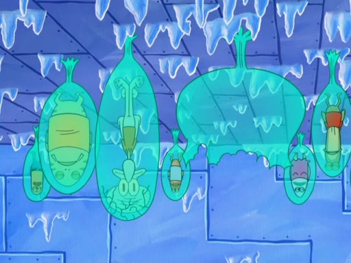 The next morning, SpongeBob puts Jellion #1 into a cage as he leaves for work. Jellion #1 escapes, and consumes Gary as he sleeps next to a plant and the plant. His tentacle spits out another small pile of goo, which reveals a Jellion Gary-plant hybrid. The scene switches to the Krusty Krab, 99% filled with Jellion Bikini Bottomites, except for one man. The jellions order Krabby Patties "hold the mayo" until the guy who wasn't a Jellion orders a Krabby Patty with extra mayo. Jellion Mr. Krabs comes and says that they were out of the condiment called mayo, and he places a jellion on the guy's head. SpongeBob thought that was weird, because the Krusty Krab had a fresh wall of mayo in the freezer. SpongeBob told Jellion Patrick (who was operating the grill) that he was getting mayo for the guy's patty. Patrick turned his head around, his torso still facing the grill, and his mouth tentacles consumed the patty. SpongeBob went to the freezer and grabbed a box of mayo, then he looked through the peephole. It showed everyone in town, minus Sandy, hibernating in transparent green cocoons hanging from the ceiling, as the Jellion King commanded his jellions (on either side of him) to do stuff for him.