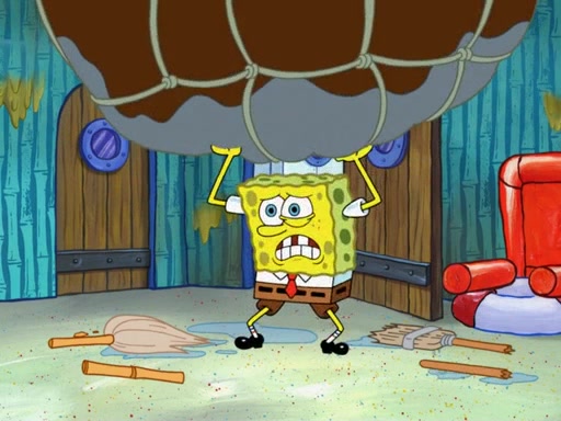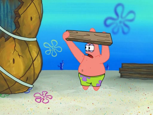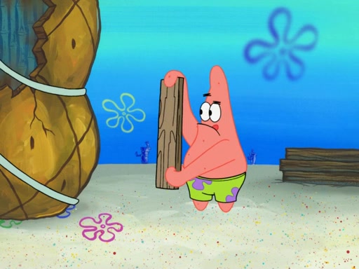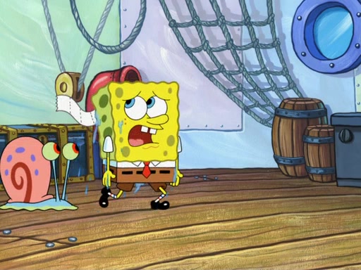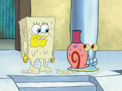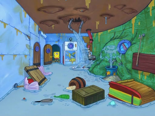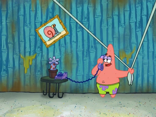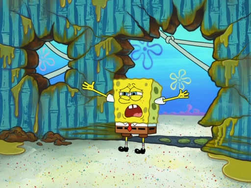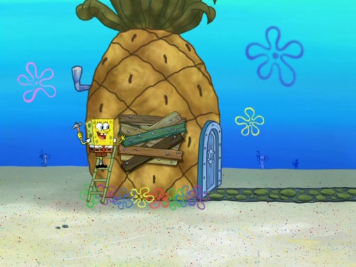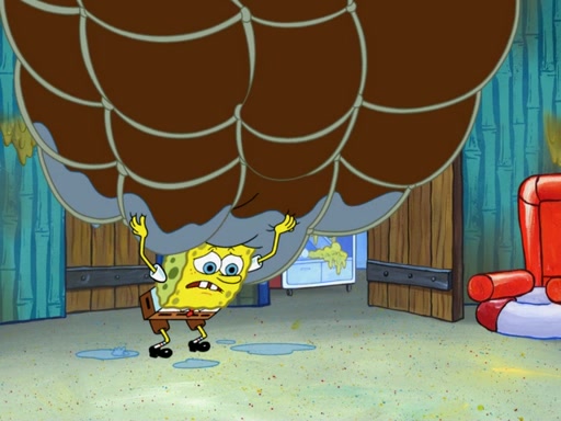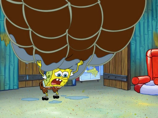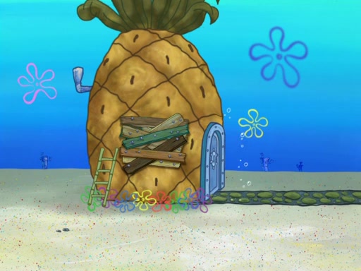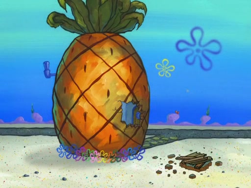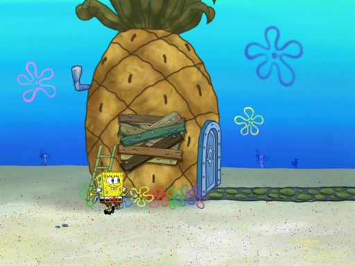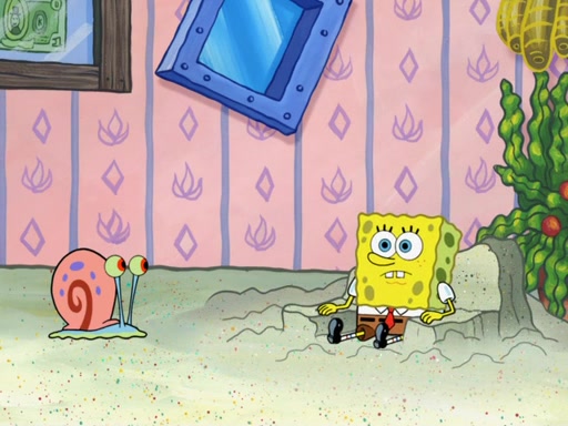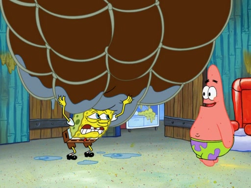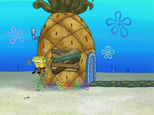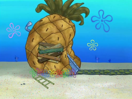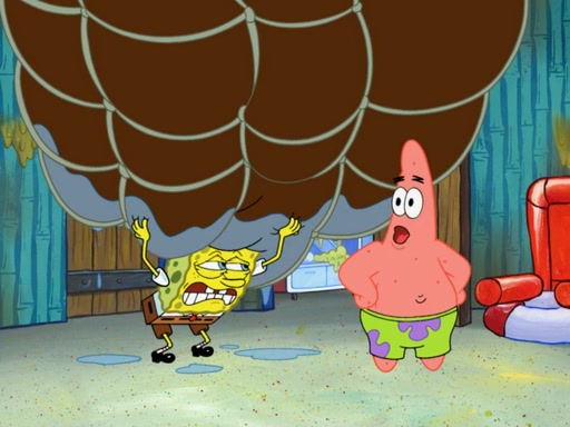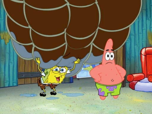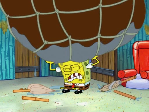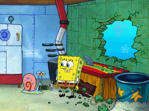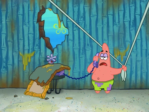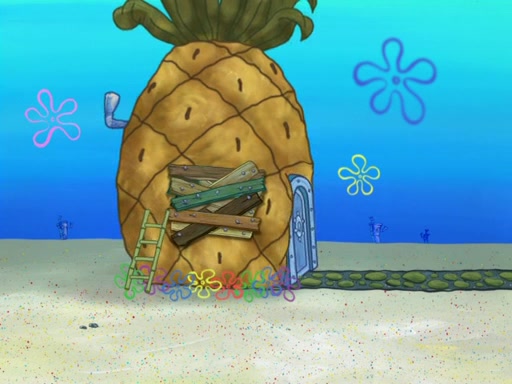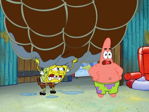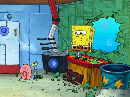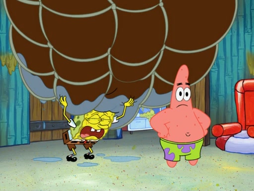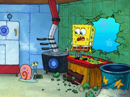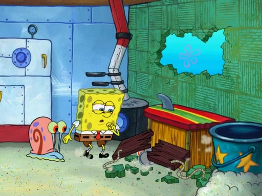 One morning, SpongeBob's pineapple home starts wilting. When SpongeBob wakes up, he's ready to give Gary breakfast, but when he sees his home's condition, he puts off feeding Gary until it's fixed. He boards up the sides, and is ready to feed Gary. However, the ceiling caves in, so he tries to keep it up. He stands under it and holds it up, calling for Patrick to help him. Patrick is dreaming that he is in an office, doing weird things on his desk. The phone rings and Sandy is on the other line and tells him it's from SpongeBob. When the message is put through, Patrick hears SpongeBob calling for help. Then, he wakes up and goes to the pineapple. Squidward comes over after hearing the ruckus and SpongeBob tells him he could use his help. Patrick grabs his arms and wraps him around the pineapple. Gary comes over with a can and meows, but SpongeBob doesn't listen to him.