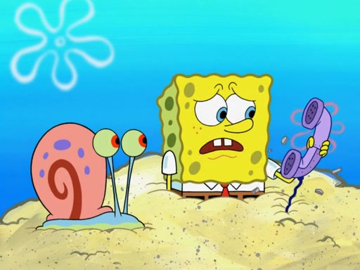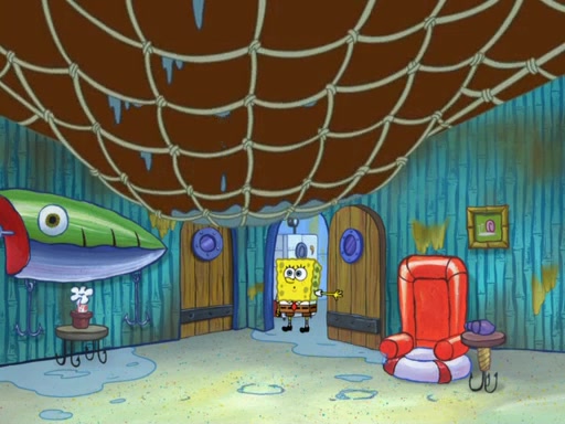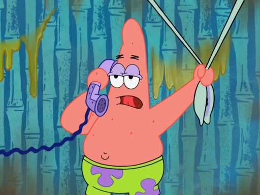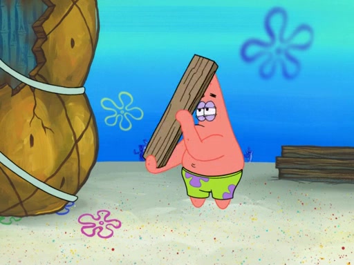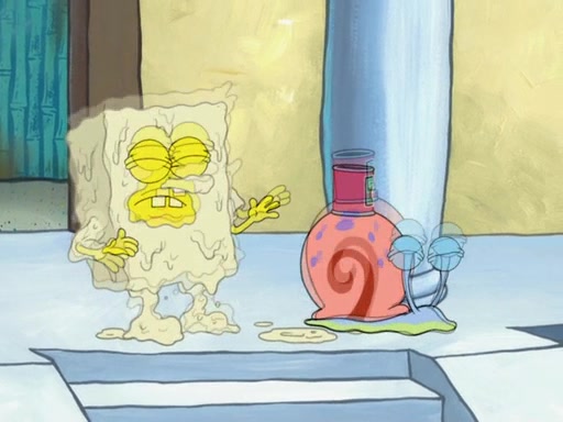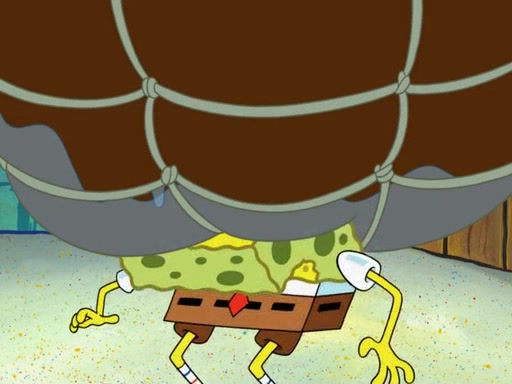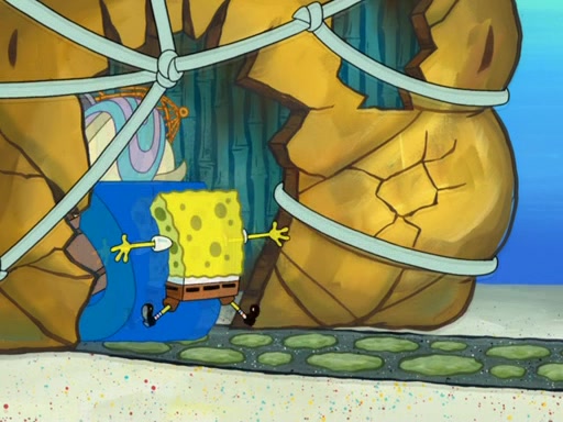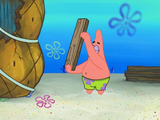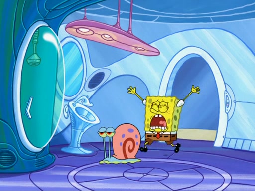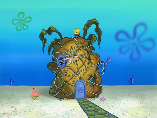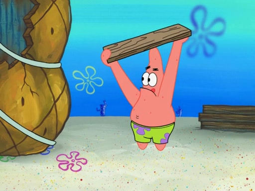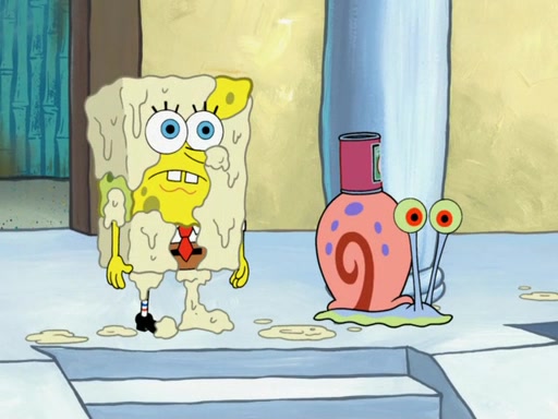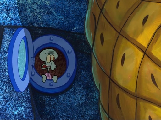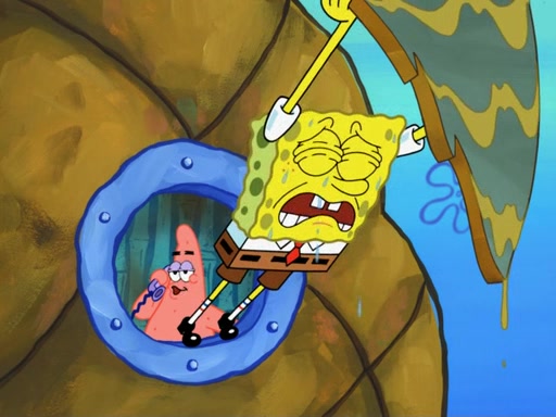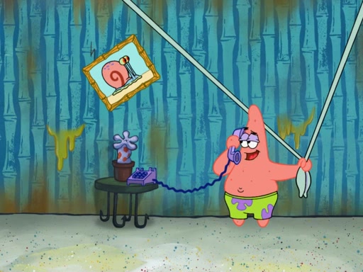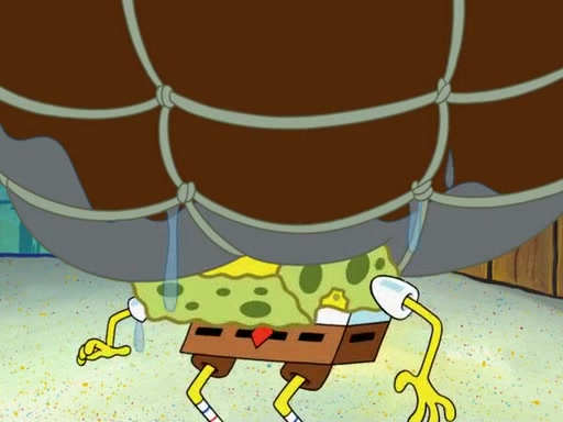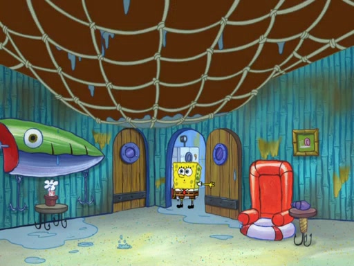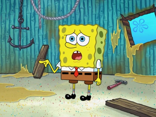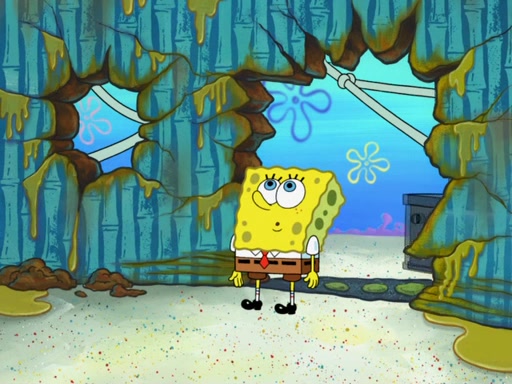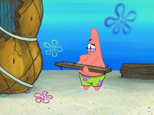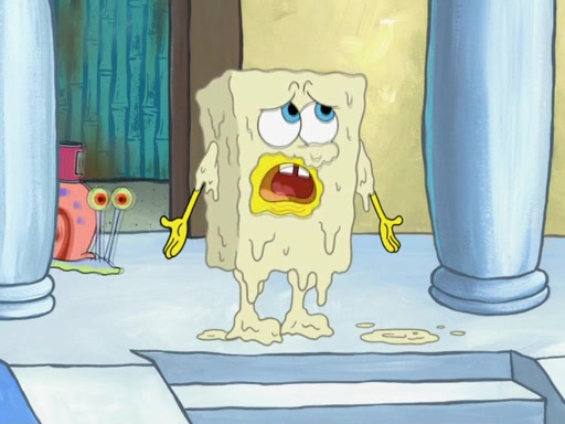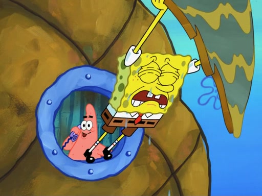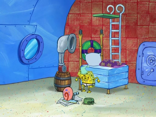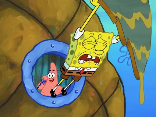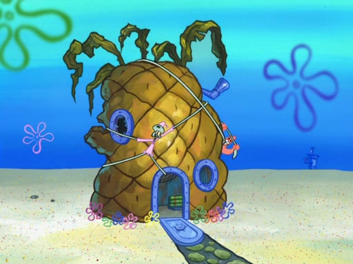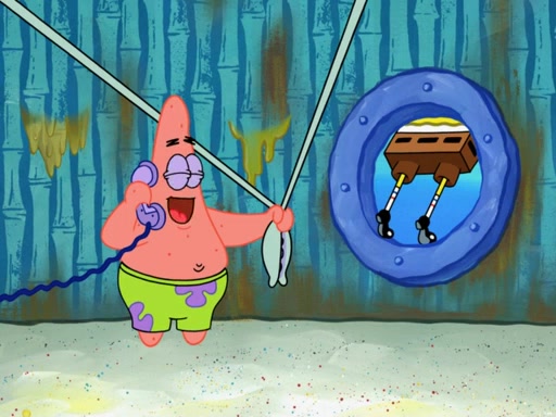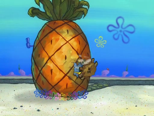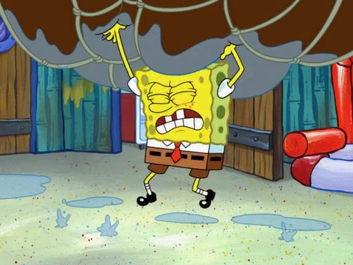One morning, SpongeBob's pineapple home starts wilting. When SpongeBob wakes up, he's ready to give Gary breakfast, but when he sees his home's condition, he puts off feeding Gary until it's fixed. He boards up the sides, and is ready to feed Gary. However, the ceiling caves in, so he tries to keep it up. He stands under it and holds it up, calling for Patrick to help him. Patrick is dreaming that he is in an office, doing weird things on his desk. The phone rings and Sandy is on the other line and tells him it's from SpongeBob. When the message is put through, Patrick hears SpongeBob calling for help. Then, he wakes up and goes to the pineapple. Squidward comes over after hearing the ruckus and SpongeBob tells him he could use his help. Patrick grabs his arms and wraps him around the pineapple. Gary comes over with a can and meows, but SpongeBob doesn't listen to him.