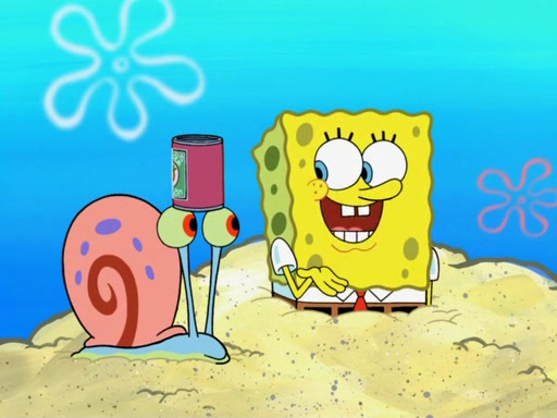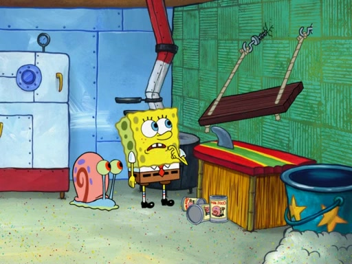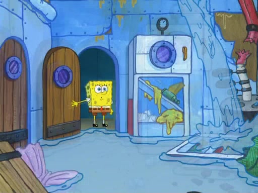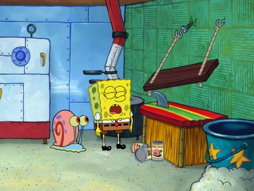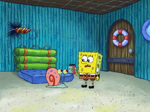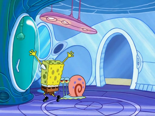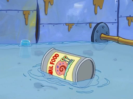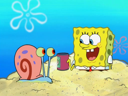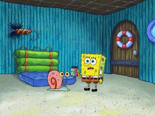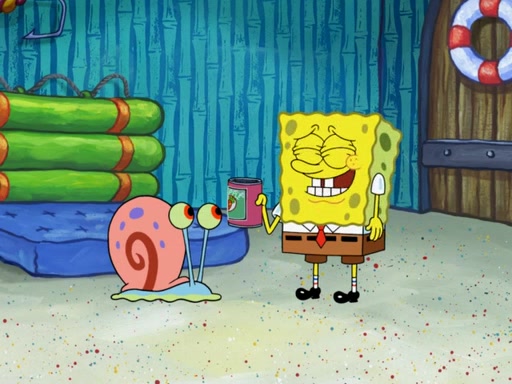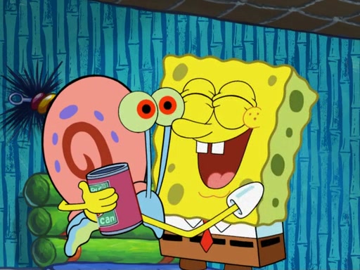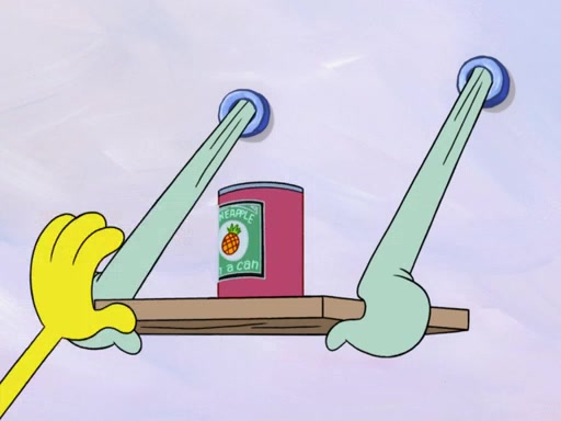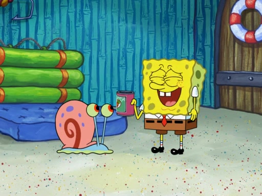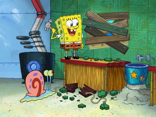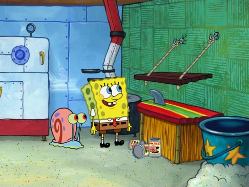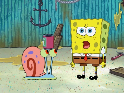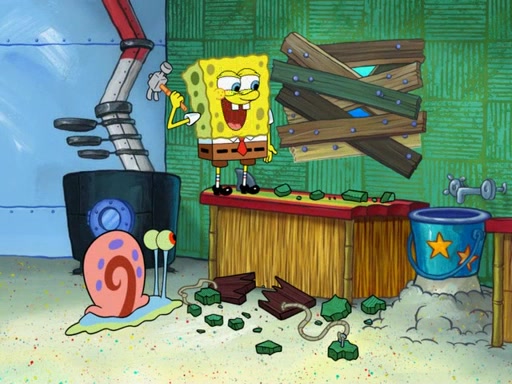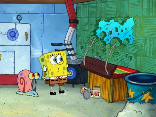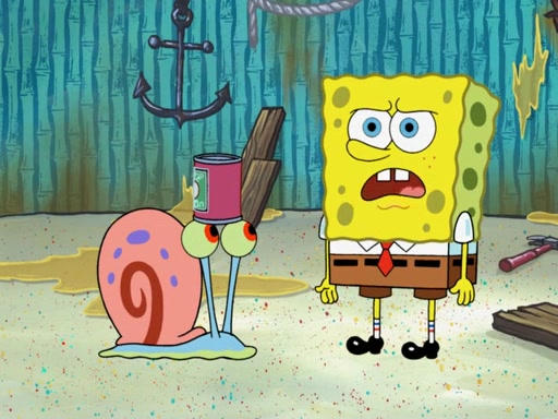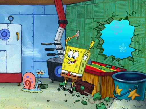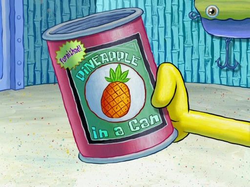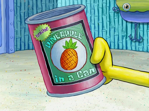 When the rebuilding is complete, SpongeBob is not happy with the changes. He explores his new home and sees Gary is still hungry, so he takes a can from a shelf (being held by Squidward's hands). However, the weight of the can was the only thing keeping Squidward's hands in place, and the home collapses. Climbing out of the rubble, Squidward angrily chastises SpongeBob, but it's cut short by severe pain in his neck, so he goes home. SpongeBob, dejected, calls to have his home condemned. Gary presents SpongeBob with a can, and SpongeBob opens it. Out pops a pineapple, which lands on the rubble and is fully furnished inside. All this time, Gary was trying to show SpongeBob the can, which contained a fully furnished pineapple. SpongeBob opens the can, his house pops out, SpongeBob reads what the can says, "Newly Furnished Pineapple in a Can." SpongeBob then hugs Gary, saying "You're the best!," then laughs happily.