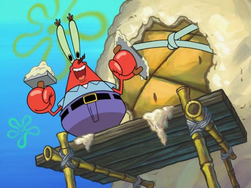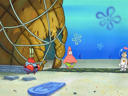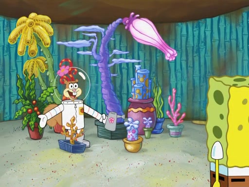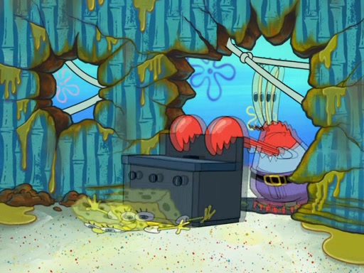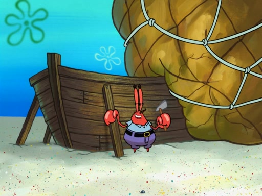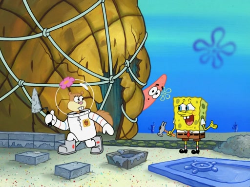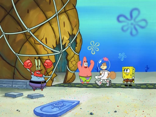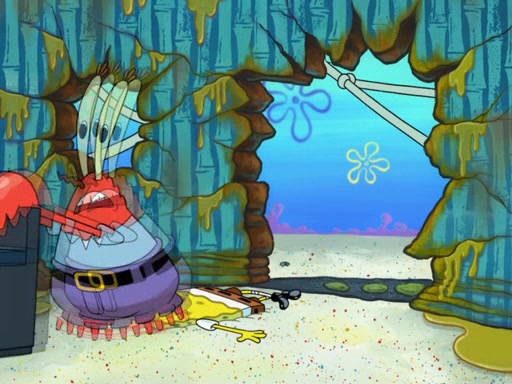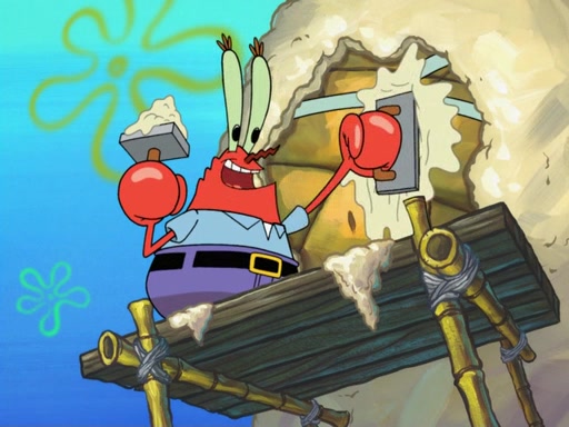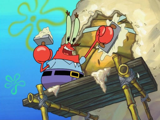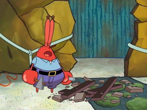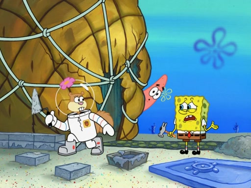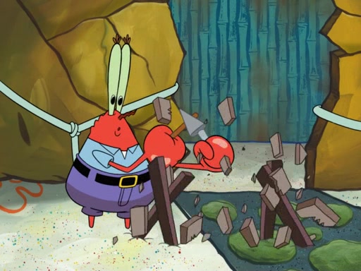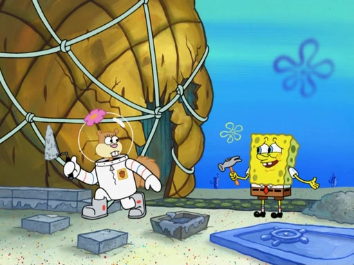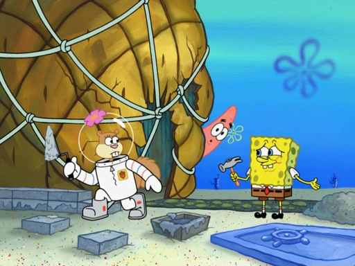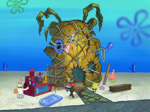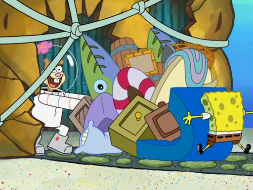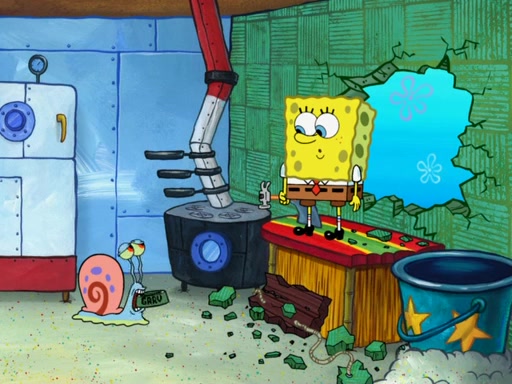 SpongeBob's arms are full, so he asks Patrick to call Sandy. However, Patrick is too stupid to understand how badly he needs her help, and instead has small talk with her. When she hears part of the wall falling, she realizes that something is not right, so she goes to the pineapple. Mr. Krabs also comes over, asking what's going on, since SpongeBob is two hours late for work. They agree to help him, but Mr. Krabs will do it for one week of SpongeBob's wages per hour. They remodel the home as Gary continues to walk around with a can. Mr. Krabs remodels the home his way, as Sandy also remodels the home her way, both ignoring SpongeBob's protests. SpongeBob asks Gary, who is holding a can, if he ever feels like he's being ignored, and Gary assents.