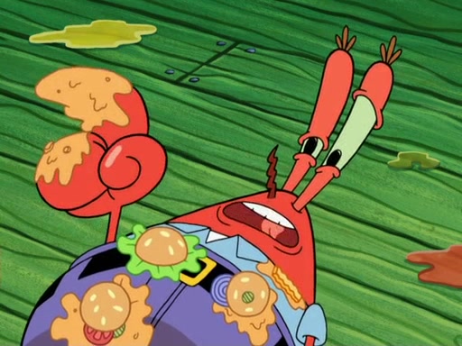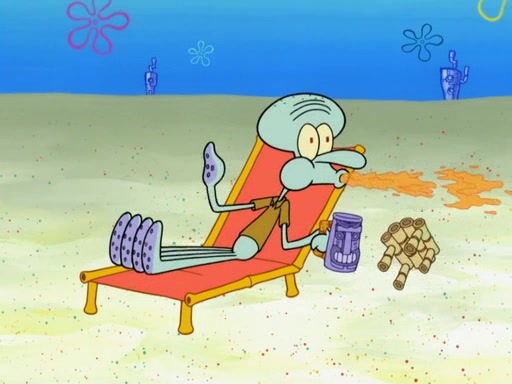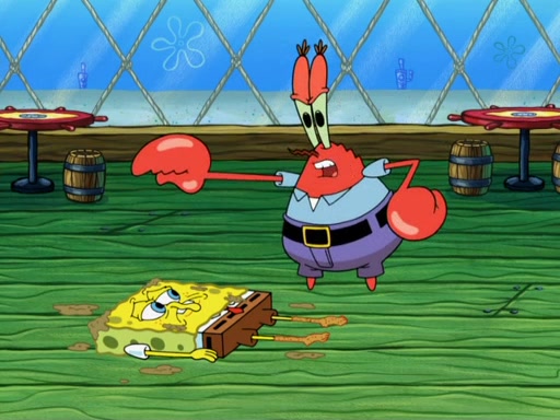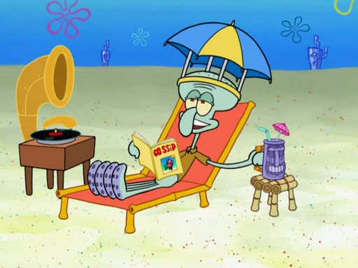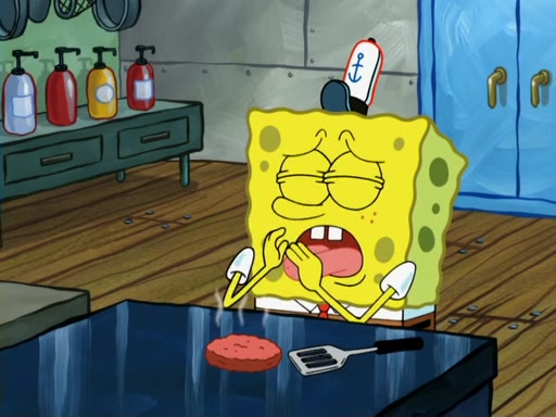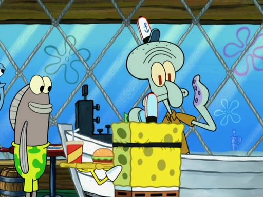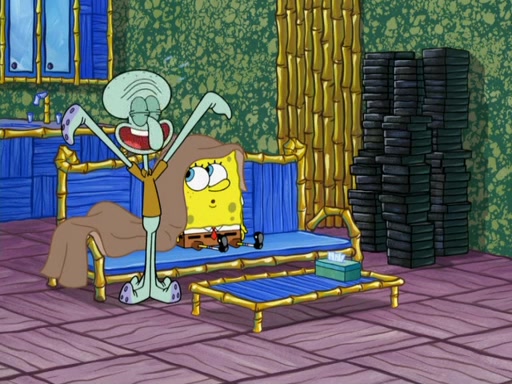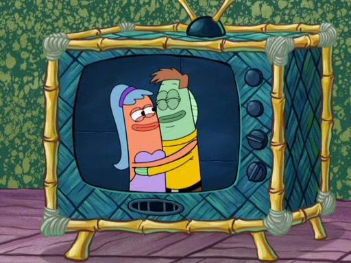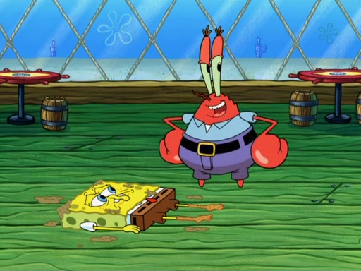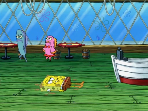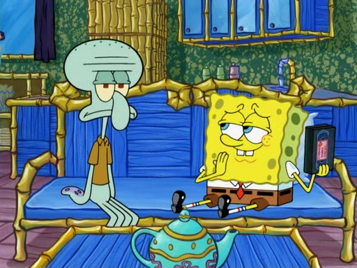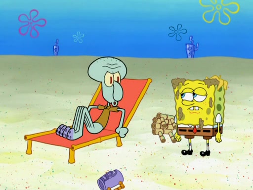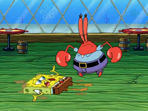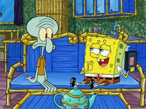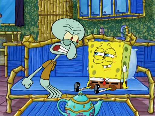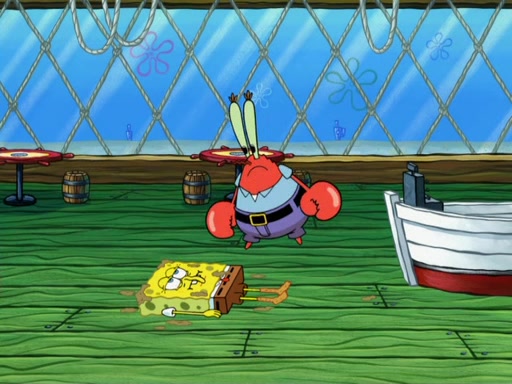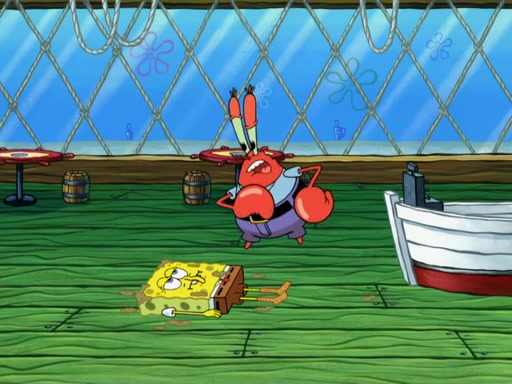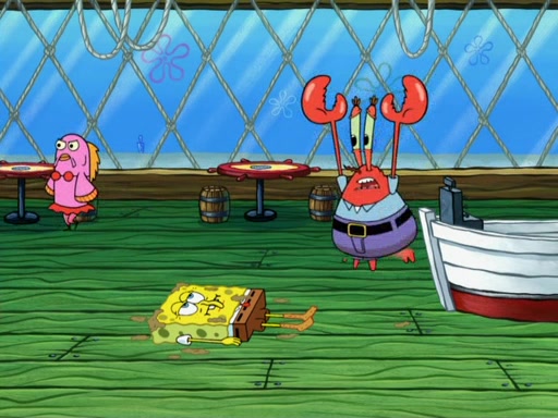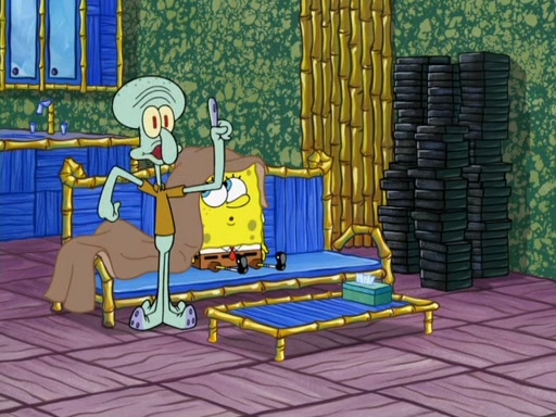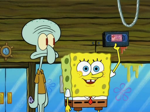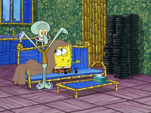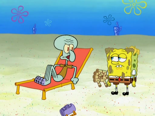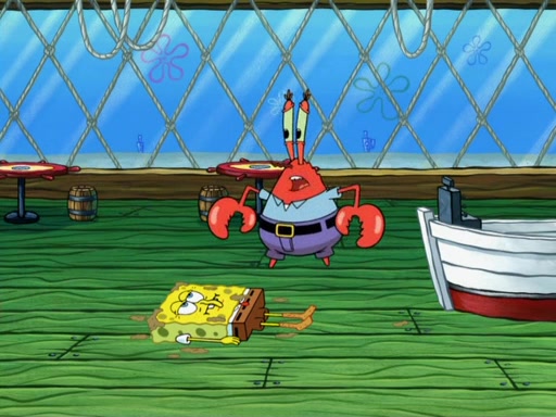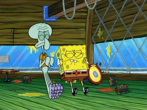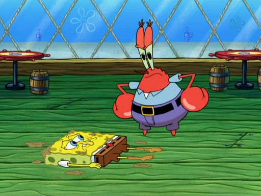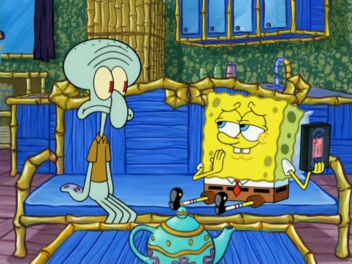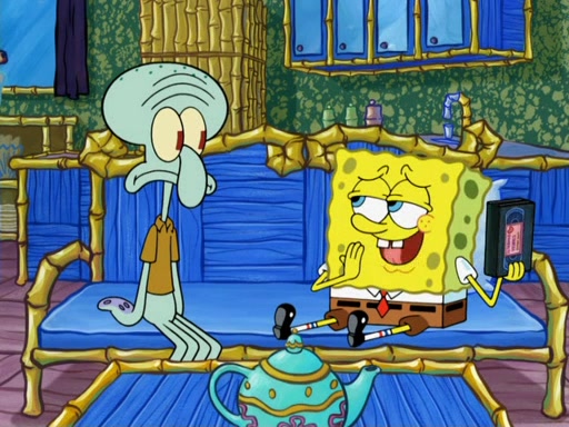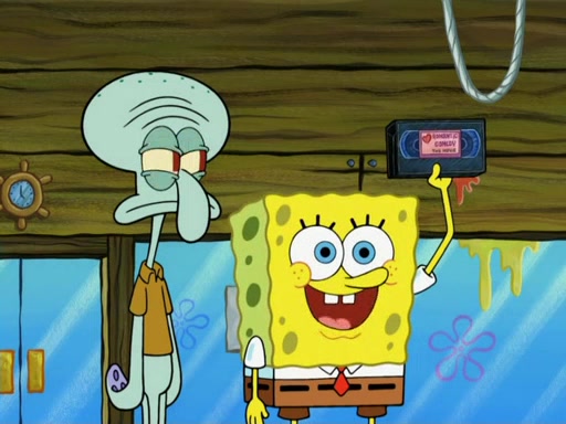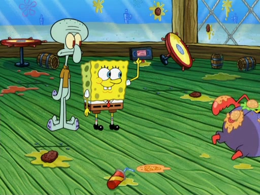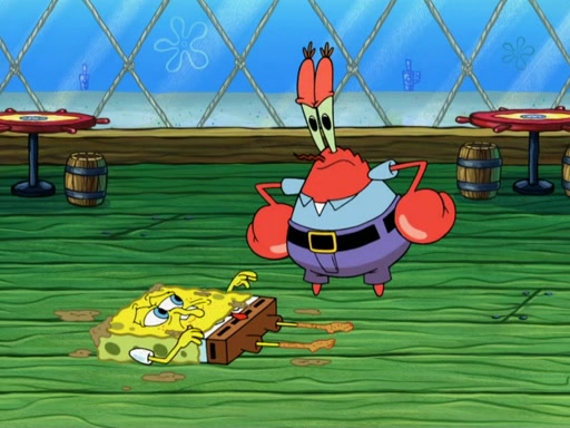 Squidward lies on a beach chair, enjoying his break when a garbage-covered SpongeBob comes along. Squidward is annoyed, and then goes into his house to at least enjoy himself inside. But SpongeBob goes in with him, and presents a video tape with a romantic comedy on it. Squidward immediately gets angry at SpongeBob. At the Krusty Krab, Mr. Krabs is having a hard time fulfilling orders and angers customers by throwing food at them and all over the place. Back at Squidward's home, the movie is over. But when SpongeBob says there are 99 more sequels to watch, Squidward can't take it anymore and runs out, screaming. SpongeBob follows him to the Krusty Krab, where Mr. Krabs lies on the ground, covered with Krabby Patty pieces, woozily telling SpongeBob that he could take care of everything. Noticing Mr. Krabs isn't feeling good, SpongeBob presents him with the video tape of the romantic comedy. And the episode ends with Mr. Krabs telling him to get away and runs away from him.