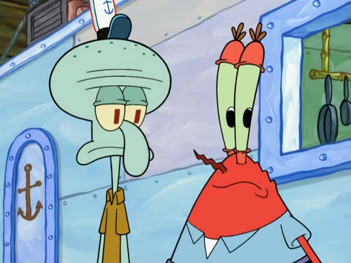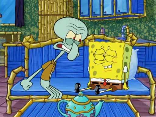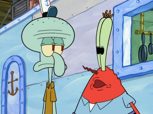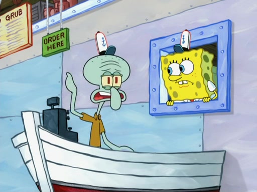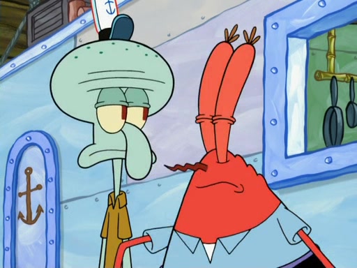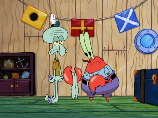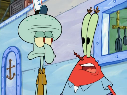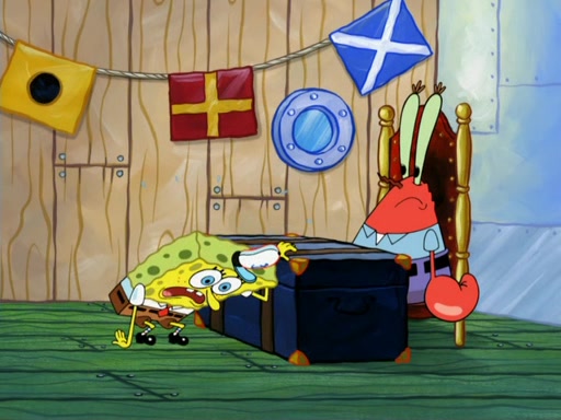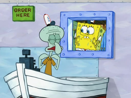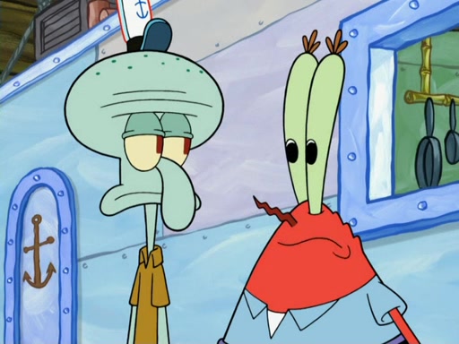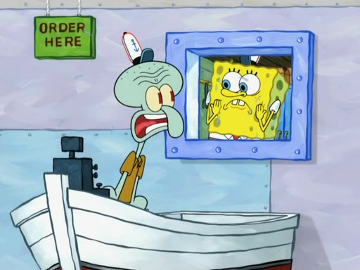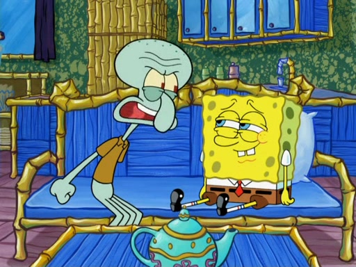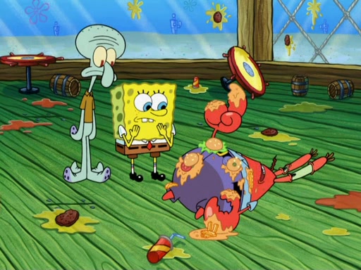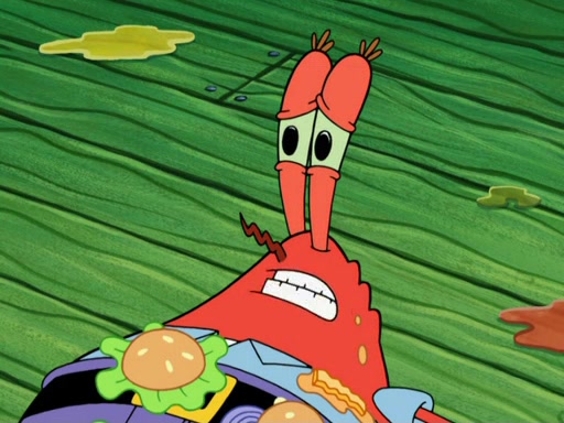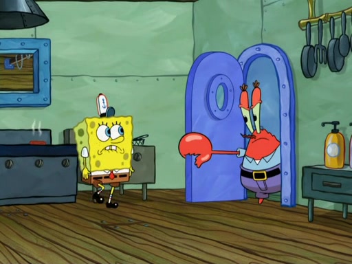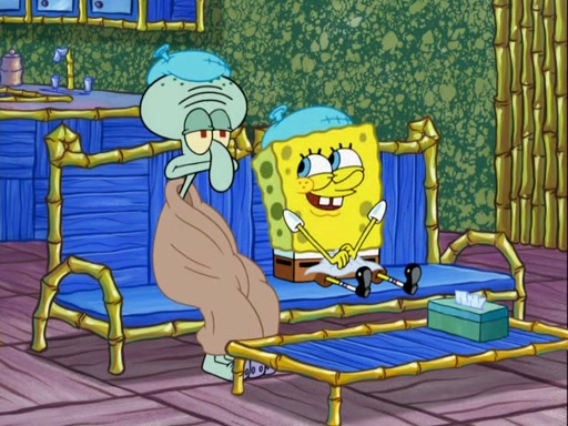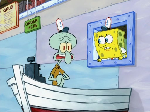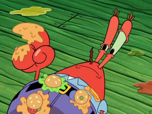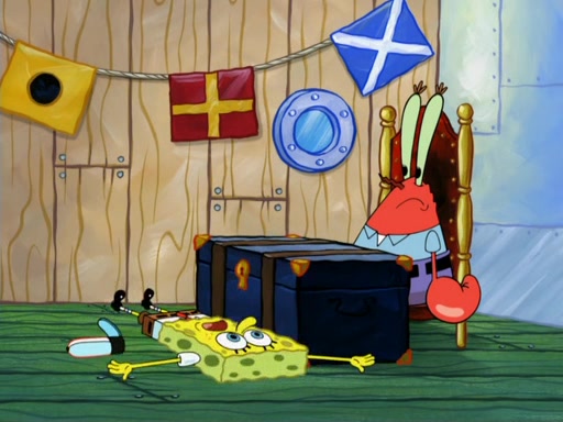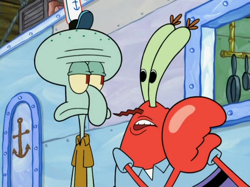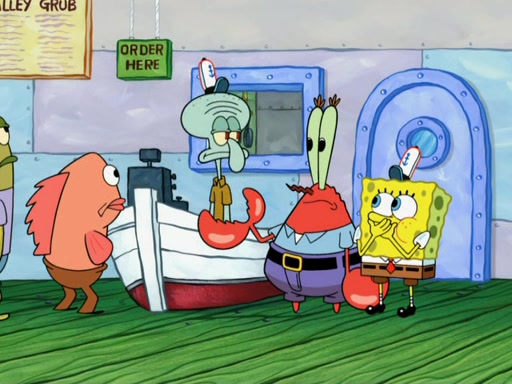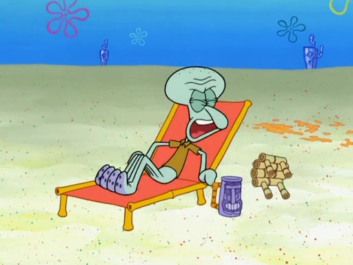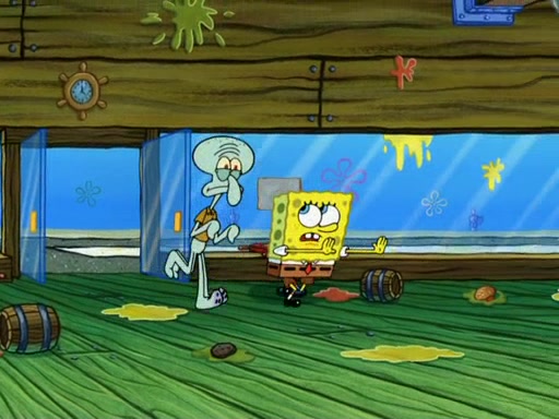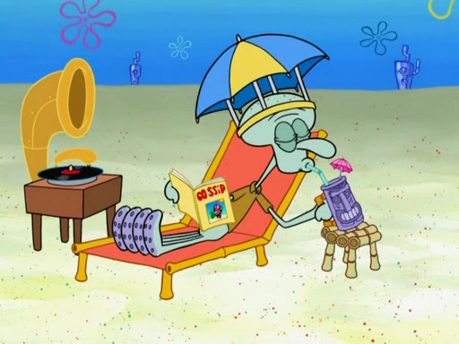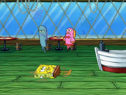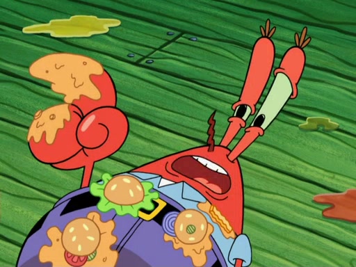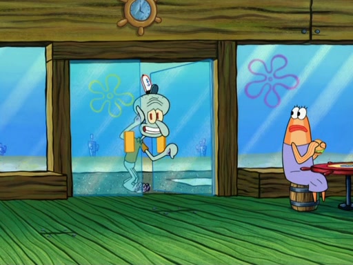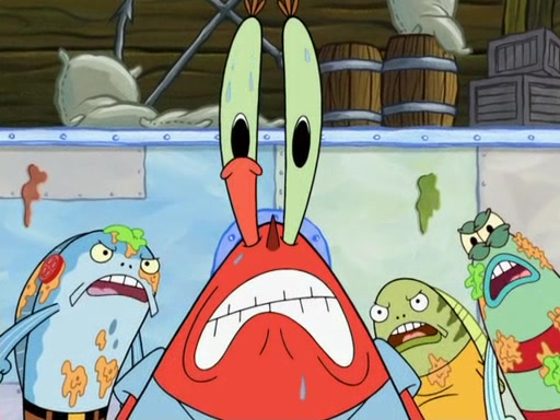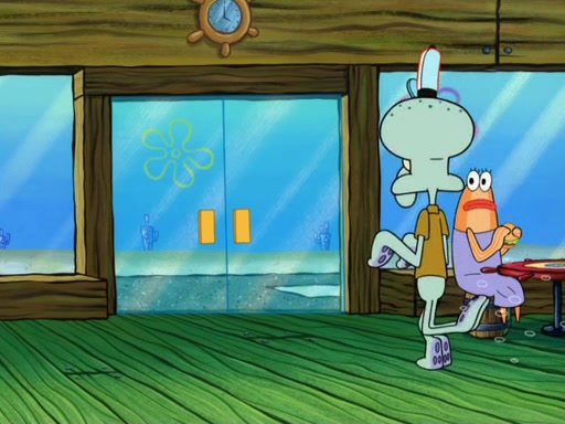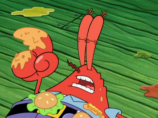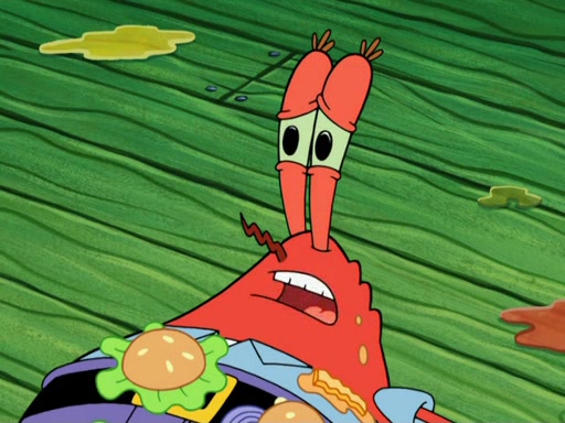 Squidward lies on a beach chair, enjoying his break when a garbage-covered SpongeBob comes along. Squidward is annoyed, and then goes into his house to at least enjoy himself inside. But SpongeBob goes in with him, and presents a video tape with a romantic comedy on it. Squidward immediately gets angry at SpongeBob. At the Krusty Krab, Mr. Krabs is having a hard time fulfilling orders and angers customers by throwing food at them and all over the place. Back at Squidward's home, the movie is over. But when SpongeBob says there are 99 more sequels to watch, Squidward can't take it anymore and runs out, screaming. SpongeBob follows him to the Krusty Krab, where Mr. Krabs lies on the ground, covered with Krabby Patty pieces, woozily telling SpongeBob that he could take care of everything. Noticing Mr. Krabs isn't feeling good, SpongeBob presents him with the video tape of the romantic comedy. And the episode ends with Mr. Krabs telling him to get away and runs away from him.