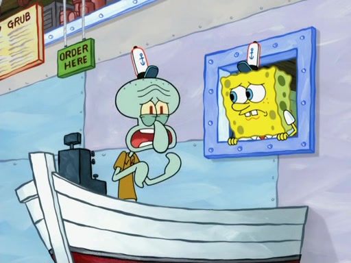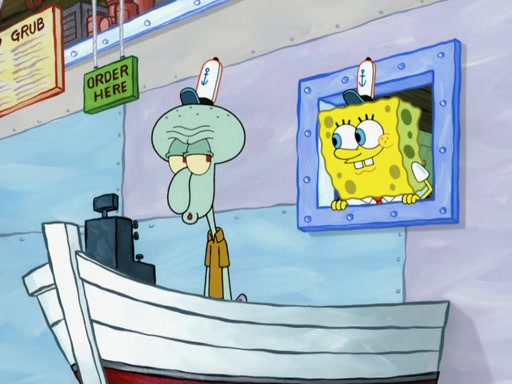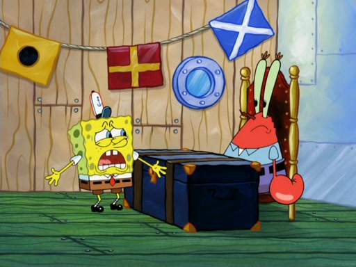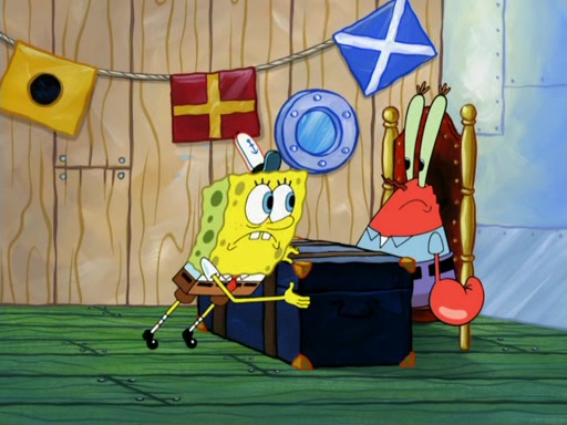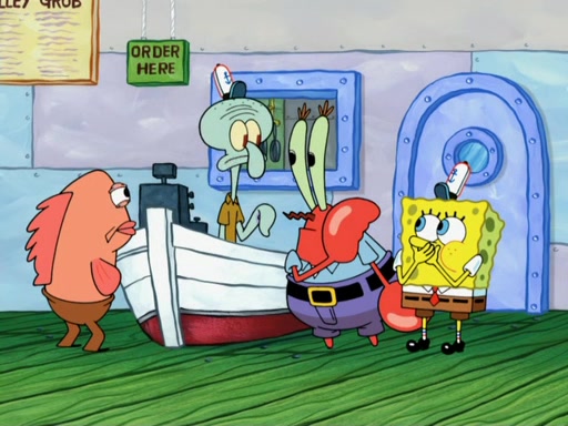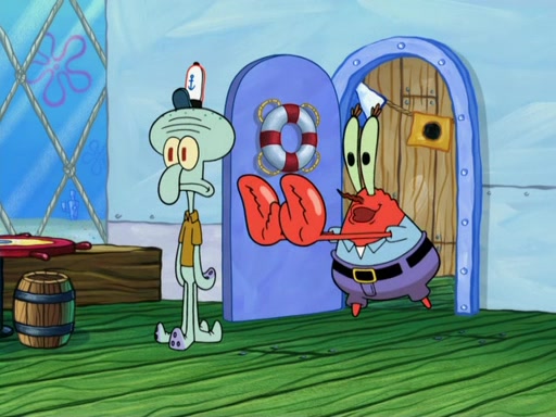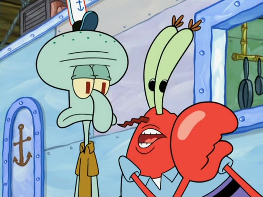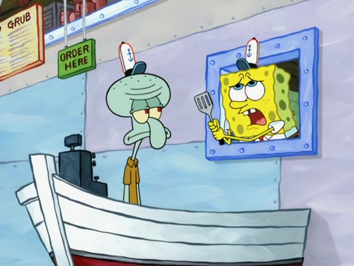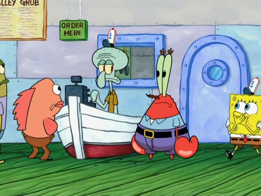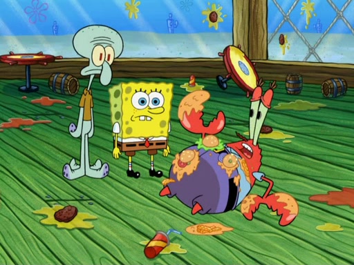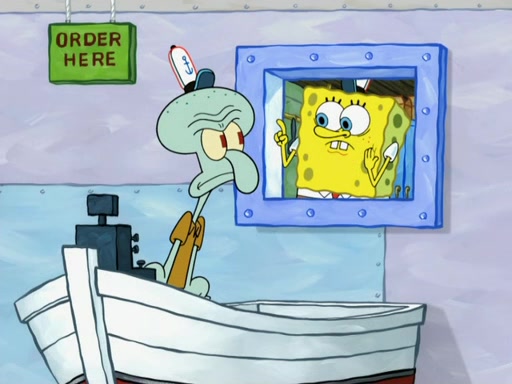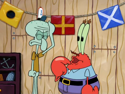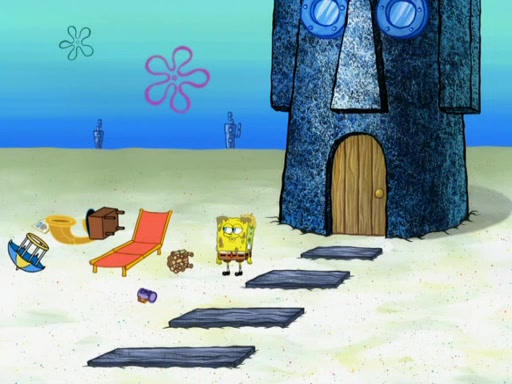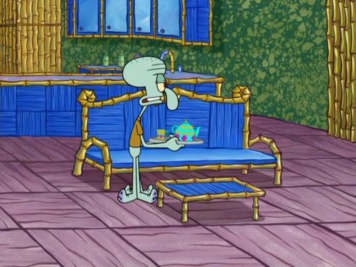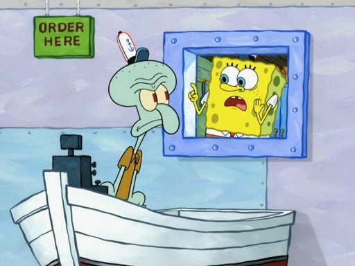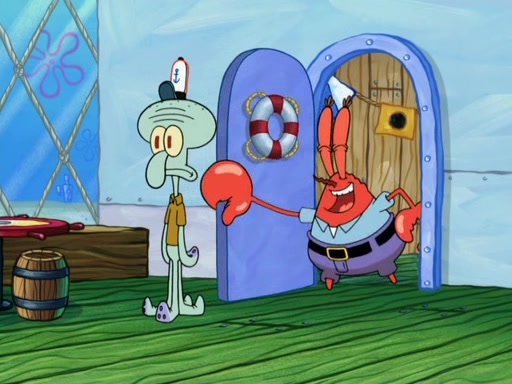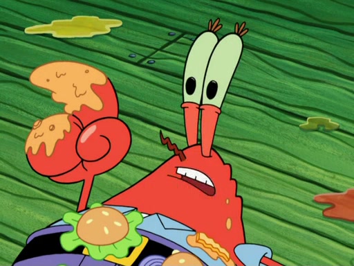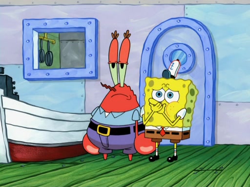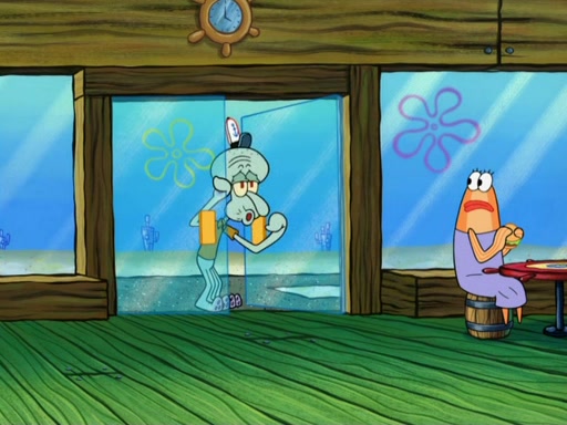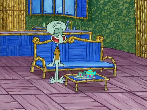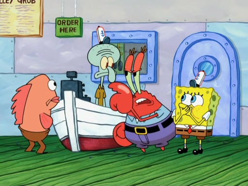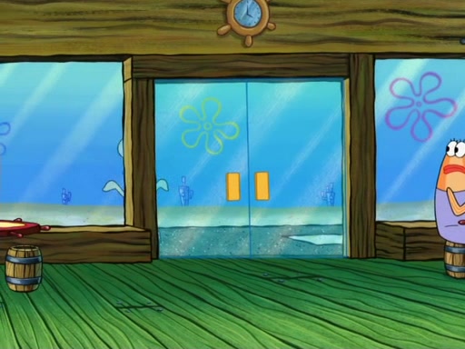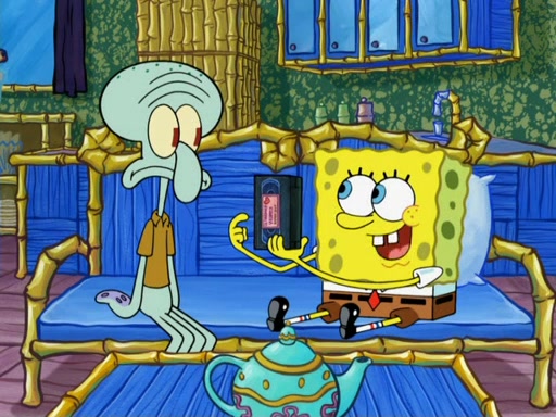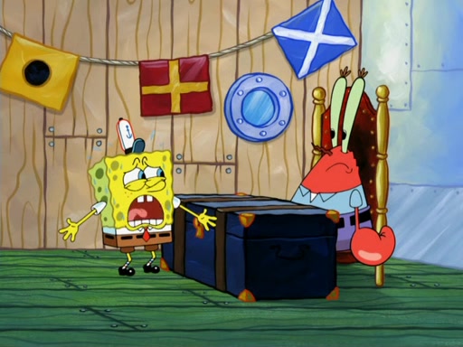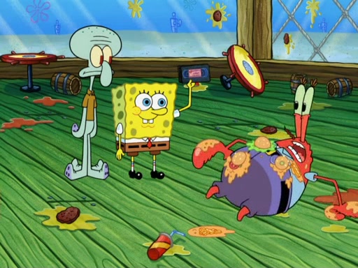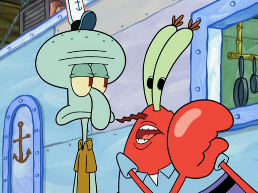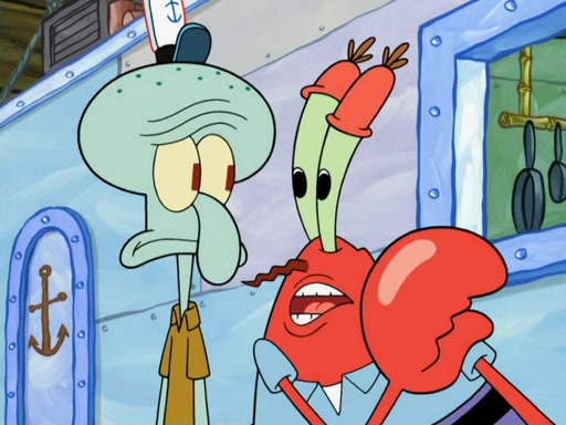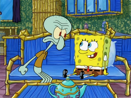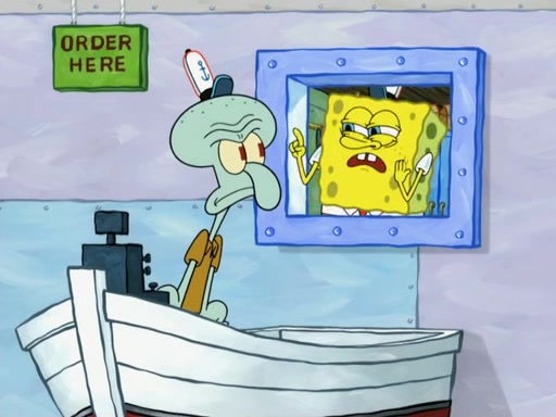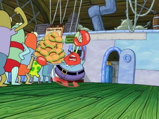 Squidward lies on a beach chair, enjoying his break when a garbage-covered SpongeBob comes along. Squidward is annoyed, and then goes into his house to at least enjoy himself inside. But SpongeBob goes in with him, and presents a video tape with a romantic comedy on it. Squidward immediately gets angry at SpongeBob. At the Krusty Krab, Mr. Krabs is having a hard time fulfilling orders and angers customers by throwing food at them and all over the place. Back at Squidward's home, the movie is over. But when SpongeBob says there are 99 more sequels to watch, Squidward can't take it anymore and runs out, screaming. SpongeBob follows him to the Krusty Krab, where Mr. Krabs lies on the ground, covered with Krabby Patty pieces, woozily telling SpongeBob that he could take care of everything. Noticing Mr. Krabs isn't feeling good, SpongeBob presents him with the video tape of the romantic comedy. And the episode ends with Mr. Krabs telling him to get away and runs away from him.