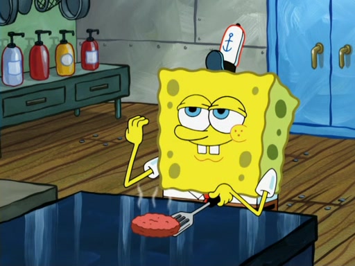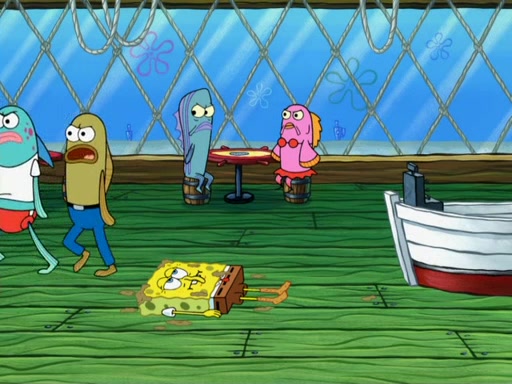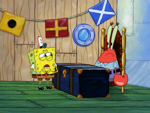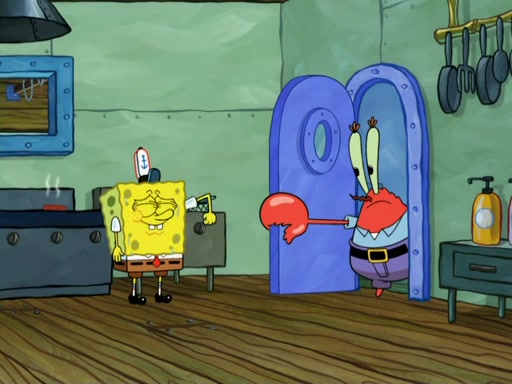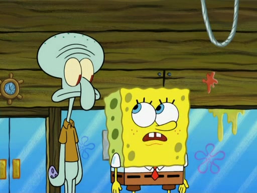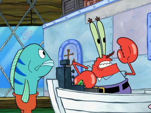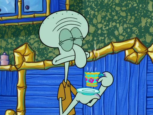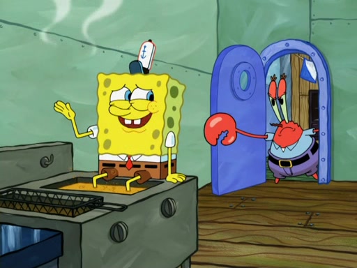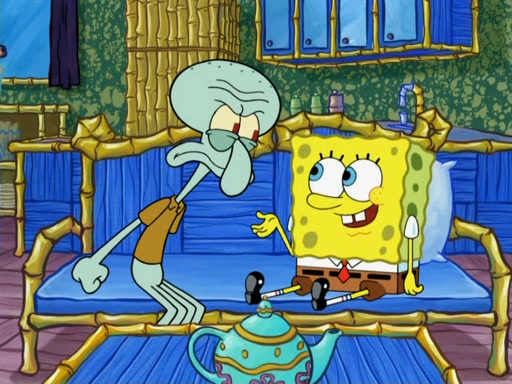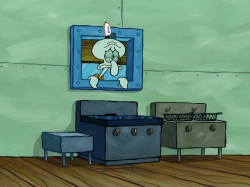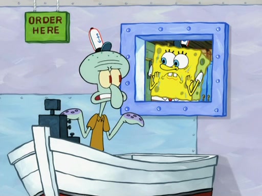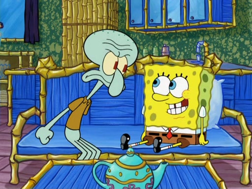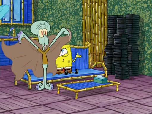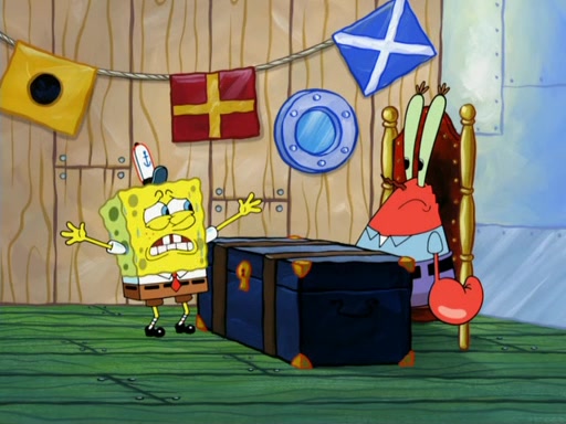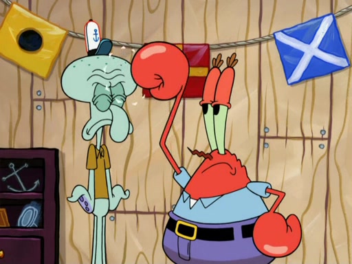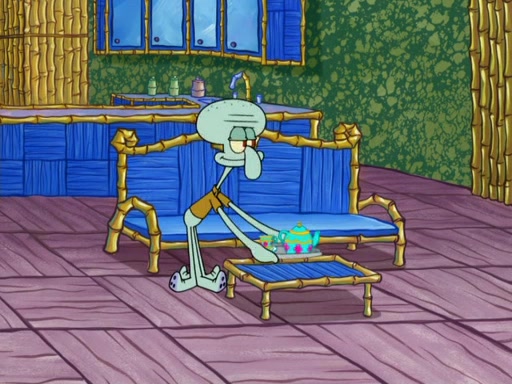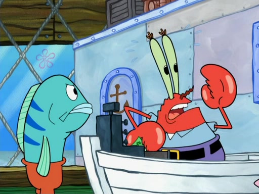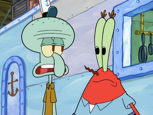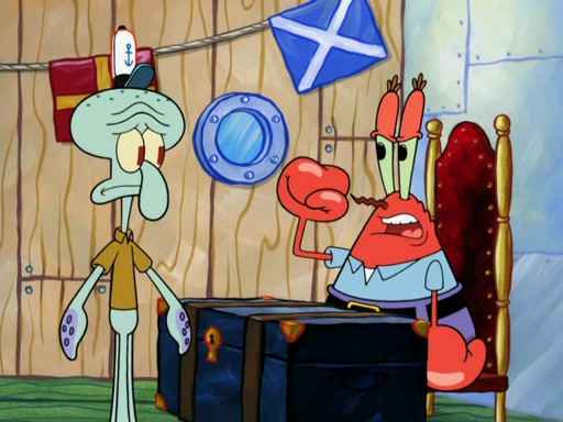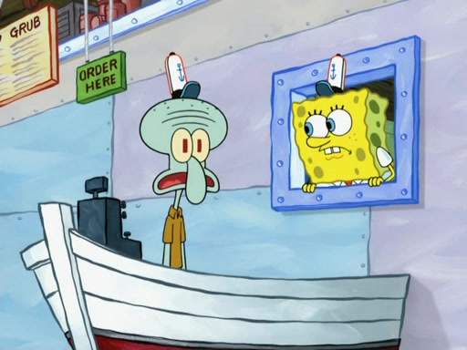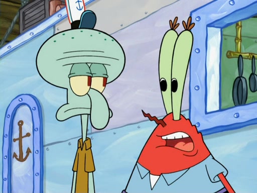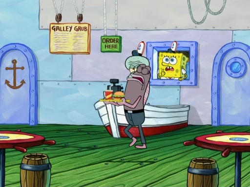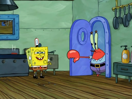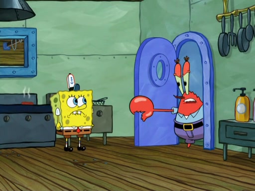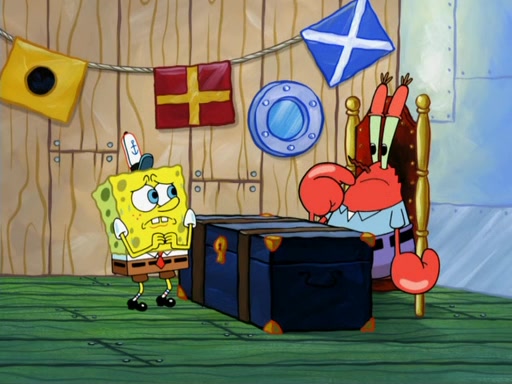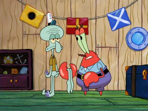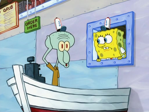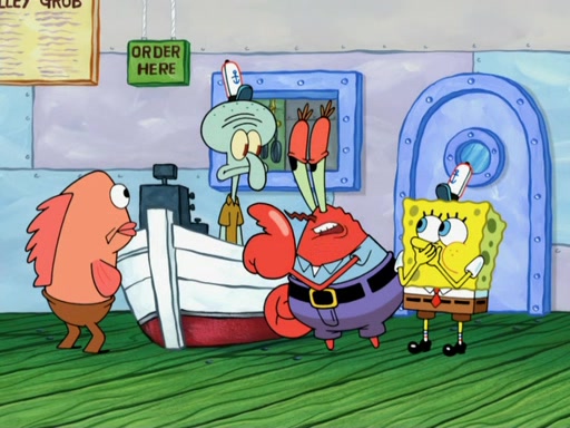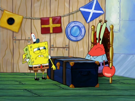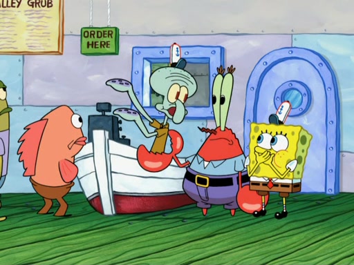 Squidward lies on a beach chair, enjoying his break when a garbage-covered SpongeBob comes along. Squidward is annoyed, and then goes into his house to at least enjoy himself inside. But SpongeBob goes in with him, and presents a video tape with a romantic comedy on it. Squidward immediately gets angry at SpongeBob. At the Krusty Krab, Mr. Krabs is having a hard time fulfilling orders and angers customers by throwing food at them and all over the place. Back at Squidward's home, the movie is over. But when SpongeBob says there are 99 more sequels to watch, Squidward can't take it anymore and runs out, screaming. SpongeBob follows him to the Krusty Krab, where Mr. Krabs lies on the ground, covered with Krabby Patty pieces, woozily telling SpongeBob that he could take care of everything. Noticing Mr. Krabs isn't feeling good, SpongeBob presents him with the video tape of the romantic comedy. And the episode ends with Mr. Krabs telling him to get away and runs away from him.