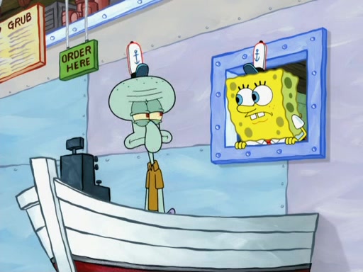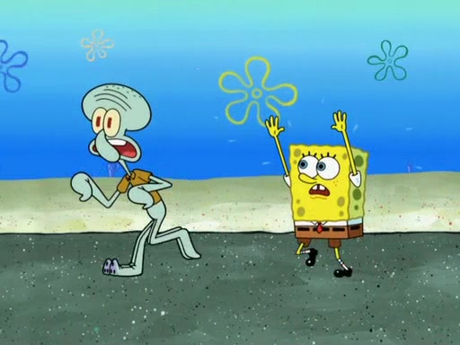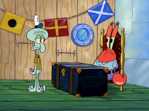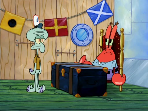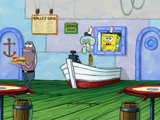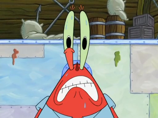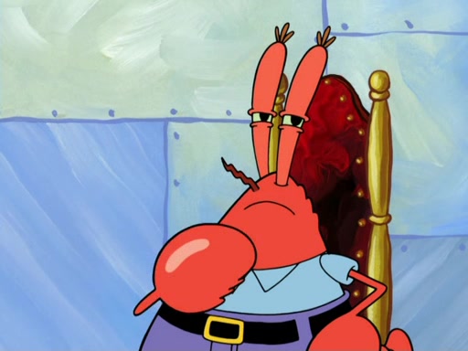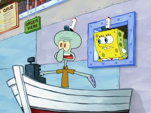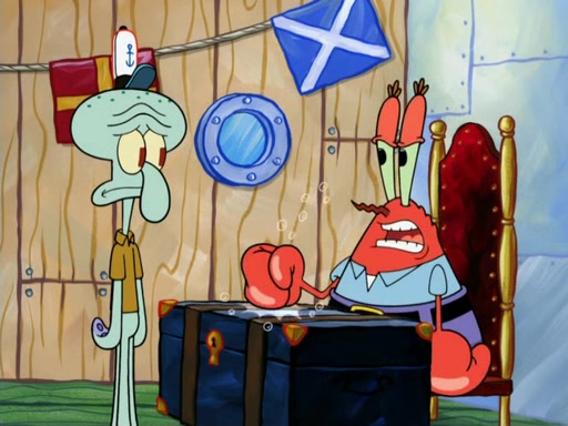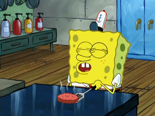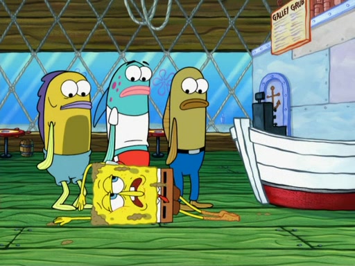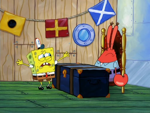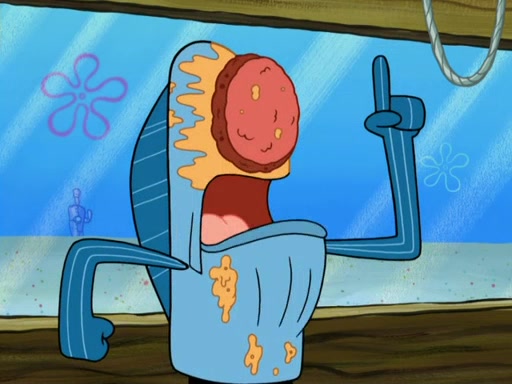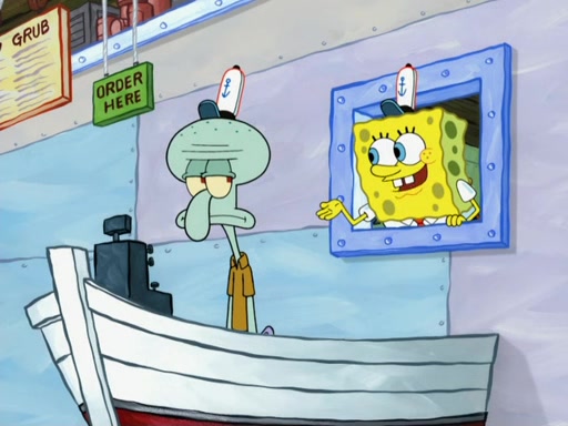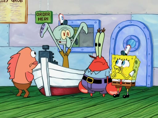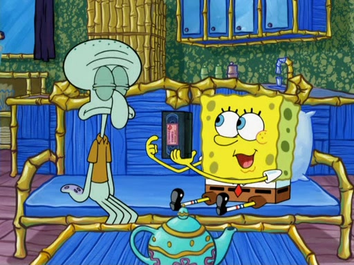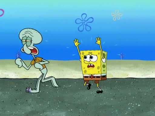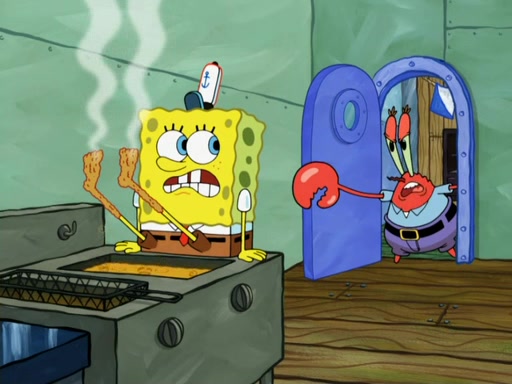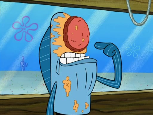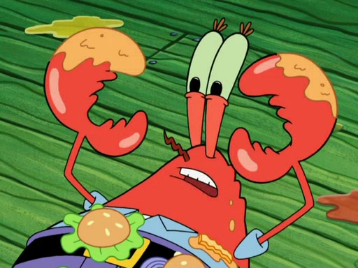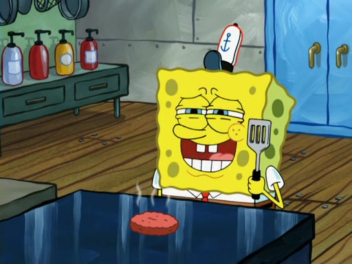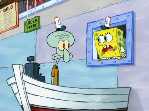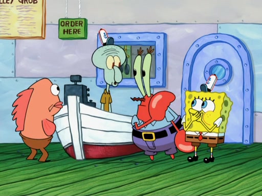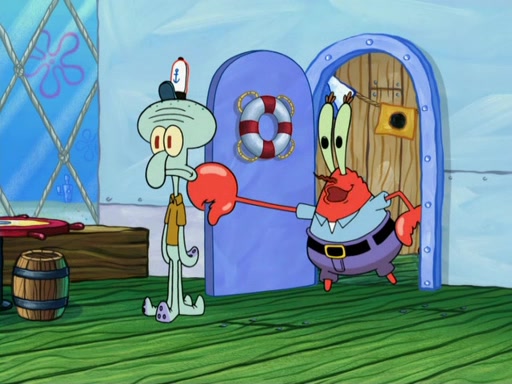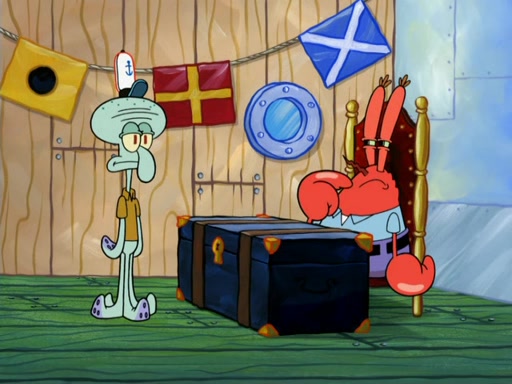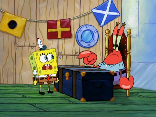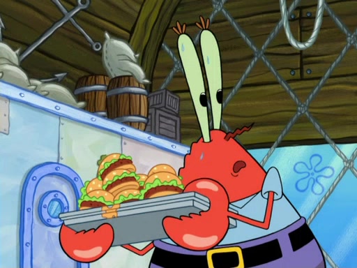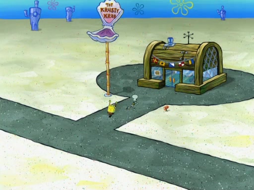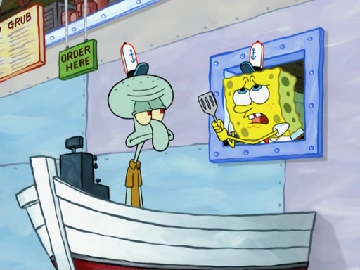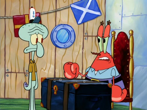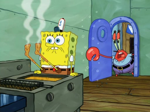 Squidward lies on a beach chair, enjoying his break when a garbage-covered SpongeBob comes along. Squidward is annoyed, and then goes into his house to at least enjoy himself inside. But SpongeBob goes in with him, and presents a video tape with a romantic comedy on it. Squidward immediately gets angry at SpongeBob. At the Krusty Krab, Mr. Krabs is having a hard time fulfilling orders and angers customers by throwing food at them and all over the place. Back at Squidward's home, the movie is over. But when SpongeBob says there are 99 more sequels to watch, Squidward can't take it anymore and runs out, screaming. SpongeBob follows him to the Krusty Krab, where Mr. Krabs lies on the ground, covered with Krabby Patty pieces, woozily telling SpongeBob that he could take care of everything. Noticing Mr. Krabs isn't feeling good, SpongeBob presents him with the video tape of the romantic comedy. And the episode ends with Mr. Krabs telling him to get away and runs away from him.