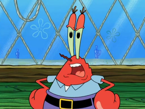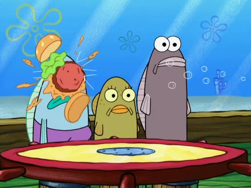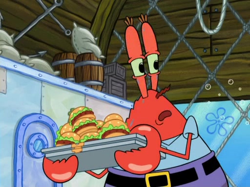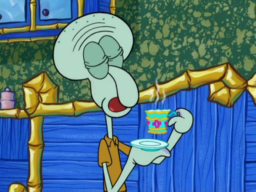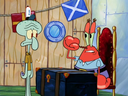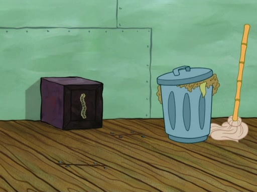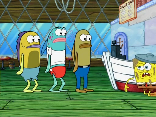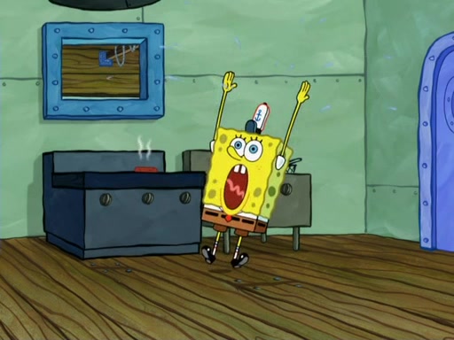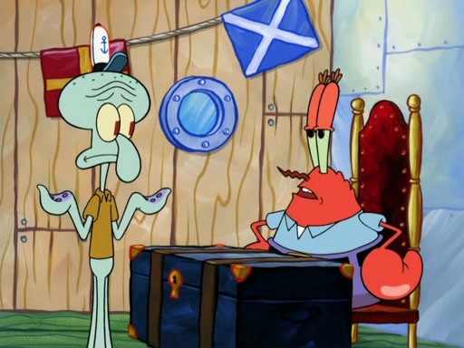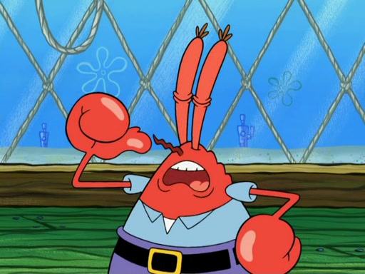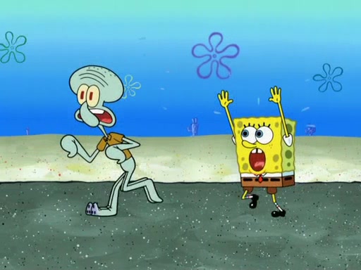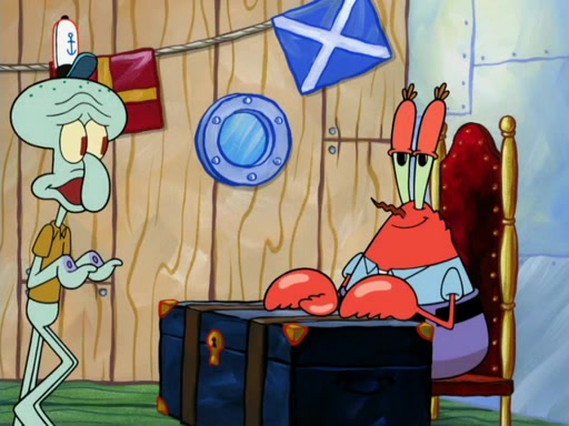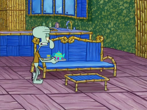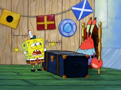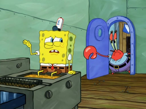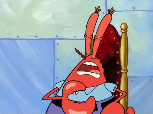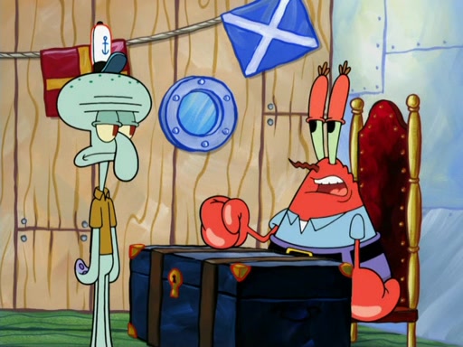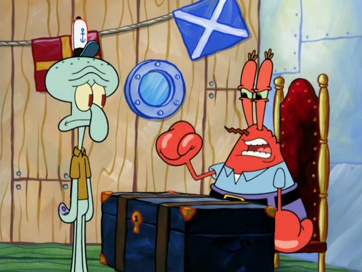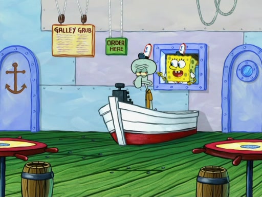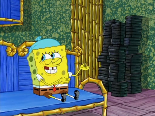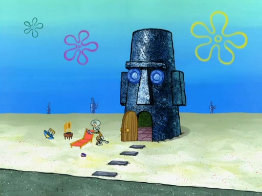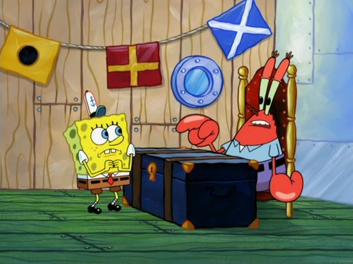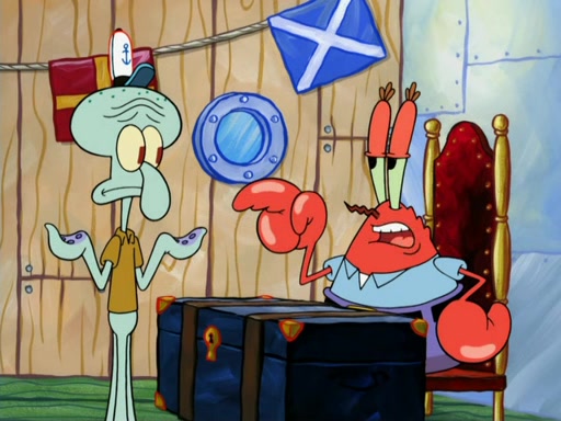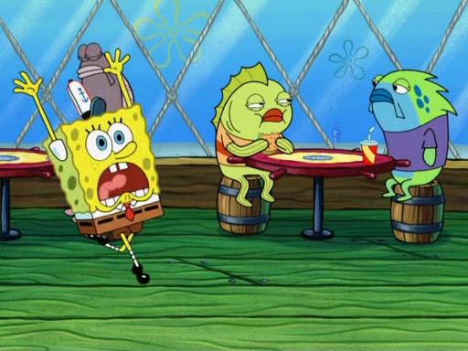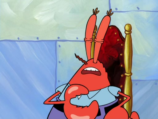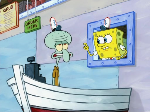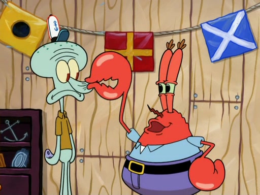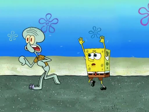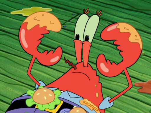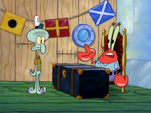Squidward lies on a beach chair, enjoying his break when a garbage-covered SpongeBob comes along. Squidward is annoyed, and then goes into his house to at least enjoy himself inside. But SpongeBob goes in with him, and presents a video tape with a romantic comedy on it. Squidward immediately gets angry at SpongeBob. At the Krusty Krab, Mr. Krabs is having a hard time fulfilling orders and angers customers by throwing food at them and all over the place. Back at Squidward's home, the movie is over. But when SpongeBob says there are 99 more sequels to watch, Squidward can't take it anymore and runs out, screaming. SpongeBob follows him to the Krusty Krab, where Mr. Krabs lies on the ground, covered with Krabby Patty pieces, woozily telling SpongeBob that he could take care of everything. Noticing Mr. Krabs isn't feeling good, SpongeBob presents him with the video tape of the romantic comedy. And the episode ends with Mr. Krabs telling him to get away and runs away from him.