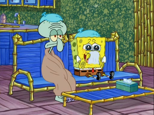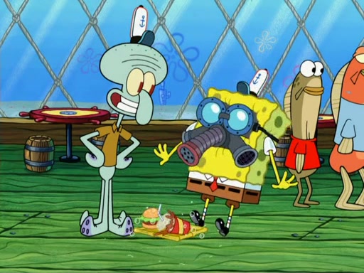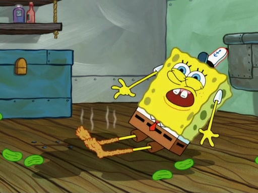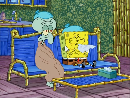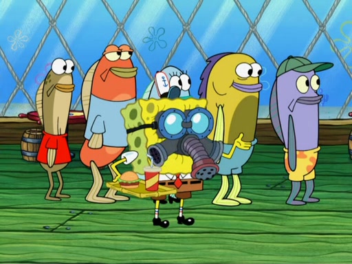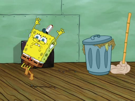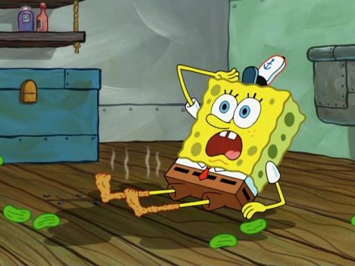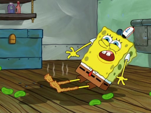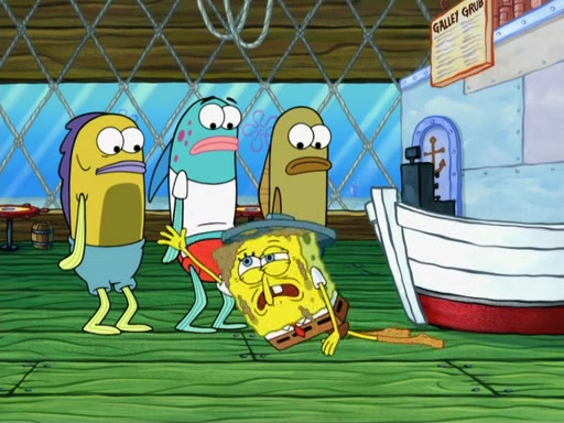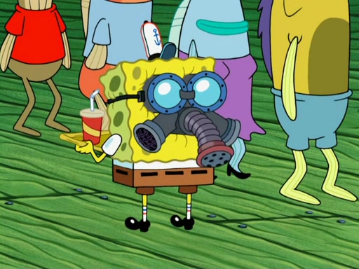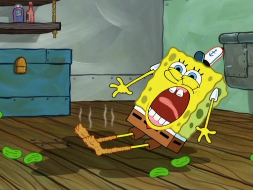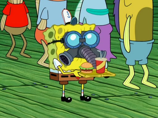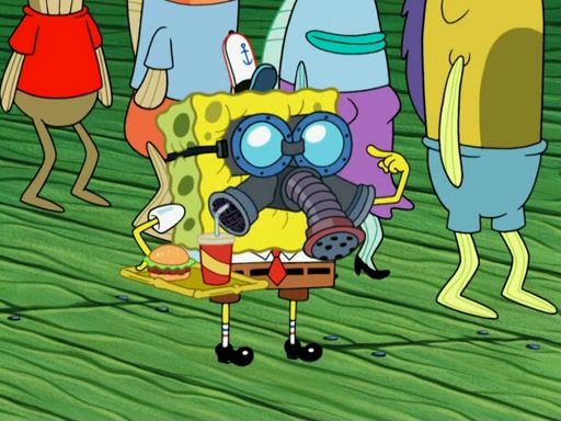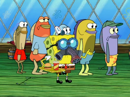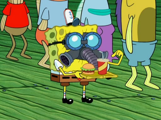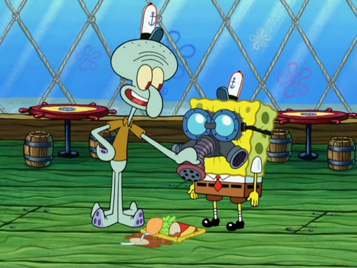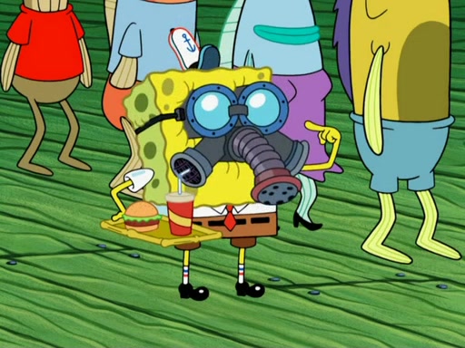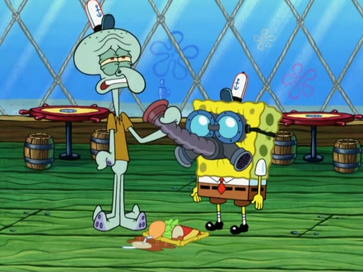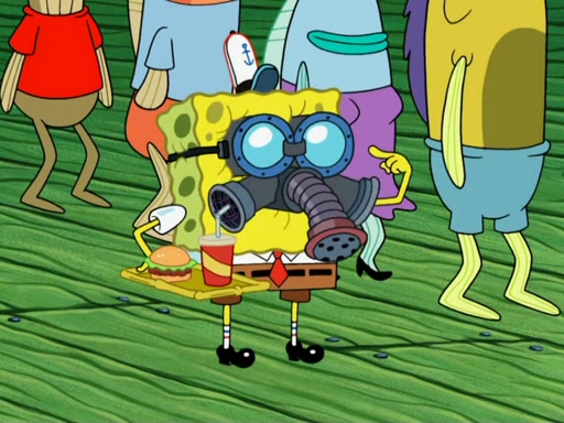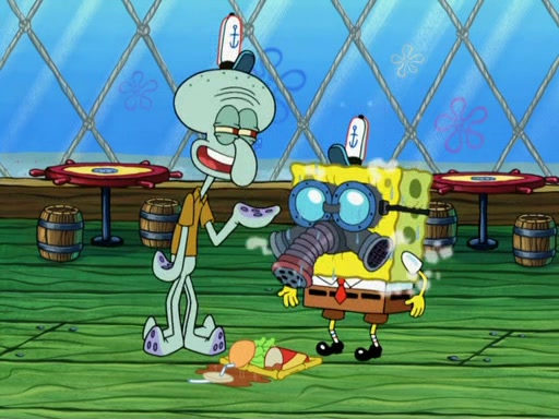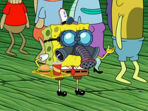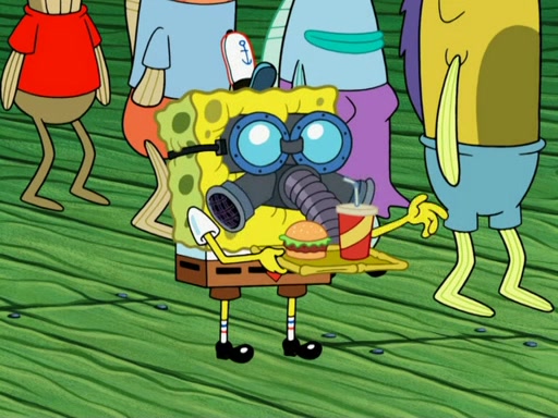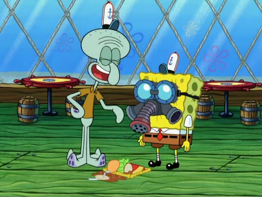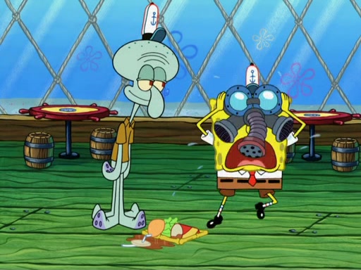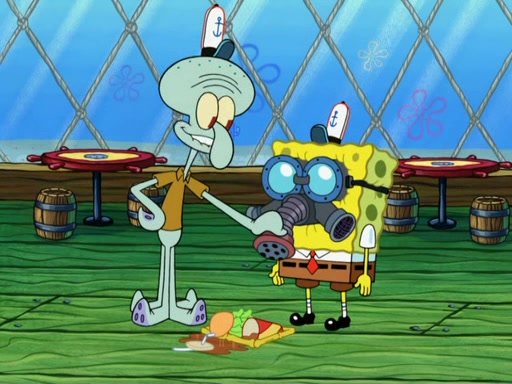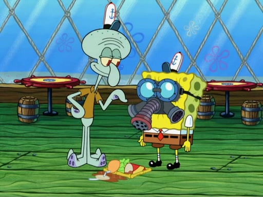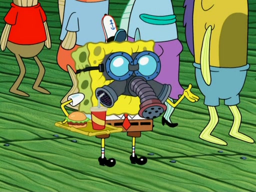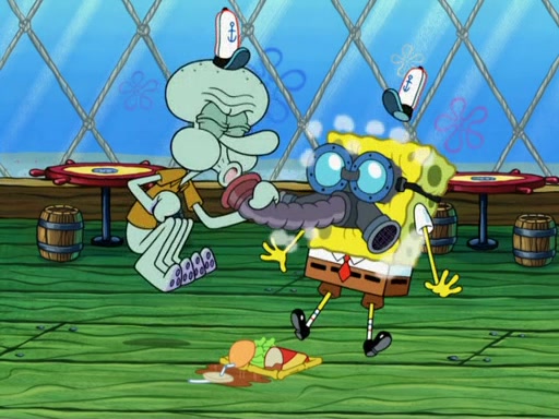 When SpongeBob prepares to deliver an order, Squidward notices him wearing a gas mask. Squidward coughs into it, so SpongeBob panics. He goes to Mr. Krabs to tell him Squidward is sick, but Mr. Krabs is not convinced. He notices SpongeBob is acting odd, which is affecting business. He learns it's because he thinks Squidward is ill and is afraid to catch it. Then he suggests Squidward "make him scarce." Squidward mirthfully leaves, and SpongeBob is relieved...until he notices his eye itches, his throat feels scratchy, and his mouth is dry. Using home remedies, SpongeBob soaks his feet in hot water, then freezing ice water, then boiling oil. Then he smears hot mustard onto his fried legs, which hurts. He plans to put cucumbers on his wounded legs, but only sees pickles. Concluding they are cucumbers, he dumps the pickles and their vinegar onto his legs. The vinegar burns his legs and he falls all over the place, into a pile of garbage. SpongeBob delivers an order while covered in garbage. The customers are turned off by sickly employees and leave, prompting Mr. Krabs to tell SpongeBob to go home until he feels better. SpongeBob asks who will work while he's away, and Mr. Krabs boasts that he can do all the work with one claw tied behind his back.