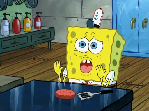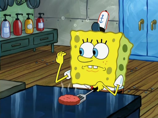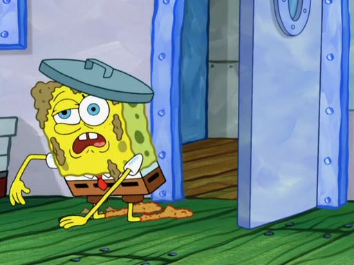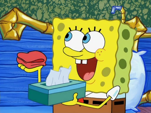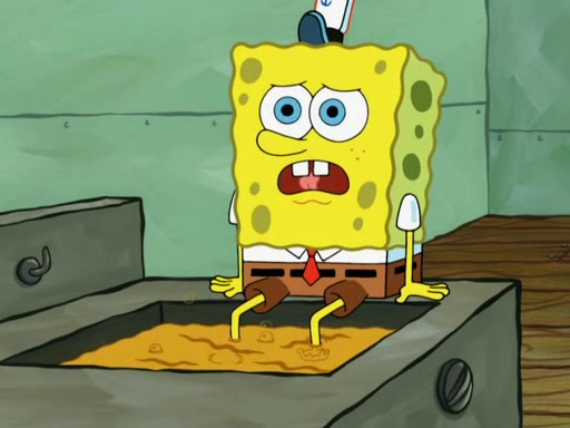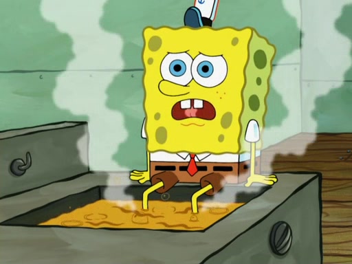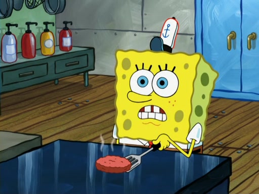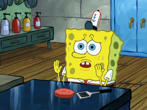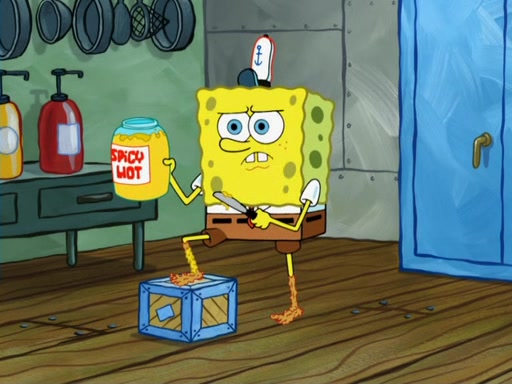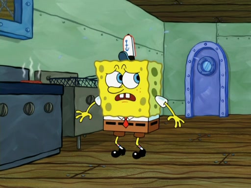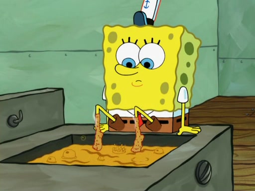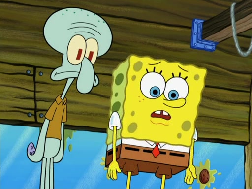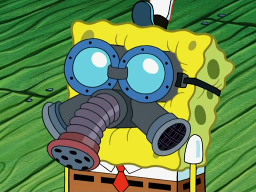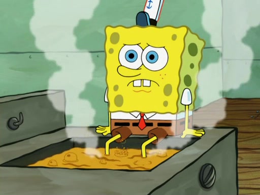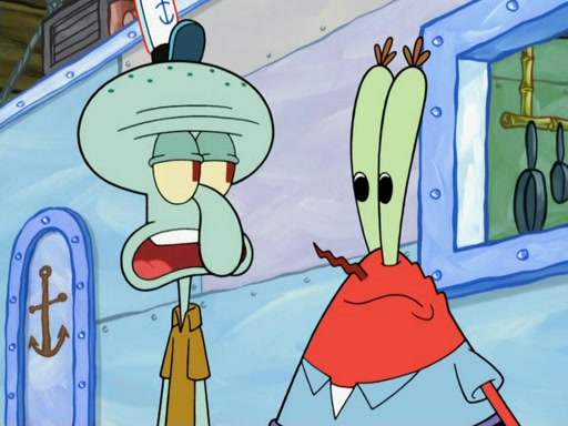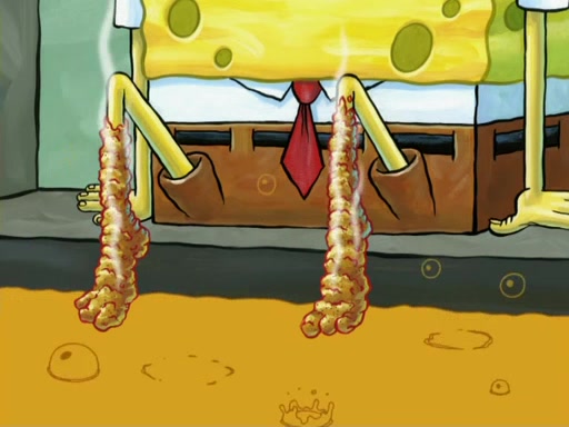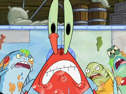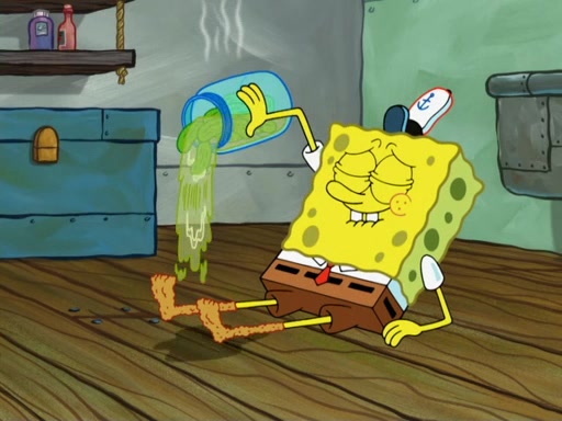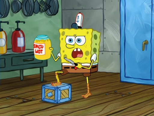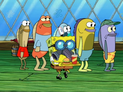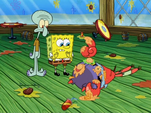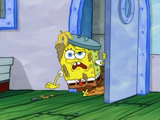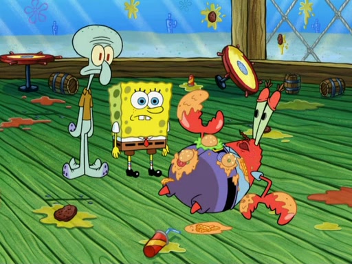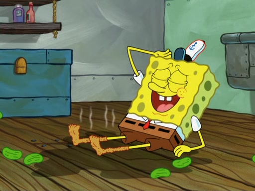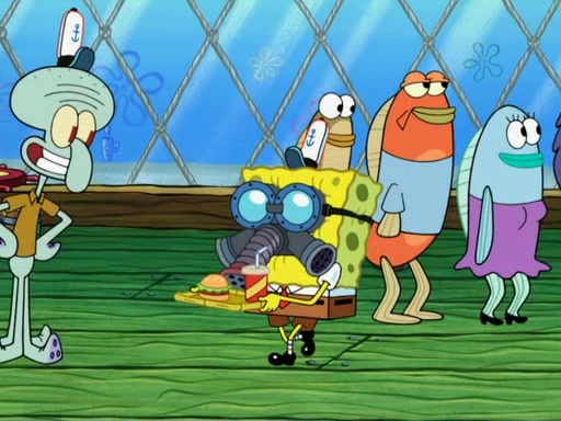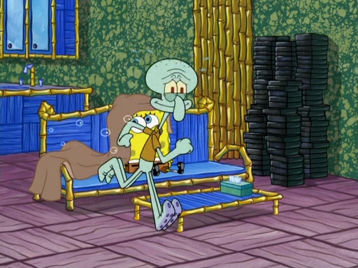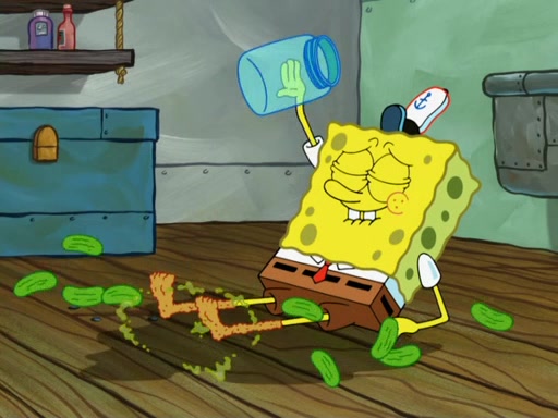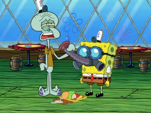 When SpongeBob prepares to deliver an order, Squidward notices him wearing a gas mask. Squidward coughs into it, so SpongeBob panics. He goes to Mr. Krabs to tell him Squidward is sick, but Mr. Krabs is not convinced. He notices SpongeBob is acting odd, which is affecting business. He learns it's because he thinks Squidward is ill and is afraid to catch it. Then he suggests Squidward "make him scarce." Squidward mirthfully leaves, and SpongeBob is relieved...until he notices his eye itches, his throat feels scratchy, and his mouth is dry. Using home remedies, SpongeBob soaks his feet in hot water, then freezing ice water, then boiling oil. Then he smears hot mustard onto his fried legs, which hurts. He plans to put cucumbers on his wounded legs, but only sees pickles. Concluding they are cucumbers, he dumps the pickles and their vinegar onto his legs. The vinegar burns his legs and he falls all over the place, into a pile of garbage. SpongeBob delivers an order while covered in garbage. The customers are turned off by sickly employees and leave, prompting Mr. Krabs to tell SpongeBob to go home until he feels better. SpongeBob asks who will work while he's away, and Mr. Krabs boasts that he can do all the work with one claw tied behind his back.