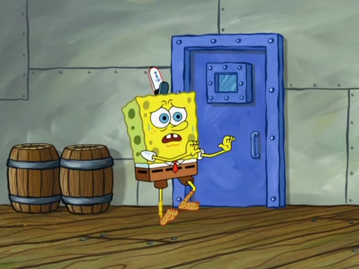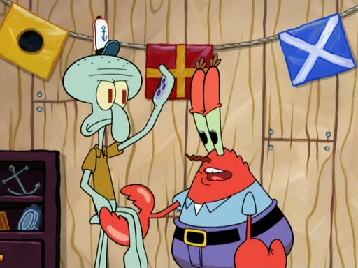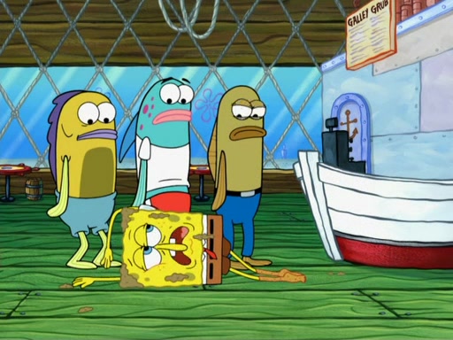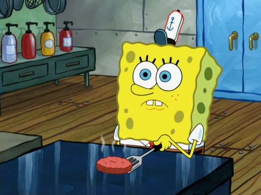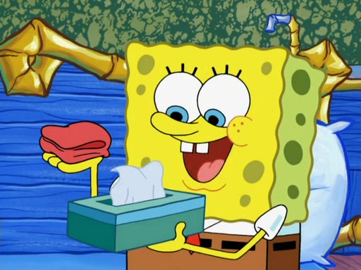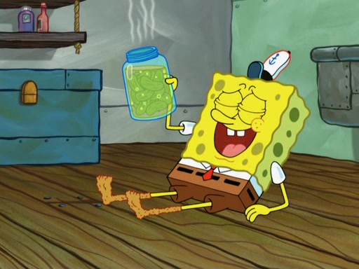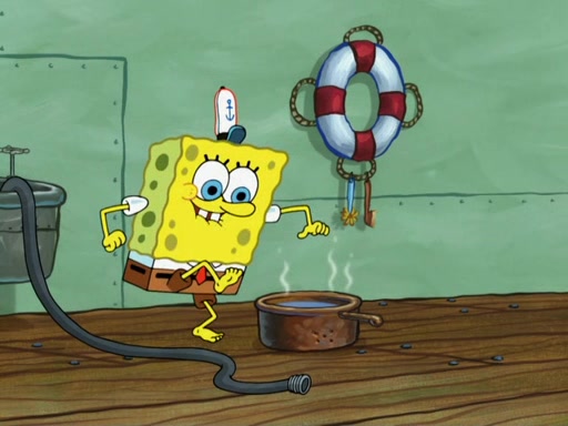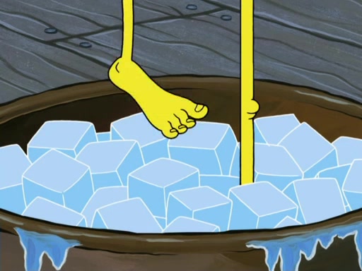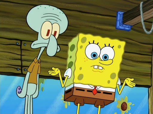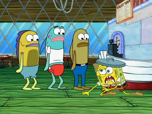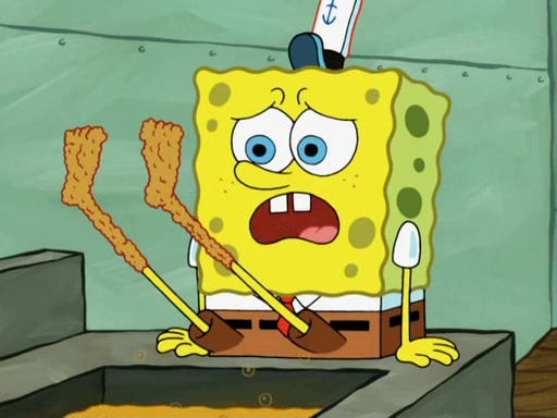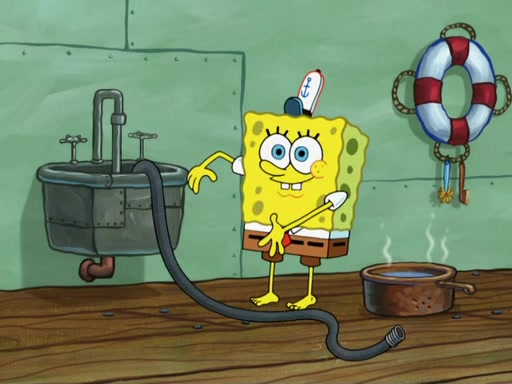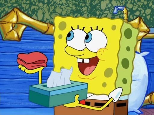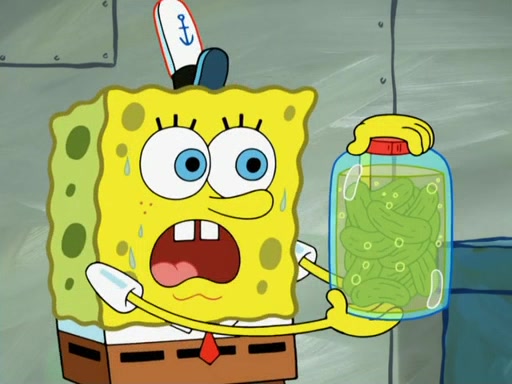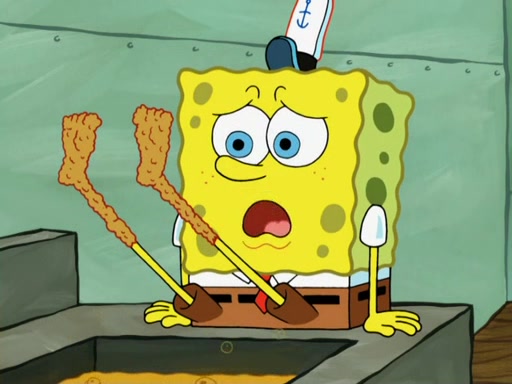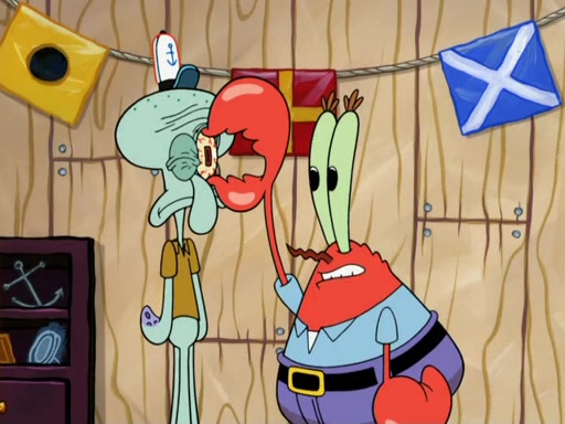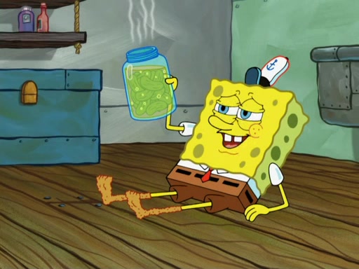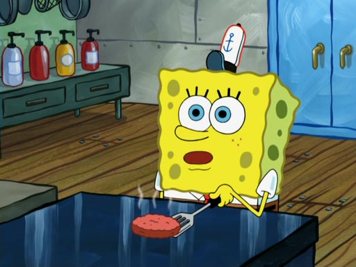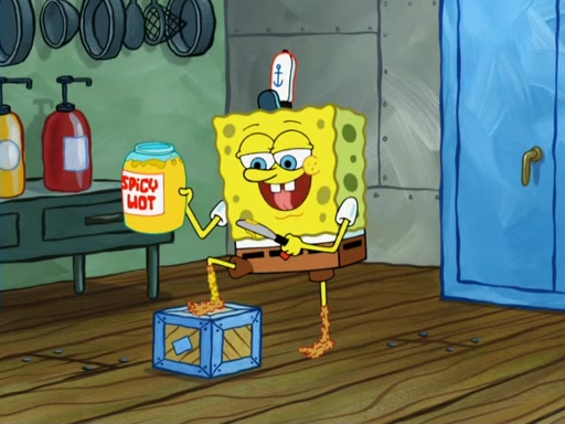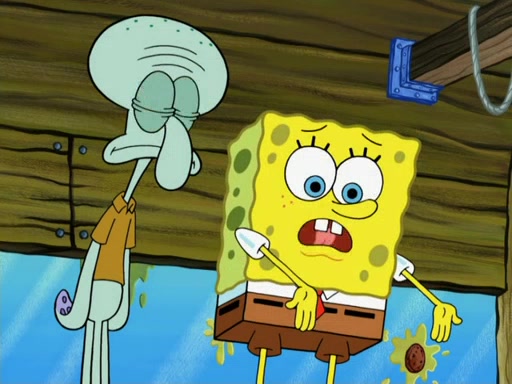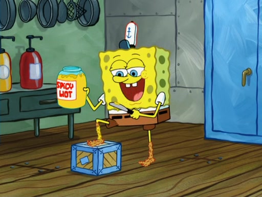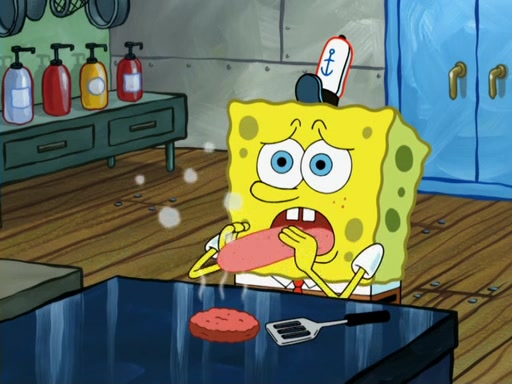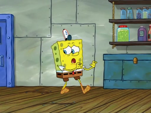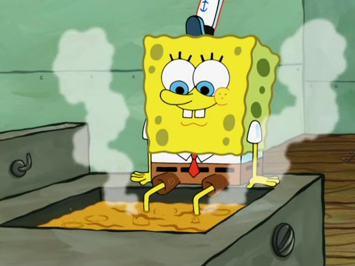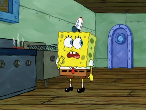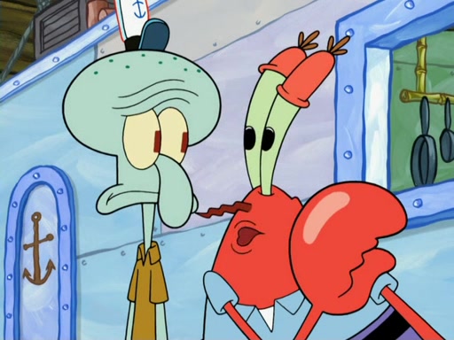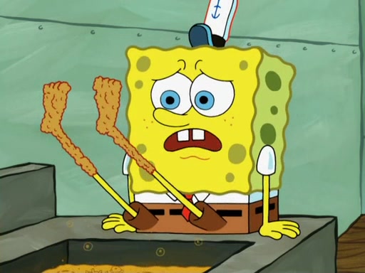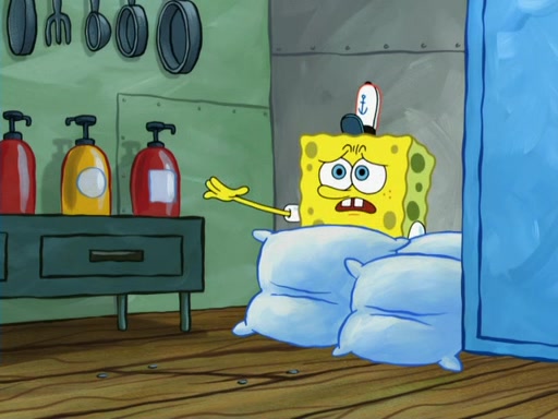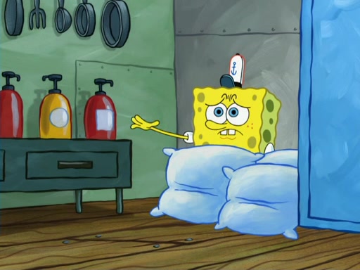 When SpongeBob prepares to deliver an order, Squidward notices him wearing a gas mask. Squidward coughs into it, so SpongeBob panics. He goes to Mr. Krabs to tell him Squidward is sick, but Mr. Krabs is not convinced. He notices SpongeBob is acting odd, which is affecting business. He learns it's because he thinks Squidward is ill and is afraid to catch it. Then he suggests Squidward "make him scarce." Squidward mirthfully leaves, and SpongeBob is relieved...until he notices his eye itches, his throat feels scratchy, and his mouth is dry. Using home remedies, SpongeBob soaks his feet in hot water, then freezing ice water, then boiling oil. Then he smears hot mustard onto his fried legs, which hurts. He plans to put cucumbers on his wounded legs, but only sees pickles. Concluding they are cucumbers, he dumps the pickles and their vinegar onto his legs. The vinegar burns his legs and he falls all over the place, into a pile of garbage. SpongeBob delivers an order while covered in garbage. The customers are turned off by sickly employees and leave, prompting Mr. Krabs to tell SpongeBob to go home until he feels better. SpongeBob asks who will work while he's away, and Mr. Krabs boasts that he can do all the work with one claw tied behind his back.