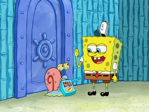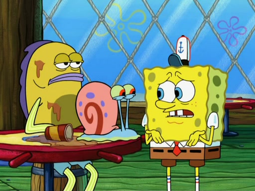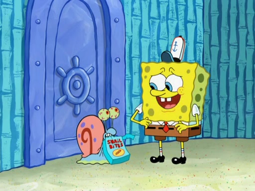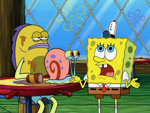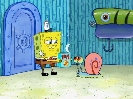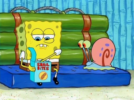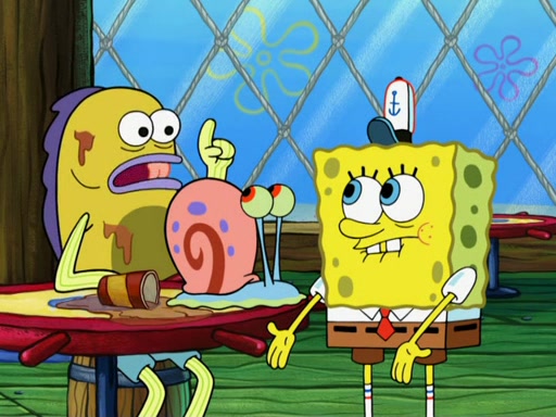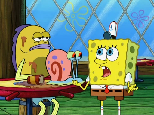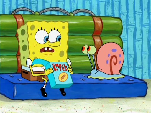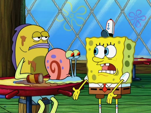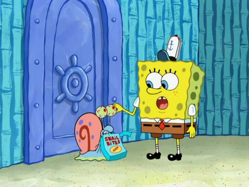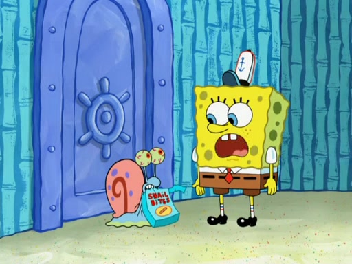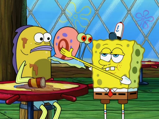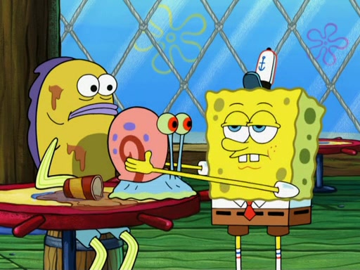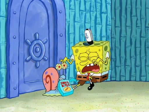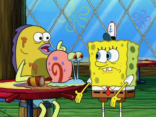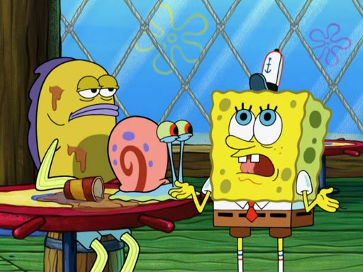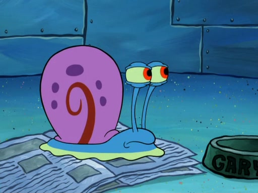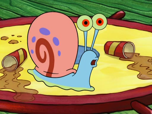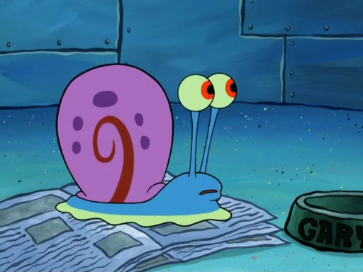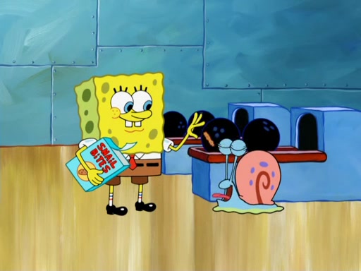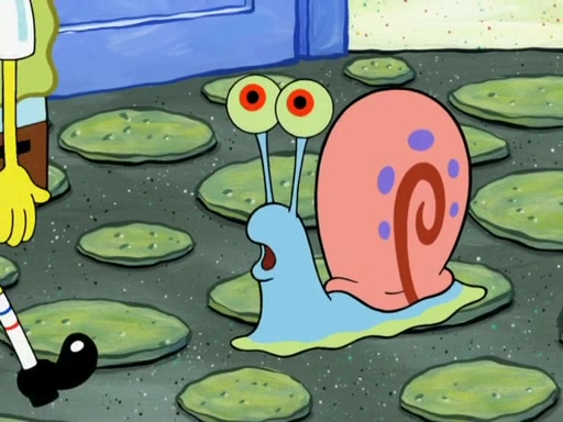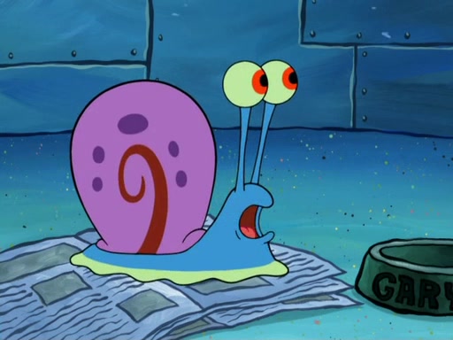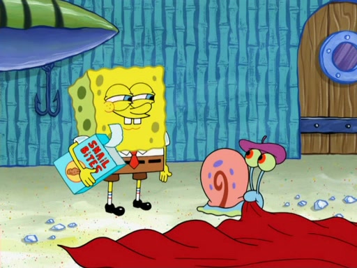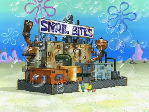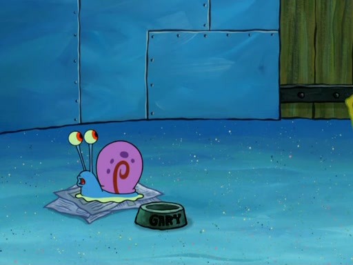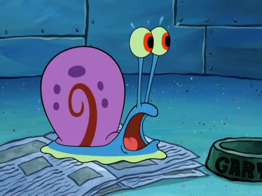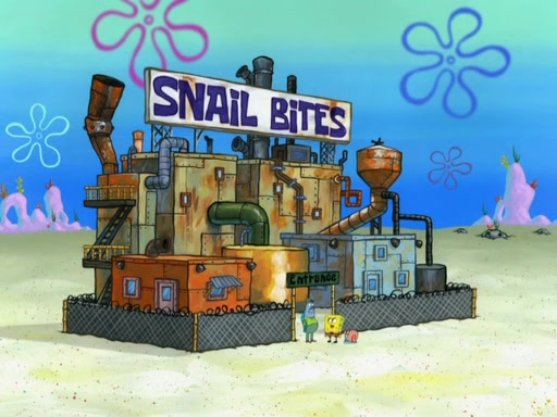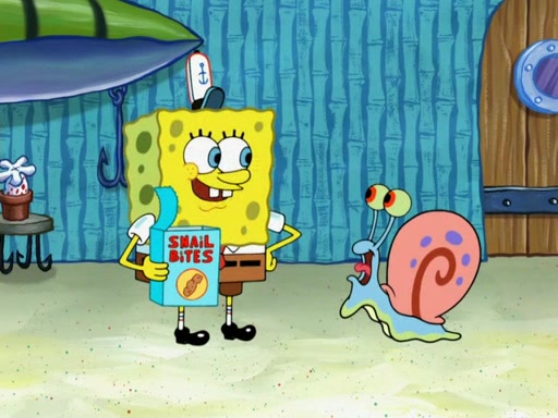 When SpongeBob goes to work, he is making patties. Gary enters the Krusty Krab, tracking slime all over the customers. SpongeBob is surprised (and a little angry) and yells at him. Gary meows at him, telling him that he wants more Snail Bites. A customer makes a suggestion to SpongeBob, that if he wants Snail Bites, he should go to the factory where they make them. SpongeBob thinks that is a great idea, so he and Gary go to the factory.