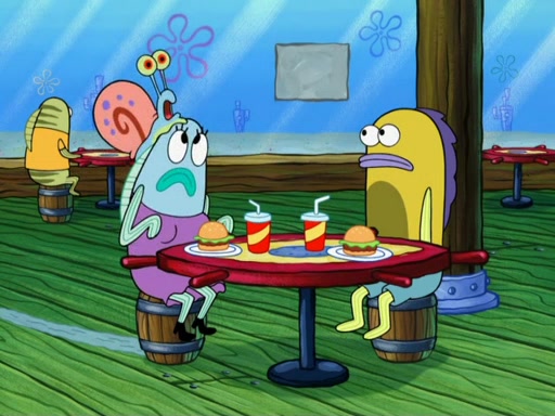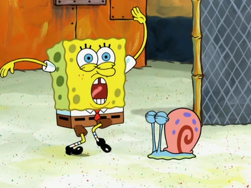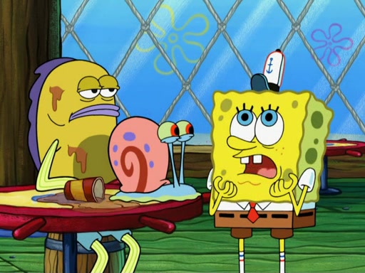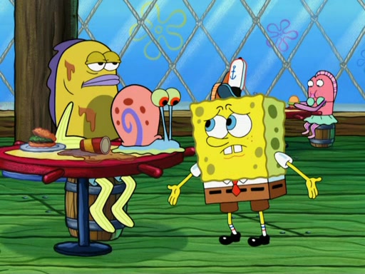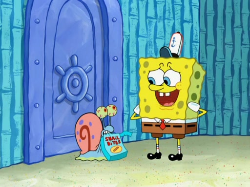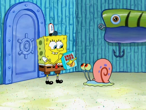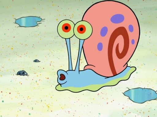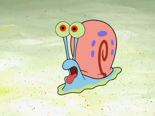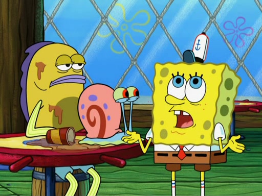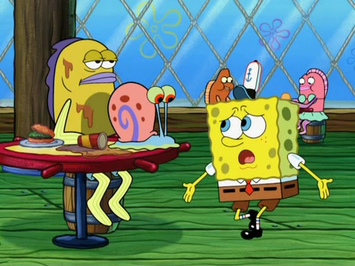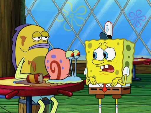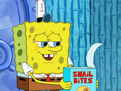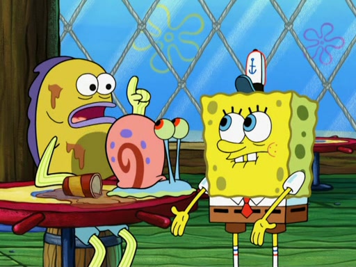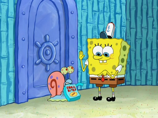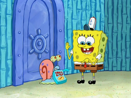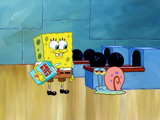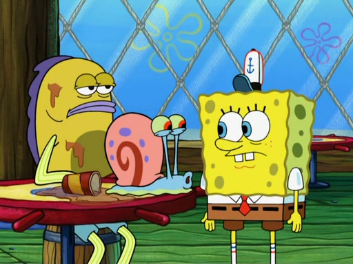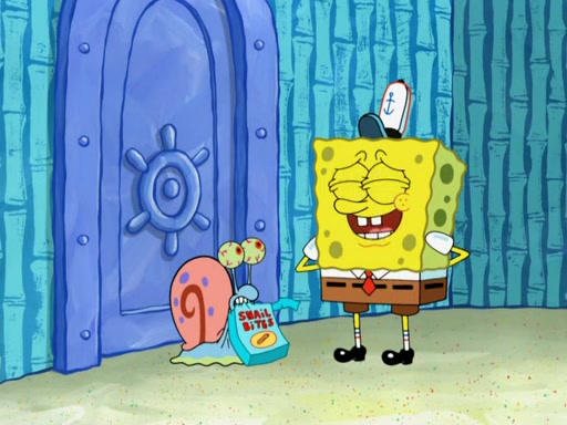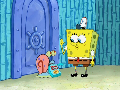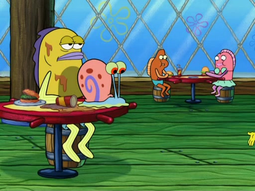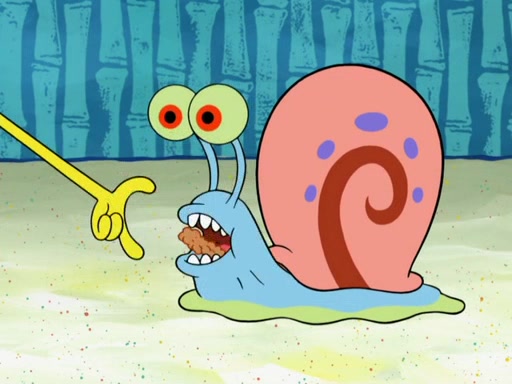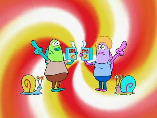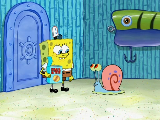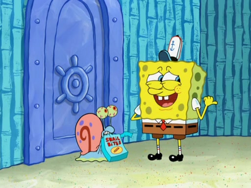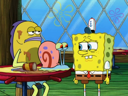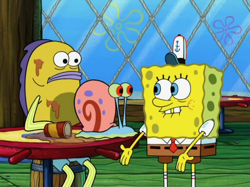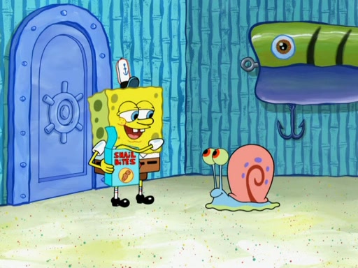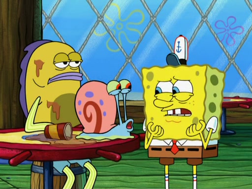 When SpongeBob goes to work, he is making patties. Gary enters the Krusty Krab, tracking slime all over the customers. SpongeBob is surprised (and a little angry) and yells at him. Gary meows at him, telling him that he wants more Snail Bites. A customer makes a suggestion to SpongeBob, that if he wants Snail Bites, he should go to the factory where they make them. SpongeBob thinks that is a great idea, so he and Gary go to the factory.