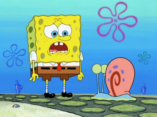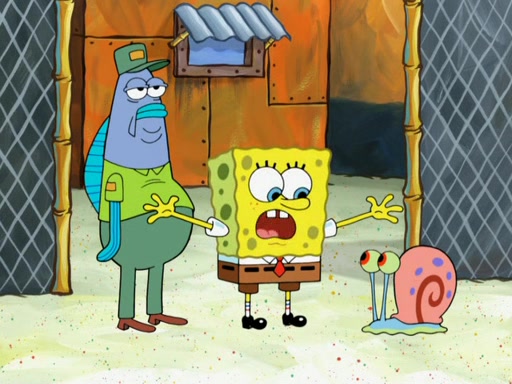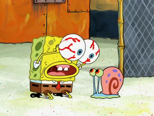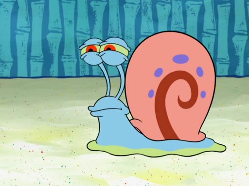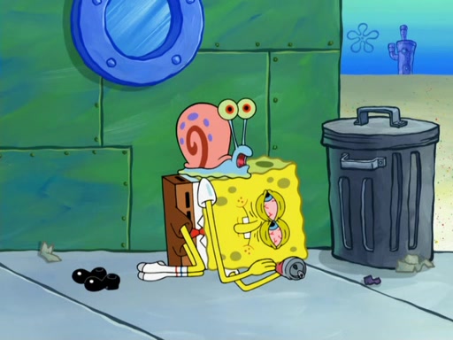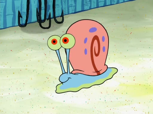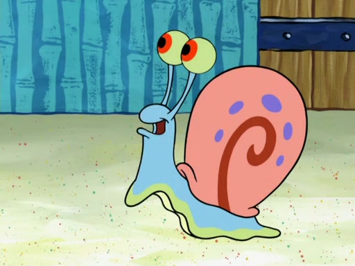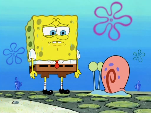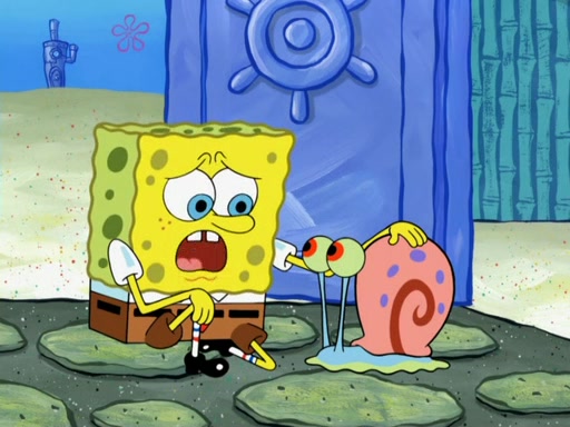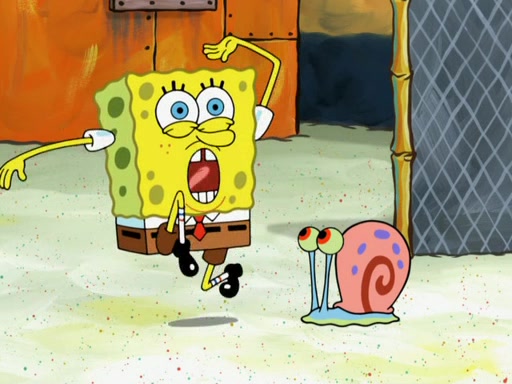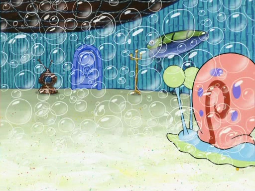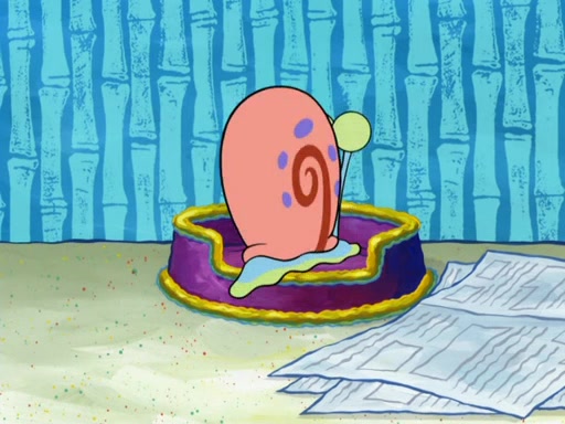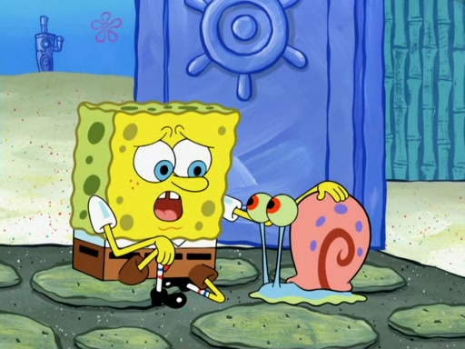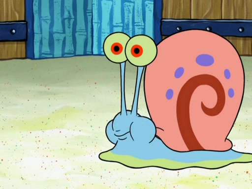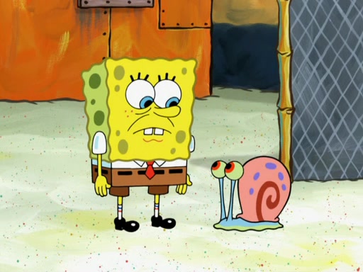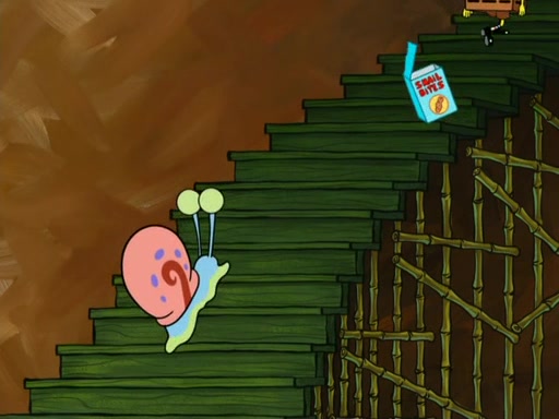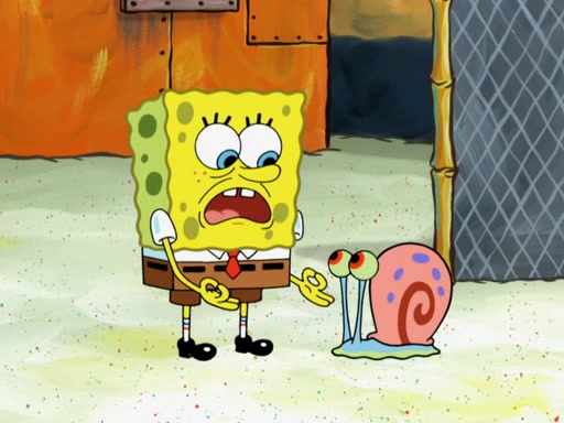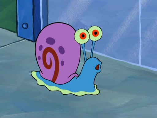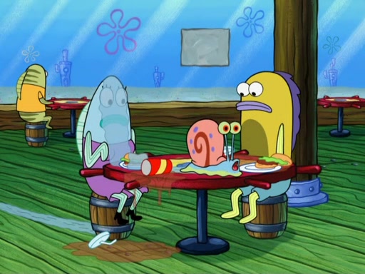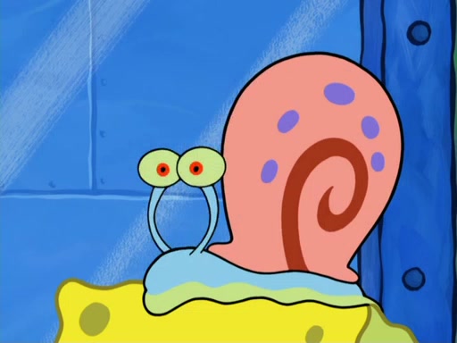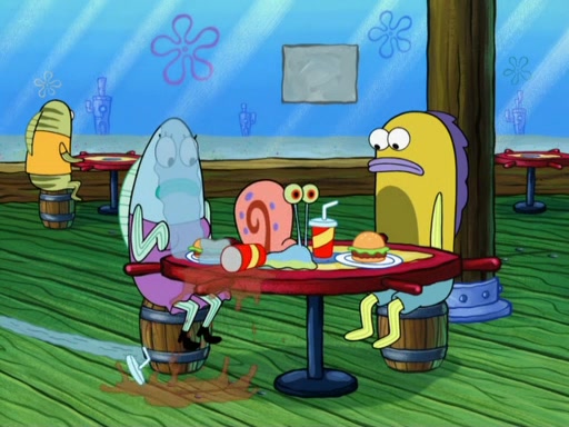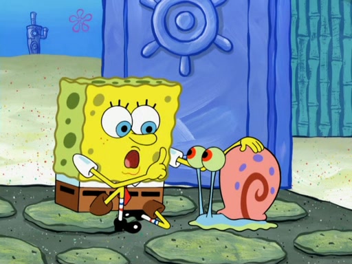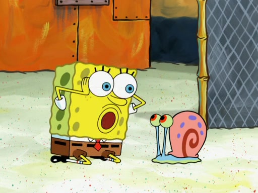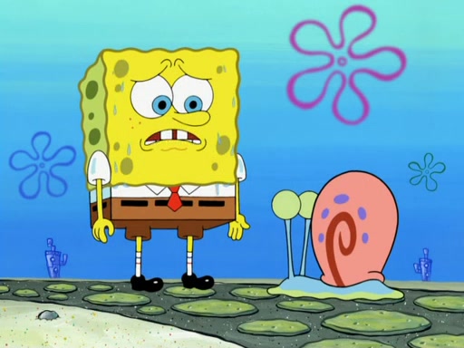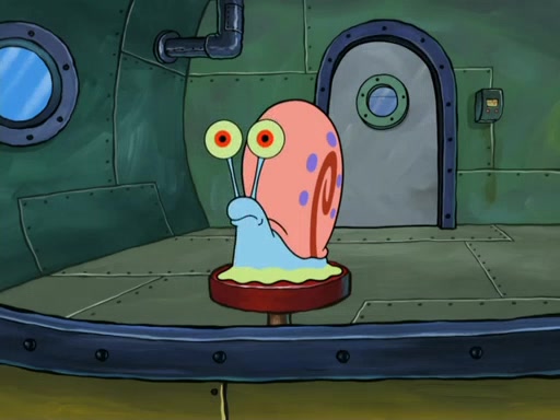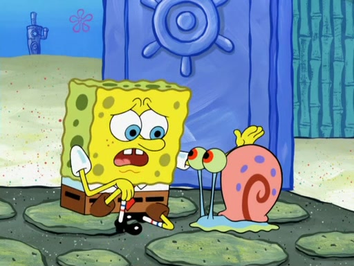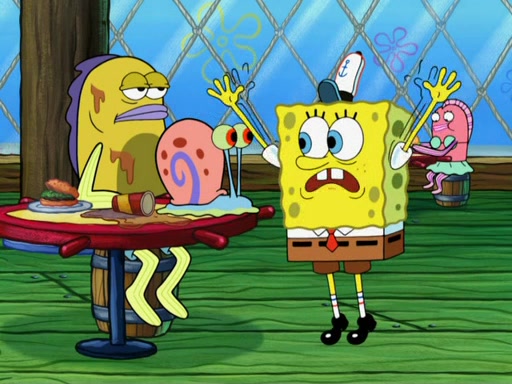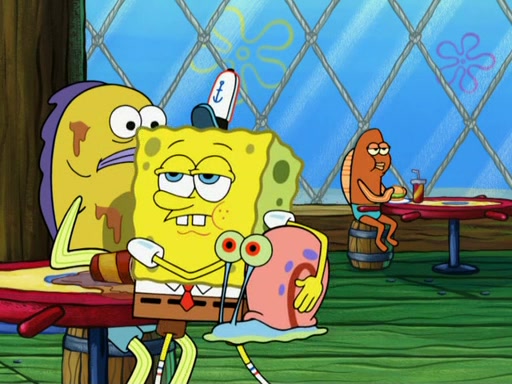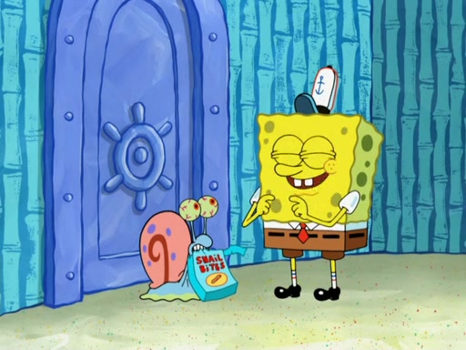When SpongeBob goes to work, he is making patties. Gary enters the Krusty Krab, tracking slime all over the customers. SpongeBob is surprised (and a little angry) and yells at him. Gary meows at him, telling him that he wants more Snail Bites. A customer makes a suggestion to SpongeBob, that if he wants Snail Bites, he should go to the factory where they make them. SpongeBob thinks that is a great idea, so he and Gary go to the factory.