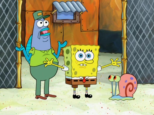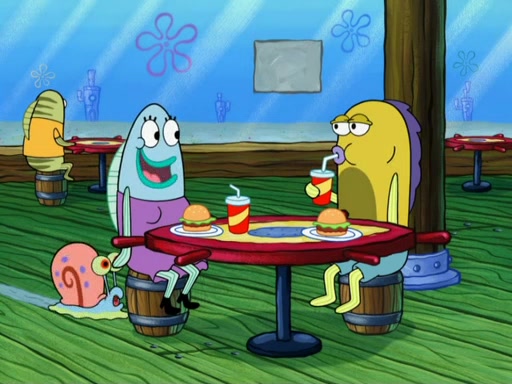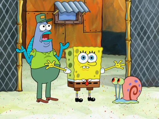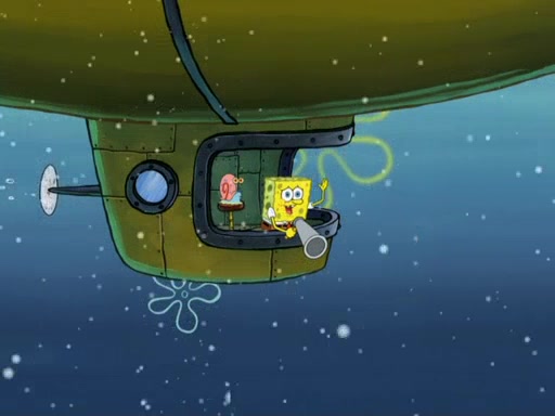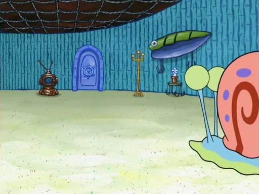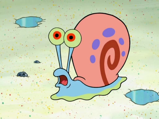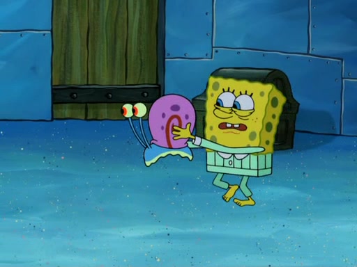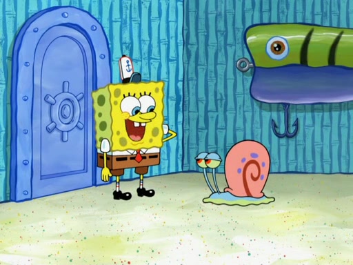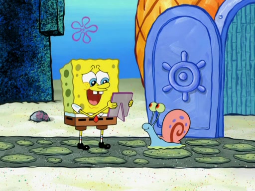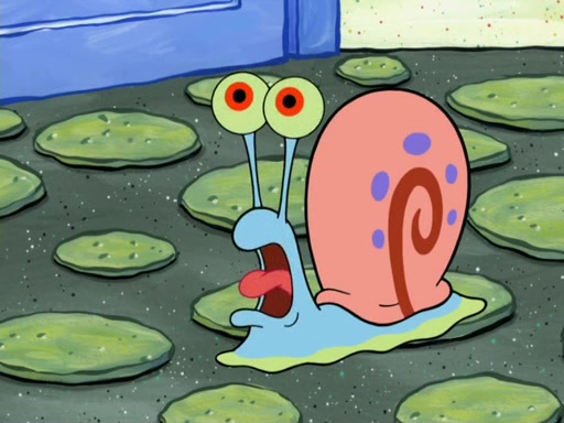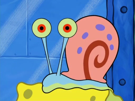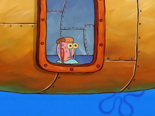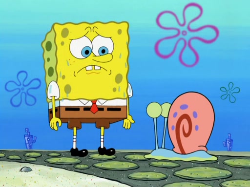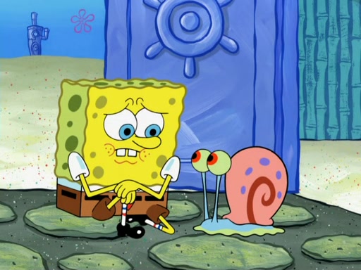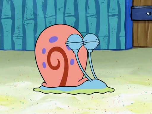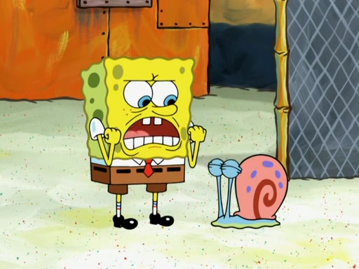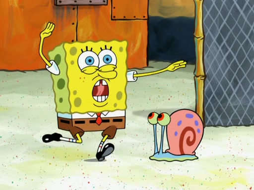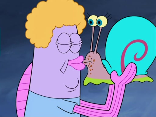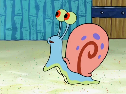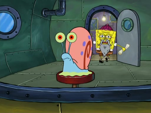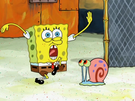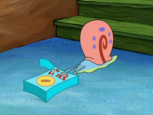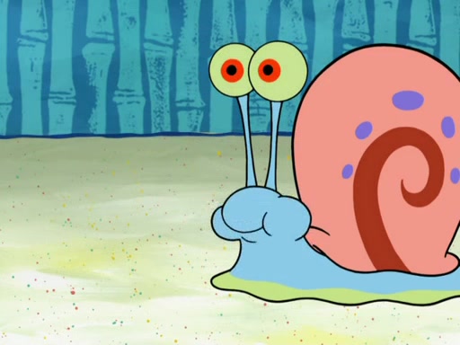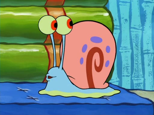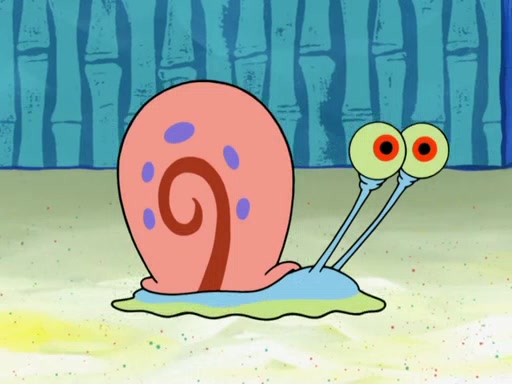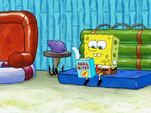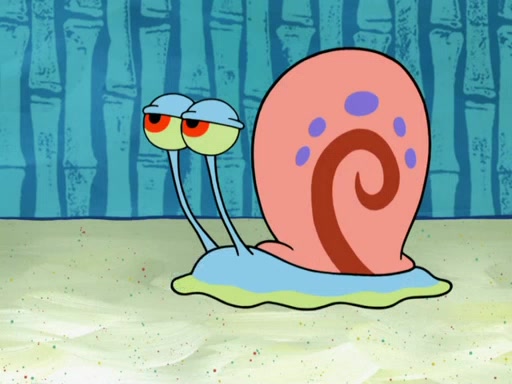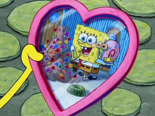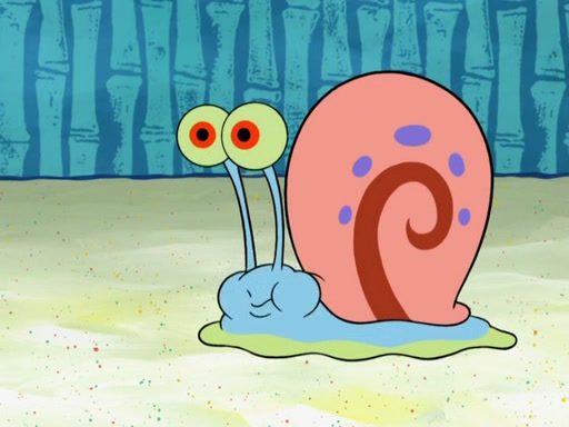 When SpongeBob goes to work, he is making patties. Gary enters the Krusty Krab, tracking slime all over the customers. SpongeBob is surprised (and a little angry) and yells at him. Gary meows at him, telling him that he wants more Snail Bites. A customer makes a suggestion to SpongeBob, that if he wants Snail Bites, he should go to the factory where they make them. SpongeBob thinks that is a great idea, so he and Gary go to the factory.