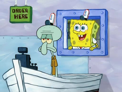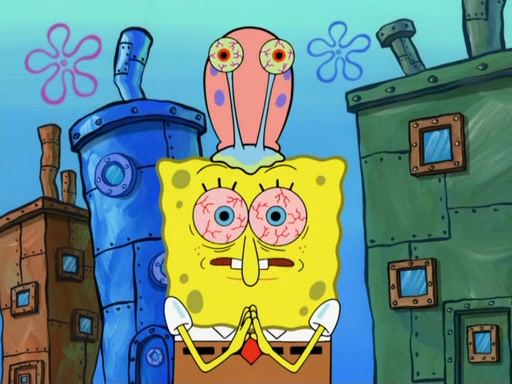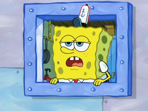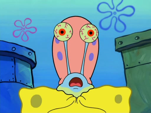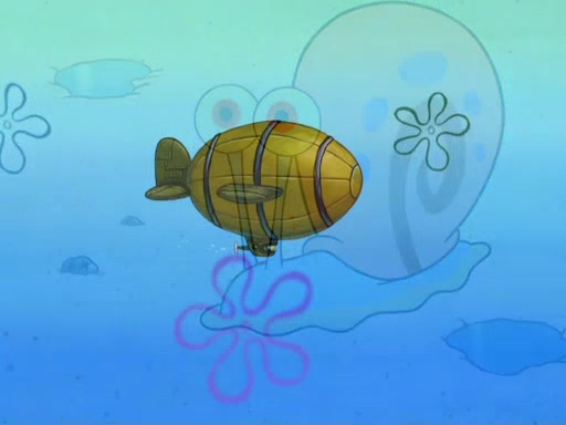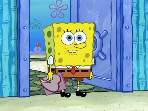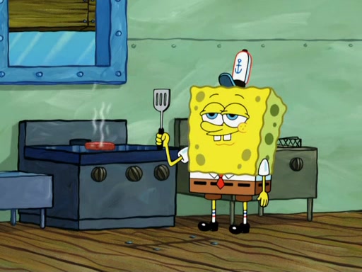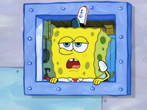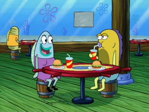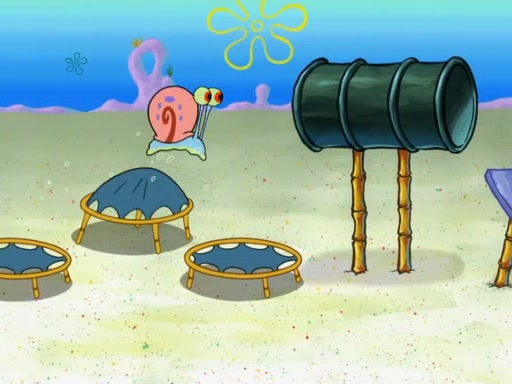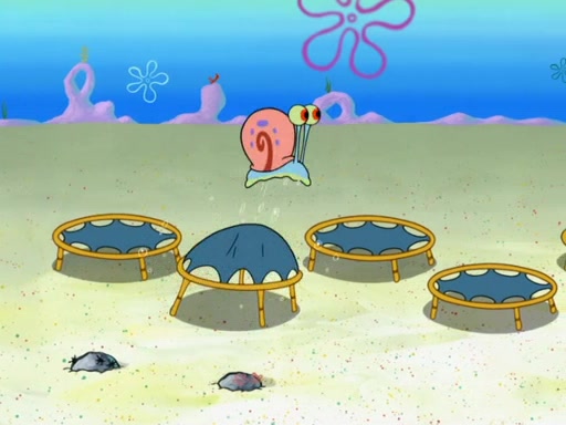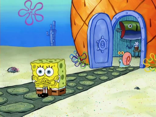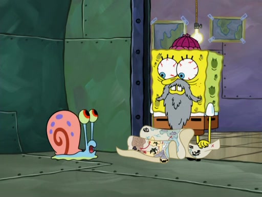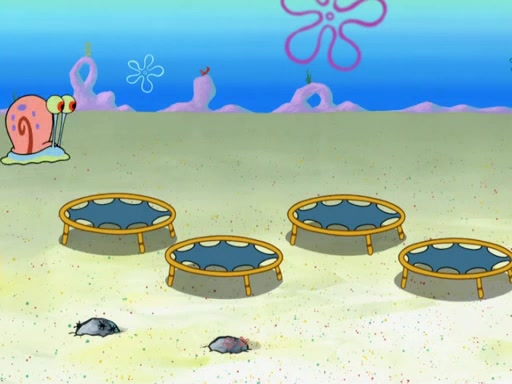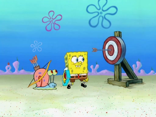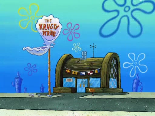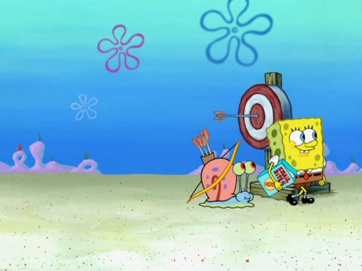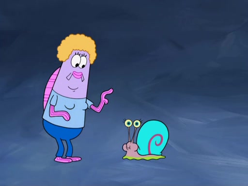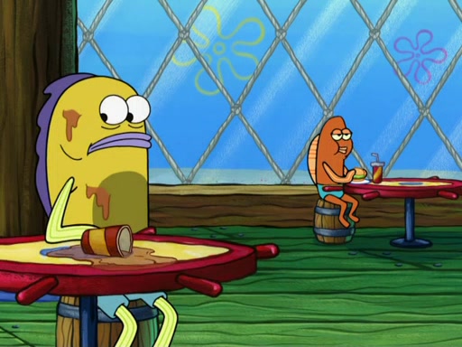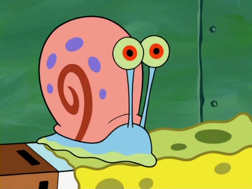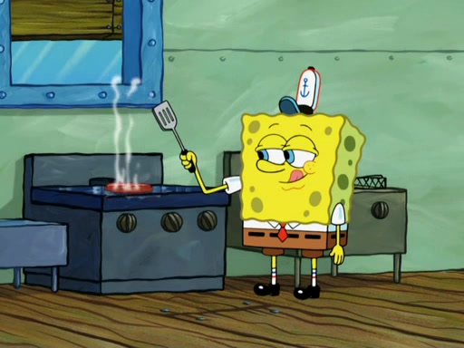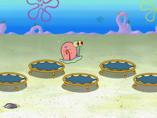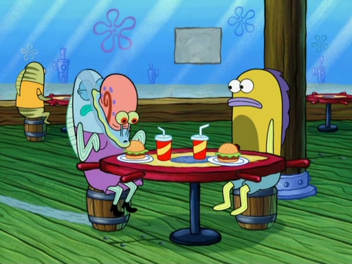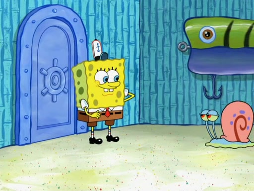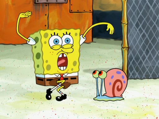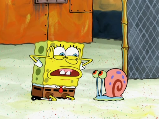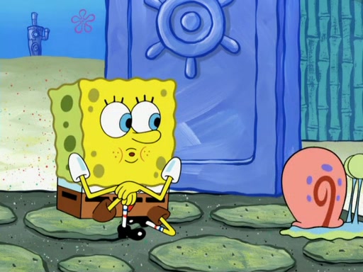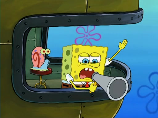 When SpongeBob goes to work, he is making patties. Gary enters the Krusty Krab, tracking slime all over the customers. SpongeBob is surprised (and a little angry) and yells at him. Gary meows at him, telling him that he wants more Snail Bites. A customer makes a suggestion to SpongeBob, that if he wants Snail Bites, he should go to the factory where they make them. SpongeBob thinks that is a great idea, so he and Gary go to the factory.