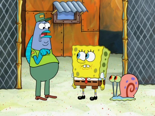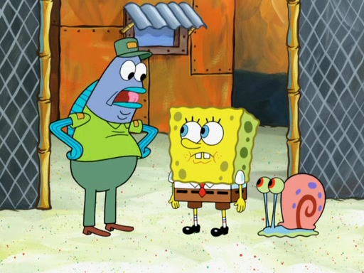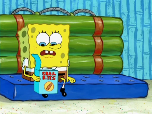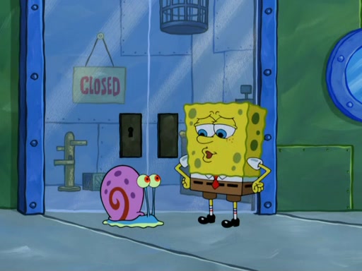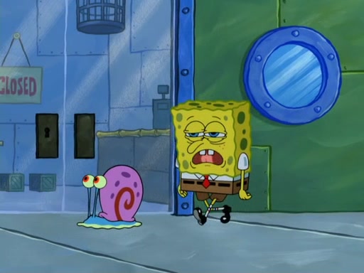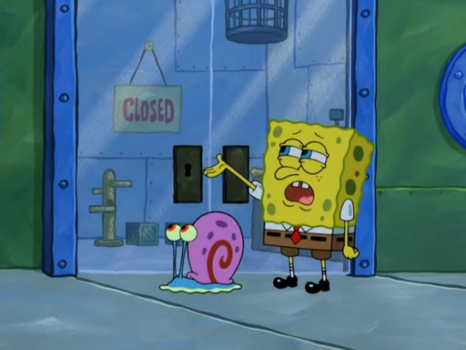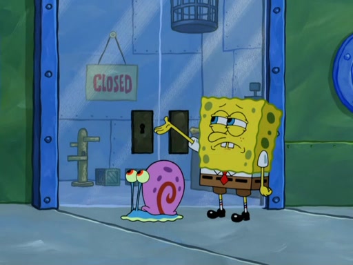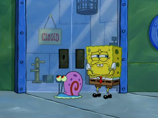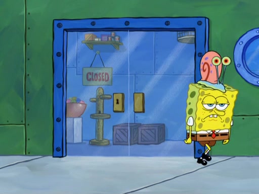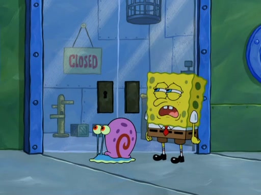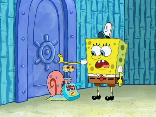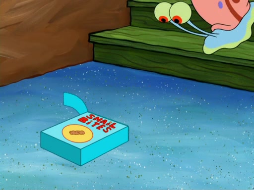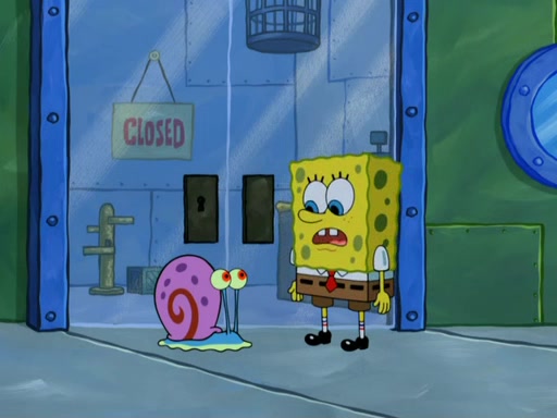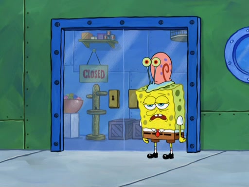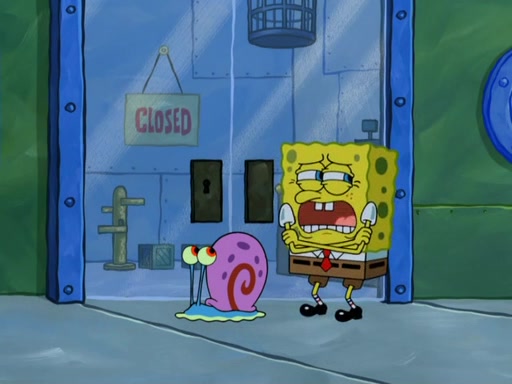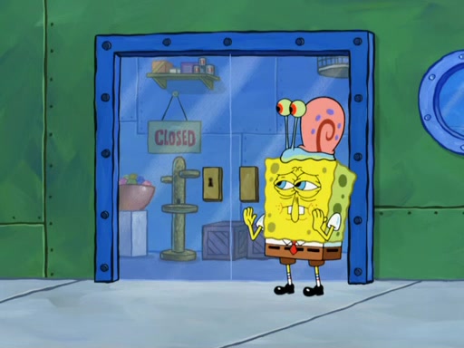 A worker tells SpongeBob and Gary that they are closed, the last box of Snail Bites shipped out days ago, they ran out of ingredients to make them, and the owner quit the business completely, because he had a lot of money. Gary then tells SpongeBob (in snail talk) that they should look all around the world, to see if they have any more Snail Bites. SpongeBob is now furious that he is still meowing.