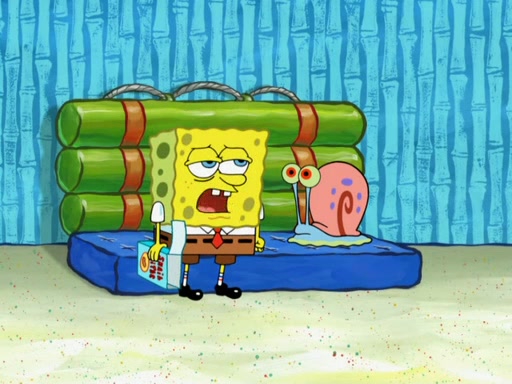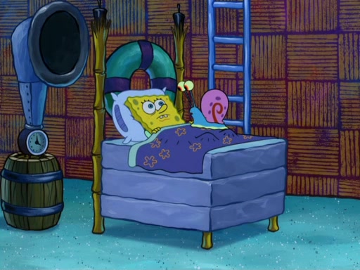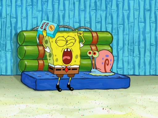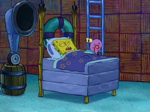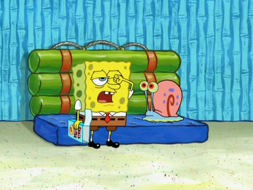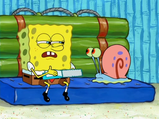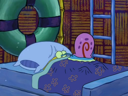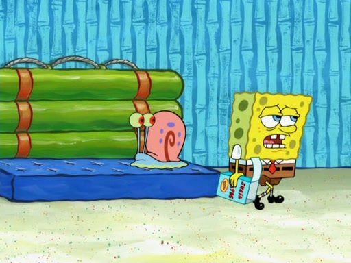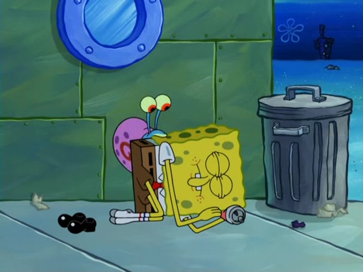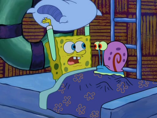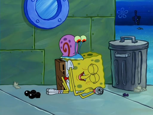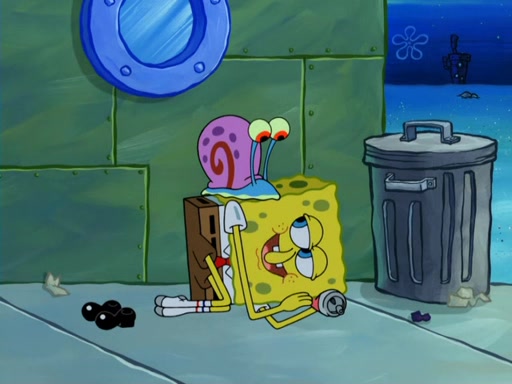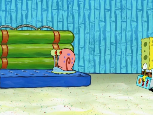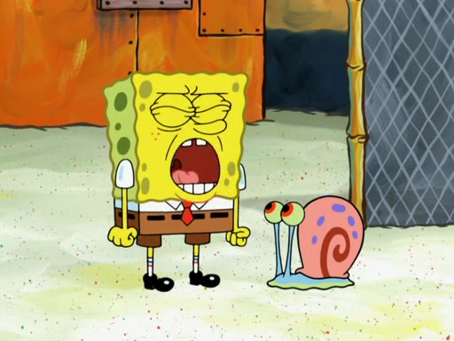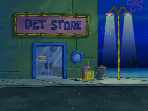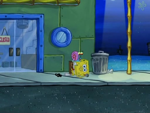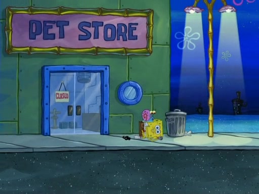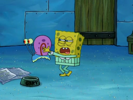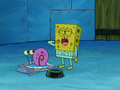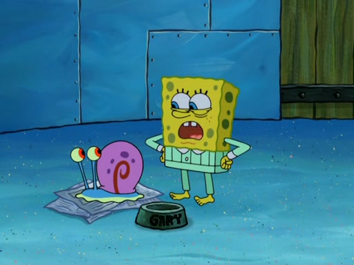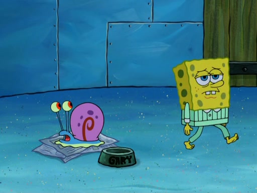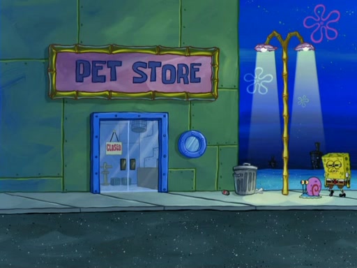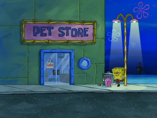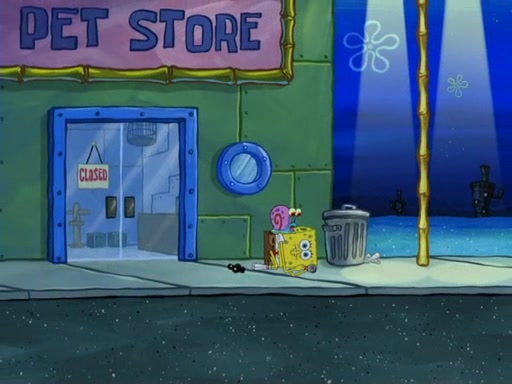 Gary meows all night for more Snail Bites. SpongeBob gets slightly annoyed, so he tries to ignore Gary's meowing. That does not work, so SpongeBob takes Gary to the pet store in the middle of the night to see if there are any more Snail Bites. When they find out the store is closed, SpongeBob gets very tired, so he sleeps on the sidewalk, while Gary continues to meow. Eighty "meows" later, SpongeBob wakes up. When he sees the cashier unlocking the pet store, SpongeBob then asks if there is a box of Snail Bites. The cashier tells him that they sold out almost immediately, which leaves Gary meowing very loudly. SpongeBob tries to leave for work, but Gary will not leave him leave. So he tricks Gary into slithering towards the kitchen and runs for it.