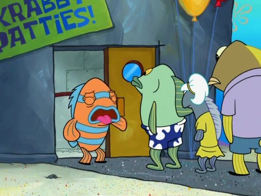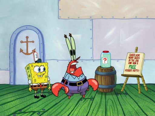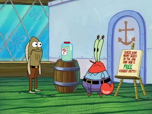 SpongeBob blows a trumpet, heralding an important announcement from Mr. Krabs: it is the first annual bun seed counting contest. Anyone who correctly guesses how many seeds are in the jar wins a free Krabby Patty. Several people make guesses, each more ridiculous than the last. The next contestant is Plankton, but before he can guess, Mr. Krabs grabs him by the antennae and takes him outside. Plankton claims it's unfair that he doesn't get to guess; however Mr. Krabs says that he can do whatever he pleases and that he knew all Plankton would do is analyze the Krabby Patty to steal his secret formula. Mr. Krabs then chews Plankton up, inflates him, and blows him away, where he splats onto the door of the Chum Bucket. Plankton calls the Bogus Business Bureau on him, but Mr. Krabs is unconcerned.
