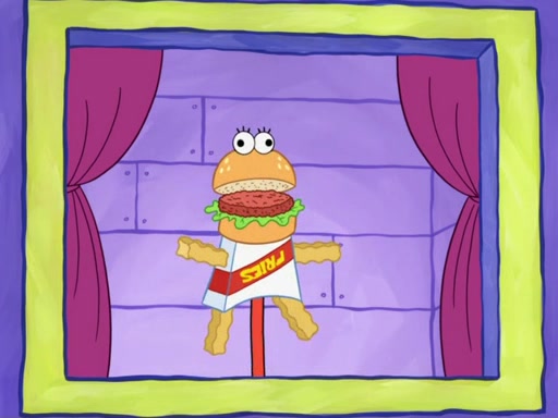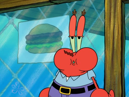 Desperate to stall, Mr. Krabs makes excuses, but SpongeBob corrects him. Mr. Krabs says the contest included a free show, which Twirp allows. He constructs a puppet theater and performs a puppet show, but Plankton sees through the delay and continues to demand his Krabby Patty. Mr. Krabs realizes there's nothing else he can do, and sadly tells SpongeBob to prepare what could be his last Krabby Patty. Mr. Krabs has Squidward distract Twirp, giving him time to flush all the buns down the toilet, but a delivery man with buns thwarts his last-ditch efforts. When the Krabby Patty is ready, Plankton wants it "to go," but Mr. Krabs says it must be "dine in." Plankton stuffs the entire patty into his mouth, but Mr. Krabs tells him to swallow it. Once he does, he asks if he can go now, and is thrown out by Mr. Krabs into the Chum Bucket. He climbs onto an operating table and tells Karen to remove the patty from his stomach right away, even declining anesthetic.