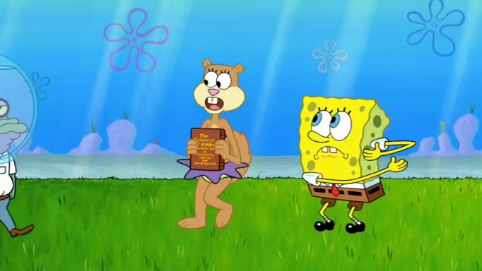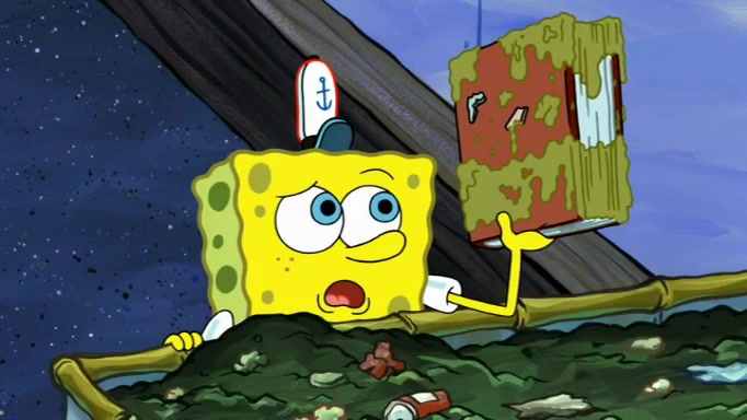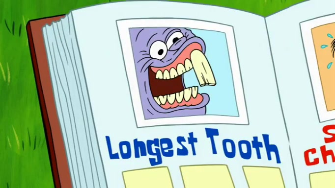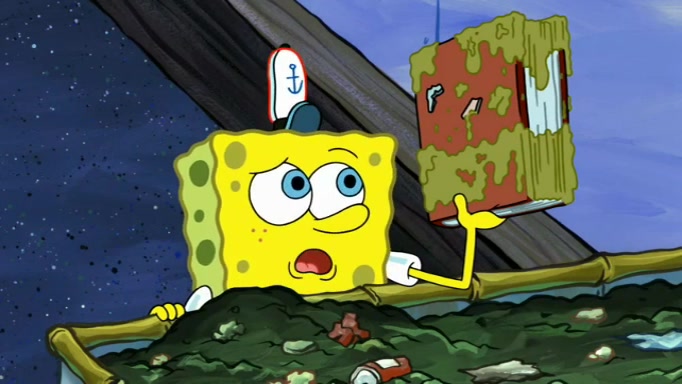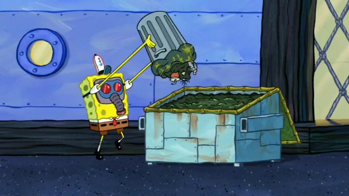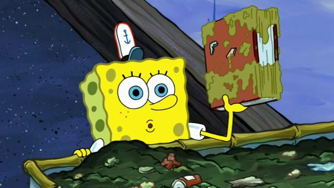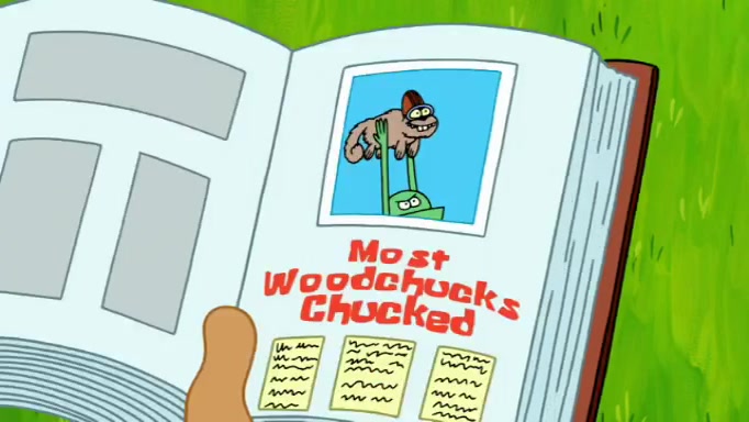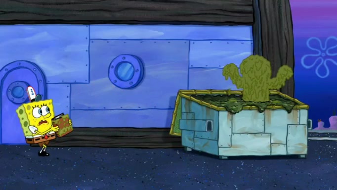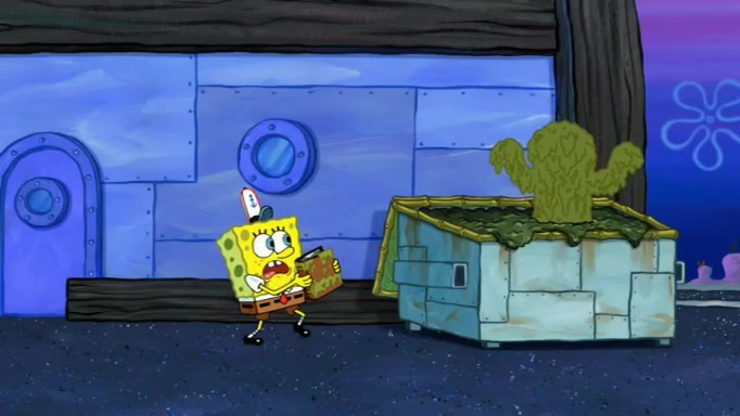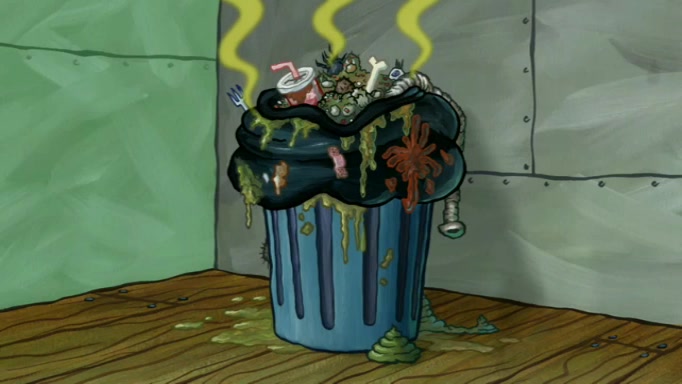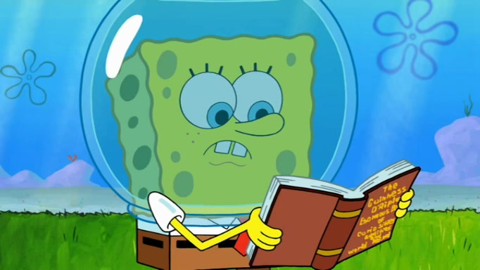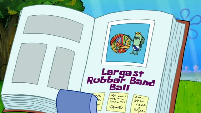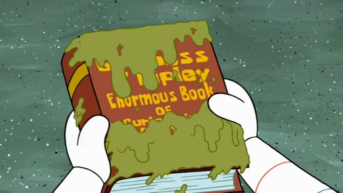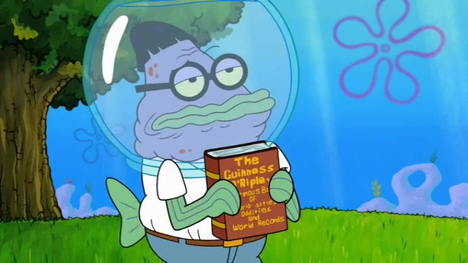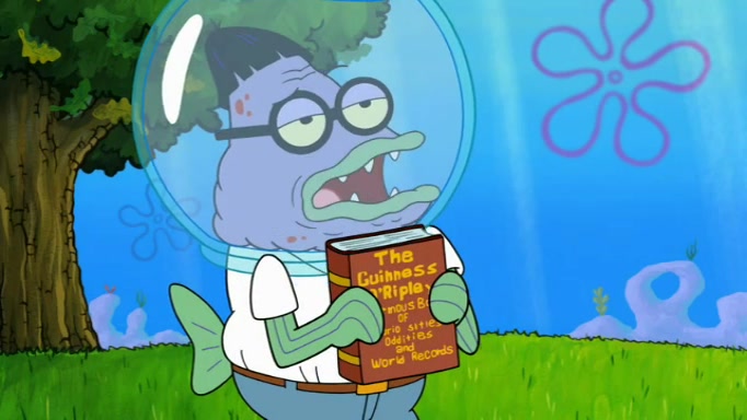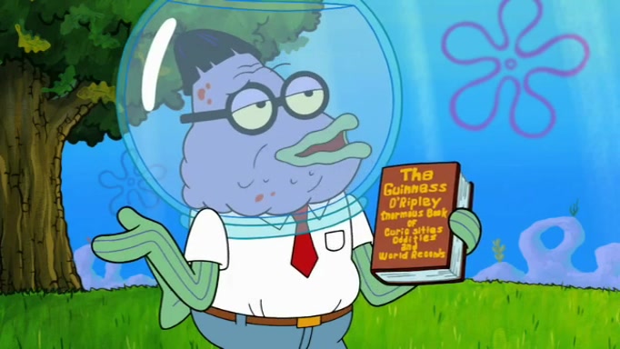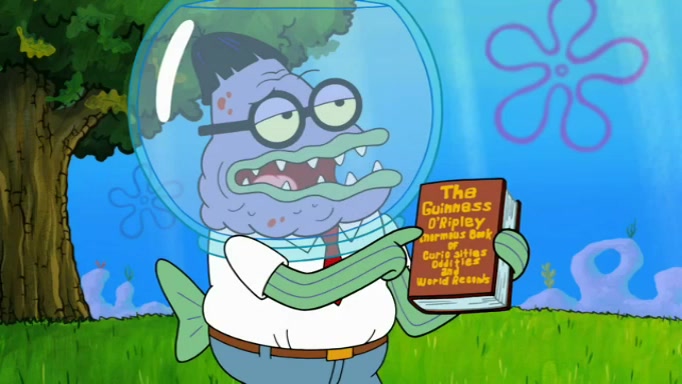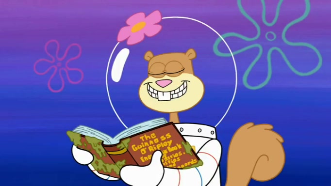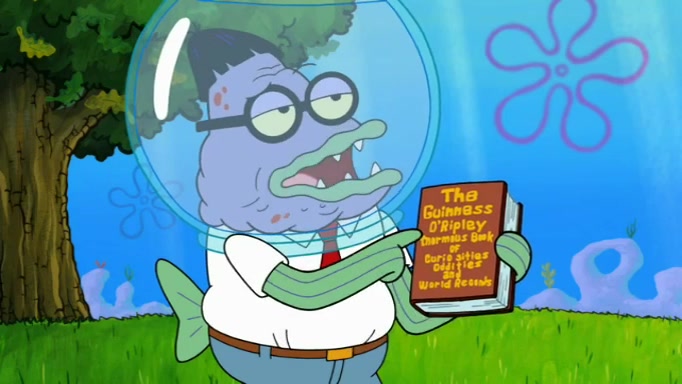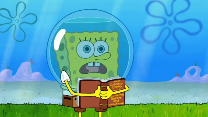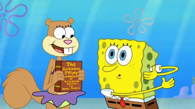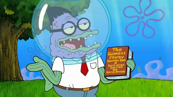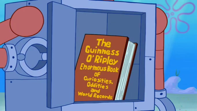 At the beginning, the episode starts off at the Krusty Krab where Squidward is sleeping at the cash register, until Squidward's clock starts ringing which causes him to wake up and stop the clock ringing with his hand. Squidward then pokes his head in the kitchen and yells at SpongeBob to go home since it's quitting time. SpongeBob is obliviously not paying attention. A minute later, SpongeBob's watch beeps and notices that it's quitting time. He asks Squidward why he is still there. Squidward is frustrated by this and runs out of the Krusty Krab yelling angrily. Still in the kitchen, SpongeBob doesn't want to throw away a cooked patty, so he puts the patty in his wallet for later. SpongeBob then smells garbage and decides to take out the trash. While dumping the trash into the Dumpster, SpongeBob notices a book covered in garbage and claims "You shouldn't throw away books." Suddenly, SpongeBob sees a big green slimy monster emerging from the dumpster. SpongeBob then throws the book at it, causing it to fall over. The slime dissolves to reveal that it was actually Sandy. Sandy claims that she is not a trash monster and was just trying to break the record for rooting around in a trash bin. Sandy shows SpongeBob the book he was holding is called "Guinness O'Ripley Enormous Book of Curiousities, Oddities and World Records." She then shows SpongeBob some of the world records in the book and claims she wants to beat every record in that book.
