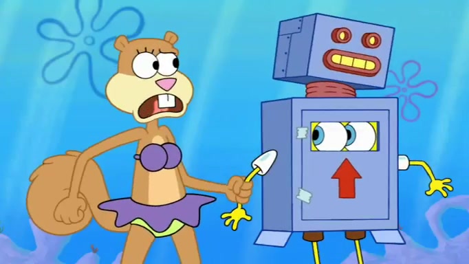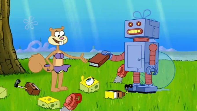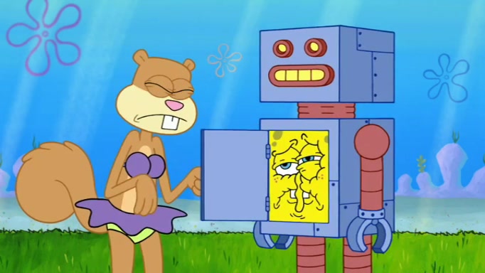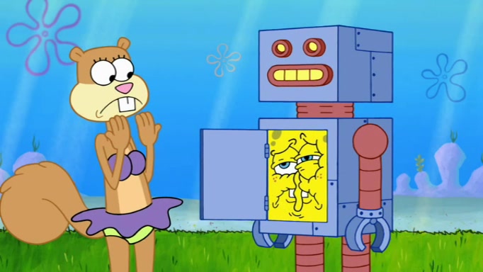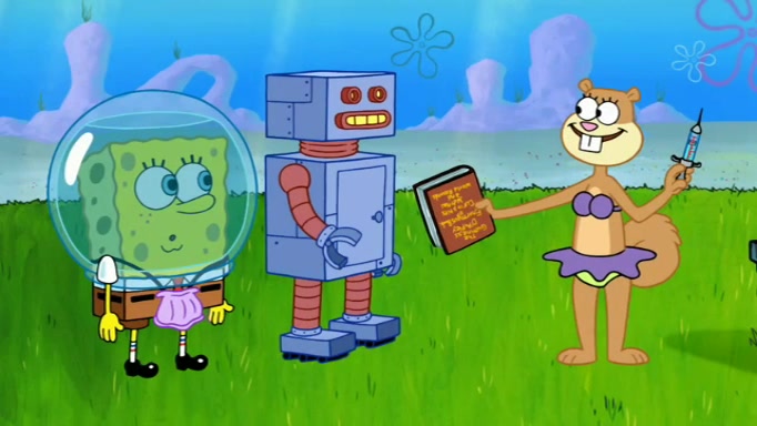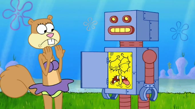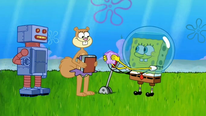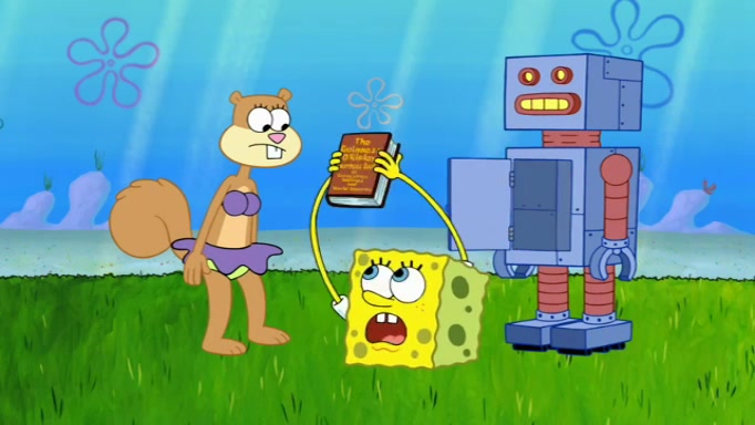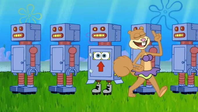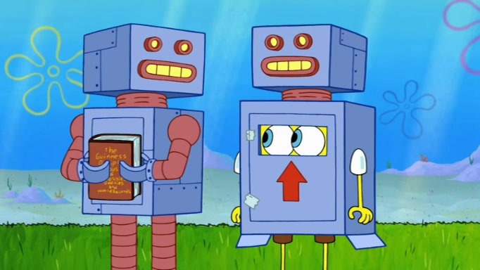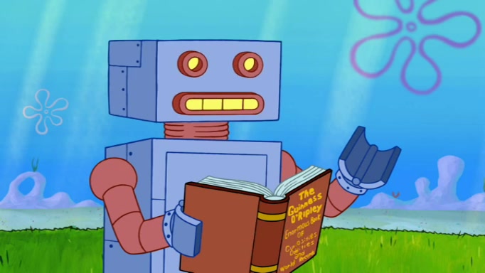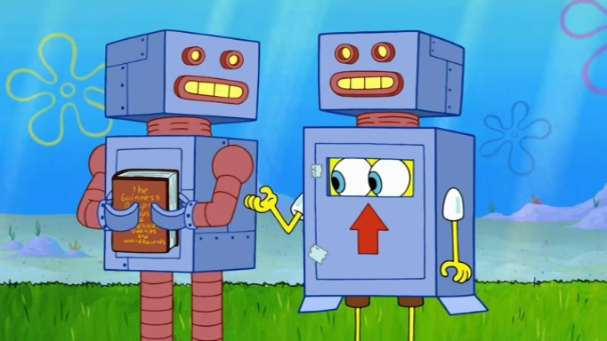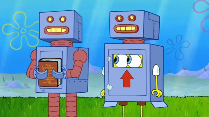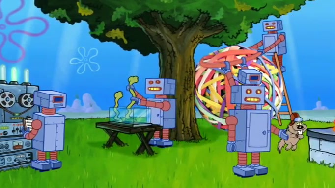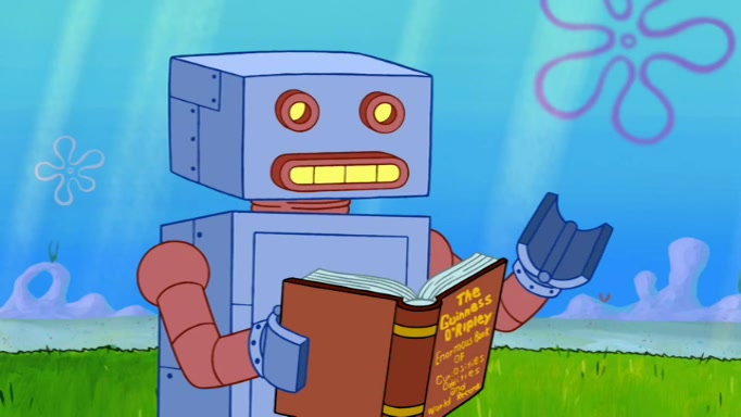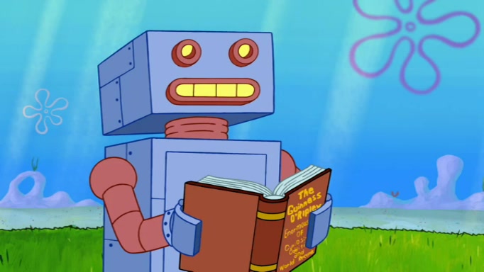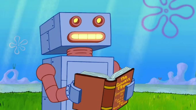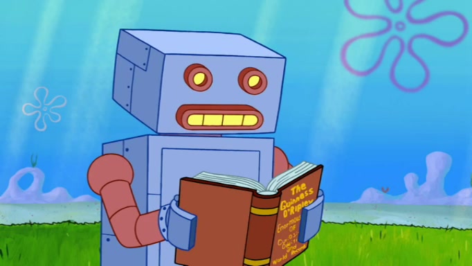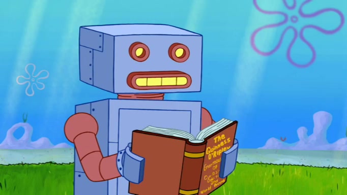 The scene changes to SpongeBob's house where SpongeBob is cleaning Gary's litter box. While cleaning the litter box, SpongeBob tells Gary that he has broken the record for "World's Stinkiest Litter box." SpongeBob finds that Sandy has become obsessed with the record book and claims the book must be destroyed. SpongeBob goes back to Sandy's treedome and disguises himself as one of Sandy's robots so he looks like the rest of the robots. SpongeBob then asks one of the robots if he can hold on to the record book and the robot gives the book to him. Sandy doesn't recognize SpongeBob's robot disguise and puts him into a line where robots are getting destroyed to break the record for most robots built and destroyed in a day. While the robots are getting built and destroyed, a robot standing next to Sandy is counting the total amount of destroyed robots in order to break the world record. In the line of robots getting built and destroyed, SpongeBob in his robot disguise tries to sneak out of the line, but one robots grabs him and says "We're all in this together." SpongeBob and the robot both get crushed and are sent though a conveyor belt. Sandy finally breaks the most robots built and destroyed in a day. One of the robots came out of the robot destroying machine and says his stomach feels funny. Sandy looks inside his stomach and sees SpongeBob. The robot pukes out SpongeBob and SpongeBob states he came to save her from the record book. Sandy says she is done with the book and she has beaten every record. The author for the book then enters the treedome and verifies that the book is over 30 years old and that the records have already been broken, but SpongeBob had broken a record for having so many injuries from helping a friend. In the end, SpongeBob cracks into pieces and the author takes a picture.