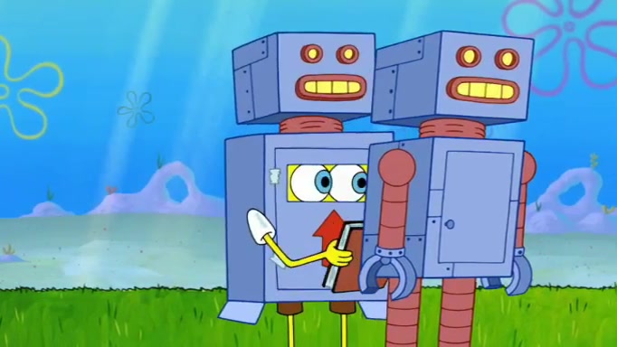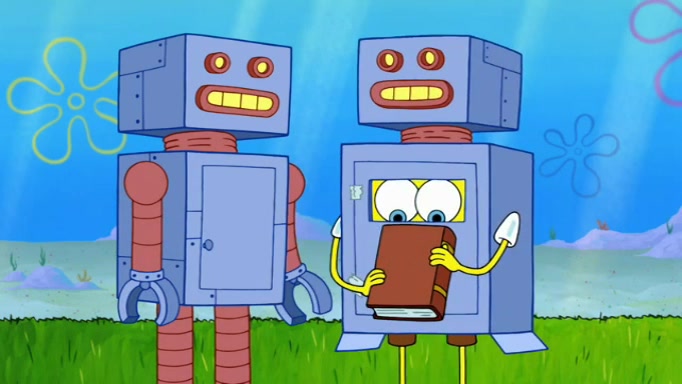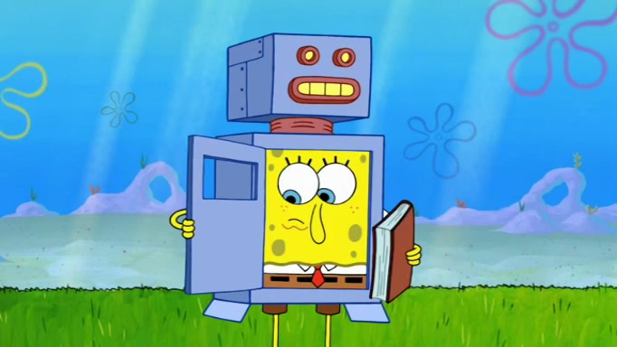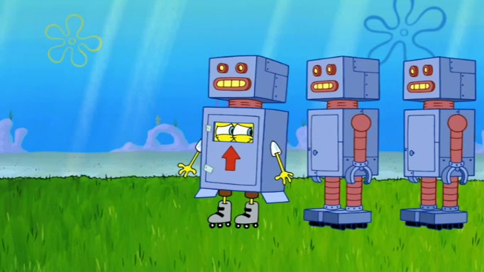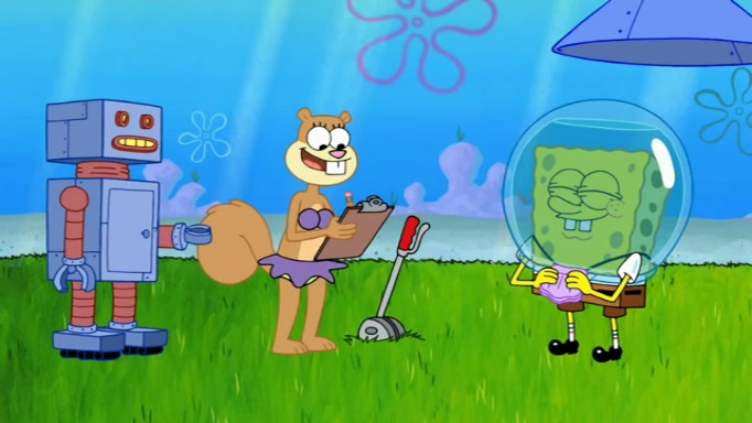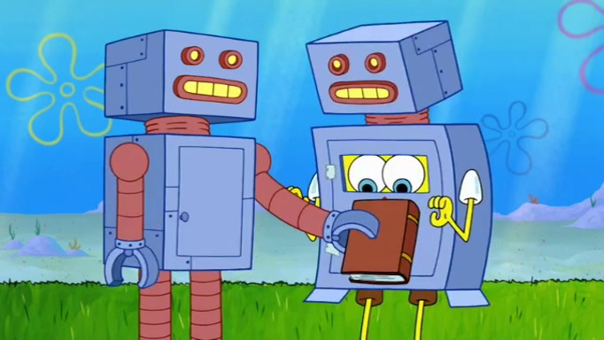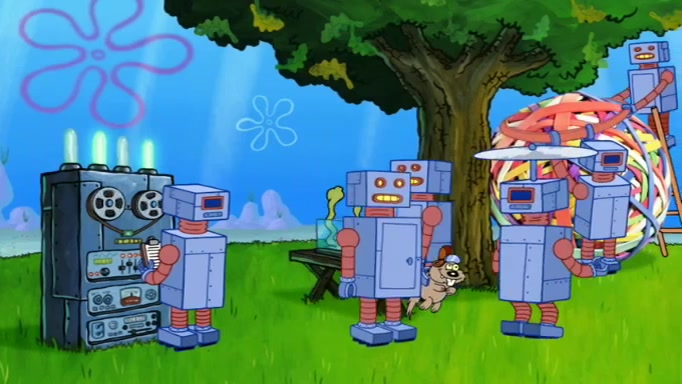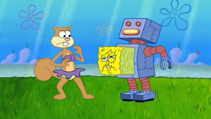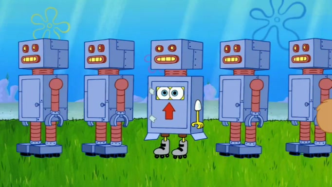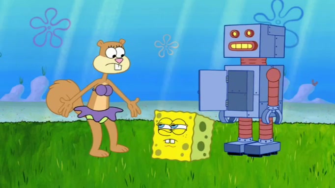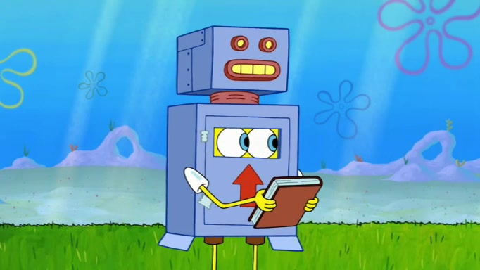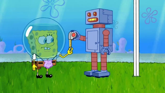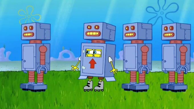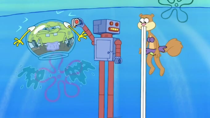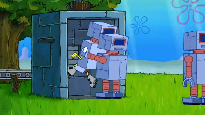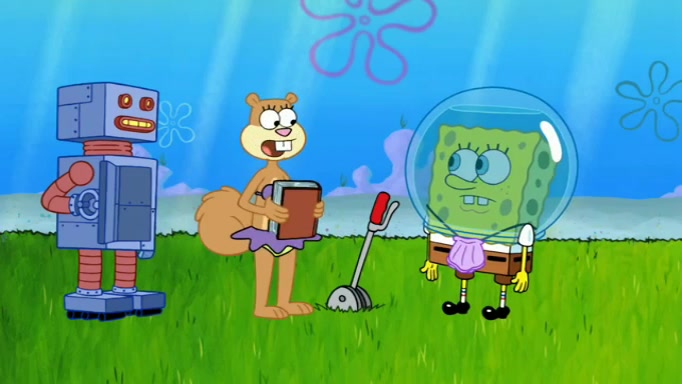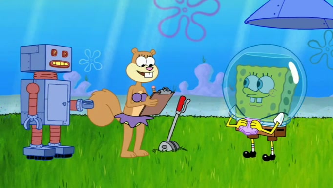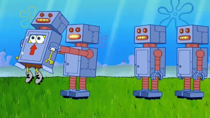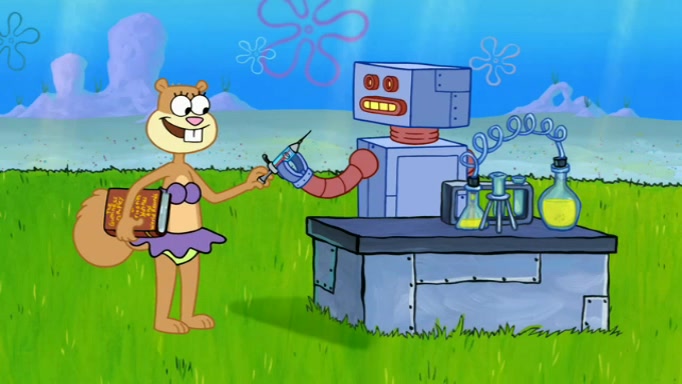 The scene changes to SpongeBob's house where SpongeBob is cleaning Gary's litter box. While cleaning the litter box, SpongeBob tells Gary that he has broken the record for "World's Stinkiest Litter box." SpongeBob finds that Sandy has become obsessed with the record book and claims the book must be destroyed. SpongeBob goes back to Sandy's treedome and disguises himself as one of Sandy's robots so he looks like the rest of the robots. SpongeBob then asks one of the robots if he can hold on to the record book and the robot gives the book to him. Sandy doesn't recognize SpongeBob's robot disguise and puts him into a line where robots are getting destroyed to break the record for most robots built and destroyed in a day. While the robots are getting built and destroyed, a robot standing next to Sandy is counting the total amount of destroyed robots in order to break the world record. In the line of robots getting built and destroyed, SpongeBob in his robot disguise tries to sneak out of the line, but one robots grabs him and says "We're all in this together." SpongeBob and the robot both get crushed and are sent though a conveyor belt. Sandy finally breaks the most robots built and destroyed in a day. One of the robots came out of the robot destroying machine and says his stomach feels funny. Sandy looks inside his stomach and sees SpongeBob. The robot pukes out SpongeBob and SpongeBob states he came to save her from the record book. Sandy says she is done with the book and she has beaten every record. The author for the book then enters the treedome and verifies that the book is over 30 years old and that the records have already been broken, but SpongeBob had broken a record for having so many injuries from helping a friend. In the end, SpongeBob cracks into pieces and the author takes a picture.