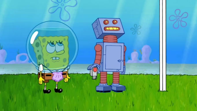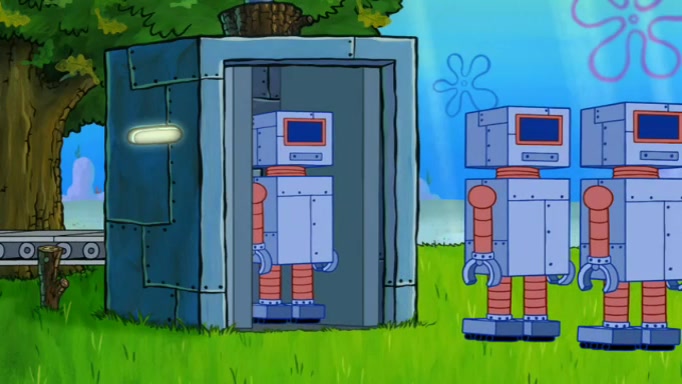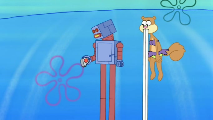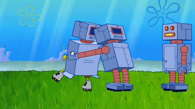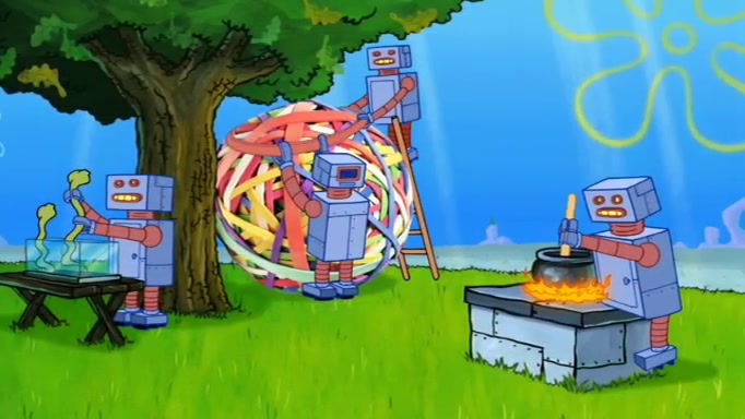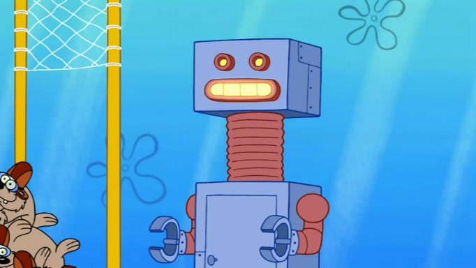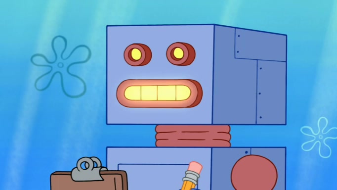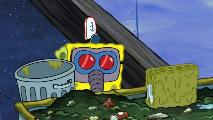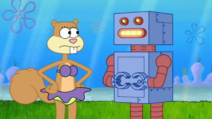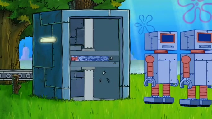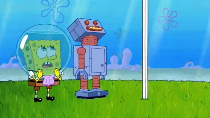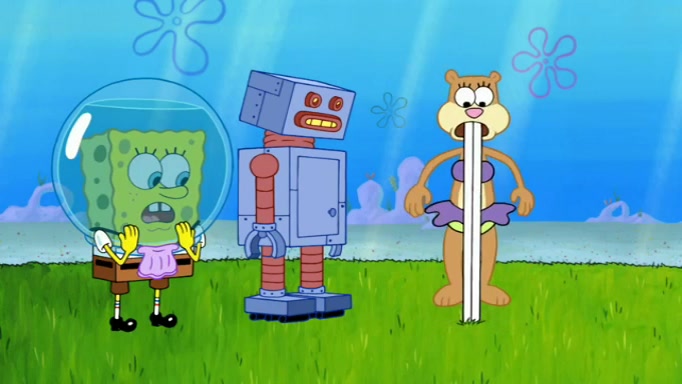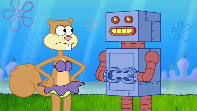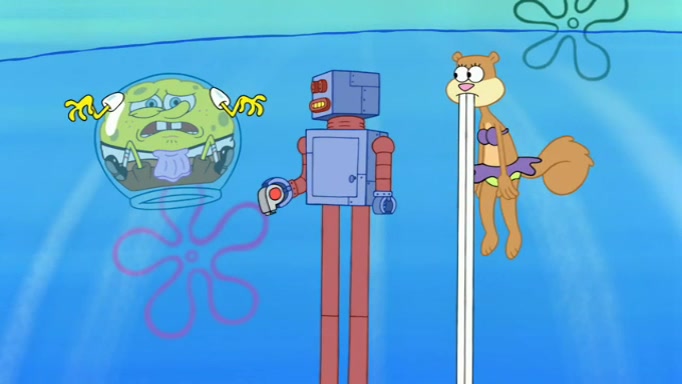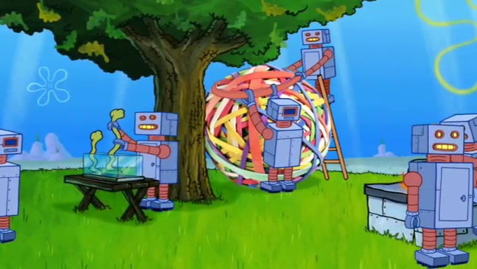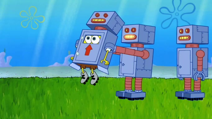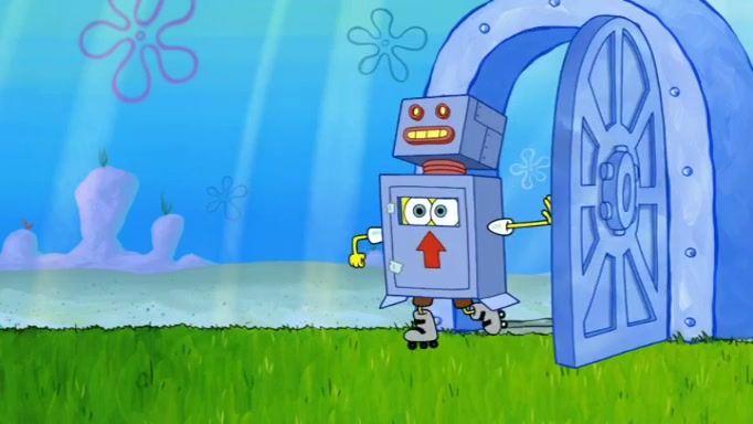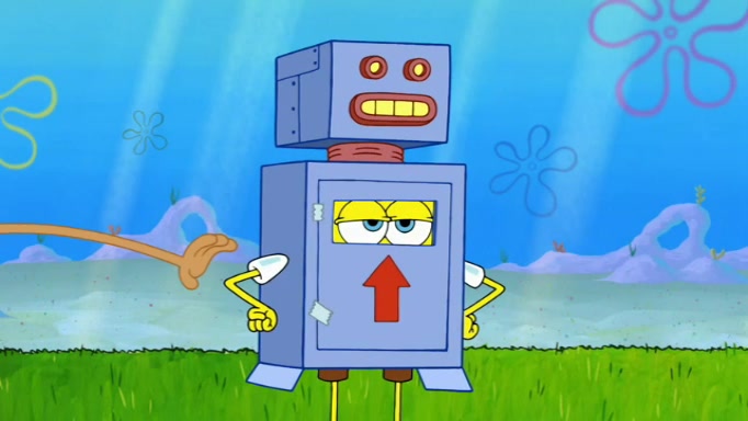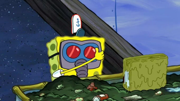 The scene changes to SpongeBob's house where SpongeBob is cleaning Gary's litter box. While cleaning the litter box, SpongeBob tells Gary that he has broken the record for "World's Stinkiest Litter box." SpongeBob finds that Sandy has become obsessed with the record book and claims the book must be destroyed. SpongeBob goes back to Sandy's treedome and disguises himself as one of Sandy's robots so he looks like the rest of the robots. SpongeBob then asks one of the robots if he can hold on to the record book and the robot gives the book to him. Sandy doesn't recognize SpongeBob's robot disguise and puts him into a line where robots are getting destroyed to break the record for most robots built and destroyed in a day. While the robots are getting built and destroyed, a robot standing next to Sandy is counting the total amount of destroyed robots in order to break the world record. In the line of robots getting built and destroyed, SpongeBob in his robot disguise tries to sneak out of the line, but one robots grabs him and says "We're all in this together." SpongeBob and the robot both get crushed and are sent though a conveyor belt. Sandy finally breaks the most robots built and destroyed in a day. One of the robots came out of the robot destroying machine and says his stomach feels funny. Sandy looks inside his stomach and sees SpongeBob. The robot pukes out SpongeBob and SpongeBob states he came to save her from the record book. Sandy says she is done with the book and she has beaten every record. The author for the book then enters the treedome and verifies that the book is over 30 years old and that the records have already been broken, but SpongeBob had broken a record for having so many injuries from helping a friend. In the end, SpongeBob cracks into pieces and the author takes a picture.