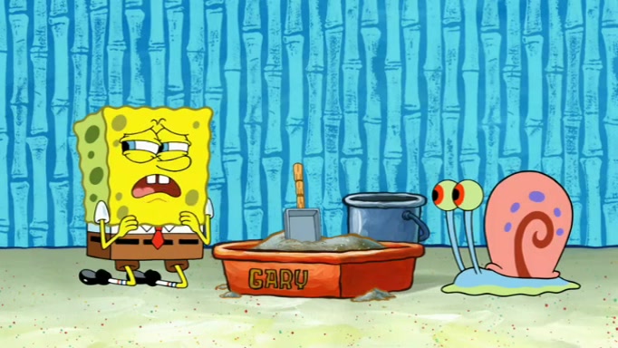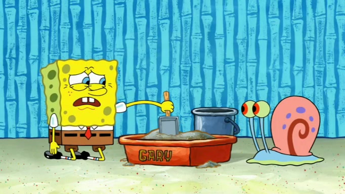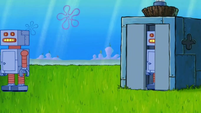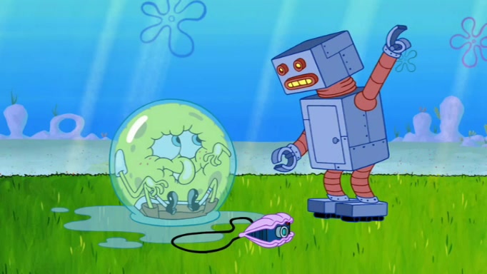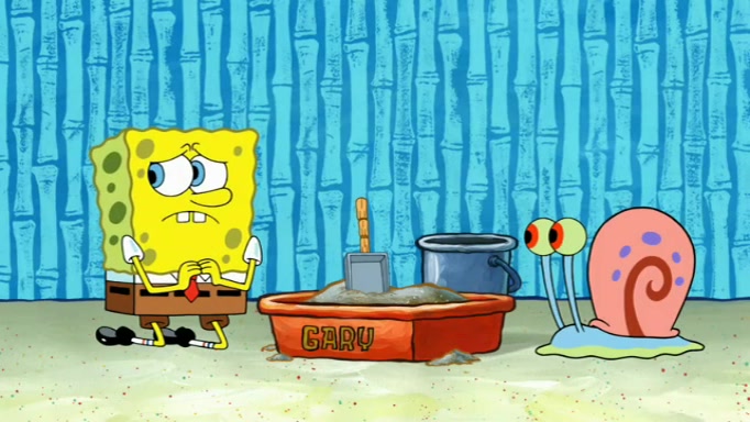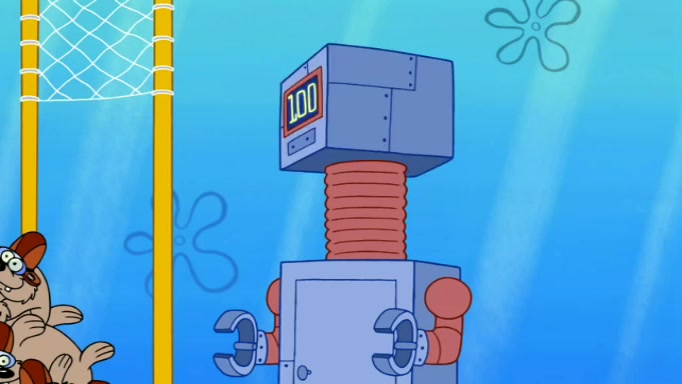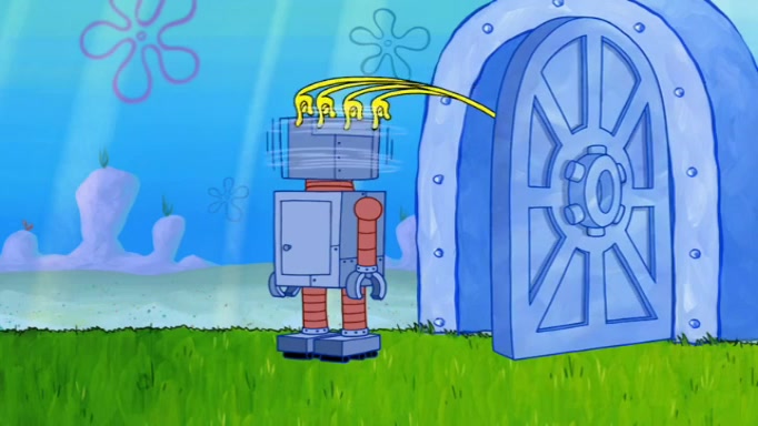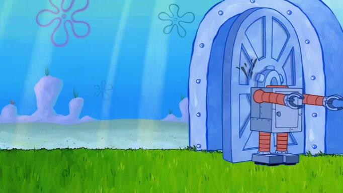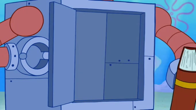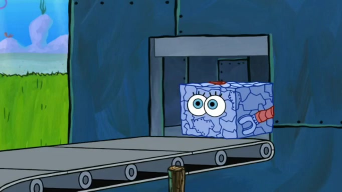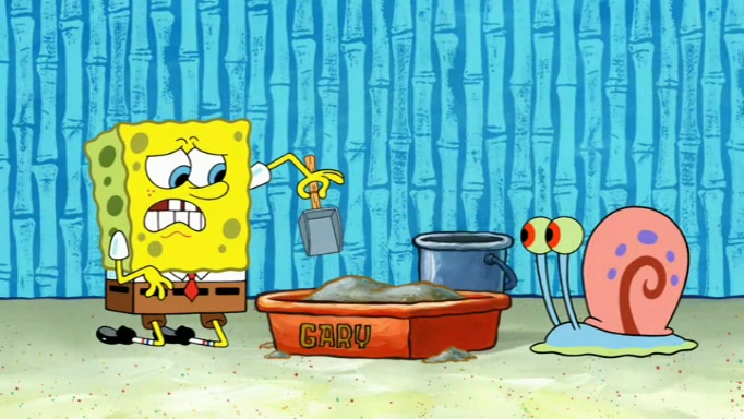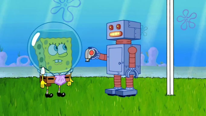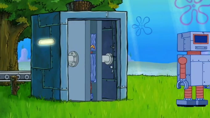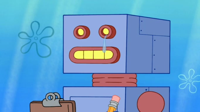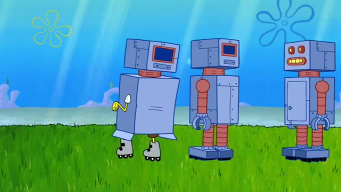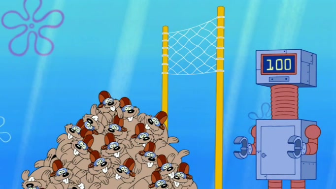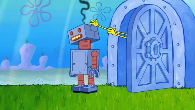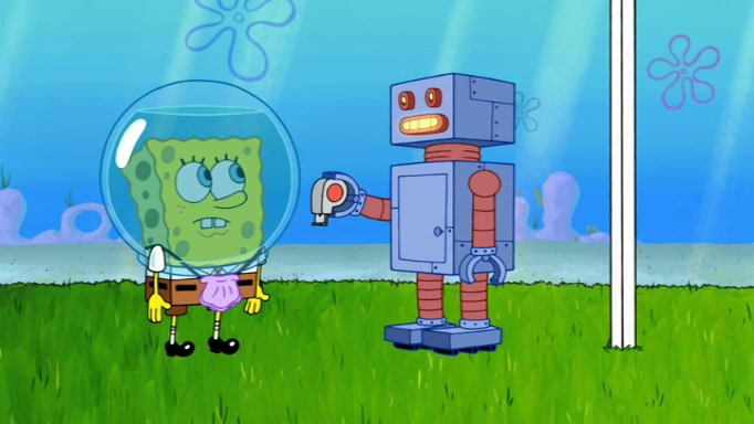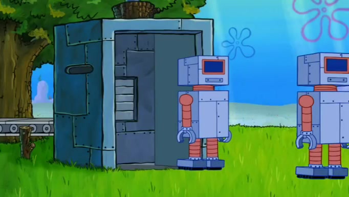 The scene changes to SpongeBob's house where SpongeBob is cleaning Gary's litter box. While cleaning the litter box, SpongeBob tells Gary that he has broken the record for "World's Stinkiest Litter box." SpongeBob finds that Sandy has become obsessed with the record book and claims the book must be destroyed. SpongeBob goes back to Sandy's treedome and disguises himself as one of Sandy's robots so he looks like the rest of the robots. SpongeBob then asks one of the robots if he can hold on to the record book and the robot gives the book to him. Sandy doesn't recognize SpongeBob's robot disguise and puts him into a line where robots are getting destroyed to break the record for most robots built and destroyed in a day. While the robots are getting built and destroyed, a robot standing next to Sandy is counting the total amount of destroyed robots in order to break the world record. In the line of robots getting built and destroyed, SpongeBob in his robot disguise tries to sneak out of the line, but one robots grabs him and says "We're all in this together." SpongeBob and the robot both get crushed and are sent though a conveyor belt. Sandy finally breaks the most robots built and destroyed in a day. One of the robots came out of the robot destroying machine and says his stomach feels funny. Sandy looks inside his stomach and sees SpongeBob. The robot pukes out SpongeBob and SpongeBob states he came to save her from the record book. Sandy says she is done with the book and she has beaten every record. The author for the book then enters the treedome and verifies that the book is over 30 years old and that the records have already been broken, but SpongeBob had broken a record for having so many injuries from helping a friend. In the end, SpongeBob cracks into pieces and the author takes a picture.