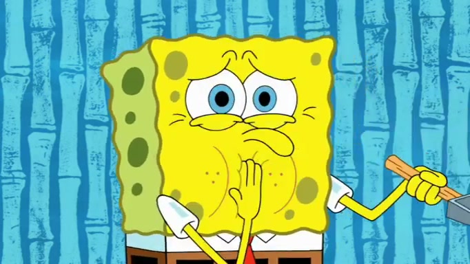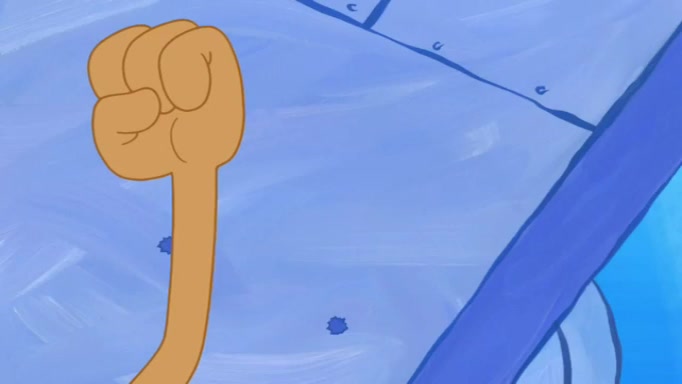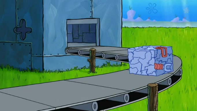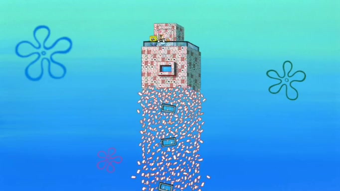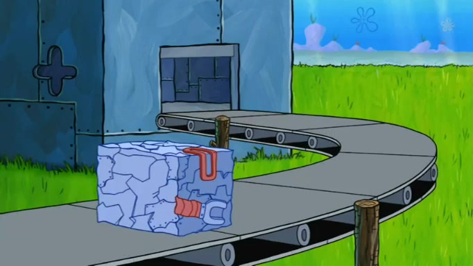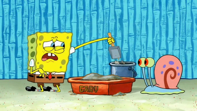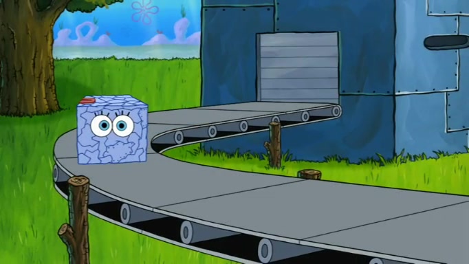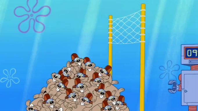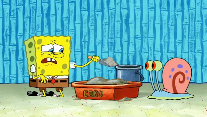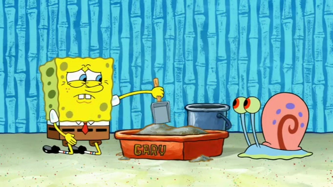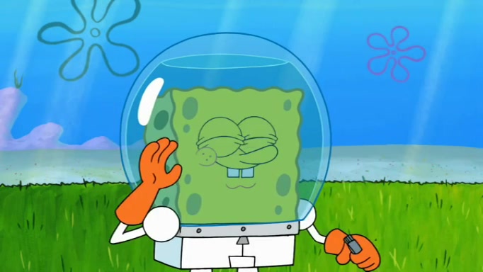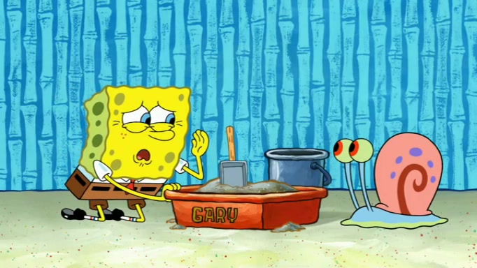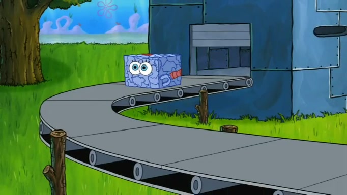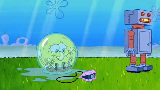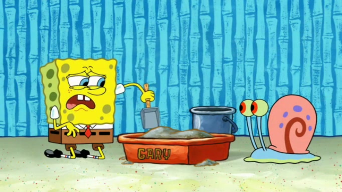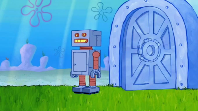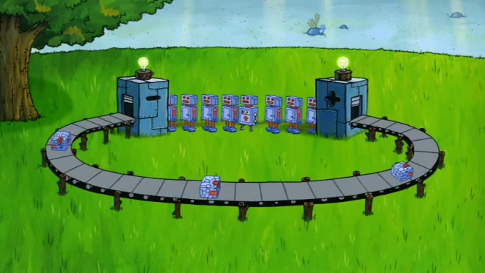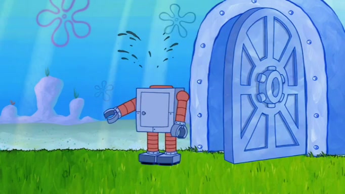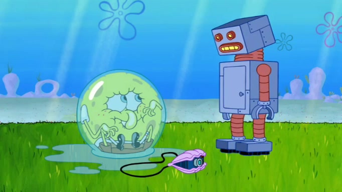 The scene changes to SpongeBob's house where SpongeBob is cleaning Gary's litter box. While cleaning the litter box, SpongeBob tells Gary that he has broken the record for "World's Stinkiest Litter box." SpongeBob finds that Sandy has become obsessed with the record book and claims the book must be destroyed. SpongeBob goes back to Sandy's treedome and disguises himself as one of Sandy's robots so he looks like the rest of the robots. SpongeBob then asks one of the robots if he can hold on to the record book and the robot gives the book to him. Sandy doesn't recognize SpongeBob's robot disguise and puts him into a line where robots are getting destroyed to break the record for most robots built and destroyed in a day. While the robots are getting built and destroyed, a robot standing next to Sandy is counting the total amount of destroyed robots in order to break the world record. In the line of robots getting built and destroyed, SpongeBob in his robot disguise tries to sneak out of the line, but one robots grabs him and says "We're all in this together." SpongeBob and the robot both get crushed and are sent though a conveyor belt. Sandy finally breaks the most robots built and destroyed in a day. One of the robots came out of the robot destroying machine and says his stomach feels funny. Sandy looks inside his stomach and sees SpongeBob. The robot pukes out SpongeBob and SpongeBob states he came to save her from the record book. Sandy says she is done with the book and she has beaten every record. The author for the book then enters the treedome and verifies that the book is over 30 years old and that the records have already been broken, but SpongeBob had broken a record for having so many injuries from helping a friend. In the end, SpongeBob cracks into pieces and the author takes a picture.