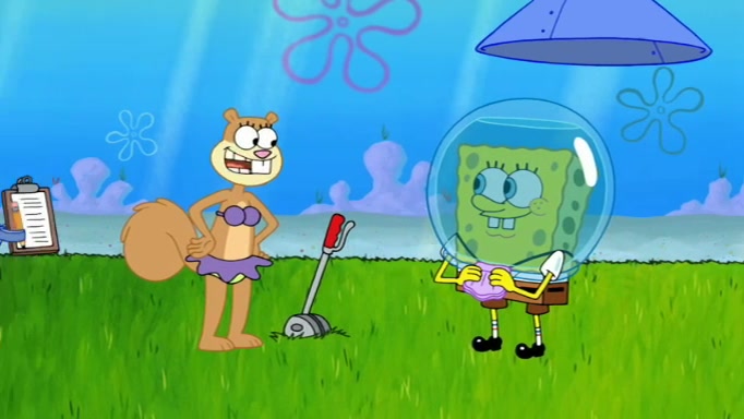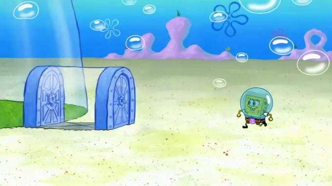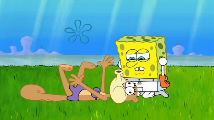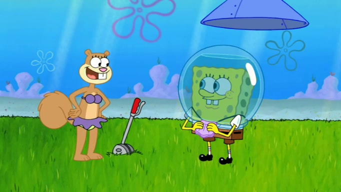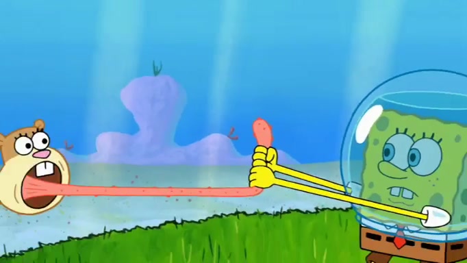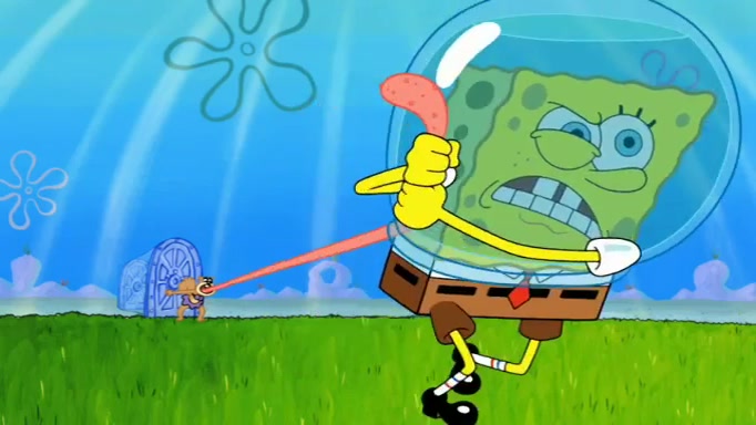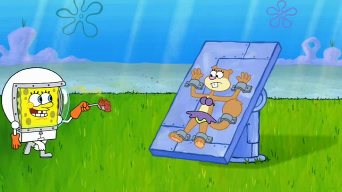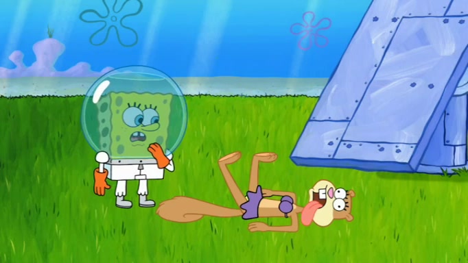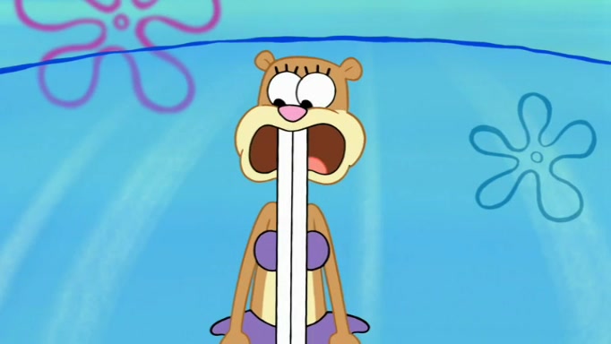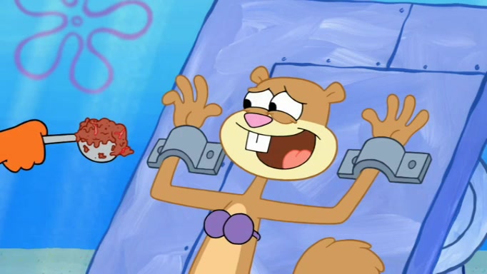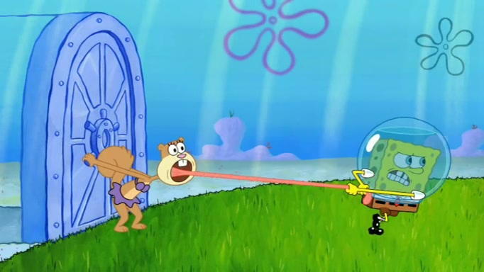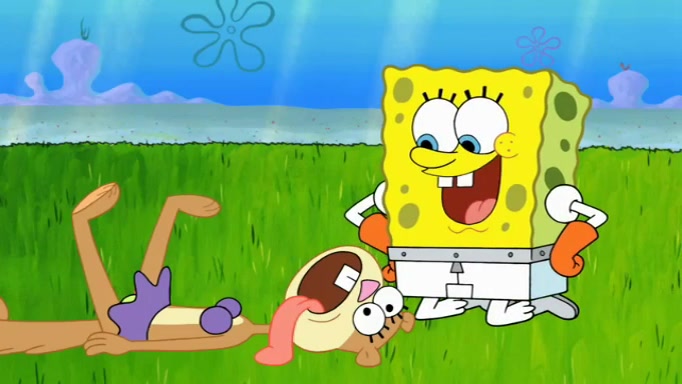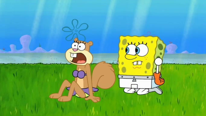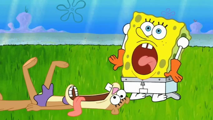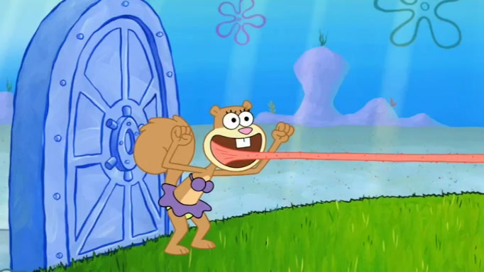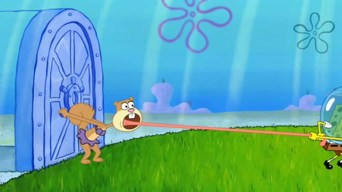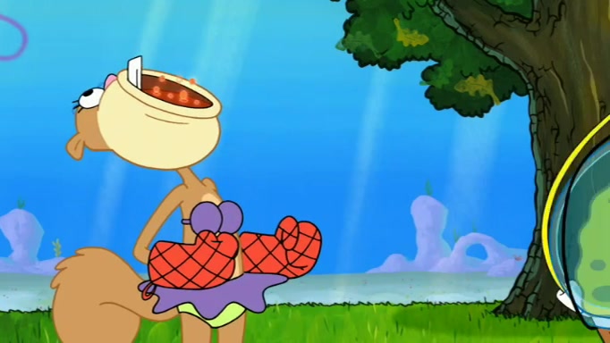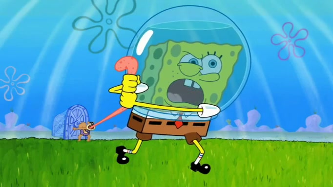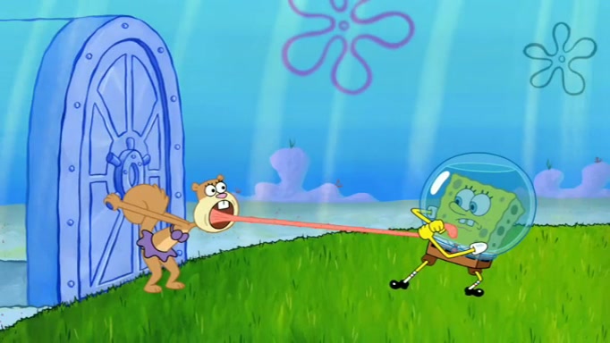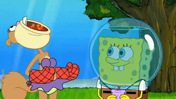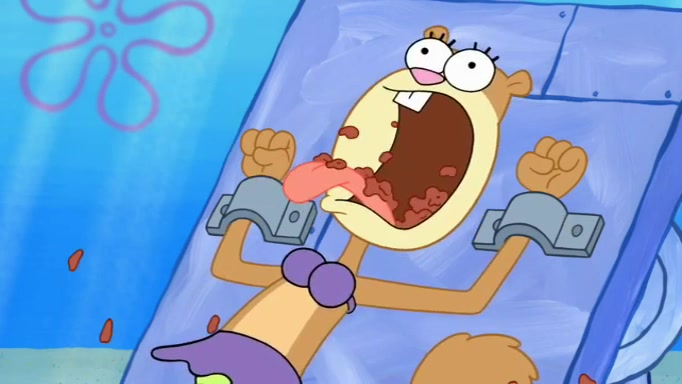 The scene cuts to Sandy's Treedome where SpongeBob and Sandy try to break the record for world's longest tongue. Sandy holds her hand on her door while SpongeBob pulls on Sandy's tongue. The record is broken after SpongeBob stretches her tongue up to 110 inches. The next record is to eat raw chum, so SpongeBob and Sandy go to the Chum Bucket and ask Plankton to give them raw chum. Plankton, however, warns them that no one can injest raw chum and survive, but SpongeBob and Sandy don't care. Later in Sandy's Treedome, SpongeBob wears a special germ suit and gives Sandy a spoon of raw chum. Sandy then swallows it and freaks out. SpongeBob tells Sandy that she survived and broke the record. However, Sandy suddenly becomes subconscious from eating the raw chum. SpongeBob then takes off his water helmet and feeds Sandy the patty he saved from work. Sandy recovers from her subconscious and says "I can't wait to show them experts the pictures of my record breaking feats." SpongeBob then realizes he forgot his camera and goes home to get it.
