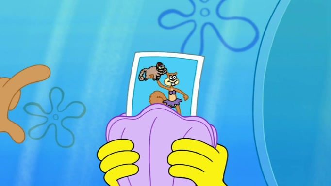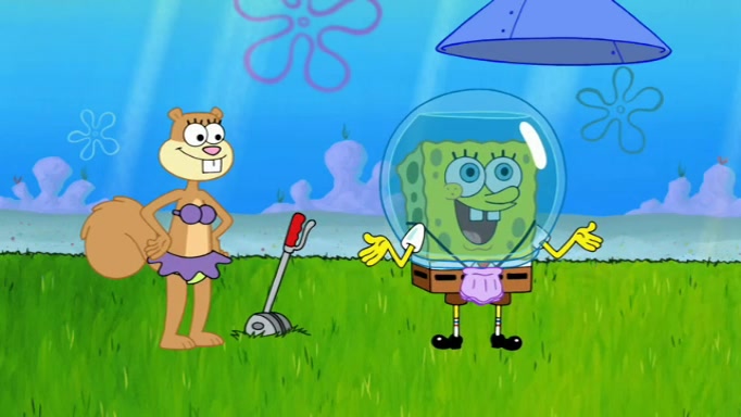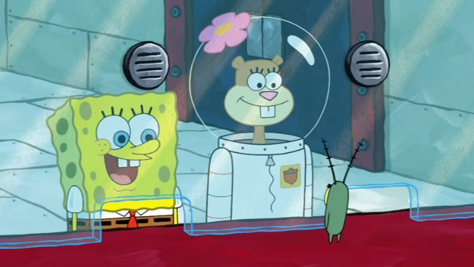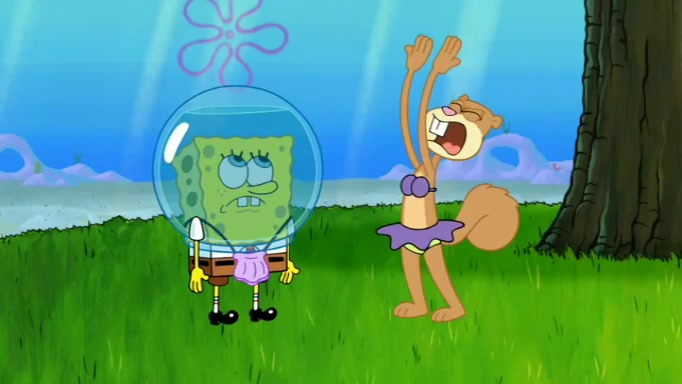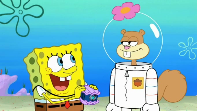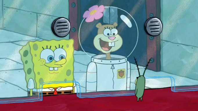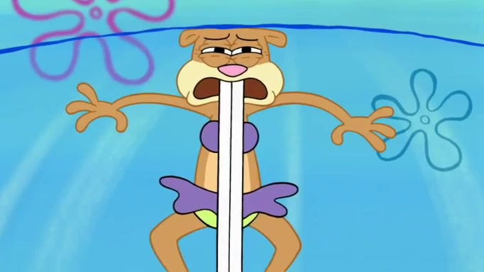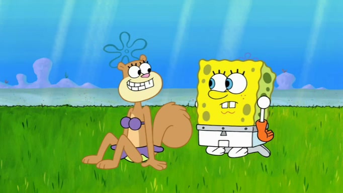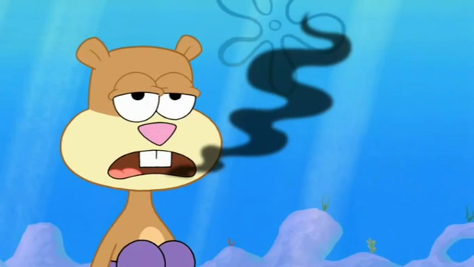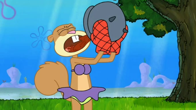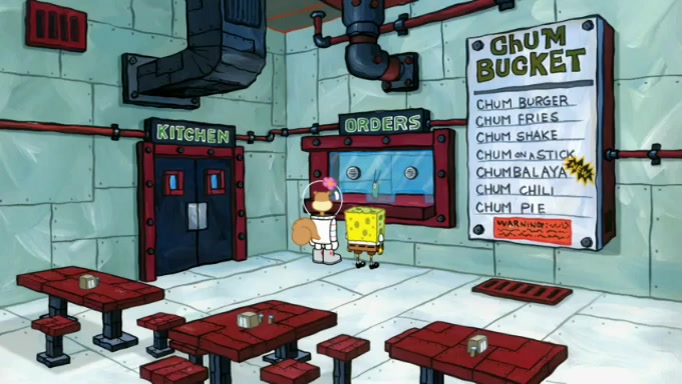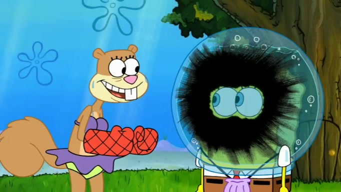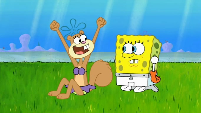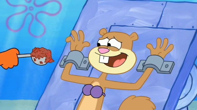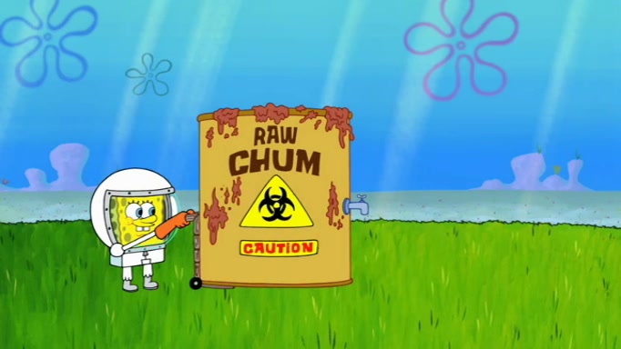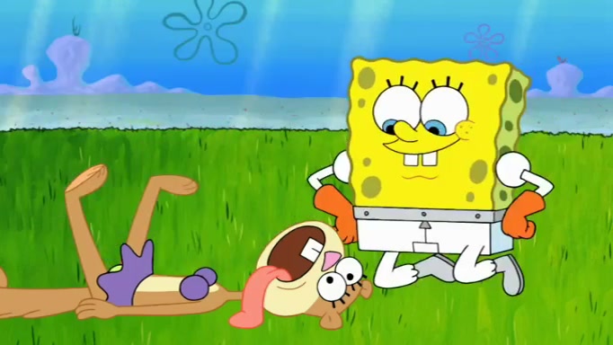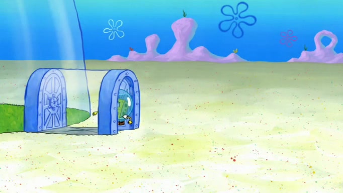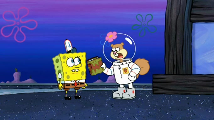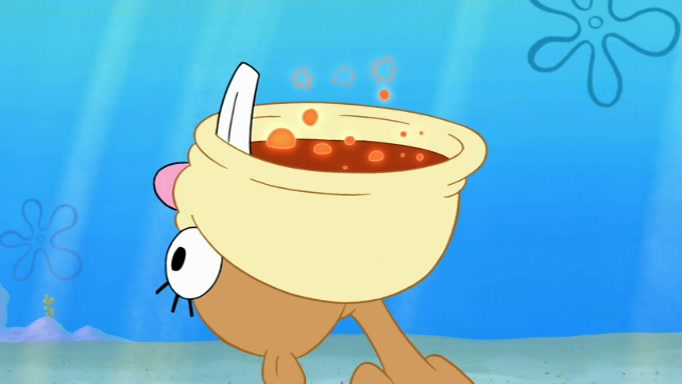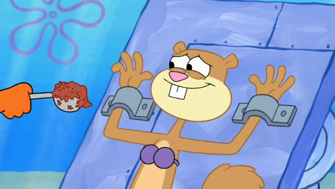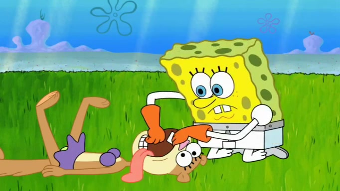 The scene cuts to Sandy's Treedome where SpongeBob and Sandy try to break the record for world's longest tongue. Sandy holds her hand on her door while SpongeBob pulls on Sandy's tongue. The record is broken after SpongeBob stretches her tongue up to 110 inches. The next record is to eat raw chum, so SpongeBob and Sandy go to the Chum Bucket and ask Plankton to give them raw chum. Plankton, however, warns them that no one can injest raw chum and survive, but SpongeBob and Sandy don't care. Later in Sandy's Treedome, SpongeBob wears a special germ suit and gives Sandy a spoon of raw chum. Sandy then swallows it and freaks out. SpongeBob tells Sandy that she survived and broke the record. However, Sandy suddenly becomes subconscious from eating the raw chum. SpongeBob then takes off his water helmet and feeds Sandy the patty he saved from work. Sandy recovers from her subconscious and says "I can't wait to show them experts the pictures of my record breaking feats." SpongeBob then realizes he forgot his camera and goes home to get it.
