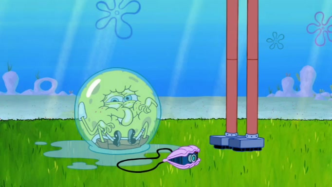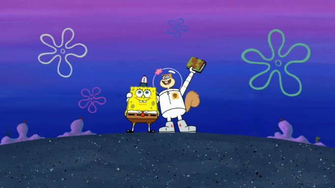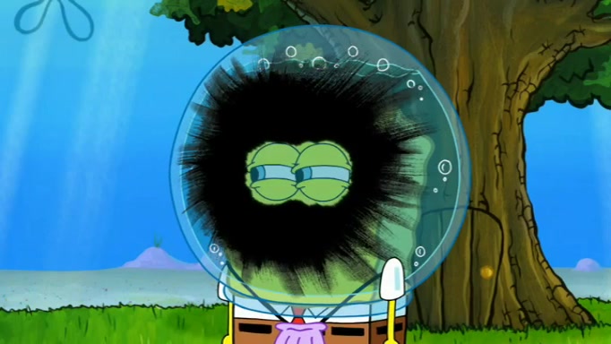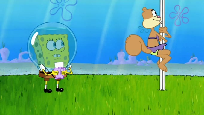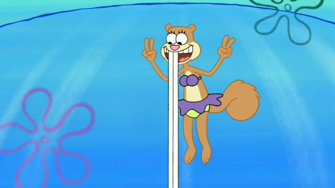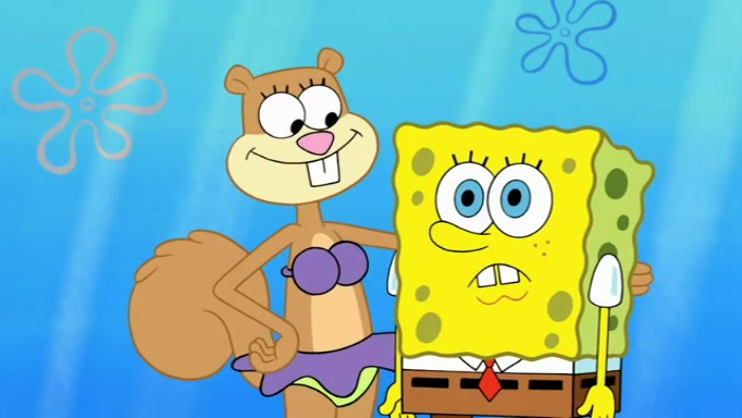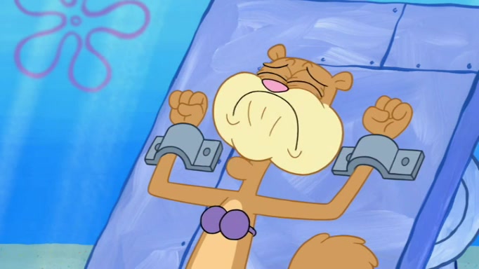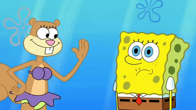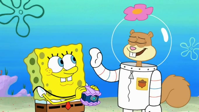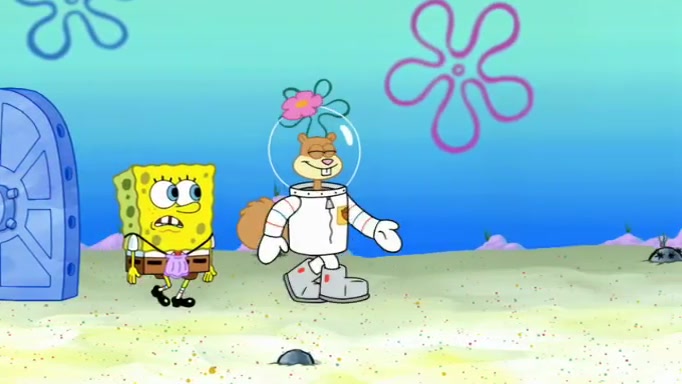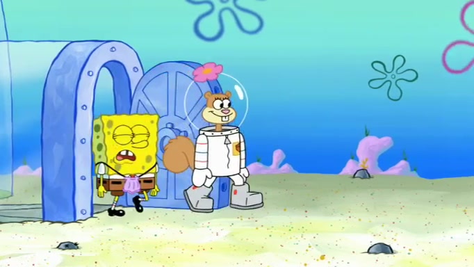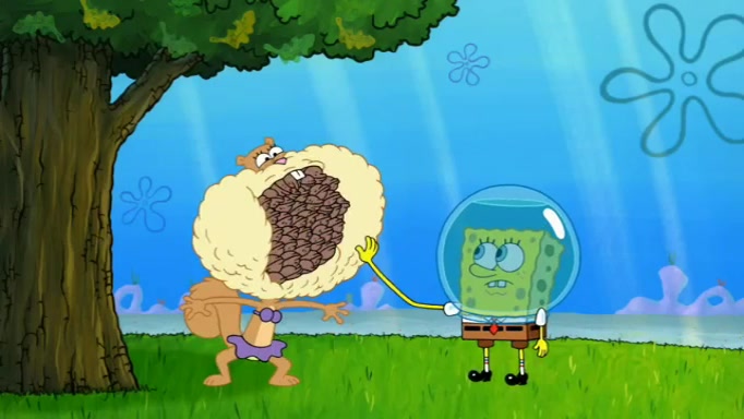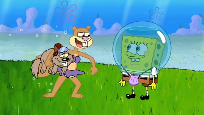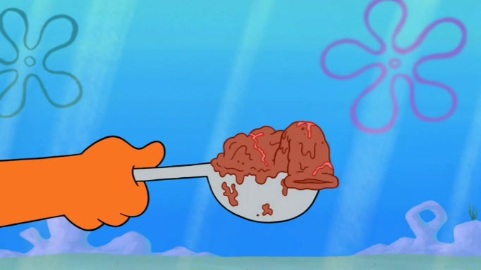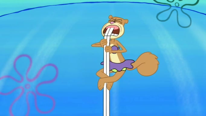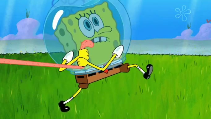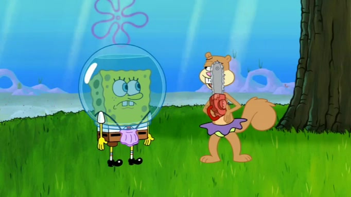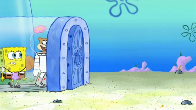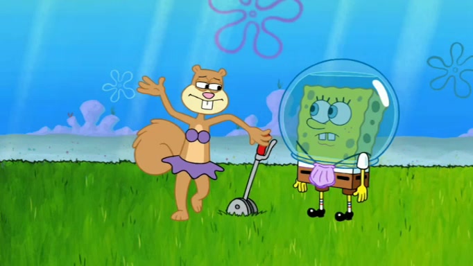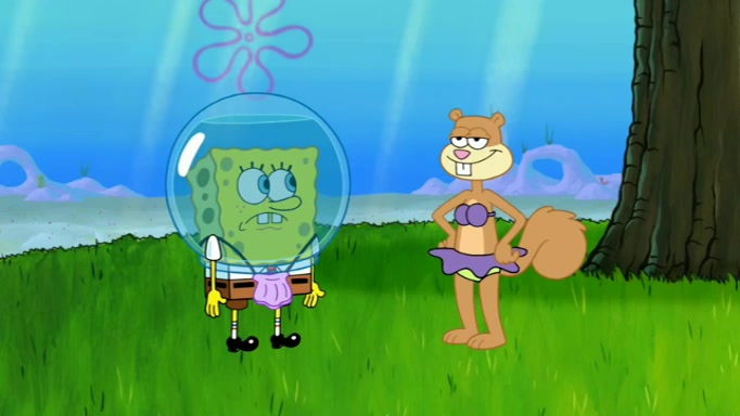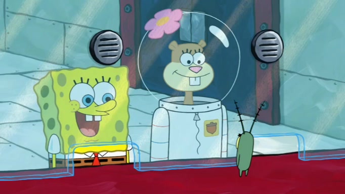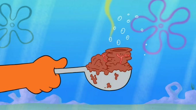 The scene cuts to Sandy's Treedome where SpongeBob and Sandy try to break the record for world's longest tongue. Sandy holds her hand on her door while SpongeBob pulls on Sandy's tongue. The record is broken after SpongeBob stretches her tongue up to 110 inches. The next record is to eat raw chum, so SpongeBob and Sandy go to the Chum Bucket and ask Plankton to give them raw chum. Plankton, however, warns them that no one can injest raw chum and survive, but SpongeBob and Sandy don't care. Later in Sandy's Treedome, SpongeBob wears a special germ suit and gives Sandy a spoon of raw chum. Sandy then swallows it and freaks out. SpongeBob tells Sandy that she survived and broke the record. However, Sandy suddenly becomes subconscious from eating the raw chum. SpongeBob then takes off his water helmet and feeds Sandy the patty he saved from work. Sandy recovers from her subconscious and says "I can't wait to show them experts the pictures of my record breaking feats." SpongeBob then realizes he forgot his camera and goes home to get it.
