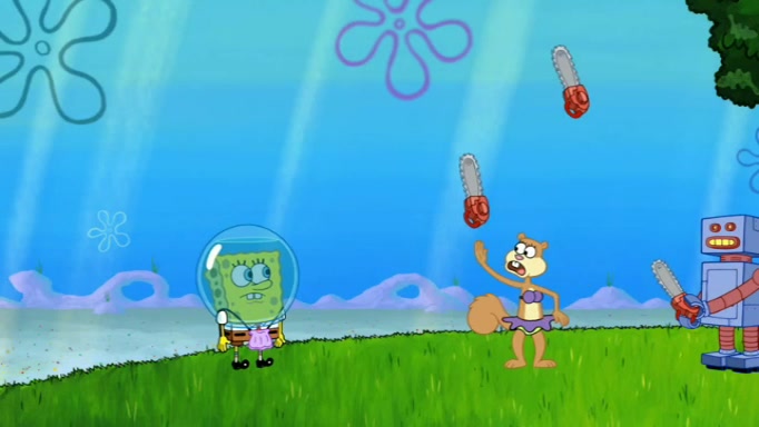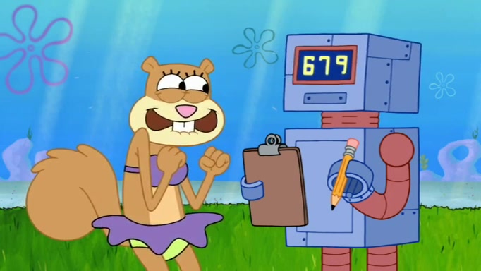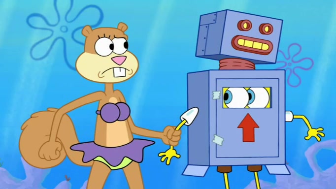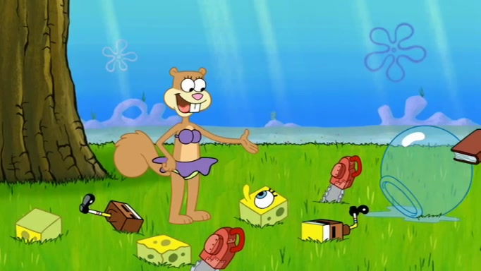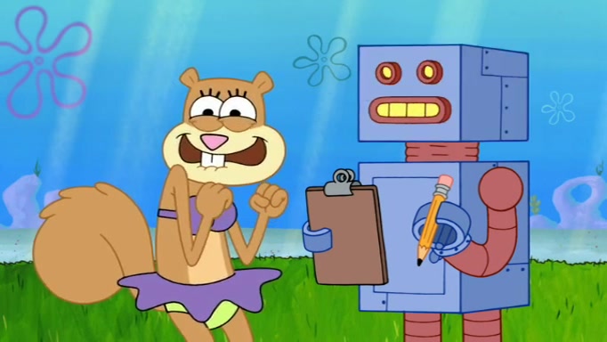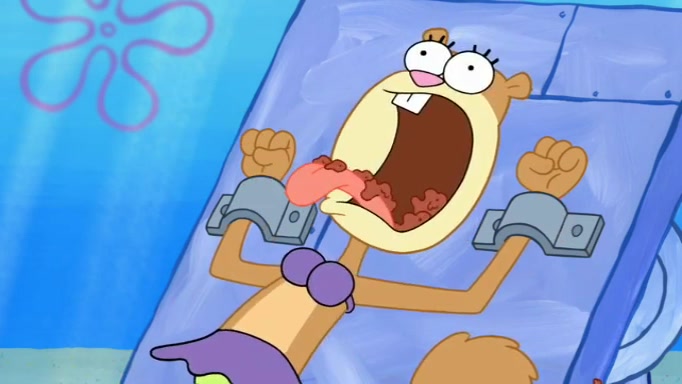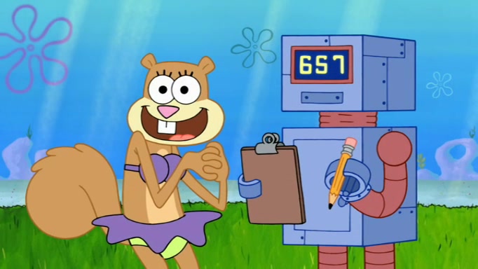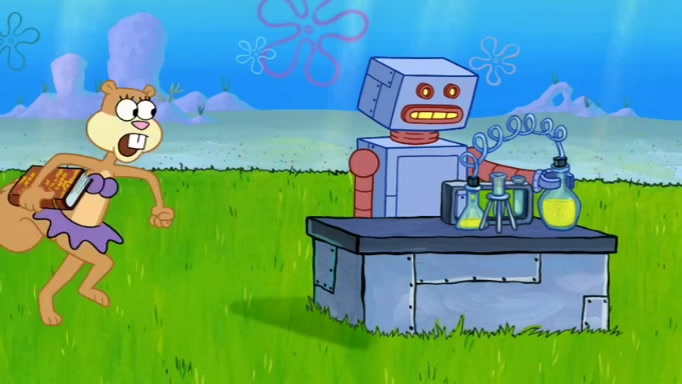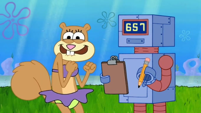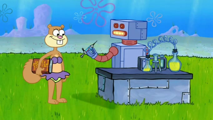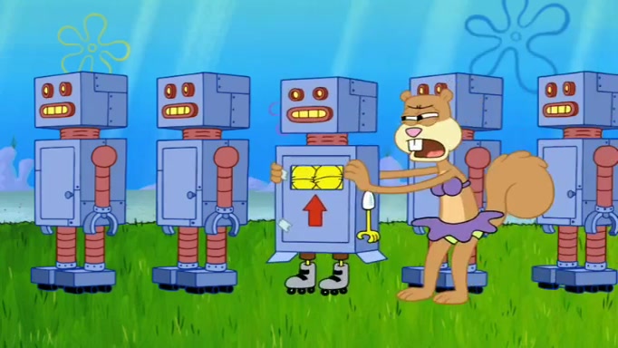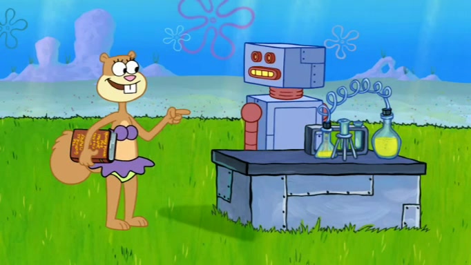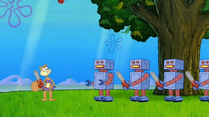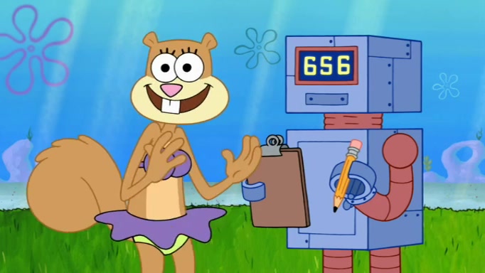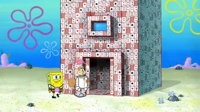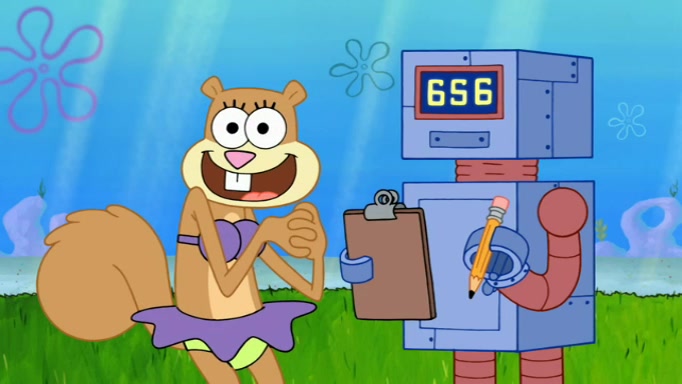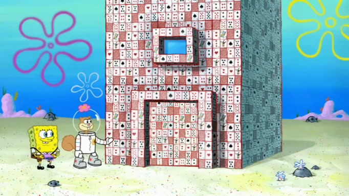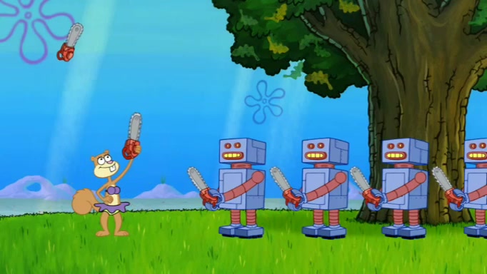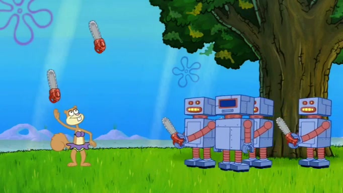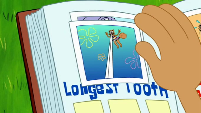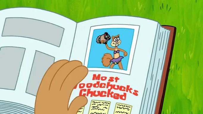 When SpongeBob returns, he sees Sandy's Treedome filled with a bunch of robots. Sandy comes up to SpongeBob and asks him to take a picture of her throwing a woodchuck to break the woodchuck chuckin' world record. SpongeBob takes the photo of Sandy throwing a woodchuck and she breaks the record. Sandy at that occasion sends the woodchucks back to where they belong. Afterwards, SpongeBob asks Sandy "What is all this?" Sandy explains that she had constructed many robots to help keep track of her records and with careful planning and precise delication of appropriate tasks so that she can manage the successful completion of the maximum number of records broken in the least amount of time. Sandy takes the picture of her throwing a woodchuck from SpongeBob and places it in the book. Sandy flips the page of the world records book to see what's next. The next record is the world's longest tooth. Sandy then asks one of the robots how the calcium fusion is going. The robot replies, "It is ready, Miss Cheeks." Sandy administers the shot and her tooth grows. It continues to grow until she hits her head on the ceiling of the treedome. The robot uses a tape measure and reaches 35 feet which breaks the record. SpongeBob takes a picture and tells Sandy to say "Cheese!" Sandy saws a giant part of the tooth off her top tooth and slides down. The next record is, spiciest chili gargle. So, Sandy gargles on chili as SpongeBob takes a picture. Sandy gulps the spicy chilly and breathes out fire at SpongeBob. The next record is largest rubber band ball. SpongeBob takes a picture of the large rubber band ball as Sandy lets go of it and SpongeBob gets crushed. The record after that is most cobras milked. SpongeBob takes a picture of Sandy milking the cobras. After that, the next record is most walnuts in mouth. Sandy gets a lot of walnuts in her mouth, SpongeBob takes a photo and Sandy spits out the walnuts. After that record, the next one is most chainsaws juggled. The scene cuts to Sandy juggling chainsaws with robots giving her more to juggle. SpongeBob takes a picture of her juggling the chainsaws and asks "How do you stop?" To answer his question, Sandy stops juggling chainsaws and then runs like heck. However, SpongeBob accidentally gets cut into pieces by chainsaws because he ran the wrong way. SpongeBob puts himself back together and says "It is getting kinda dangerous." Sandy then takes SpongeBob and herself outside the treedome and shows SpongeBob the world's largest house of cards. Sandy and SpongeBob go up to the top of the house of cards so that they can take a picture. Meanwhile, Patrick is walking along and sees the house of cards is made with Solitaire cards. Patrick comes back with a baseball bat and hits the house of cards causing the world's largest house of cards to collapse as SpongeBob and Sandy scream when they fall from the top. Thereupon, SpongeBob tells Sandy that he can smell Gary's sandbox and goes home to clean it.
