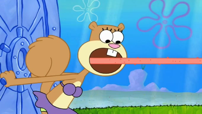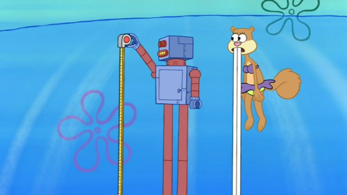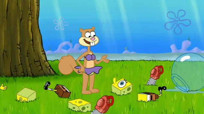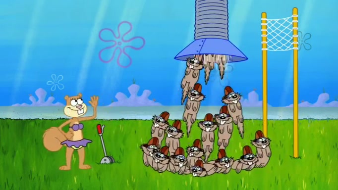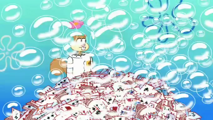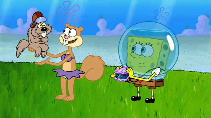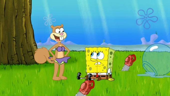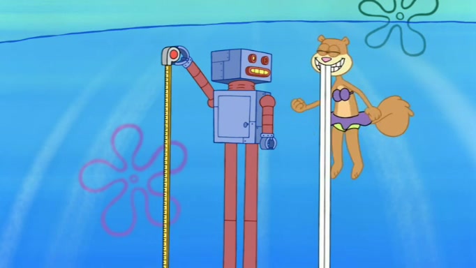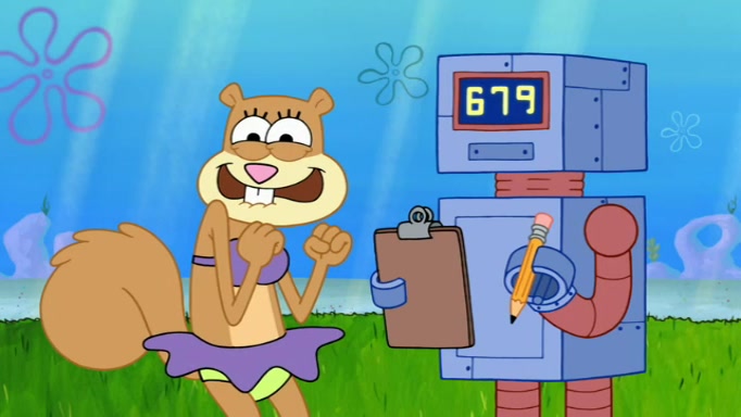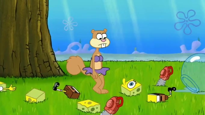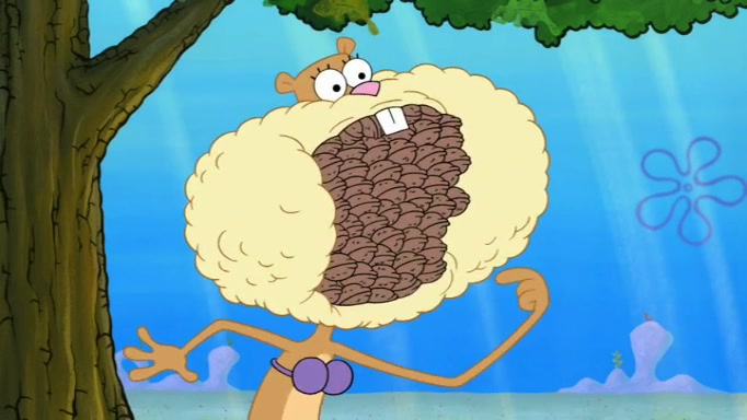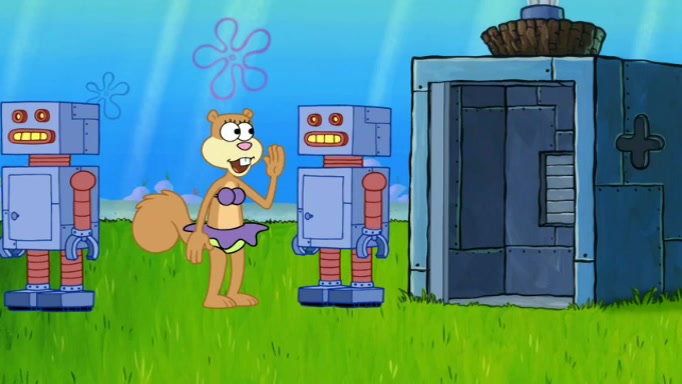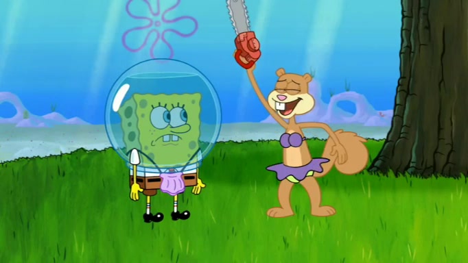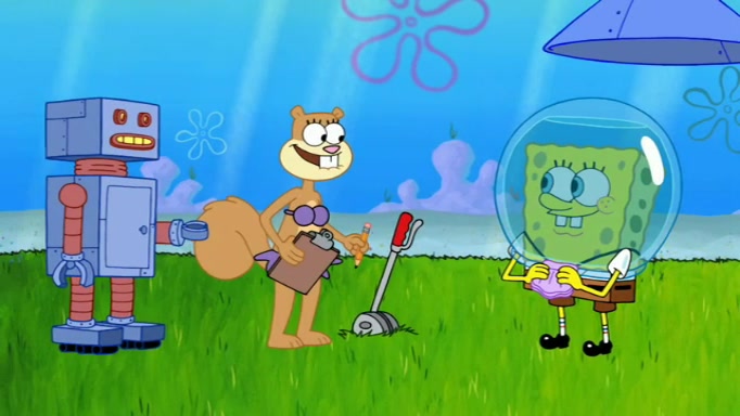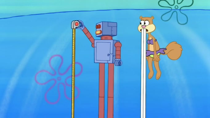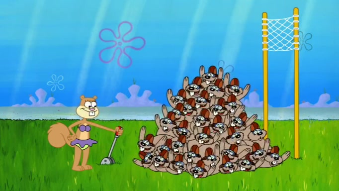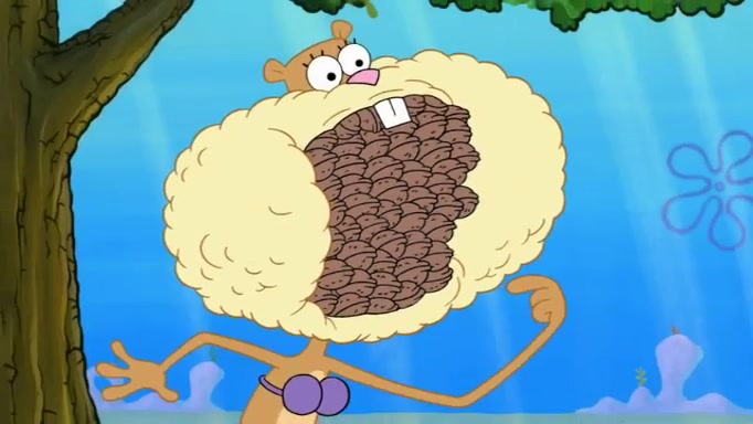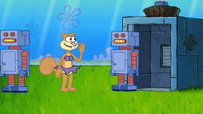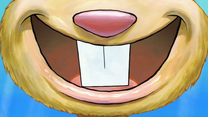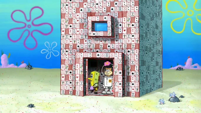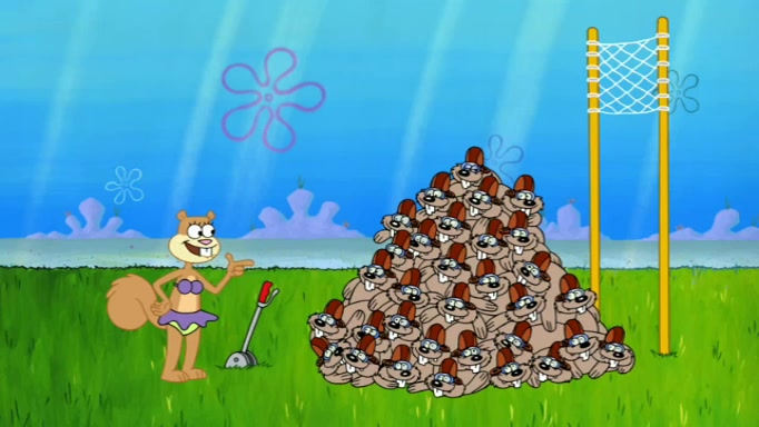 When SpongeBob returns, he sees Sandy's Treedome filled with a bunch of robots. Sandy comes up to SpongeBob and asks him to take a picture of her throwing a woodchuck to break the woodchuck chuckin' world record. SpongeBob takes the photo of Sandy throwing a woodchuck and she breaks the record. Sandy at that occasion sends the woodchucks back to where they belong. Afterwards, SpongeBob asks Sandy "What is all this?" Sandy explains that she had constructed many robots to help keep track of her records and with careful planning and precise delication of appropriate tasks so that she can manage the successful completion of the maximum number of records broken in the least amount of time. Sandy takes the picture of her throwing a woodchuck from SpongeBob and places it in the book. Sandy flips the page of the world records book to see what's next. The next record is the world's longest tooth. Sandy then asks one of the robots how the calcium fusion is going. The robot replies, "It is ready, Miss Cheeks." Sandy administers the shot and her tooth grows. It continues to grow until she hits her head on the ceiling of the treedome. The robot uses a tape measure and reaches 35 feet which breaks the record. SpongeBob takes a picture and tells Sandy to say "Cheese!" Sandy saws a giant part of the tooth off her top tooth and slides down. The next record is, spiciest chili gargle. So, Sandy gargles on chili as SpongeBob takes a picture. Sandy gulps the spicy chilly and breathes out fire at SpongeBob. The next record is largest rubber band ball. SpongeBob takes a picture of the large rubber band ball as Sandy lets go of it and SpongeBob gets crushed. The record after that is most cobras milked. SpongeBob takes a picture of Sandy milking the cobras. After that, the next record is most walnuts in mouth. Sandy gets a lot of walnuts in her mouth, SpongeBob takes a photo and Sandy spits out the walnuts. After that record, the next one is most chainsaws juggled. The scene cuts to Sandy juggling chainsaws with robots giving her more to juggle. SpongeBob takes a picture of her juggling the chainsaws and asks "How do you stop?" To answer his question, Sandy stops juggling chainsaws and then runs like heck. However, SpongeBob accidentally gets cut into pieces by chainsaws because he ran the wrong way. SpongeBob puts himself back together and says "It is getting kinda dangerous." Sandy then takes SpongeBob and herself outside the treedome and shows SpongeBob the world's largest house of cards. Sandy and SpongeBob go up to the top of the house of cards so that they can take a picture. Meanwhile, Patrick is walking along and sees the house of cards is made with Solitaire cards. Patrick comes back with a baseball bat and hits the house of cards causing the world's largest house of cards to collapse as SpongeBob and Sandy scream when they fall from the top. Thereupon, SpongeBob tells Sandy that he can smell Gary's sandbox and goes home to clean it.