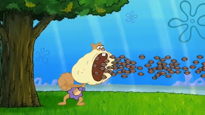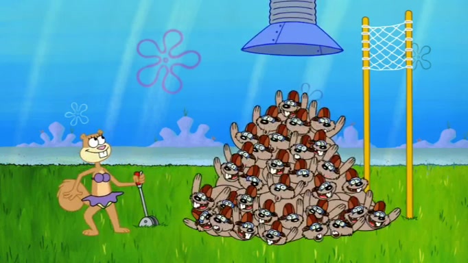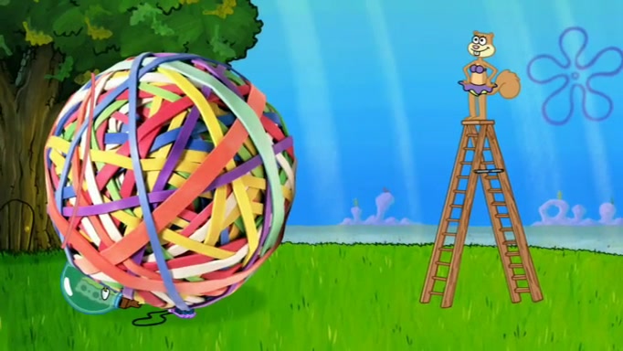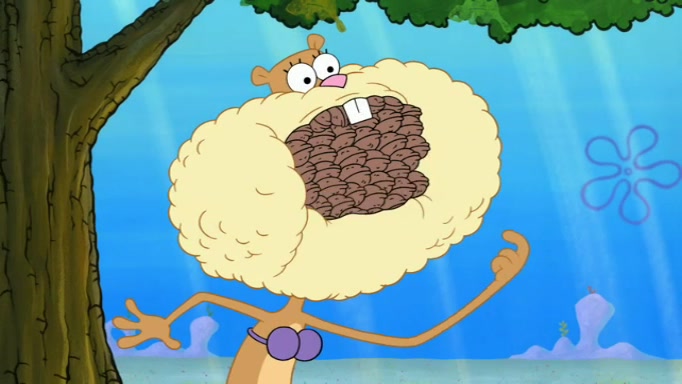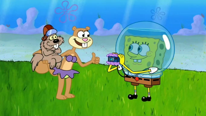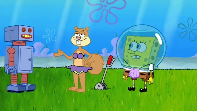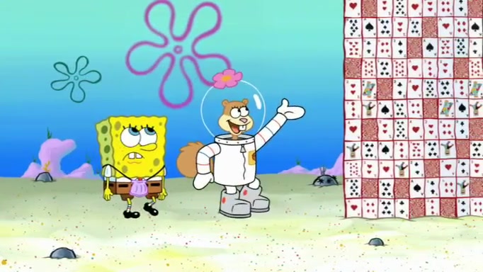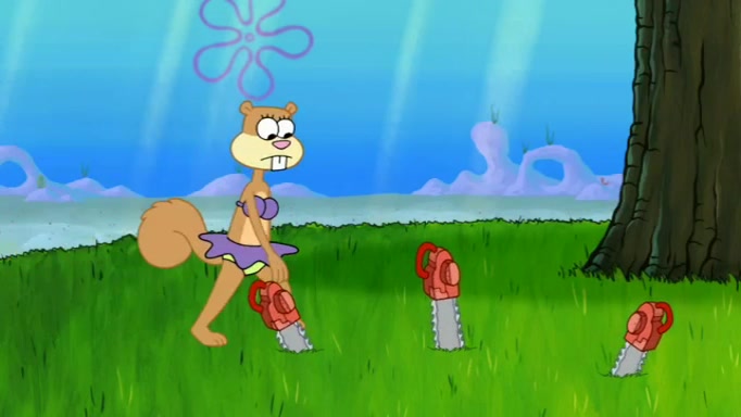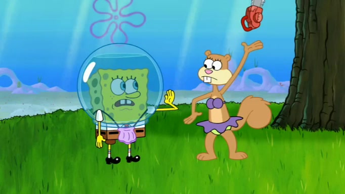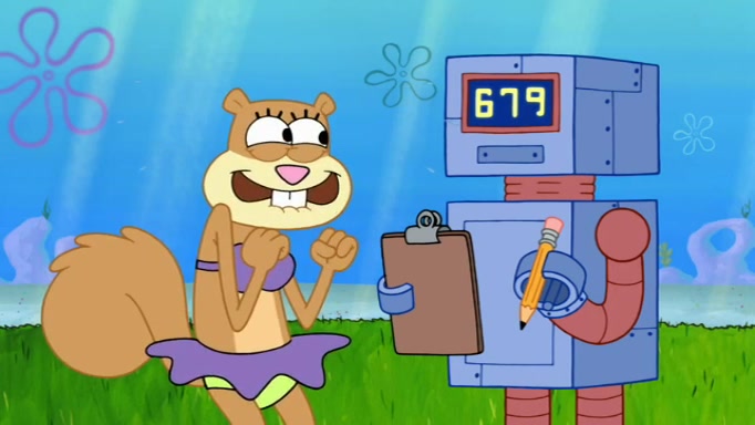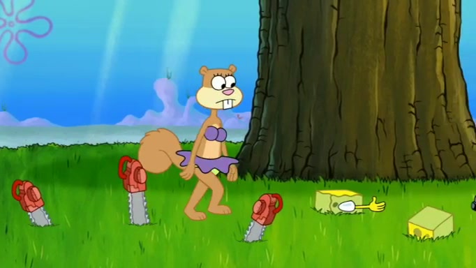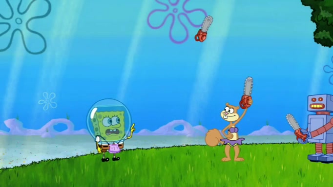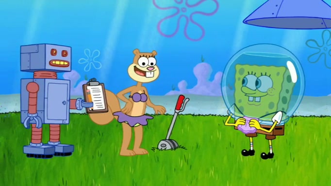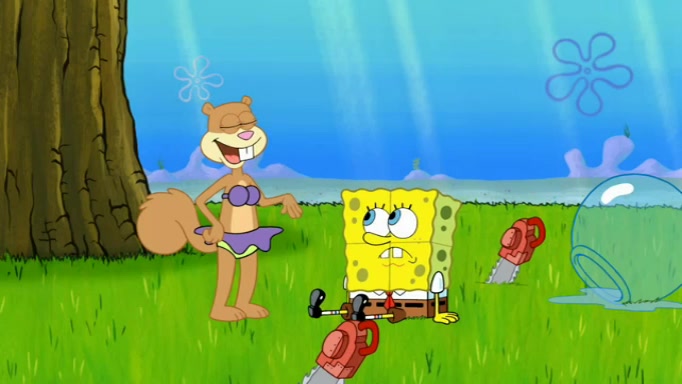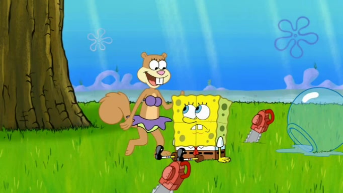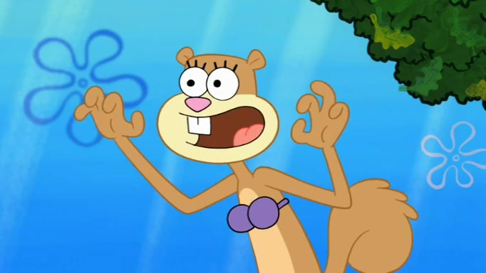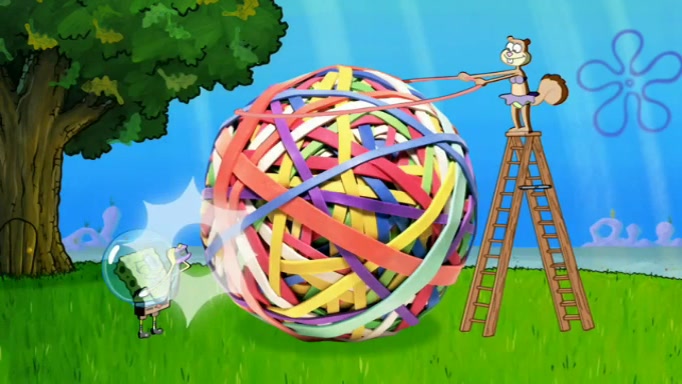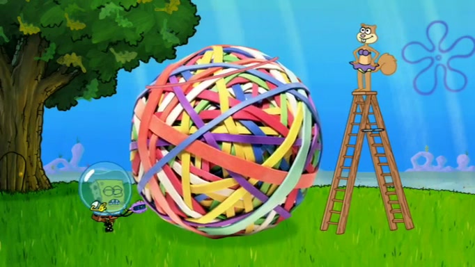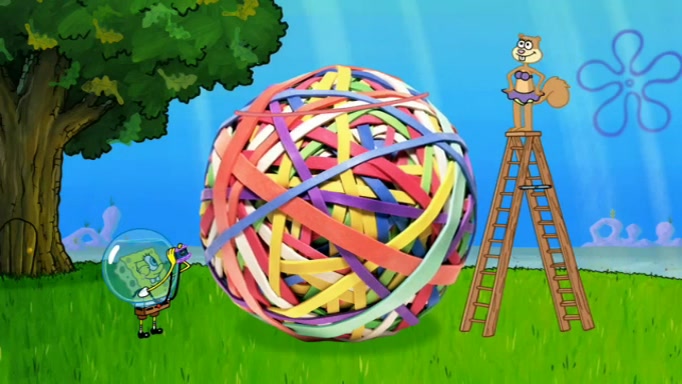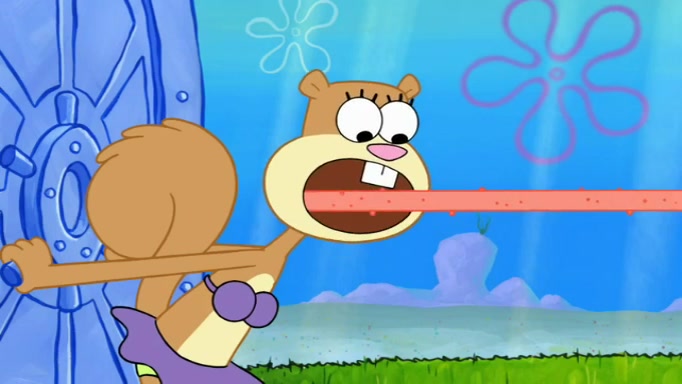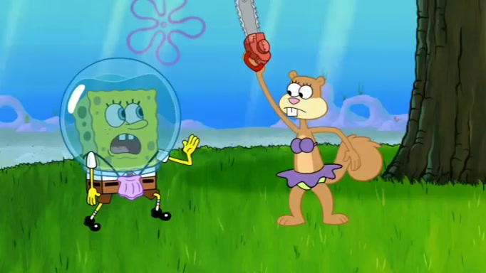When SpongeBob returns, he sees Sandy's Treedome filled with a bunch of robots. Sandy comes up to SpongeBob and asks him to take a picture of her throwing a woodchuck to break the woodchuck chuckin' world record. SpongeBob takes the photo of Sandy throwing a woodchuck and she breaks the record. Sandy at that occasion sends the woodchucks back to where they belong. Afterwards, SpongeBob asks Sandy "What is all this?" Sandy explains that she had constructed many robots to help keep track of her records and with careful planning and precise delication of appropriate tasks so that she can manage the successful completion of the maximum number of records broken in the least amount of time. Sandy takes the picture of her throwing a woodchuck from SpongeBob and places it in the book. Sandy flips the page of the world records book to see what's next. The next record is the world's longest tooth. Sandy then asks one of the robots how the calcium fusion is going. The robot replies, "It is ready, Miss Cheeks." Sandy administers the shot and her tooth grows. It continues to grow until she hits her head on the ceiling of the treedome. The robot uses a tape measure and reaches 35 feet which breaks the record. SpongeBob takes a picture and tells Sandy to say "Cheese!" Sandy saws a giant part of the tooth off her top tooth and slides down. The next record is, spiciest chili gargle. So, Sandy gargles on chili as SpongeBob takes a picture. Sandy gulps the spicy chilly and breathes out fire at SpongeBob. The next record is largest rubber band ball. SpongeBob takes a picture of the large rubber band ball as Sandy lets go of it and SpongeBob gets crushed. The record after that is most cobras milked. SpongeBob takes a picture of Sandy milking the cobras. After that, the next record is most walnuts in mouth. Sandy gets a lot of walnuts in her mouth, SpongeBob takes a photo and Sandy spits out the walnuts. After that record, the next one is most chainsaws juggled. The scene cuts to Sandy juggling chainsaws with robots giving her more to juggle. SpongeBob takes a picture of her juggling the chainsaws and asks "How do you stop?" To answer his question, Sandy stops juggling chainsaws and then runs like heck. However, SpongeBob accidentally gets cut into pieces by chainsaws because he ran the wrong way. SpongeBob puts himself back together and says "It is getting kinda dangerous." Sandy then takes SpongeBob and herself outside the treedome and shows SpongeBob the world's largest house of cards. Sandy and SpongeBob go up to the top of the house of cards so that they can take a picture. Meanwhile, Patrick is walking along and sees the house of cards is made with Solitaire cards. Patrick comes back with a baseball bat and hits the house of cards causing the world's largest house of cards to collapse as SpongeBob and Sandy scream when they fall from the top. Thereupon, SpongeBob tells Sandy that he can smell Gary's sandbox and goes home to clean it.