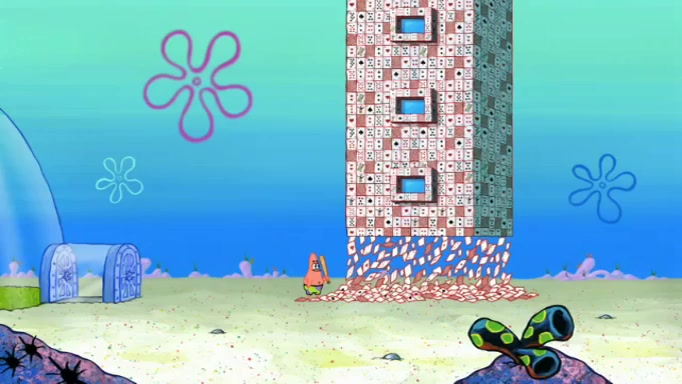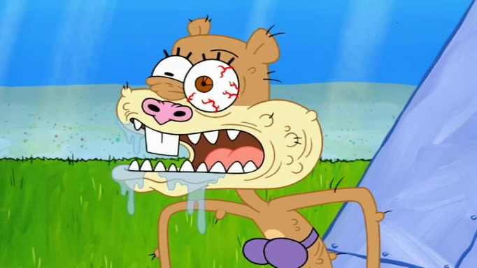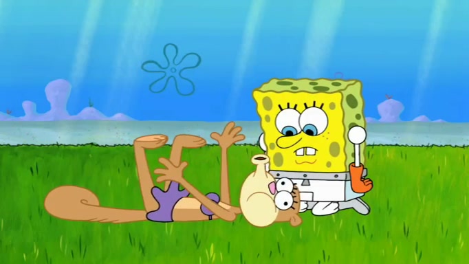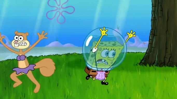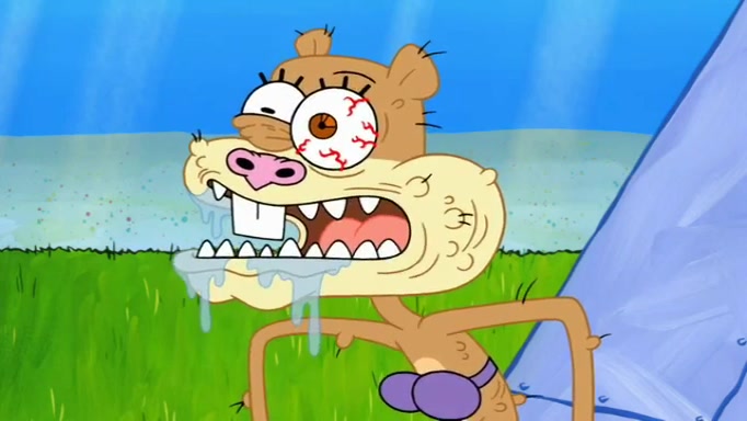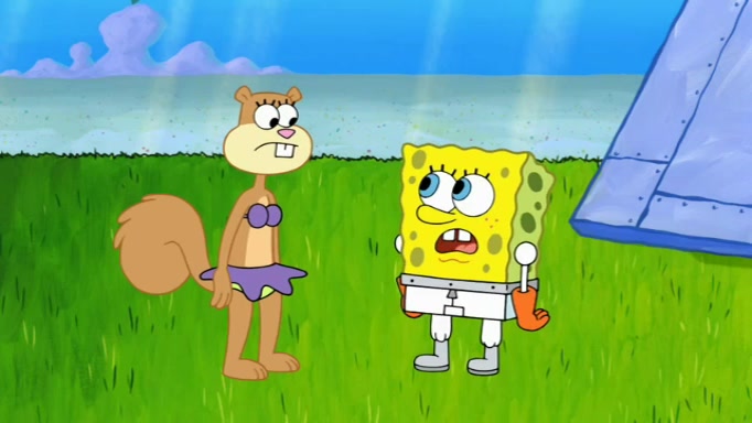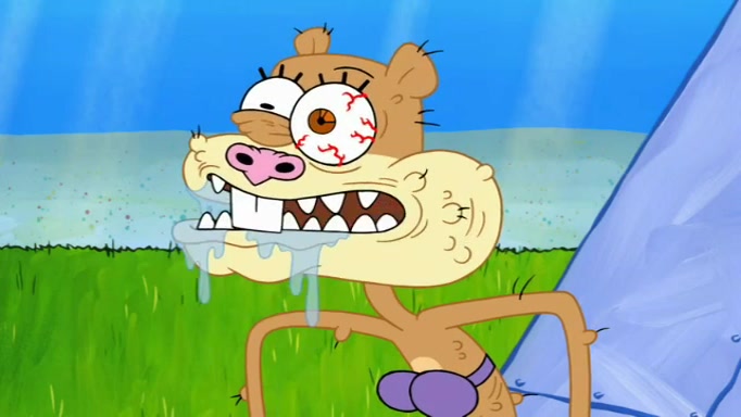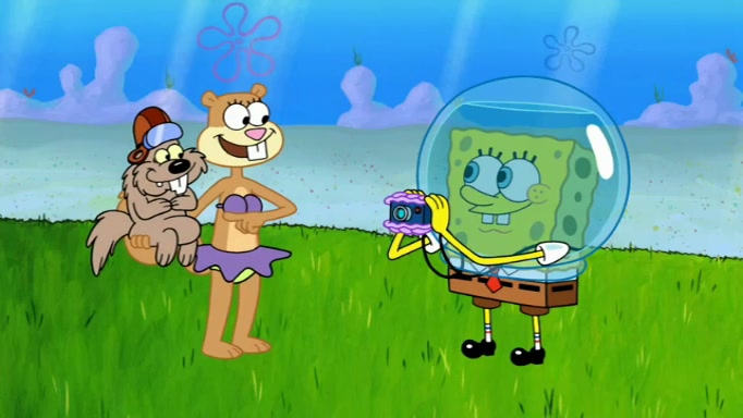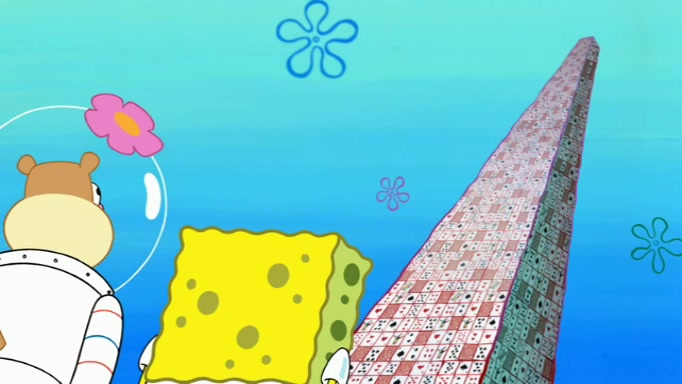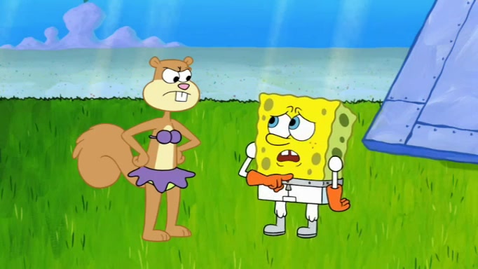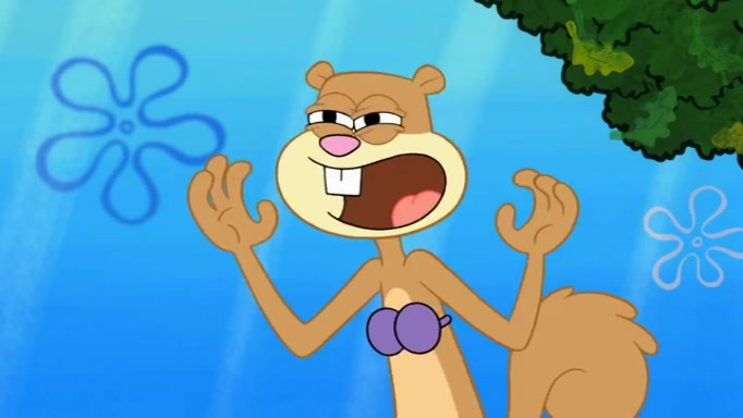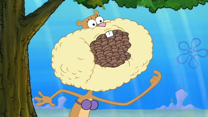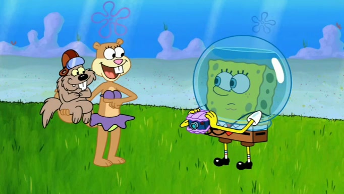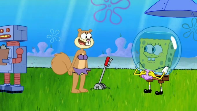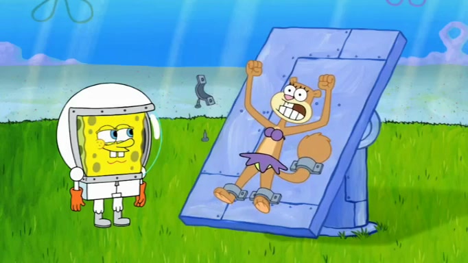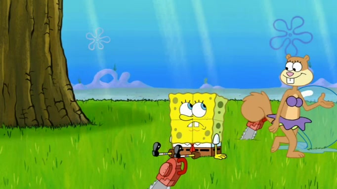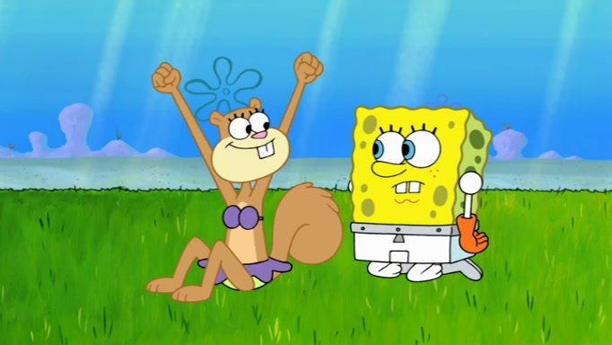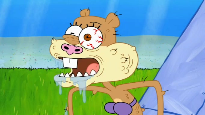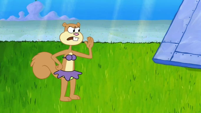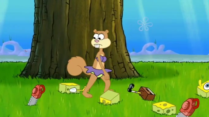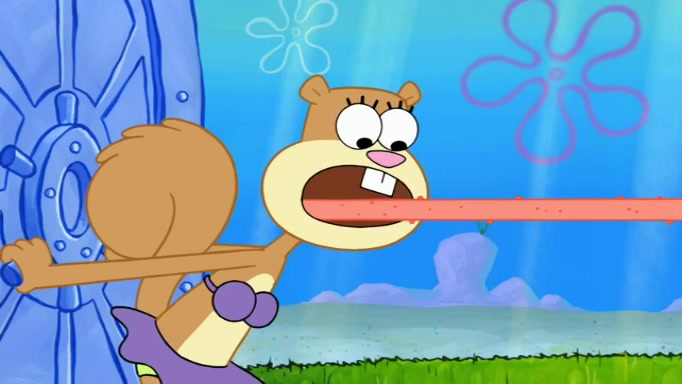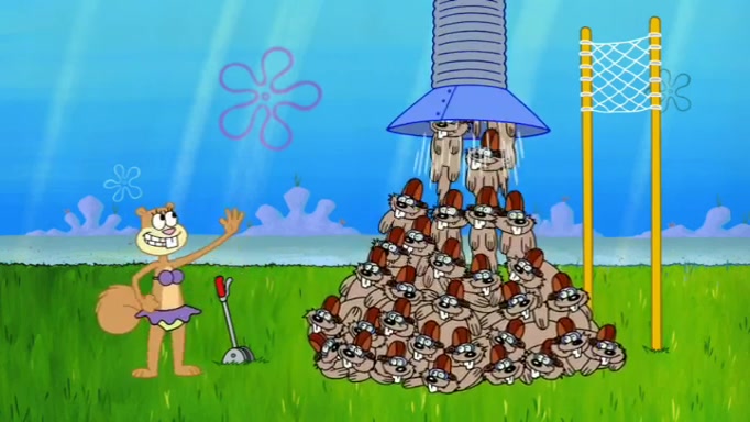 When SpongeBob returns, he sees Sandy's Treedome filled with a bunch of robots. Sandy comes up to SpongeBob and asks him to take a picture of her throwing a woodchuck to break the woodchuck chuckin' world record. SpongeBob takes the photo of Sandy throwing a woodchuck and she breaks the record. Sandy at that occasion sends the woodchucks back to where they belong. Afterwards, SpongeBob asks Sandy "What is all this?" Sandy explains that she had constructed many robots to help keep track of her records and with careful planning and precise delication of appropriate tasks so that she can manage the successful completion of the maximum number of records broken in the least amount of time. Sandy takes the picture of her throwing a woodchuck from SpongeBob and places it in the book. Sandy flips the page of the world records book to see what's next. The next record is the world's longest tooth. Sandy then asks one of the robots how the calcium fusion is going. The robot replies, "It is ready, Miss Cheeks." Sandy administers the shot and her tooth grows. It continues to grow until she hits her head on the ceiling of the treedome. The robot uses a tape measure and reaches 35 feet which breaks the record. SpongeBob takes a picture and tells Sandy to say "Cheese!" Sandy saws a giant part of the tooth off her top tooth and slides down. The next record is, spiciest chili gargle. So, Sandy gargles on chili as SpongeBob takes a picture. Sandy gulps the spicy chilly and breathes out fire at SpongeBob. The next record is largest rubber band ball. SpongeBob takes a picture of the large rubber band ball as Sandy lets go of it and SpongeBob gets crushed. The record after that is most cobras milked. SpongeBob takes a picture of Sandy milking the cobras. After that, the next record is most walnuts in mouth. Sandy gets a lot of walnuts in her mouth, SpongeBob takes a photo and Sandy spits out the walnuts. After that record, the next one is most chainsaws juggled. The scene cuts to Sandy juggling chainsaws with robots giving her more to juggle. SpongeBob takes a picture of her juggling the chainsaws and asks "How do you stop?" To answer his question, Sandy stops juggling chainsaws and then runs like heck. However, SpongeBob accidentally gets cut into pieces by chainsaws because he ran the wrong way. SpongeBob puts himself back together and says "It is getting kinda dangerous." Sandy then takes SpongeBob and herself outside the treedome and shows SpongeBob the world's largest house of cards. Sandy and SpongeBob go up to the top of the house of cards so that they can take a picture. Meanwhile, Patrick is walking along and sees the house of cards is made with Solitaire cards. Patrick comes back with a baseball bat and hits the house of cards causing the world's largest house of cards to collapse as SpongeBob and Sandy scream when they fall from the top. Thereupon, SpongeBob tells Sandy that he can smell Gary's sandbox and goes home to clean it.