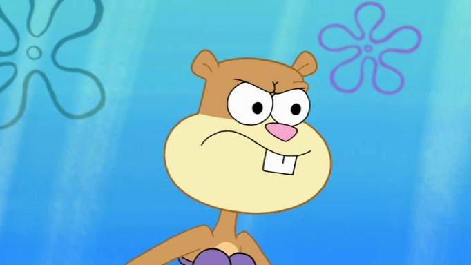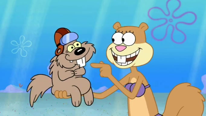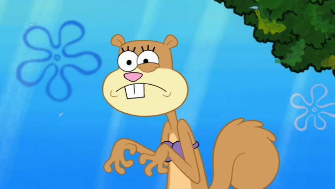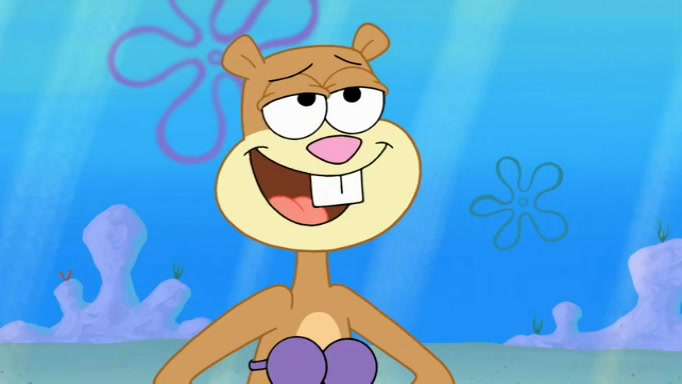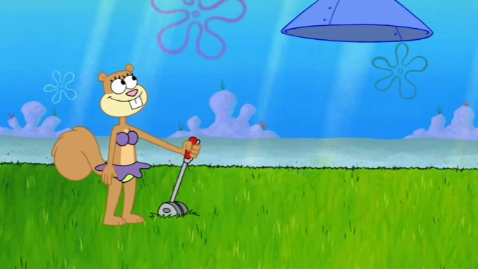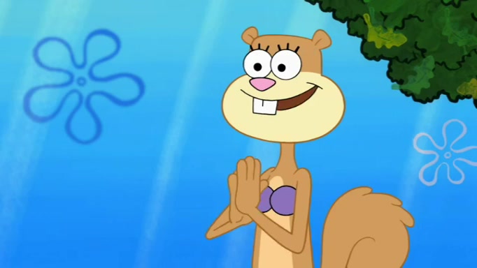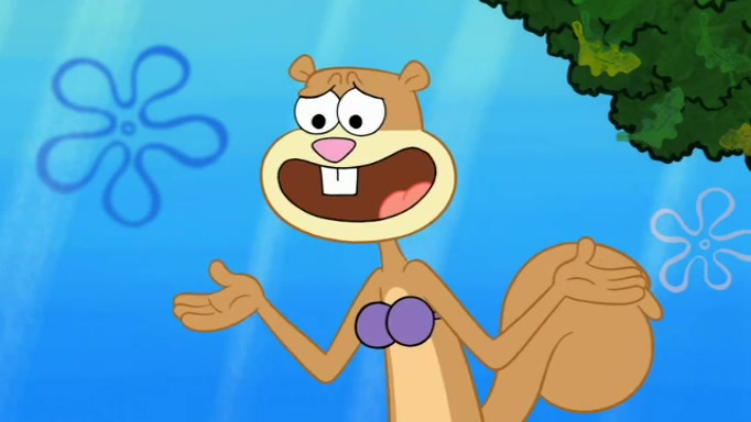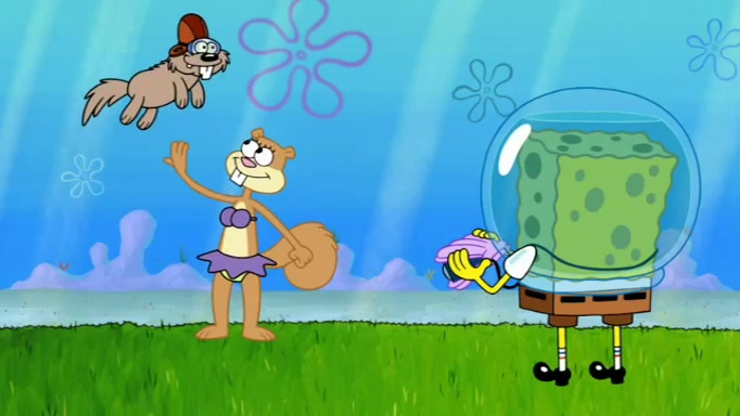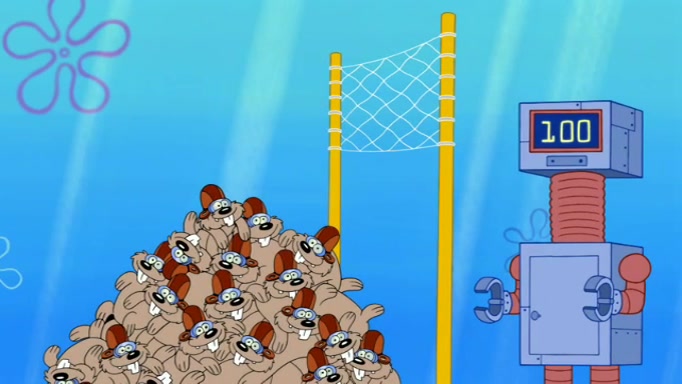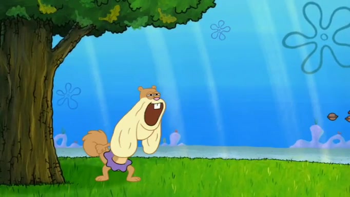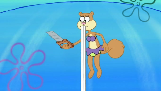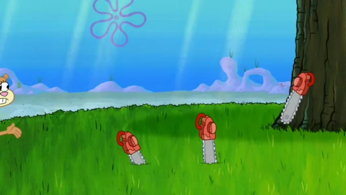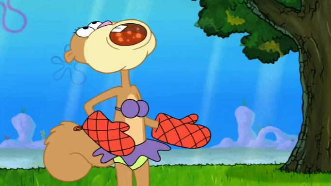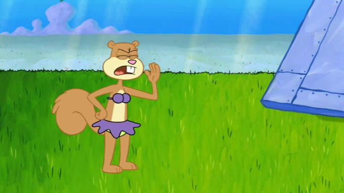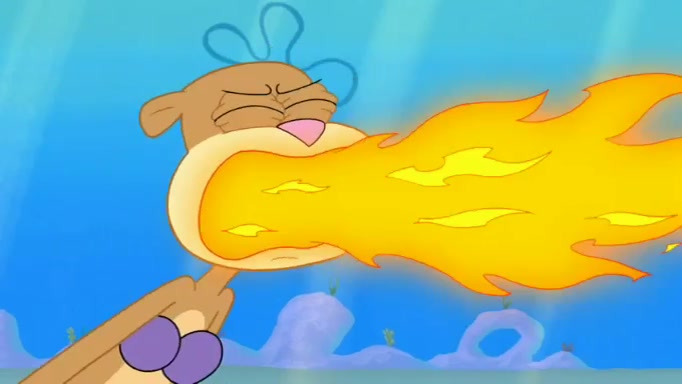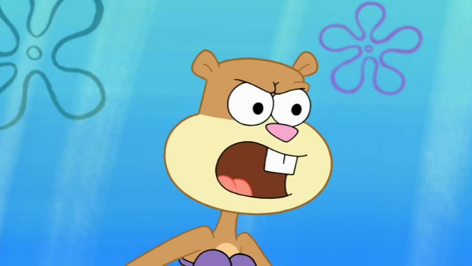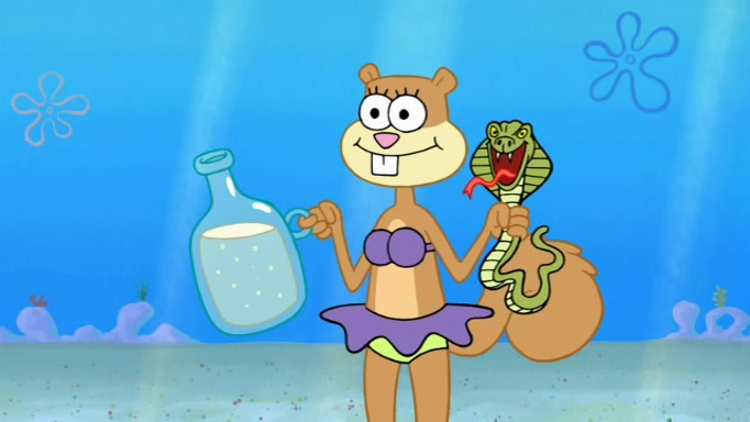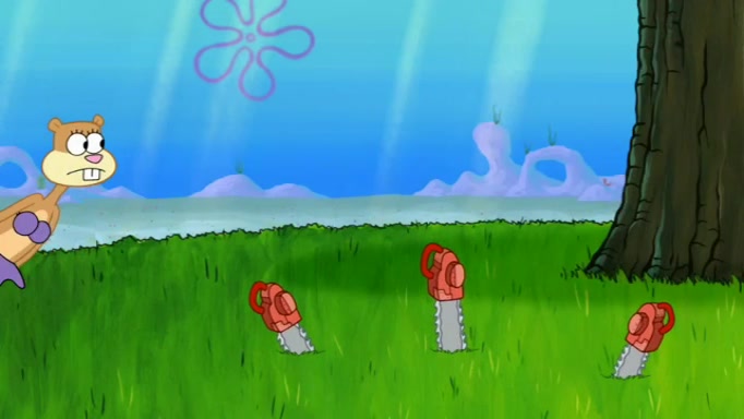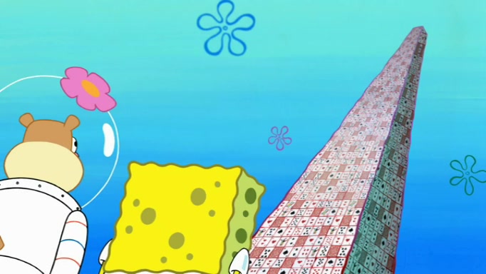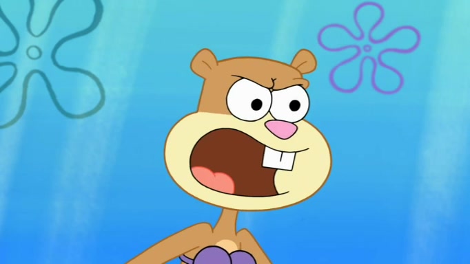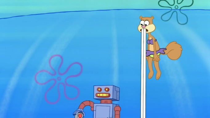 When SpongeBob returns, he sees Sandy's Treedome filled with a bunch of robots. Sandy comes up to SpongeBob and asks him to take a picture of her throwing a woodchuck to break the woodchuck chuckin' world record. SpongeBob takes the photo of Sandy throwing a woodchuck and she breaks the record. Sandy at that occasion sends the woodchucks back to where they belong. Afterwards, SpongeBob asks Sandy "What is all this?" Sandy explains that she had constructed many robots to help keep track of her records and with careful planning and precise delication of appropriate tasks so that she can manage the successful completion of the maximum number of records broken in the least amount of time. Sandy takes the picture of her throwing a woodchuck from SpongeBob and places it in the book. Sandy flips the page of the world records book to see what's next. The next record is the world's longest tooth. Sandy then asks one of the robots how the calcium fusion is going. The robot replies, "It is ready, Miss Cheeks." Sandy administers the shot and her tooth grows. It continues to grow until she hits her head on the ceiling of the treedome. The robot uses a tape measure and reaches 35 feet which breaks the record. SpongeBob takes a picture and tells Sandy to say "Cheese!" Sandy saws a giant part of the tooth off her top tooth and slides down. The next record is, spiciest chili gargle. So, Sandy gargles on chili as SpongeBob takes a picture. Sandy gulps the spicy chilly and breathes out fire at SpongeBob. The next record is largest rubber band ball. SpongeBob takes a picture of the large rubber band ball as Sandy lets go of it and SpongeBob gets crushed. The record after that is most cobras milked. SpongeBob takes a picture of Sandy milking the cobras. After that, the next record is most walnuts in mouth. Sandy gets a lot of walnuts in her mouth, SpongeBob takes a photo and Sandy spits out the walnuts. After that record, the next one is most chainsaws juggled. The scene cuts to Sandy juggling chainsaws with robots giving her more to juggle. SpongeBob takes a picture of her juggling the chainsaws and asks "How do you stop?" To answer his question, Sandy stops juggling chainsaws and then runs like heck. However, SpongeBob accidentally gets cut into pieces by chainsaws because he ran the wrong way. SpongeBob puts himself back together and says "It is getting kinda dangerous." Sandy then takes SpongeBob and herself outside the treedome and shows SpongeBob the world's largest house of cards. Sandy and SpongeBob go up to the top of the house of cards so that they can take a picture. Meanwhile, Patrick is walking along and sees the house of cards is made with Solitaire cards. Patrick comes back with a baseball bat and hits the house of cards causing the world's largest house of cards to collapse as SpongeBob and Sandy scream when they fall from the top. Thereupon, SpongeBob tells Sandy that he can smell Gary's sandbox and goes home to clean it.