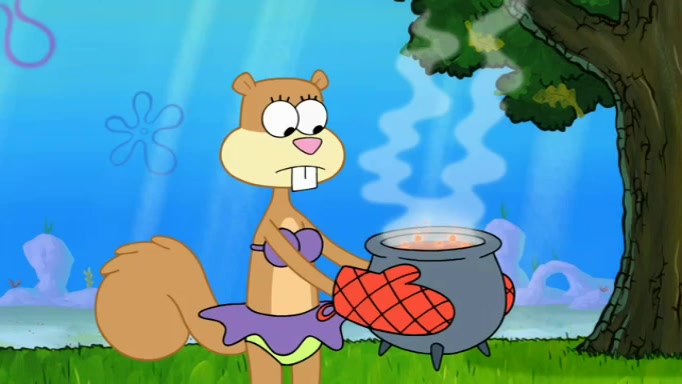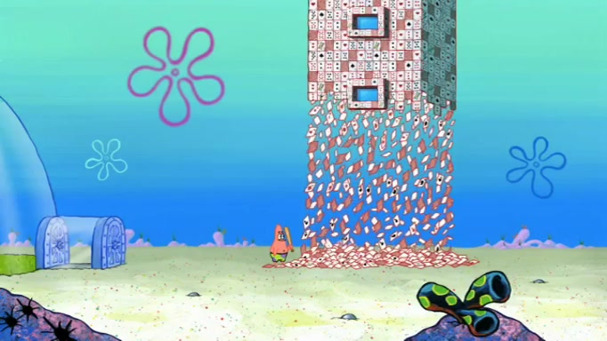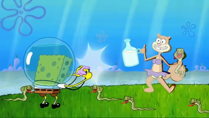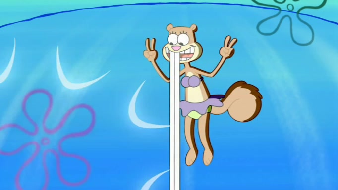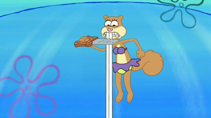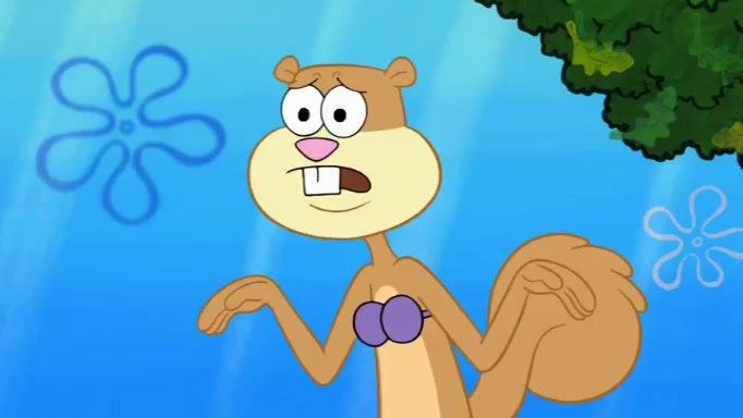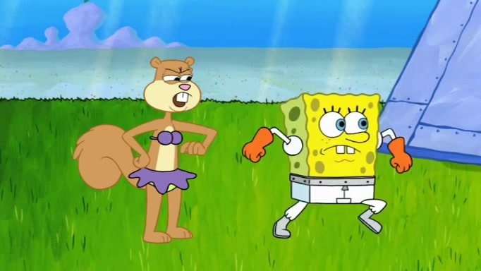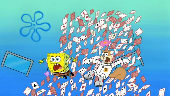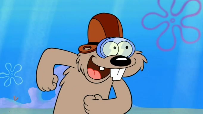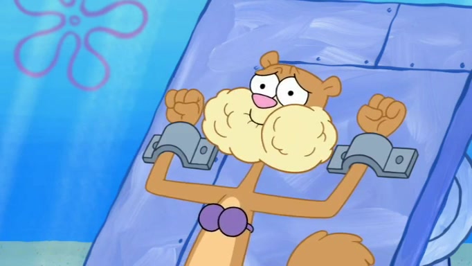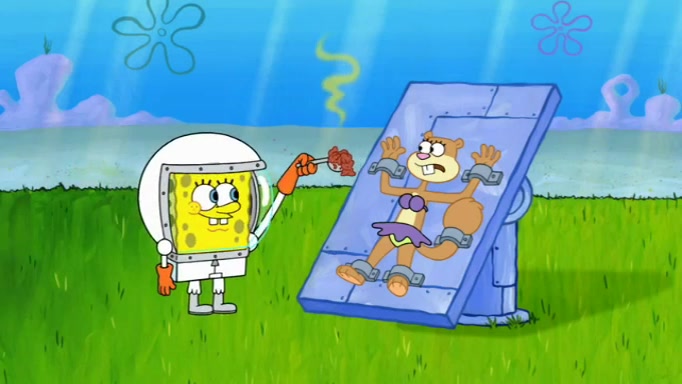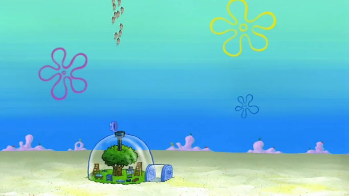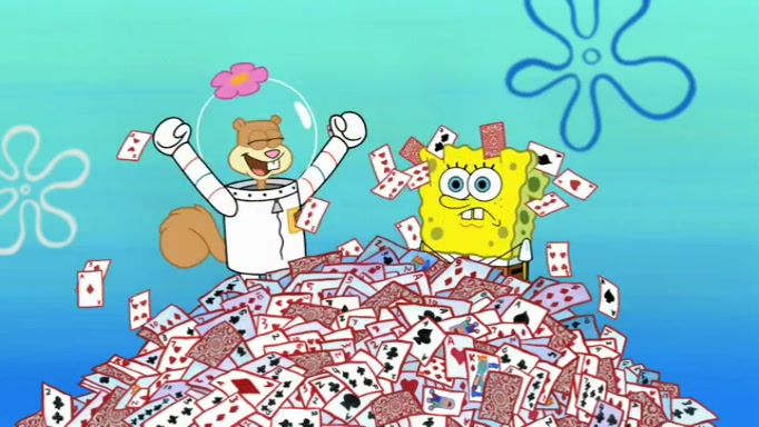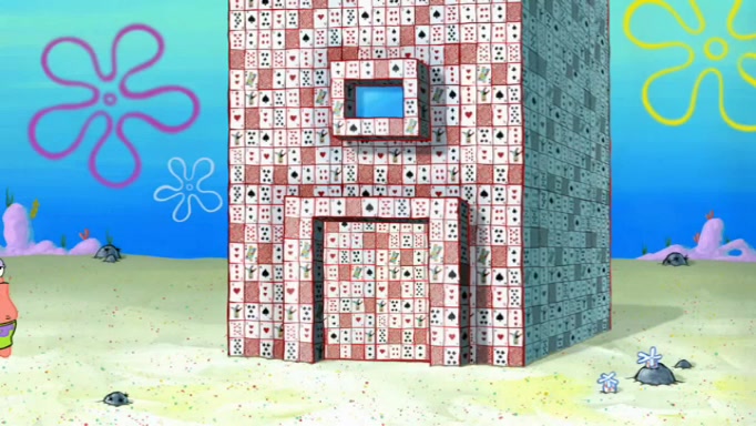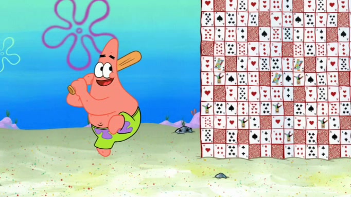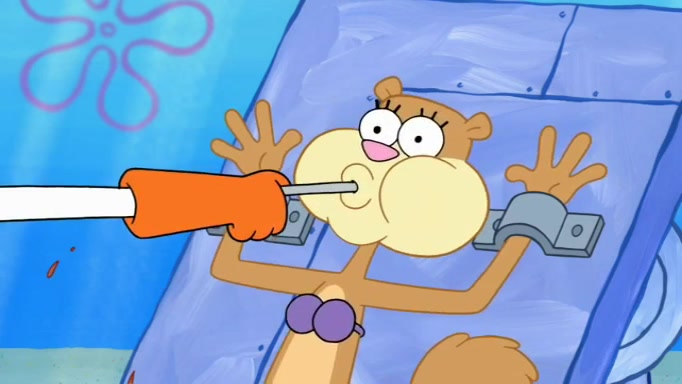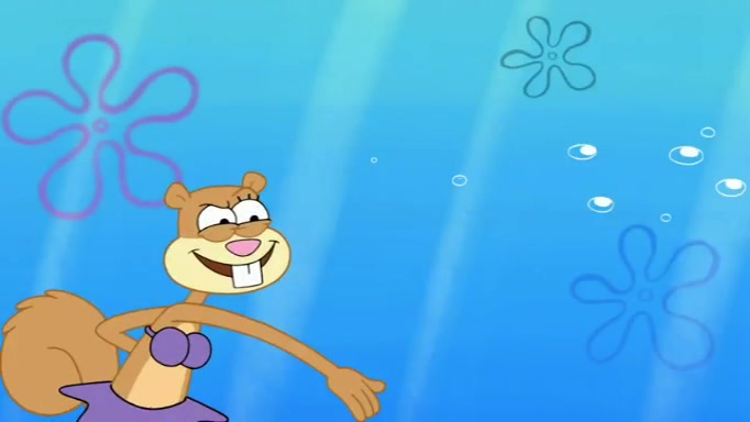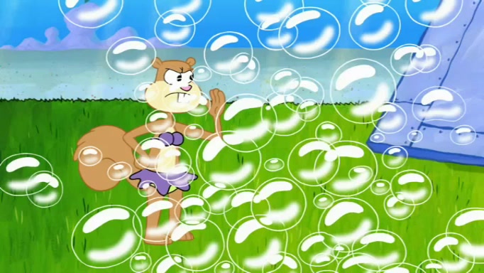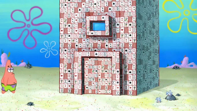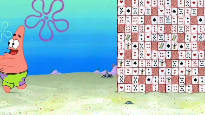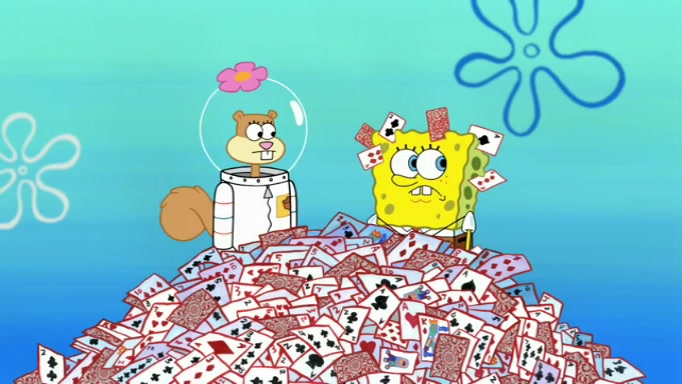 When SpongeBob returns, he sees Sandy's Treedome filled with a bunch of robots. Sandy comes up to SpongeBob and asks him to take a picture of her throwing a woodchuck to break the woodchuck chuckin' world record. SpongeBob takes the photo of Sandy throwing a woodchuck and she breaks the record. Sandy at that occasion sends the woodchucks back to where they belong. Afterwards, SpongeBob asks Sandy "What is all this?" Sandy explains that she had constructed many robots to help keep track of her records and with careful planning and precise delication of appropriate tasks so that she can manage the successful completion of the maximum number of records broken in the least amount of time. Sandy takes the picture of her throwing a woodchuck from SpongeBob and places it in the book. Sandy flips the page of the world records book to see what's next. The next record is the world's longest tooth. Sandy then asks one of the robots how the calcium fusion is going. The robot replies, "It is ready, Miss Cheeks." Sandy administers the shot and her tooth grows. It continues to grow until she hits her head on the ceiling of the treedome. The robot uses a tape measure and reaches 35 feet which breaks the record. SpongeBob takes a picture and tells Sandy to say "Cheese!" Sandy saws a giant part of the tooth off her top tooth and slides down. The next record is, spiciest chili gargle. So, Sandy gargles on chili as SpongeBob takes a picture. Sandy gulps the spicy chilly and breathes out fire at SpongeBob. The next record is largest rubber band ball. SpongeBob takes a picture of the large rubber band ball as Sandy lets go of it and SpongeBob gets crushed. The record after that is most cobras milked. SpongeBob takes a picture of Sandy milking the cobras. After that, the next record is most walnuts in mouth. Sandy gets a lot of walnuts in her mouth, SpongeBob takes a photo and Sandy spits out the walnuts. After that record, the next one is most chainsaws juggled. The scene cuts to Sandy juggling chainsaws with robots giving her more to juggle. SpongeBob takes a picture of her juggling the chainsaws and asks "How do you stop?" To answer his question, Sandy stops juggling chainsaws and then runs like heck. However, SpongeBob accidentally gets cut into pieces by chainsaws because he ran the wrong way. SpongeBob puts himself back together and says "It is getting kinda dangerous." Sandy then takes SpongeBob and herself outside the treedome and shows SpongeBob the world's largest house of cards. Sandy and SpongeBob go up to the top of the house of cards so that they can take a picture. Meanwhile, Patrick is walking along and sees the house of cards is made with Solitaire cards. Patrick comes back with a baseball bat and hits the house of cards causing the world's largest house of cards to collapse as SpongeBob and Sandy scream when they fall from the top. Thereupon, SpongeBob tells Sandy that he can smell Gary's sandbox and goes home to clean it.