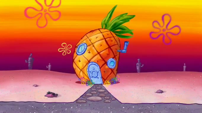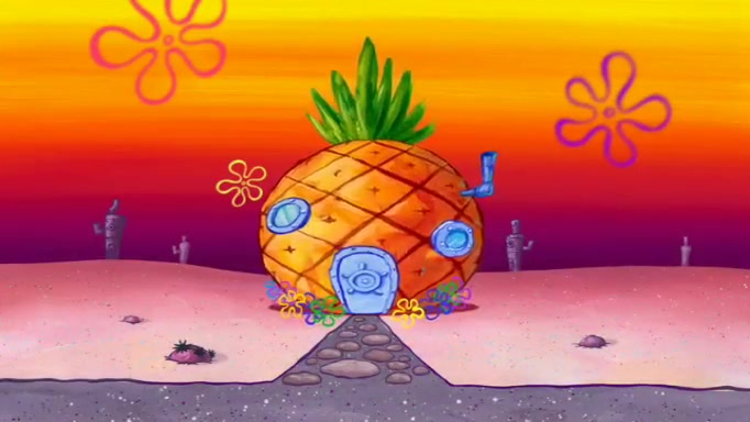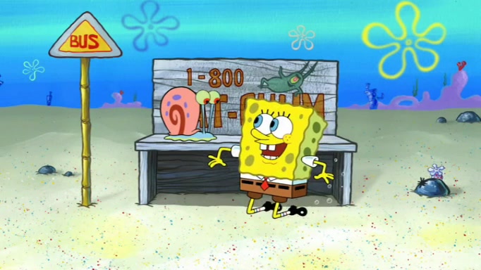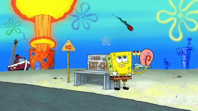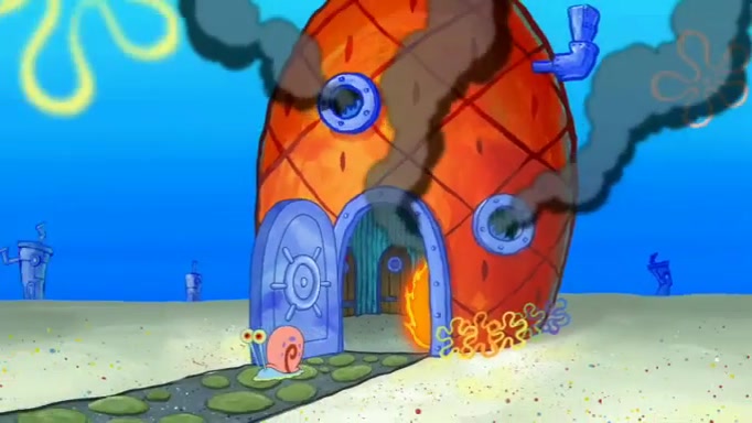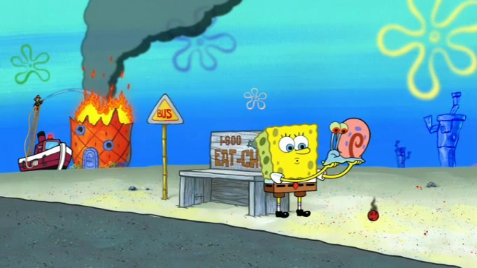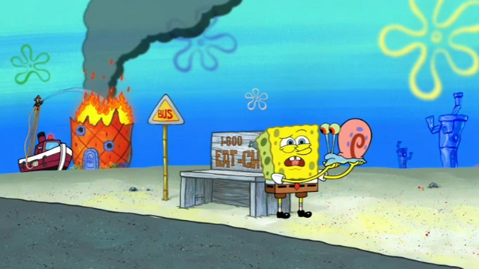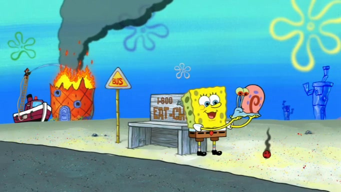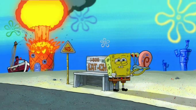 He makes it outside and SpongeBob is laying under a bus bench, still sadden about Gary's choice. He then notices Gary on the bus bench, happy that Gary decided to choose him. SpongeBob's house explodes and is set on fire and the red ball flies out beside them with SpongeBob saying, "Hey look, isn't that your ball?" Gary viciously hisses at it.