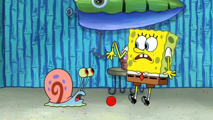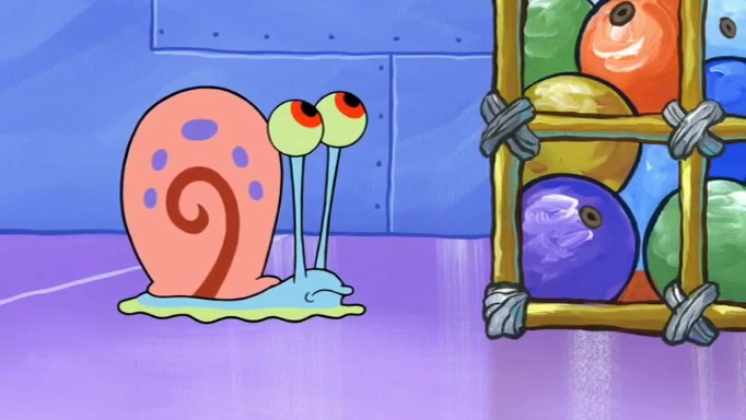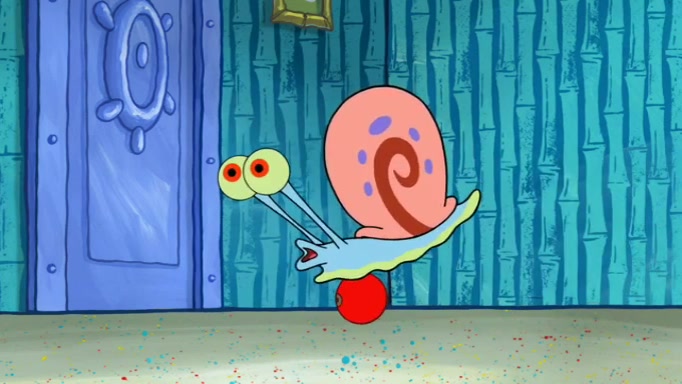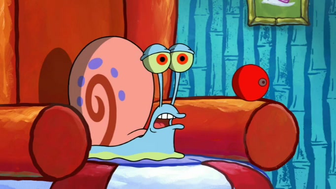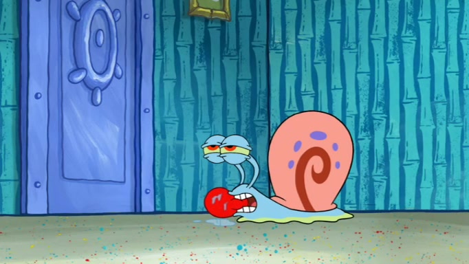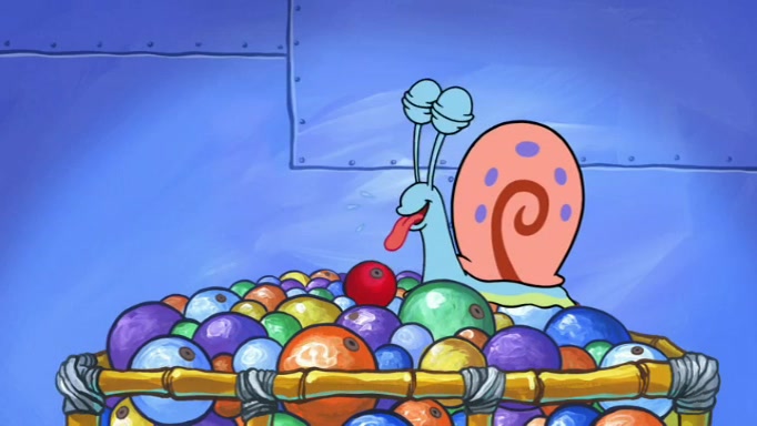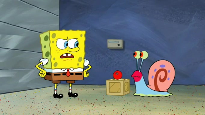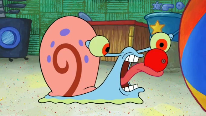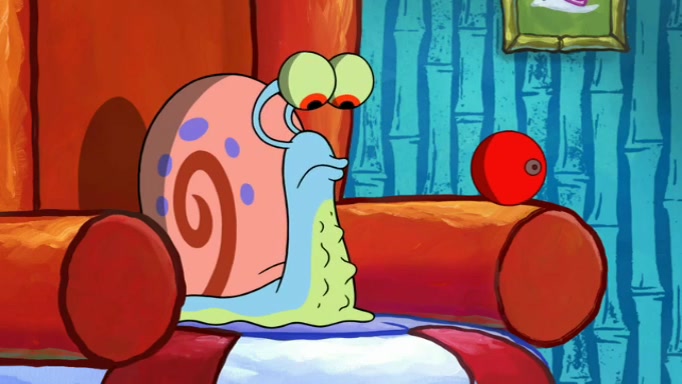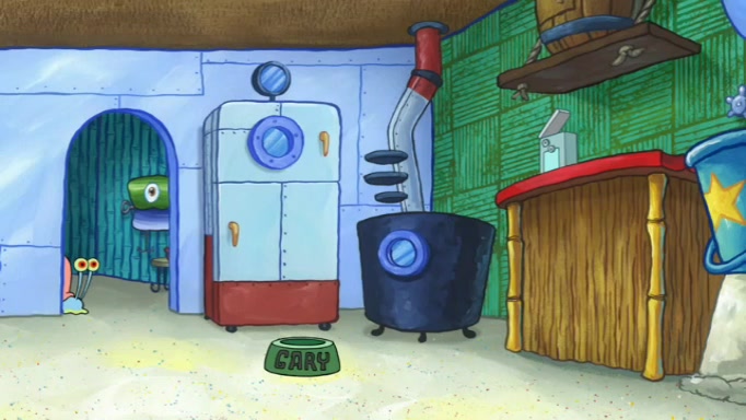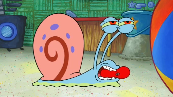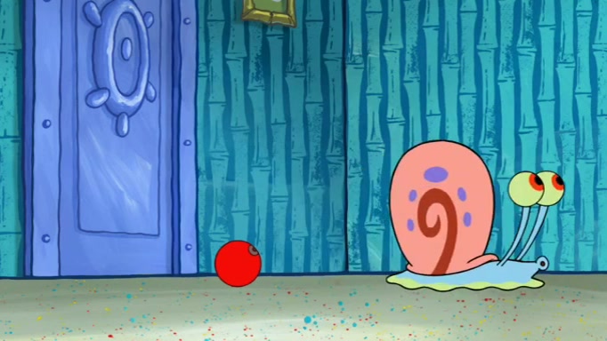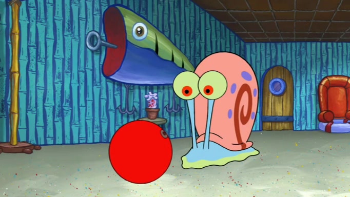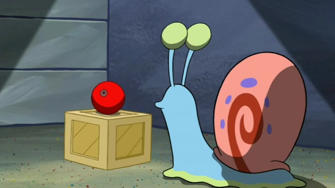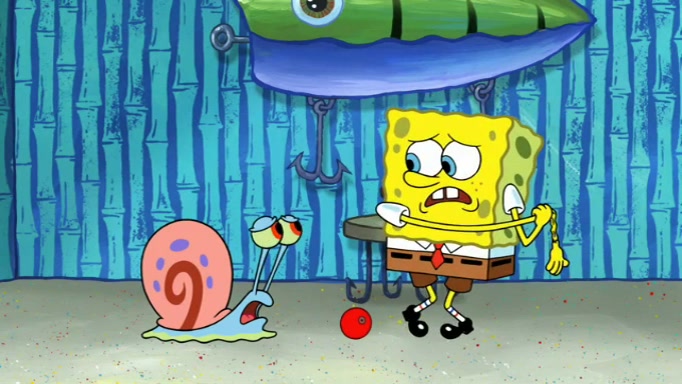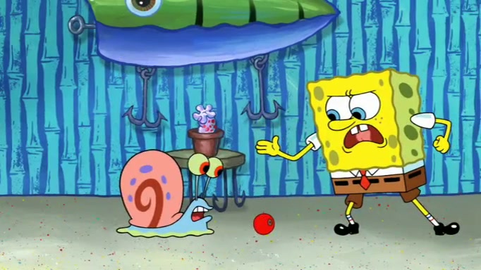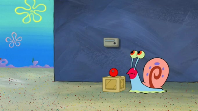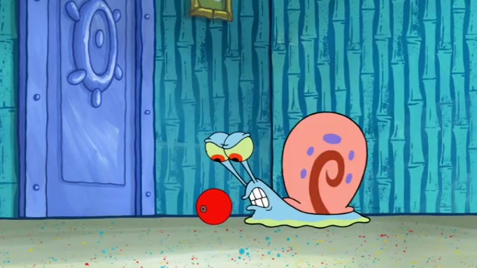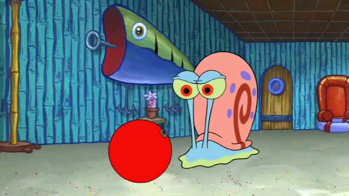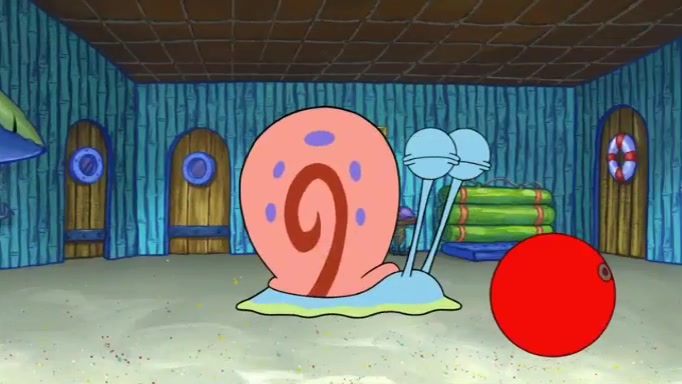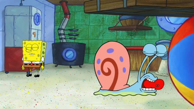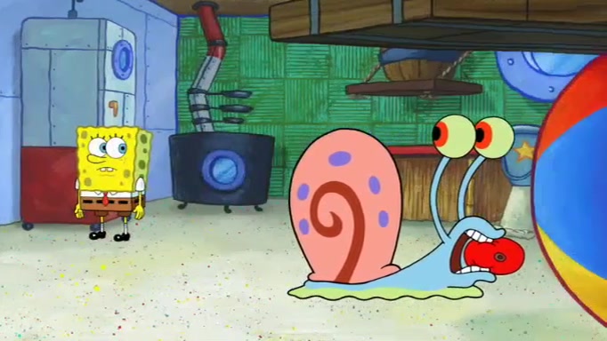 SpongeBob, thinking Gary loves the red ball more than him, decides to lure him out with snail food. He goes into the garage and notices Gary with lipstick, which he finds creepy, SpongeBob tells Gary that he needs to spend some time away from that ball, but Gary hits the garage door button, causing SpongeBob to be lifted up and crushed on the ceiling.