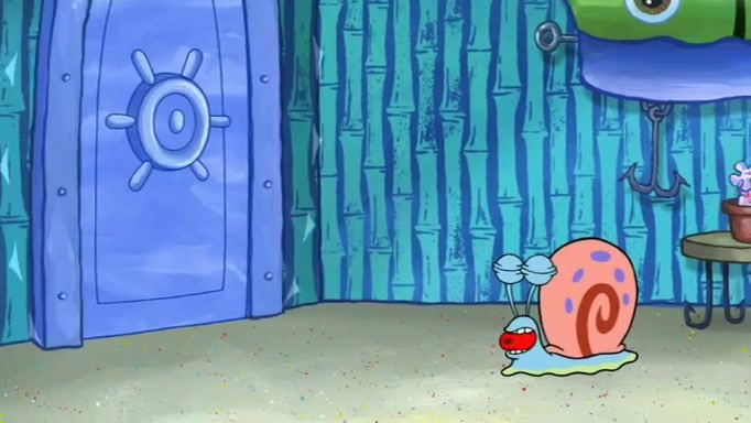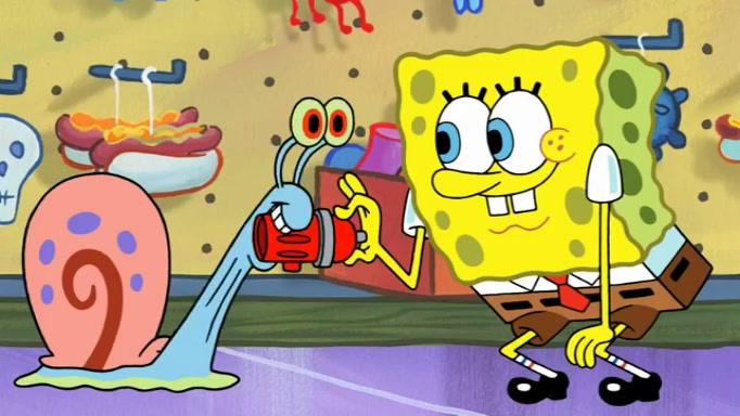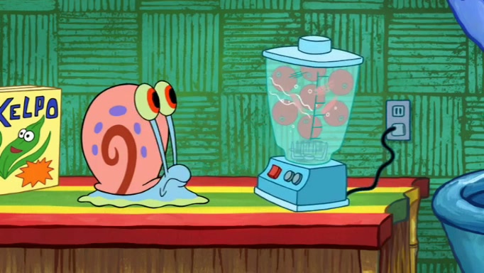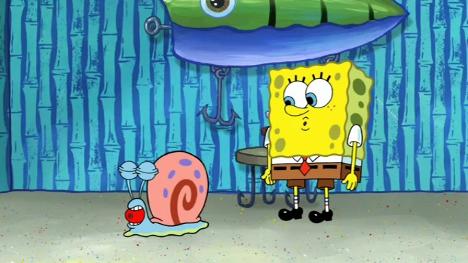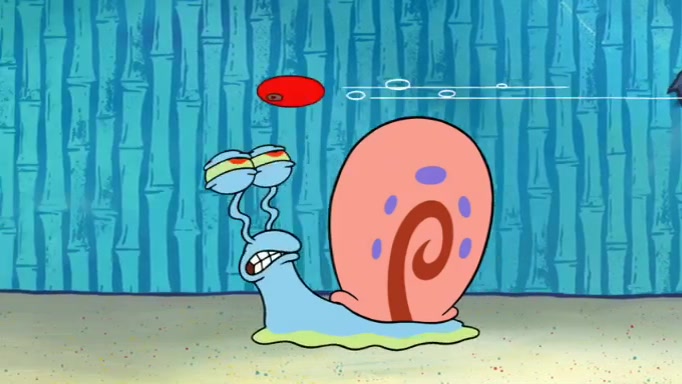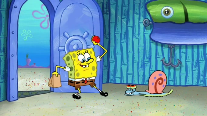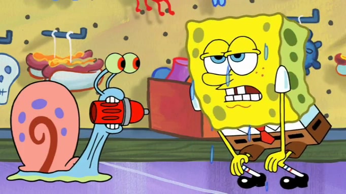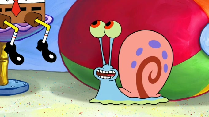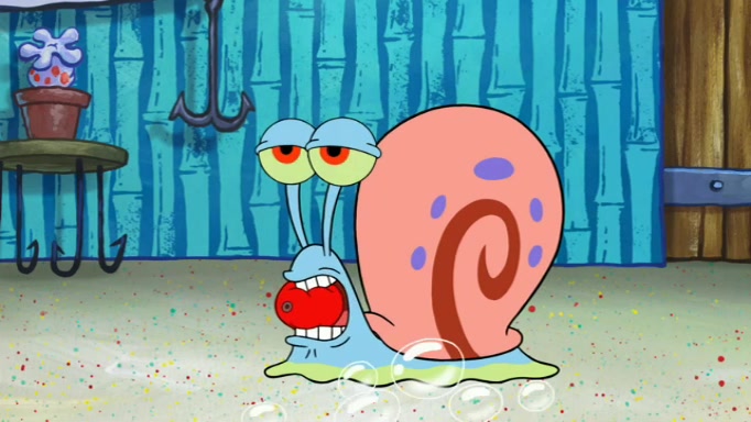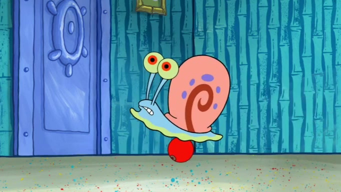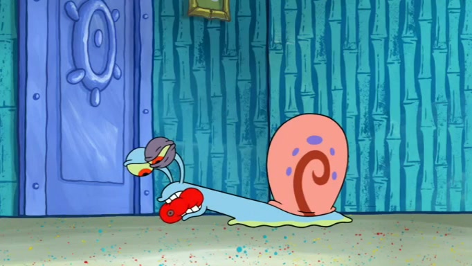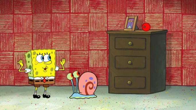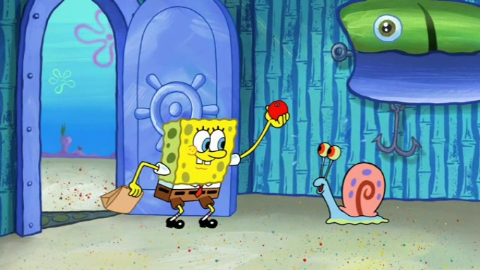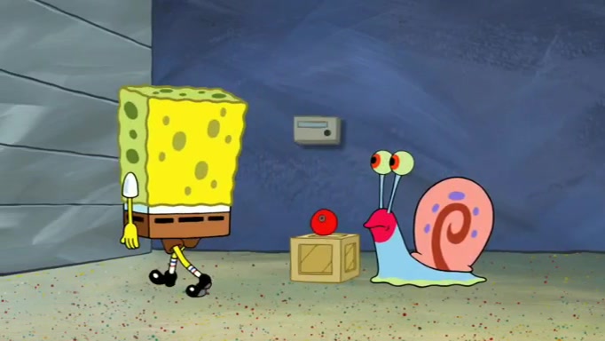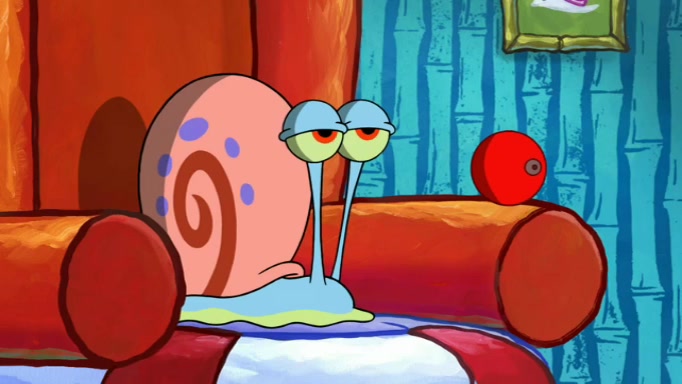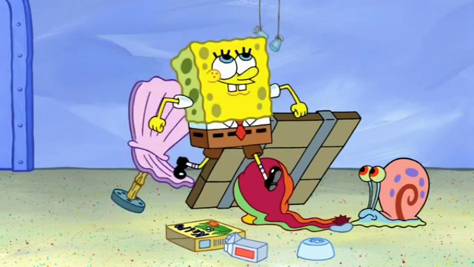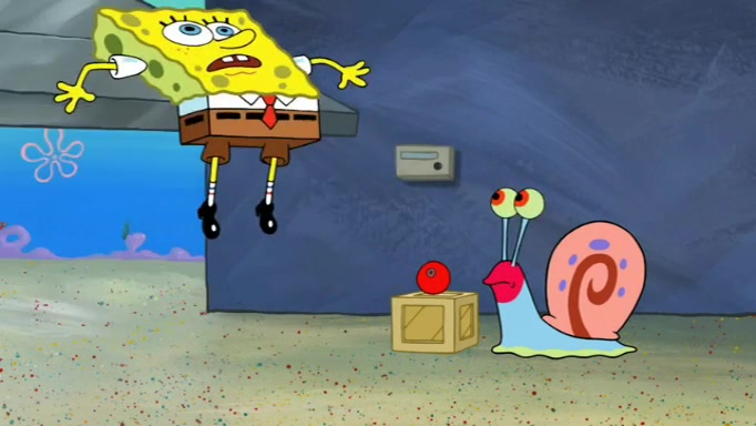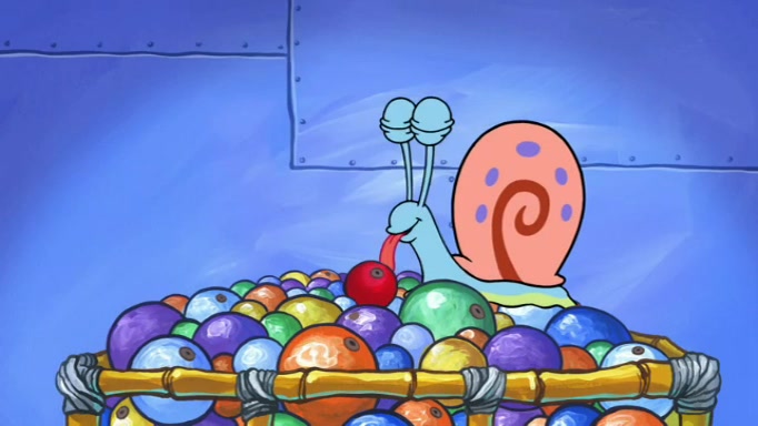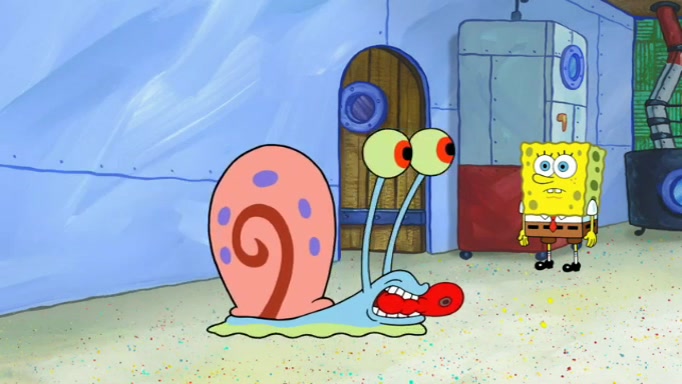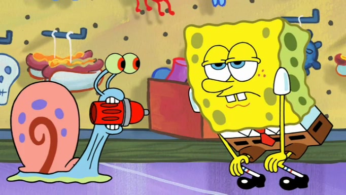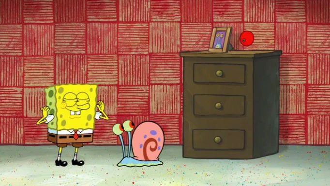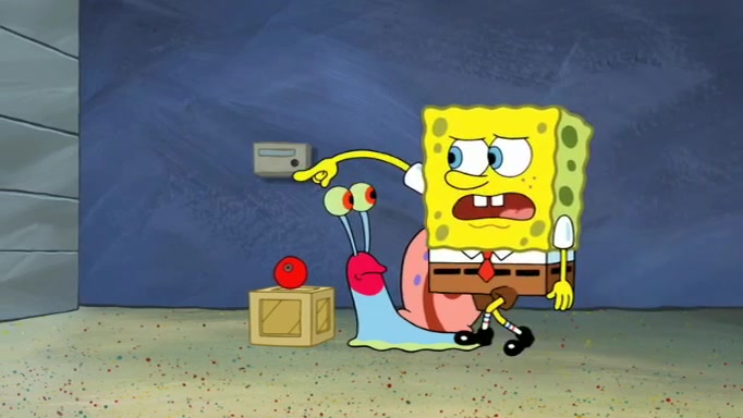 SpongeBob, thinking Gary loves the red ball more than him, decides to lure him out with snail food. He goes into the garage and notices Gary with lipstick, which he finds creepy, SpongeBob tells Gary that he needs to spend some time away from that ball, but Gary hits the garage door button, causing SpongeBob to be lifted up and crushed on the ceiling.