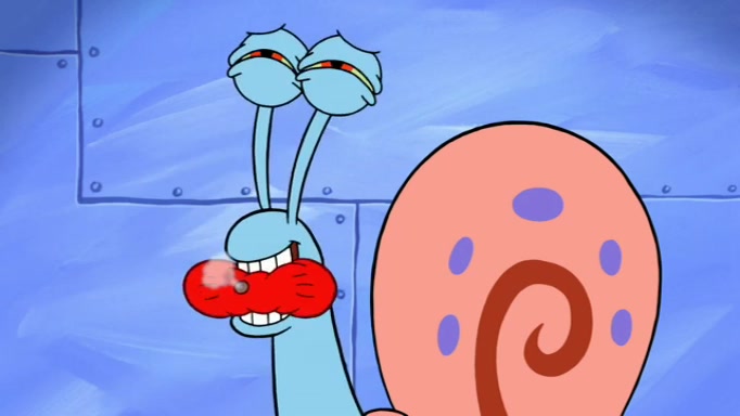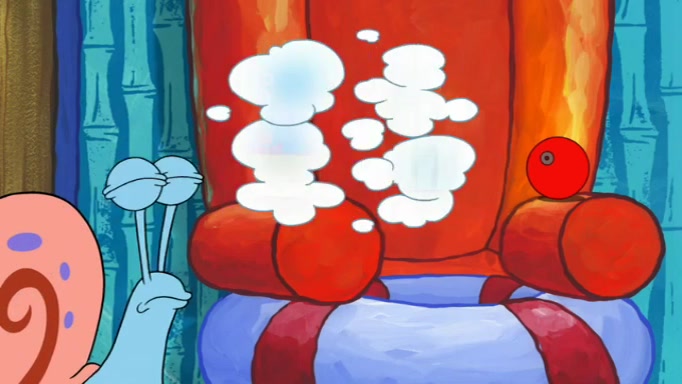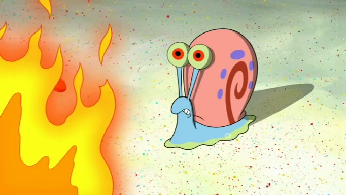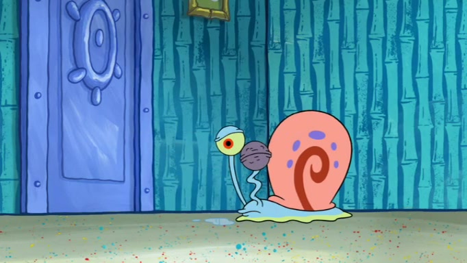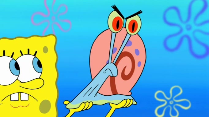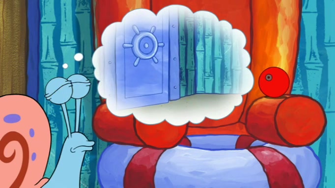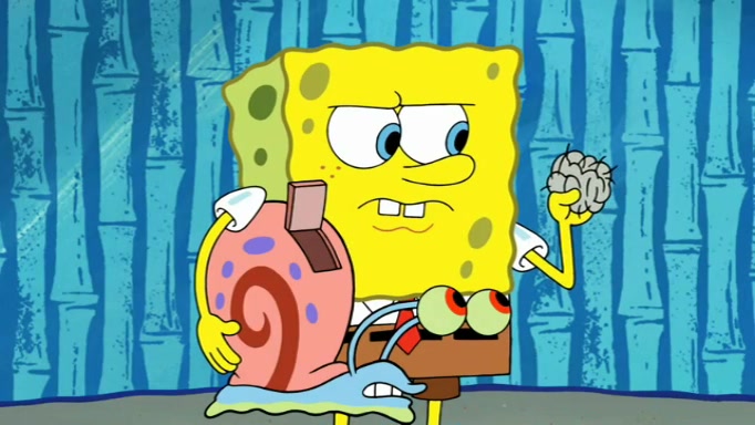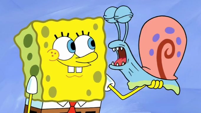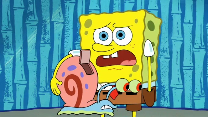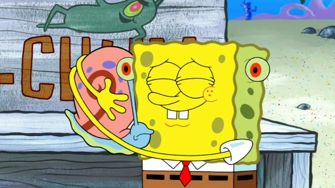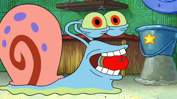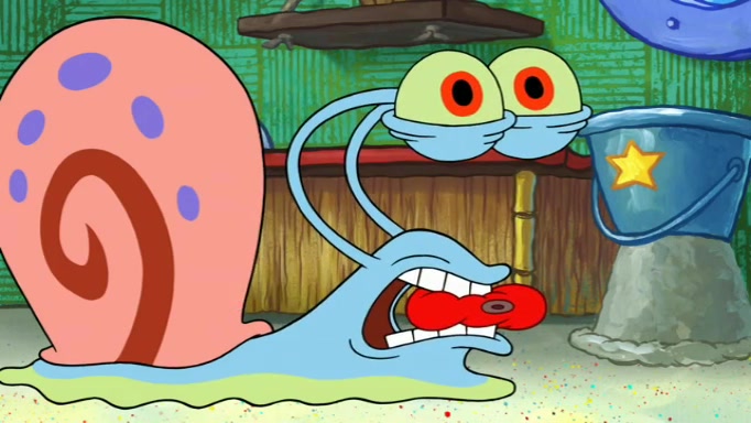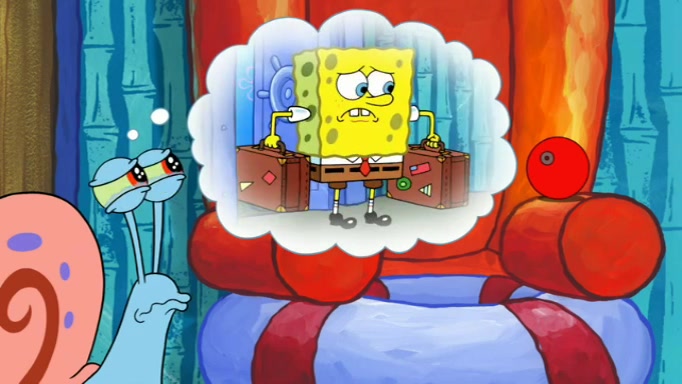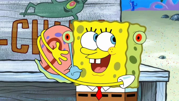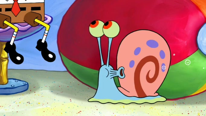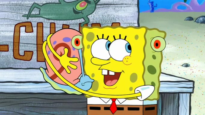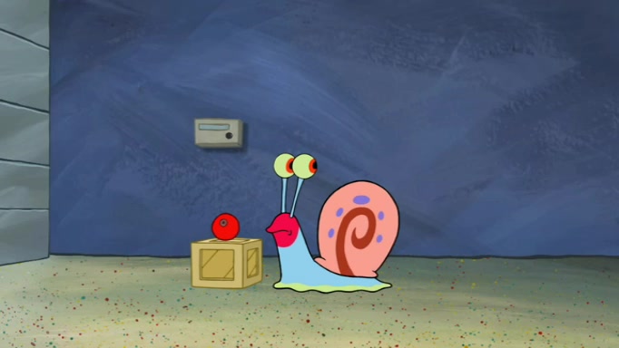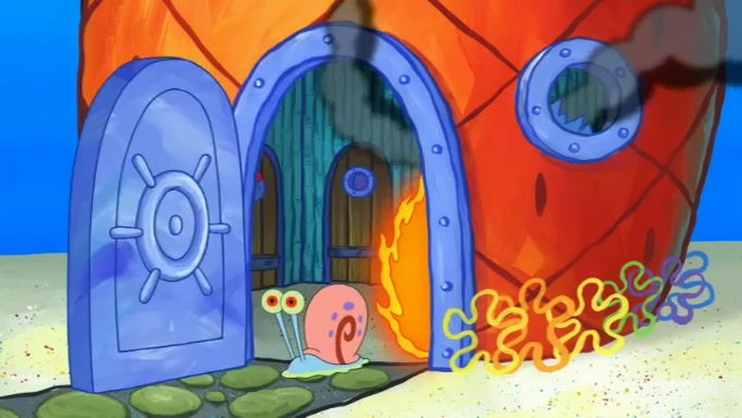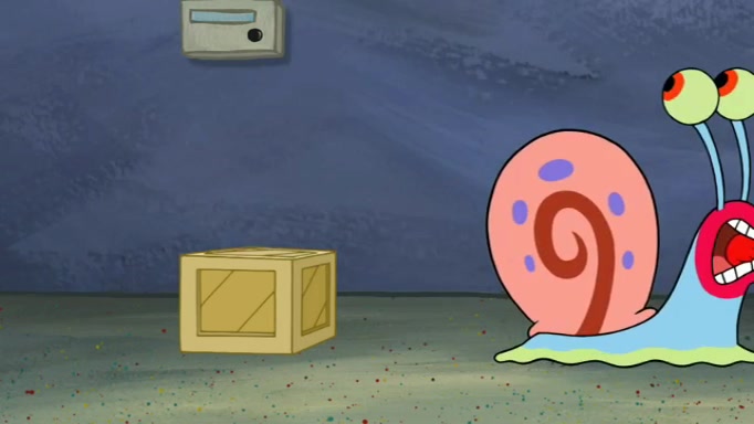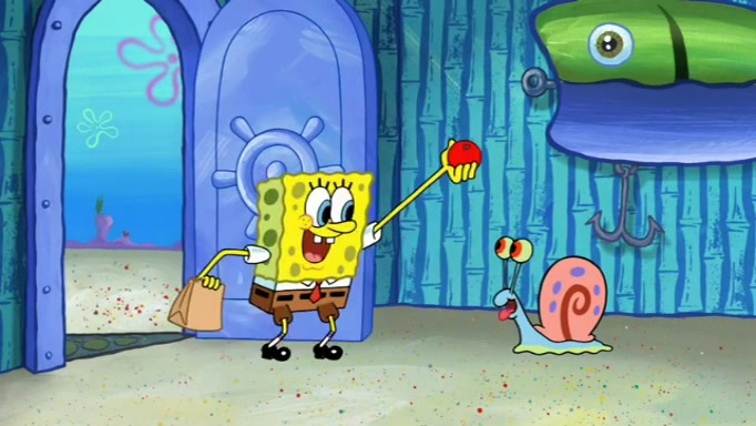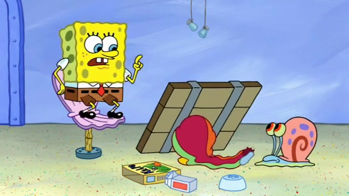 SpongeBob, thinking Gary loves the red ball more than him, decides to lure him out with snail food. He goes into the garage and notices Gary with lipstick, which he finds creepy, SpongeBob tells Gary that he needs to spend some time away from that ball, but Gary hits the garage door button, causing SpongeBob to be lifted up and crushed on the ceiling.