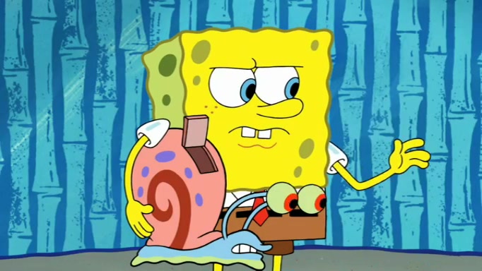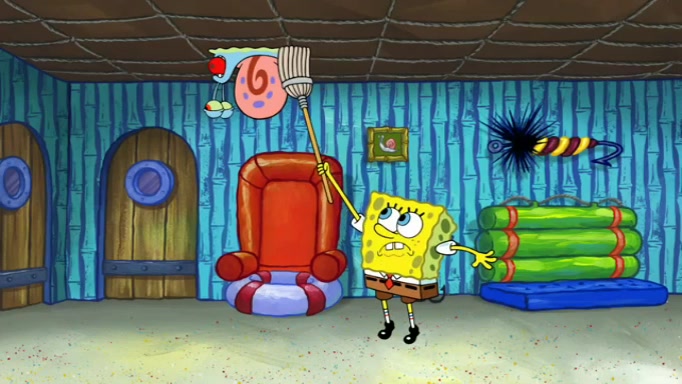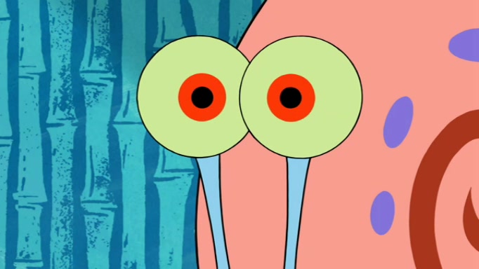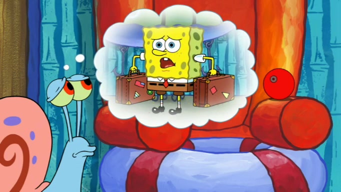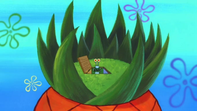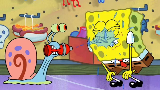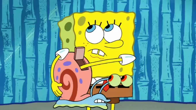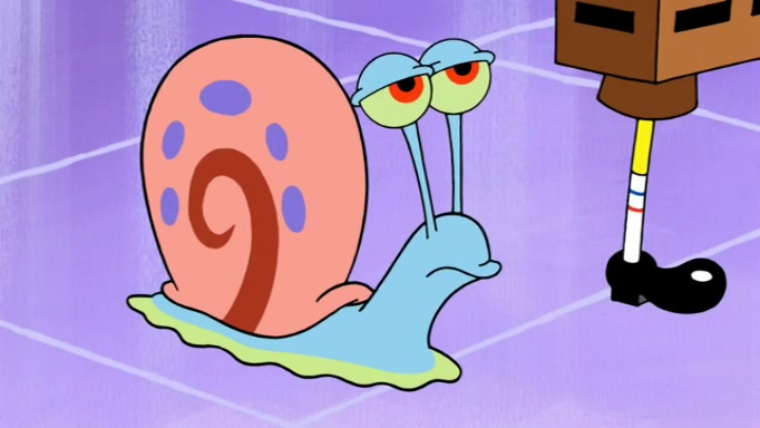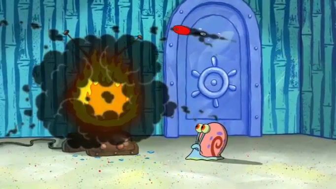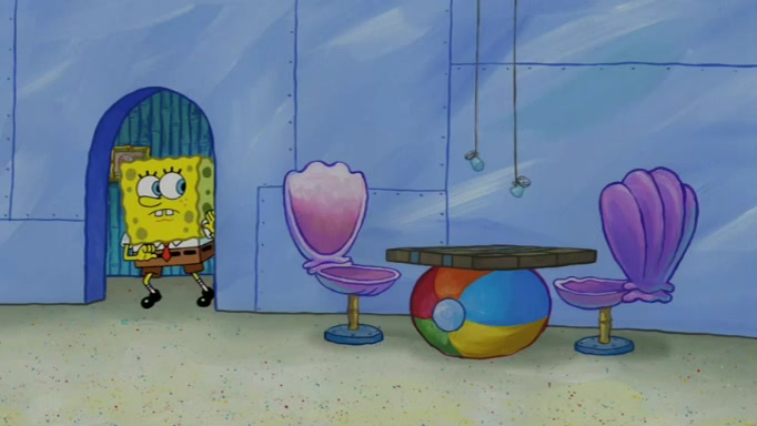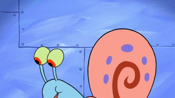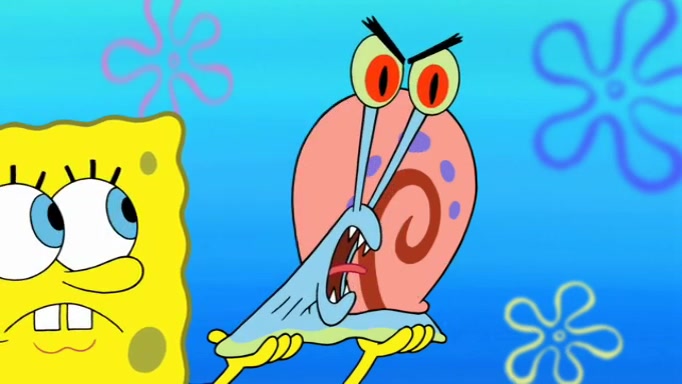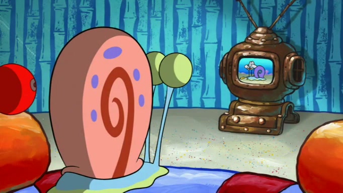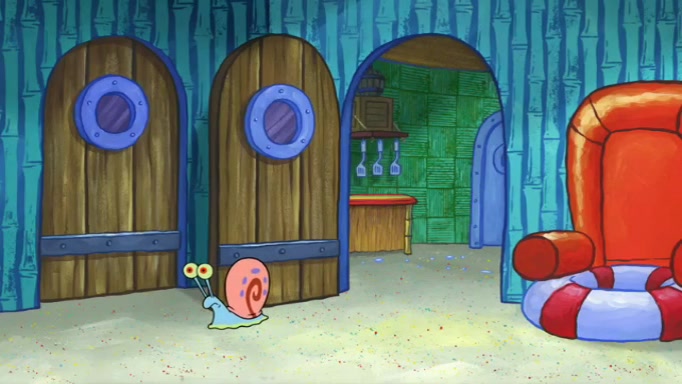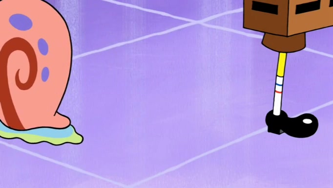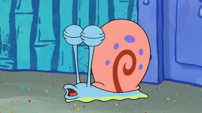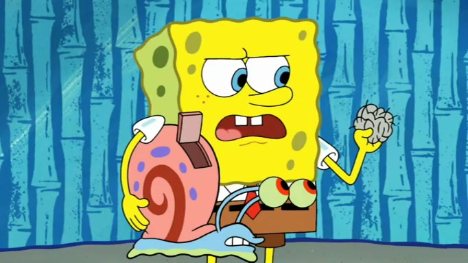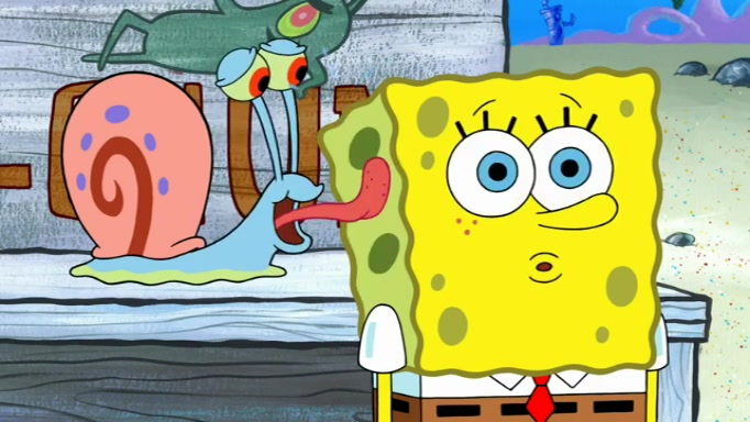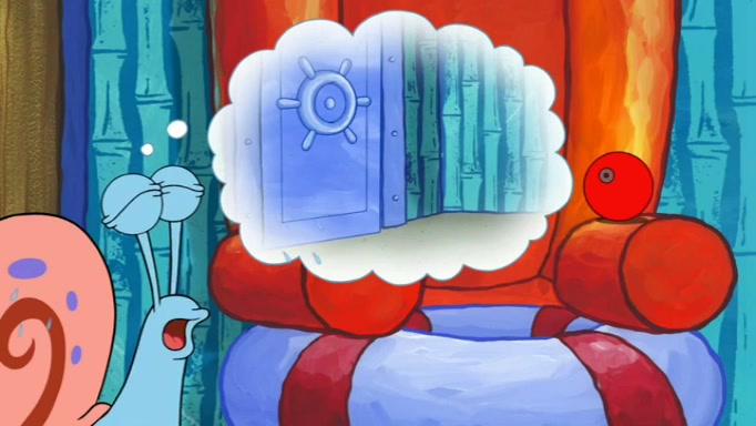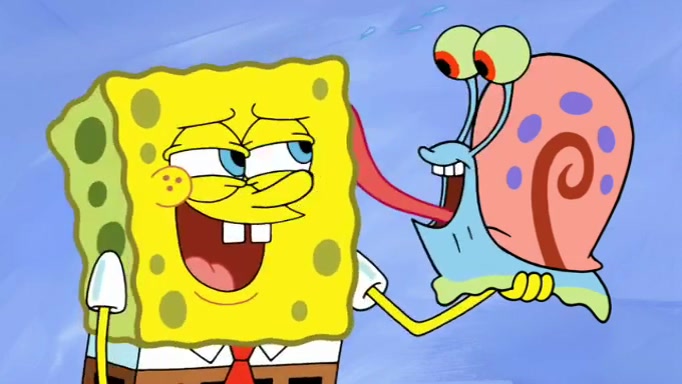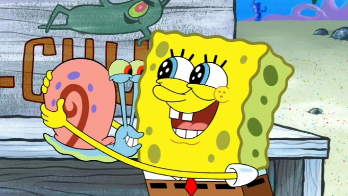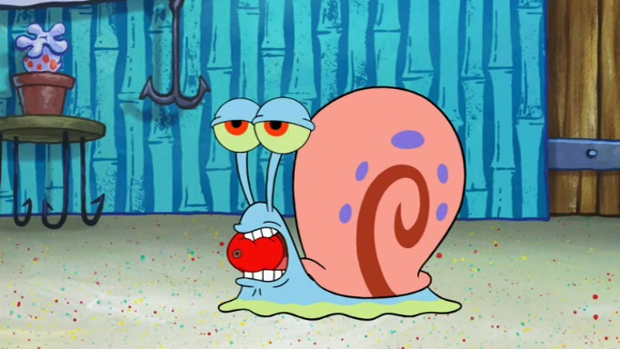SpongeBob, thinking Gary loves the red ball more than him, decides to lure him out with snail food. He goes into the garage and notices Gary with lipstick, which he finds creepy, SpongeBob tells Gary that he needs to spend some time away from that ball, but Gary hits the garage door button, causing SpongeBob to be lifted up and crushed on the ceiling.