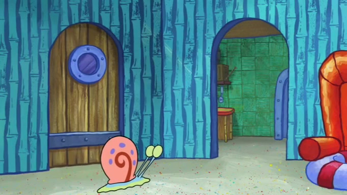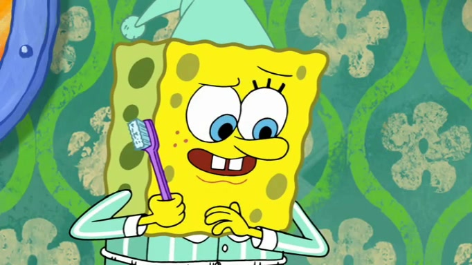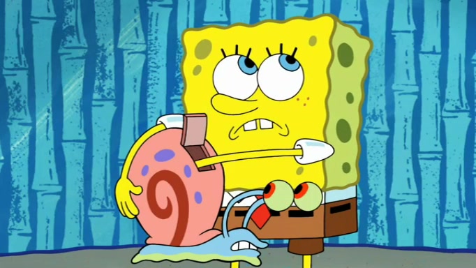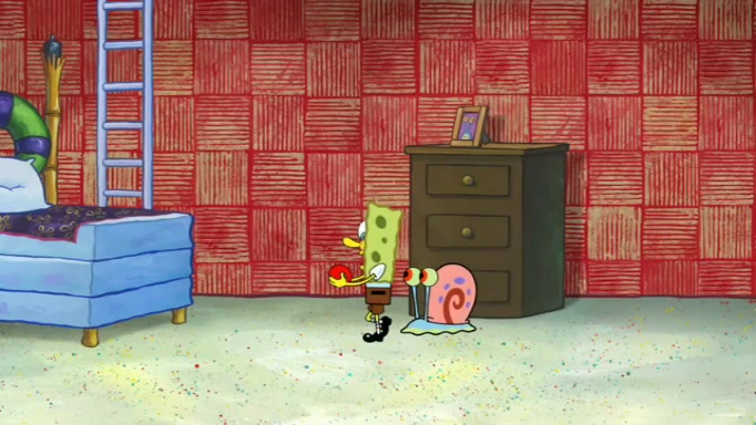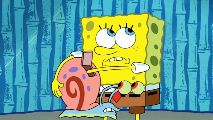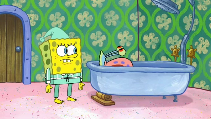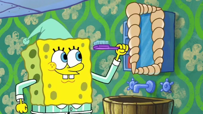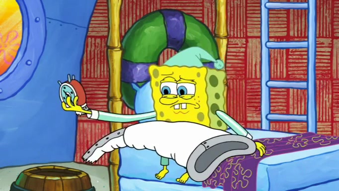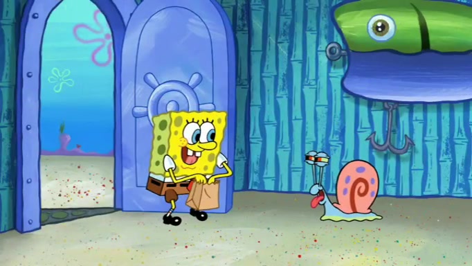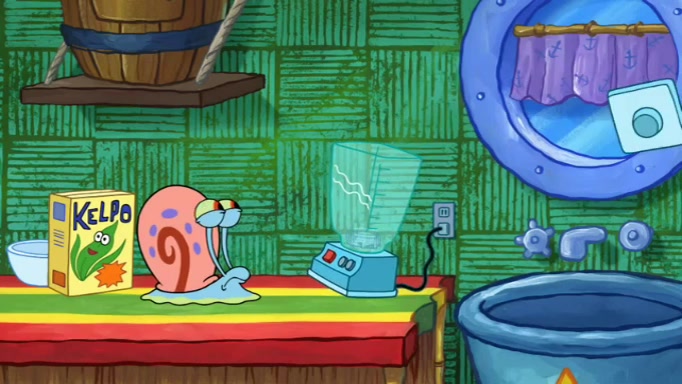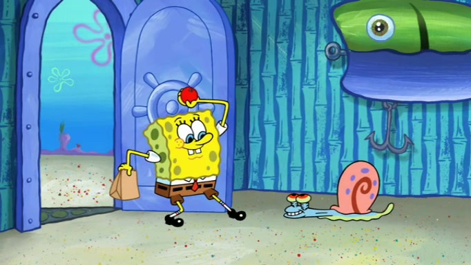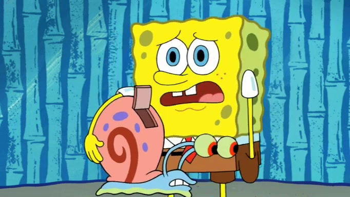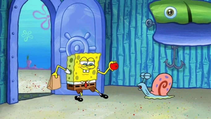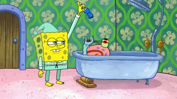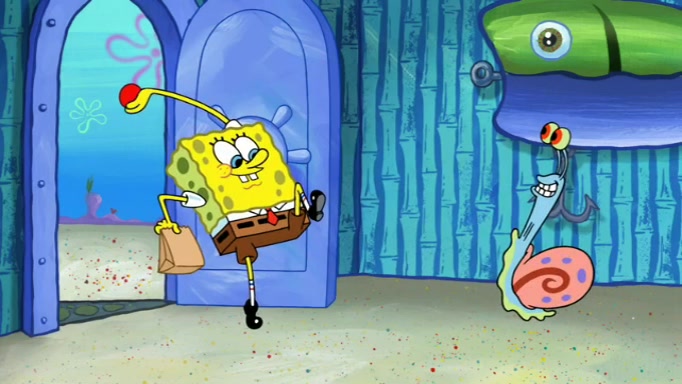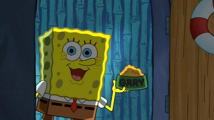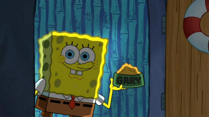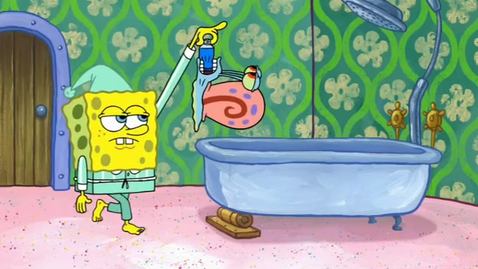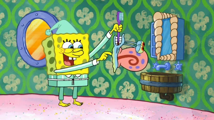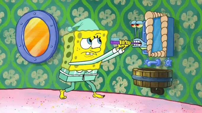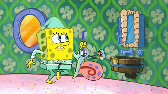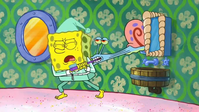 The morning starts off with SpongeBob waking up to his alarm clock acting strangely. It eventually breaks apart and SpongeBob notices the clock has been bitten off and assumes Gary is to blame. SpongeBob uses tape to fix his alarm clock (though it just falls backwards). SpongeBob jumps off his bed and into his slippers, but Gary has gotten to them as well. SpongeBob then goes to brush his teeth, but when he pulls out his toothbrush, Gary is on the other end biting on it.