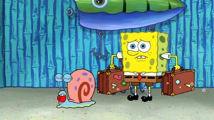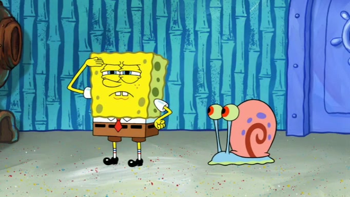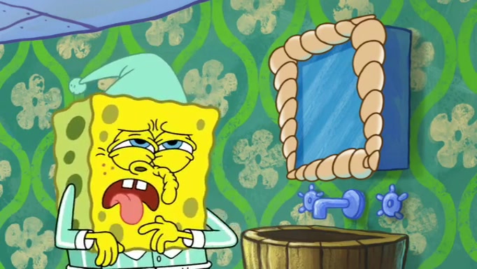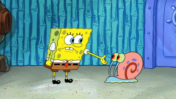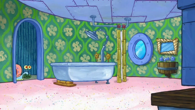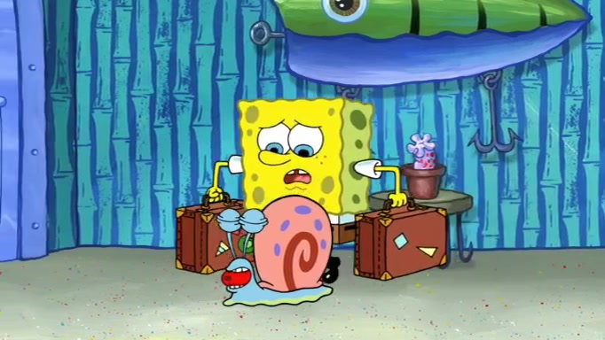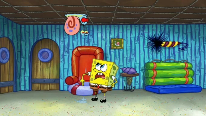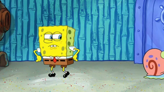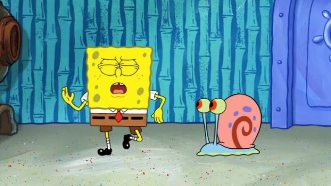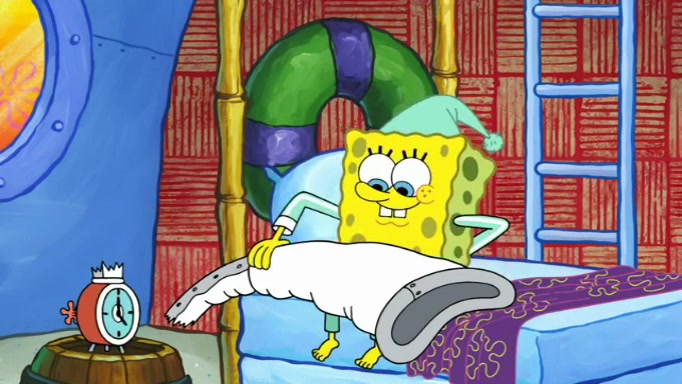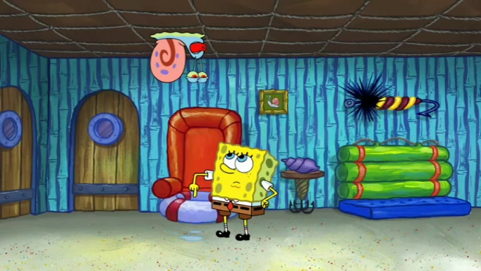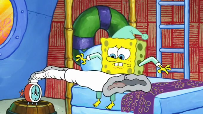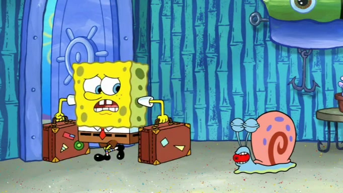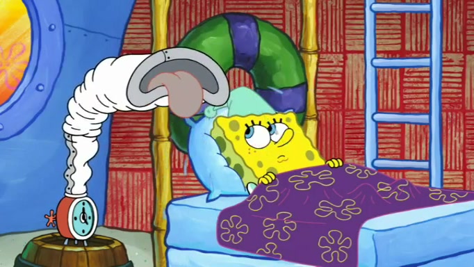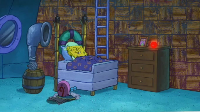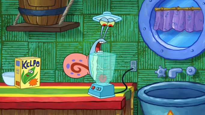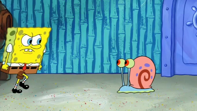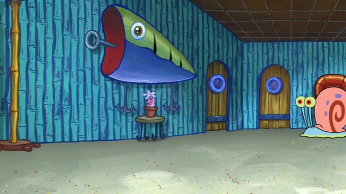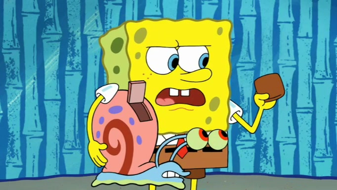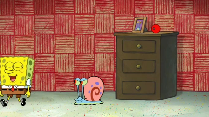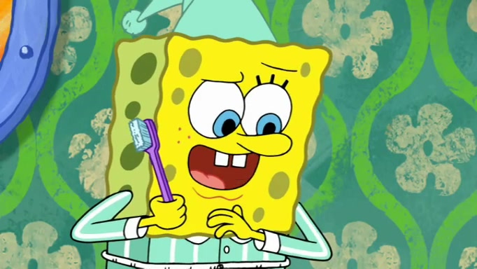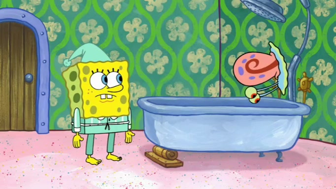 The morning starts off with SpongeBob waking up to his alarm clock acting strangely. It eventually breaks apart and SpongeBob notices the clock has been bitten off and assumes Gary is to blame. SpongeBob uses tape to fix his alarm clock (though it just falls backwards). SpongeBob jumps off his bed and into his slippers, but Gary has gotten to them as well. SpongeBob then goes to brush his teeth, but when he pulls out his toothbrush, Gary is on the other end biting on it.