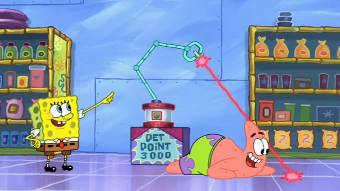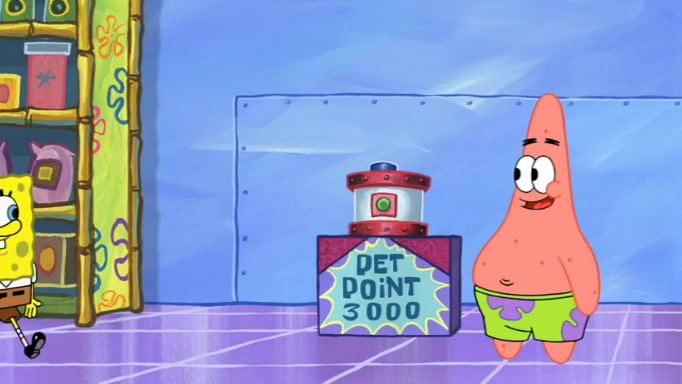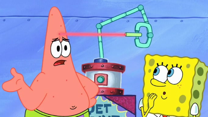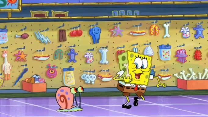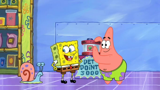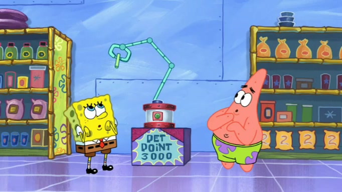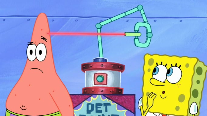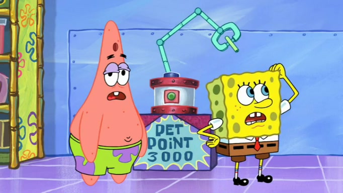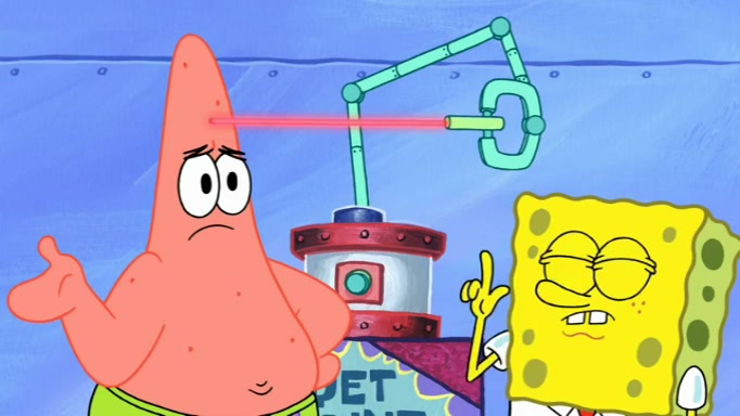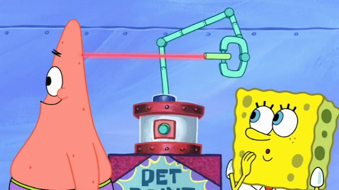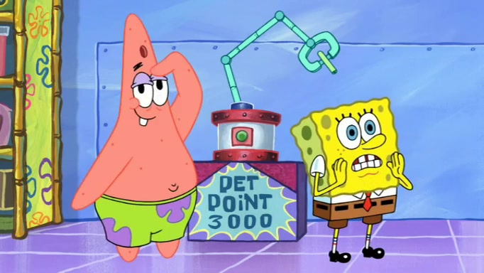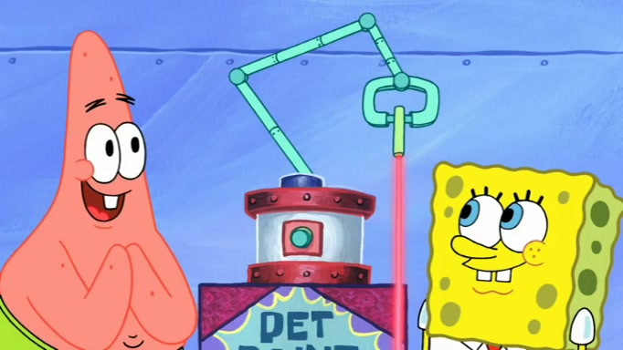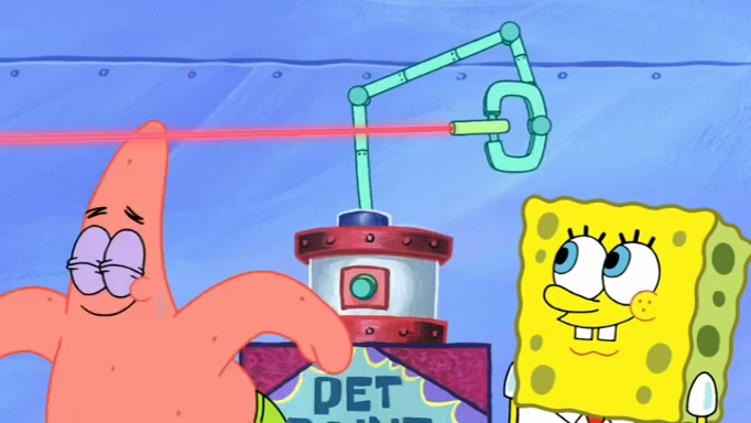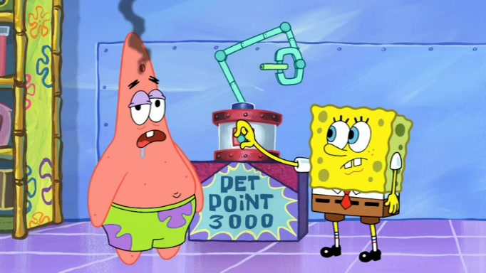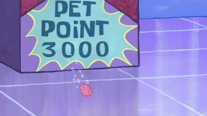 SpongeBob takes out a toy fire hydrant, but Gary bites onto the end causing water to spray onto SpongeBob's face. Patrick then points out the "Pet Point 3000" with SpongeBob interested, but not so much with Gary, who crawls away. Patrick then starts to play with the toy, but ends up getting the laser through his head and his brain pops out (which SpongeBob then puts back in). Gary then notices a shiny red ball and loves it and SpongeBob decides to buy it.